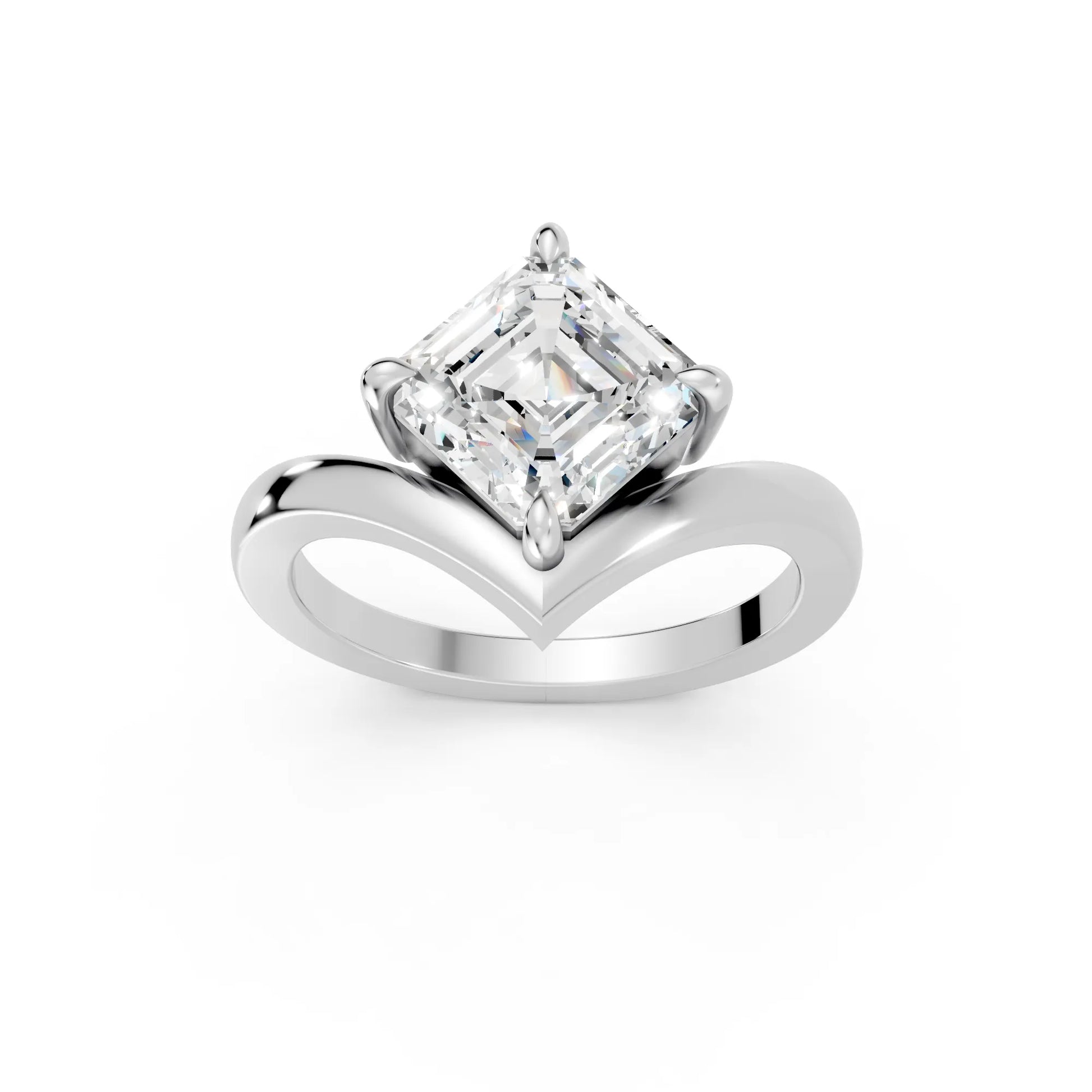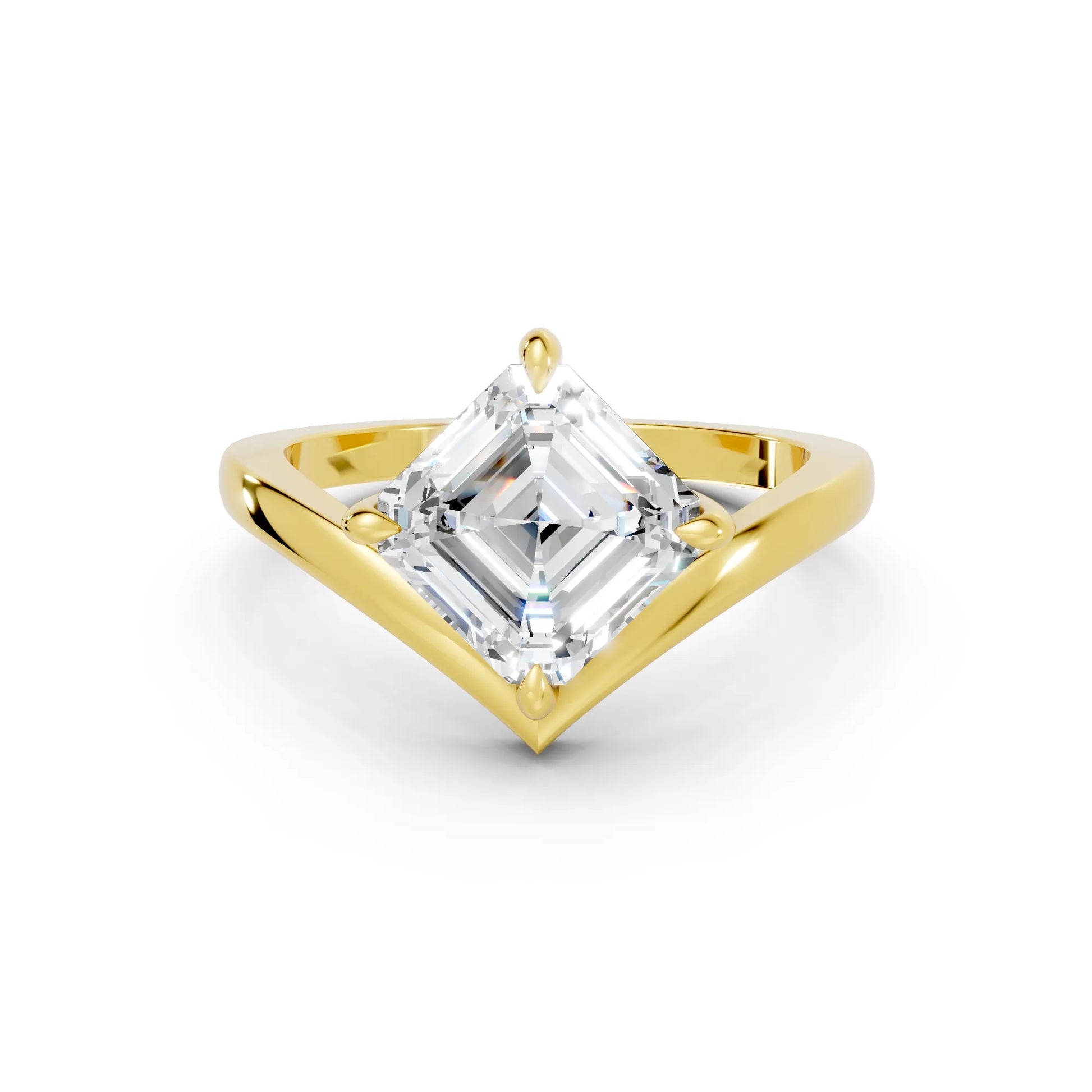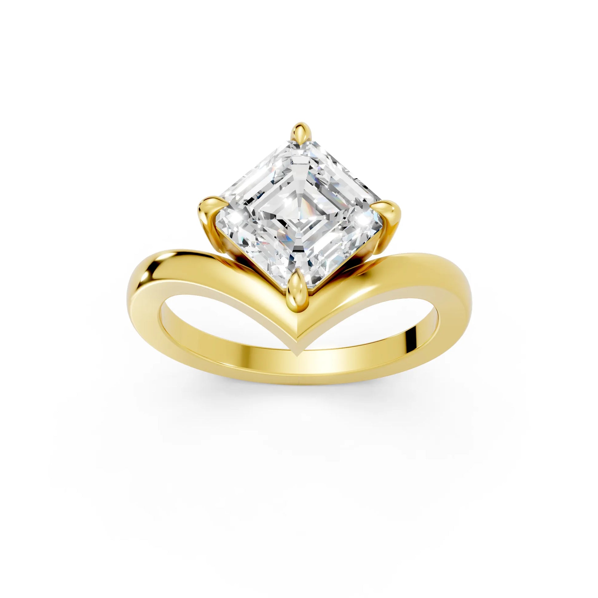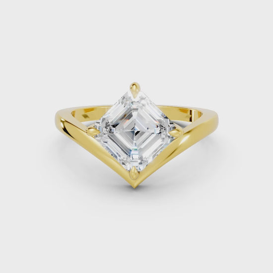 This engagement ring, crafted in solid 14k gold, showcases a captivating Asscher cut lab-grown diamond in a refined V-shaped design. A timeless piece that symbolizes unity, brilliance, and enduring love.