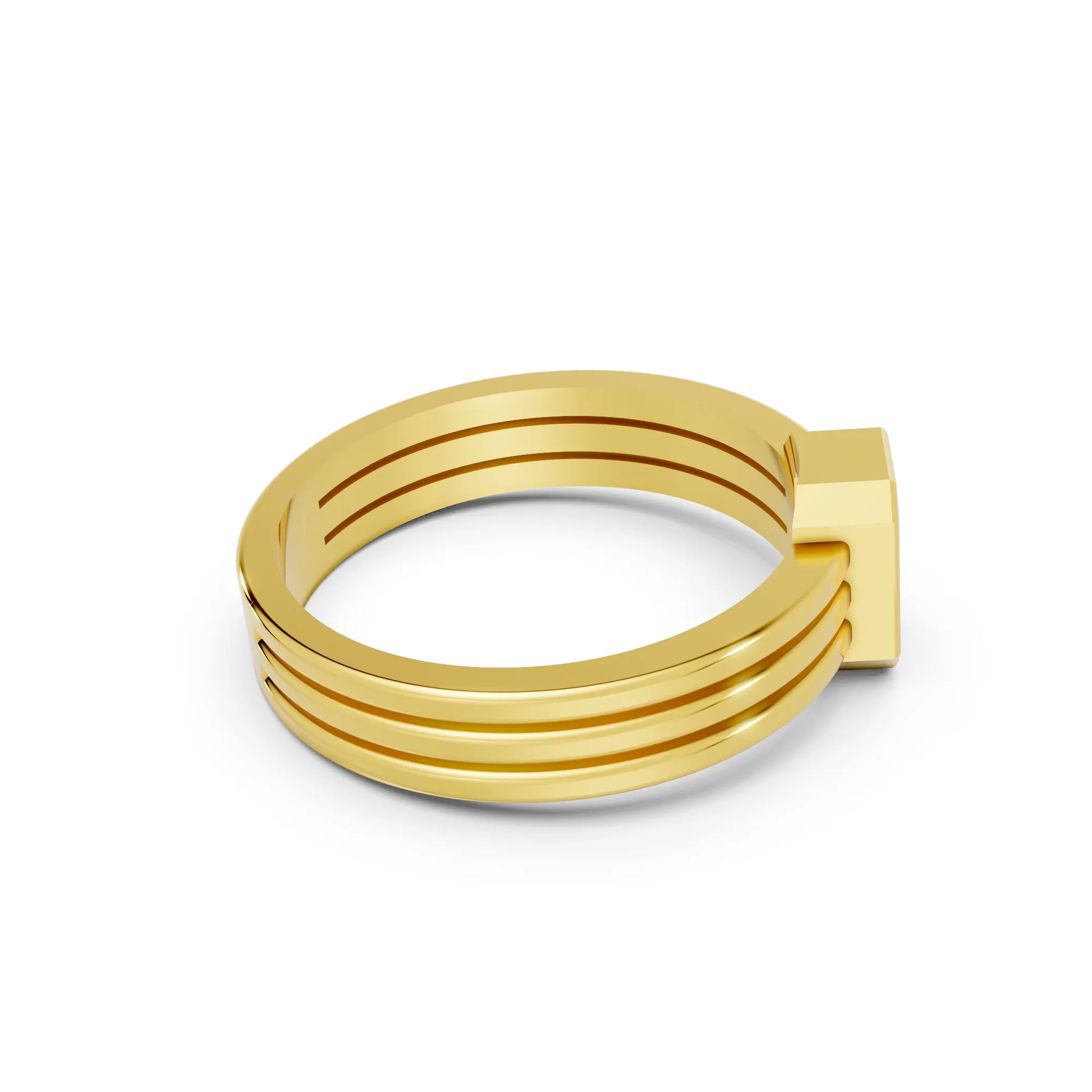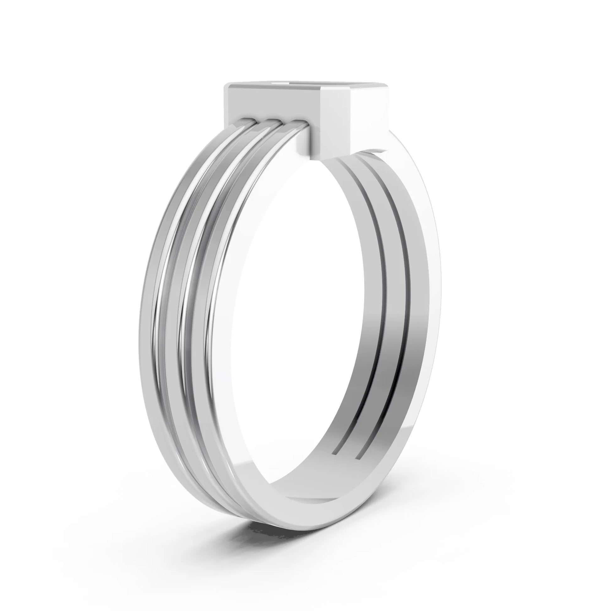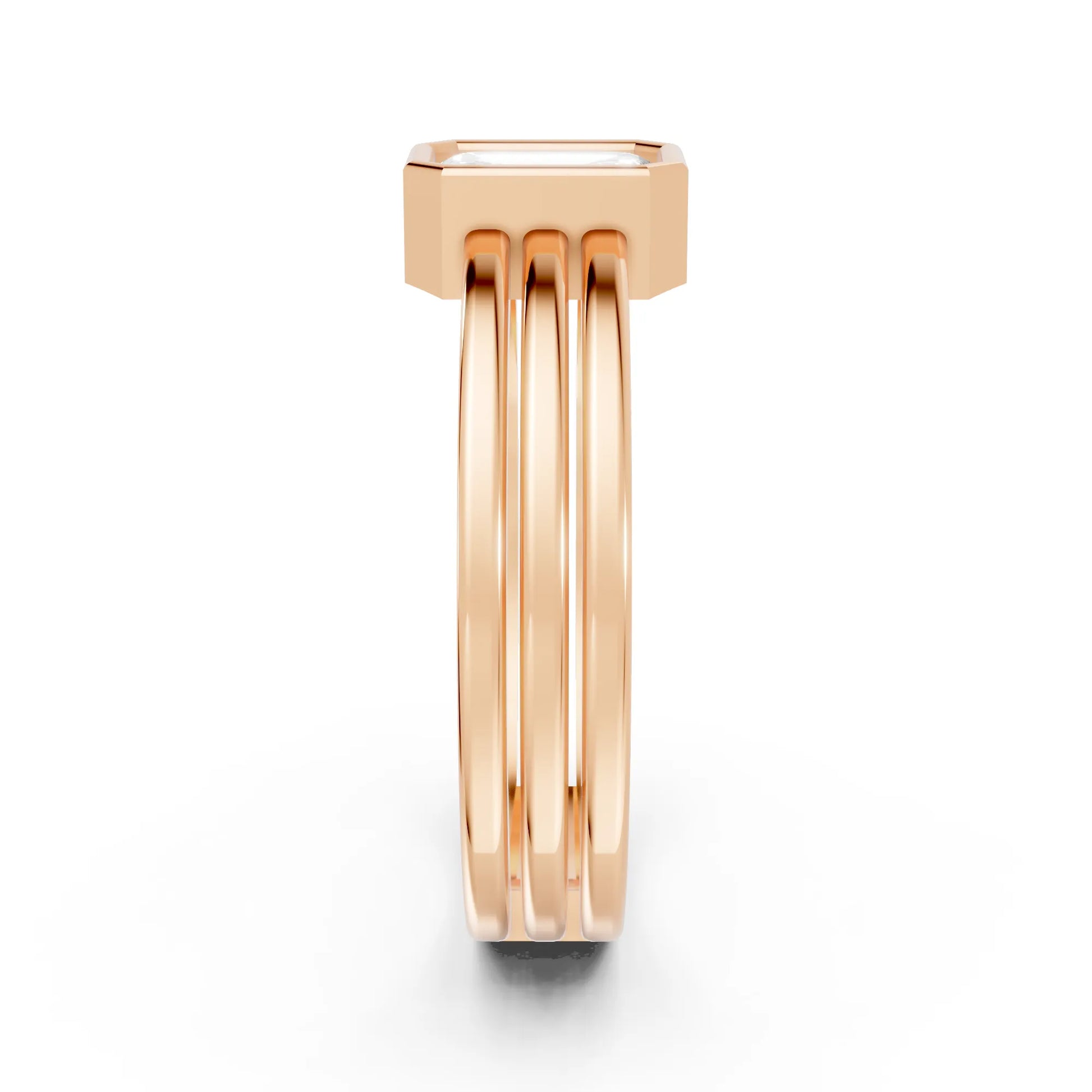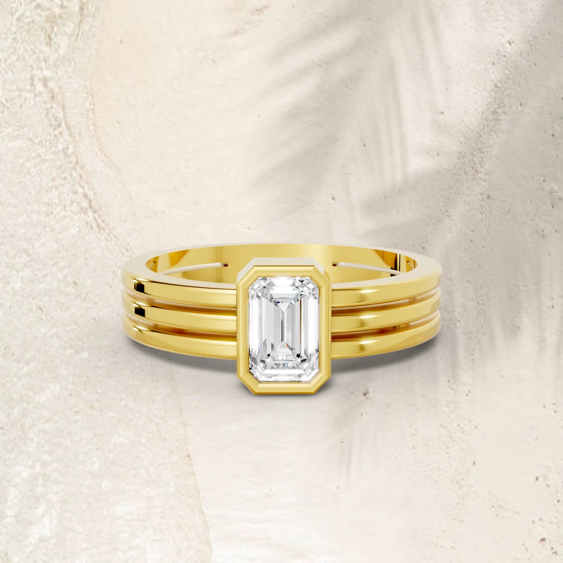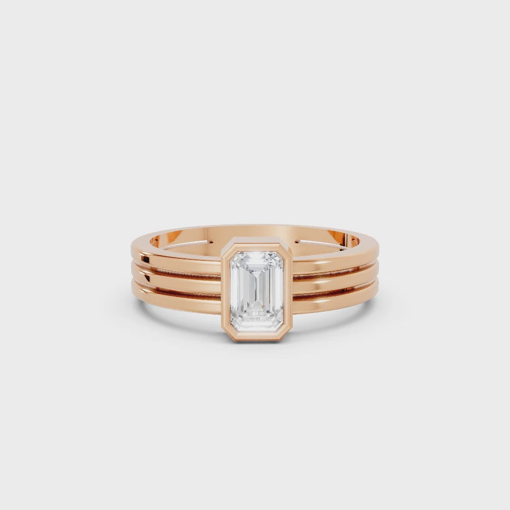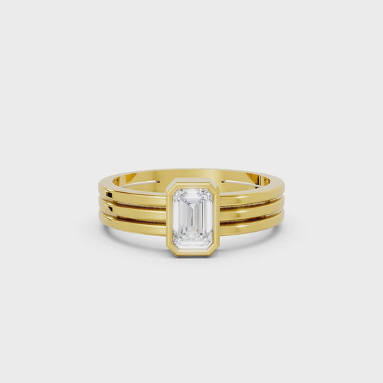 This engagement ring, crafted in solid 14k gold, features a sleek emerald cut lab-grown diamond in a secure bezel setting. The modern double band design adds bold elegance, symbolizing strength, unity, and everlasting love.
