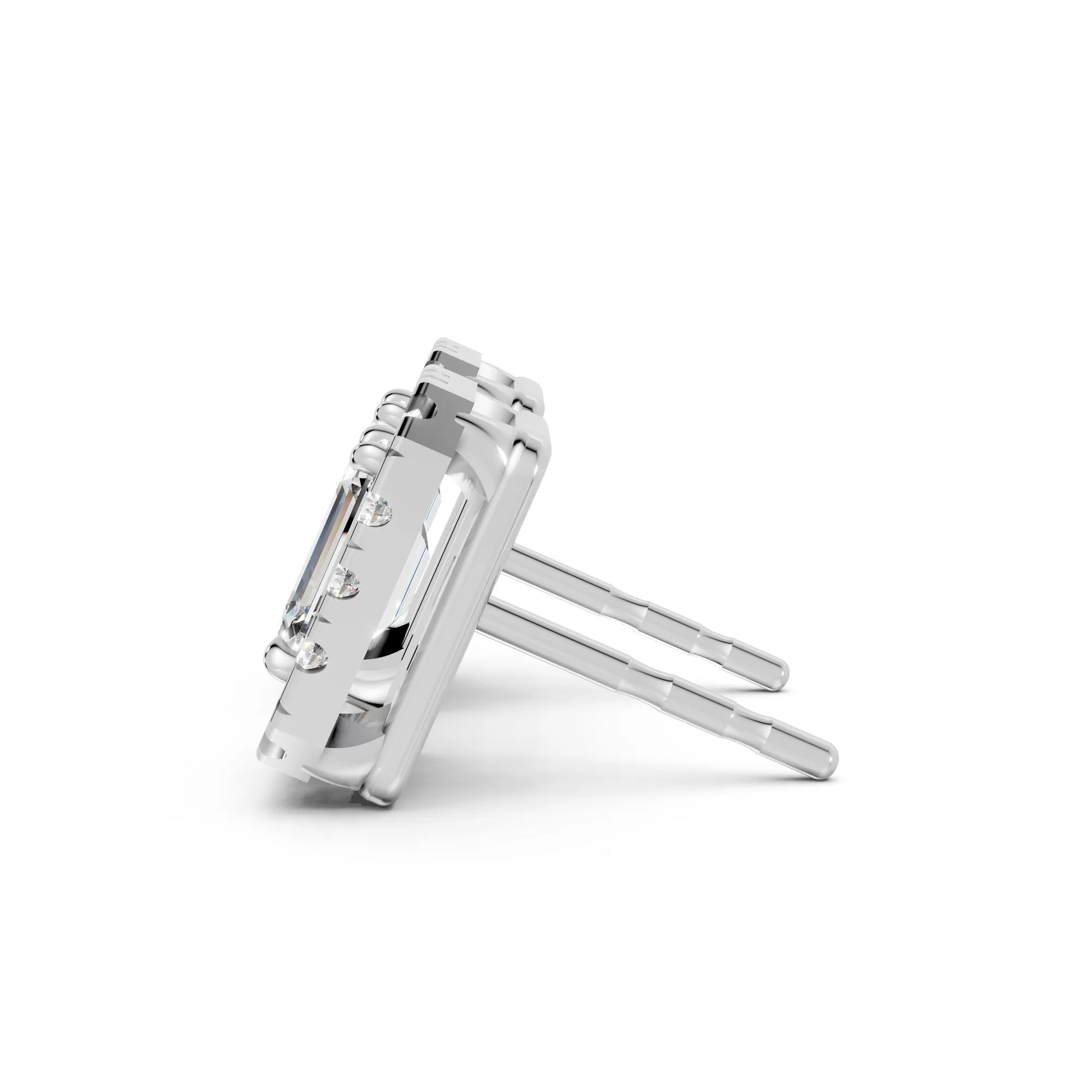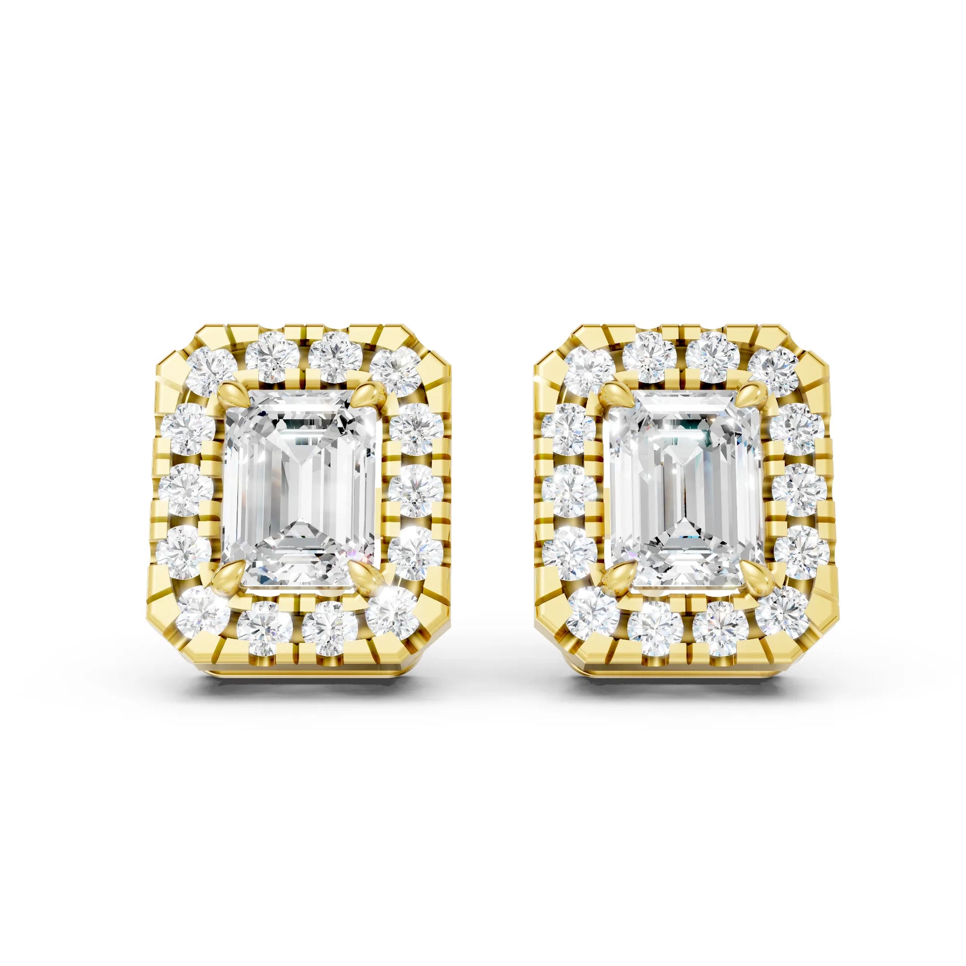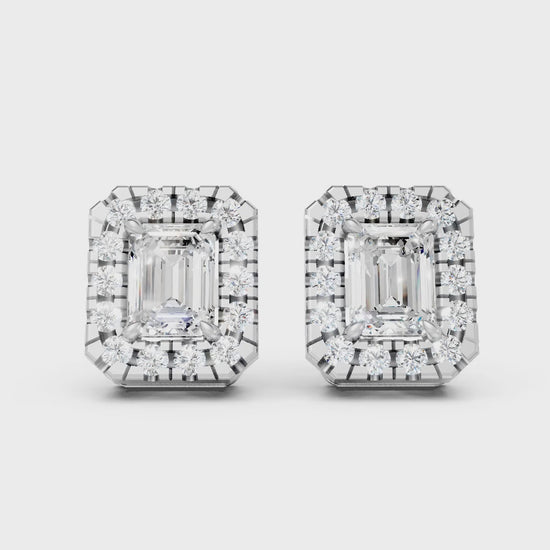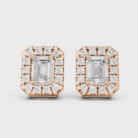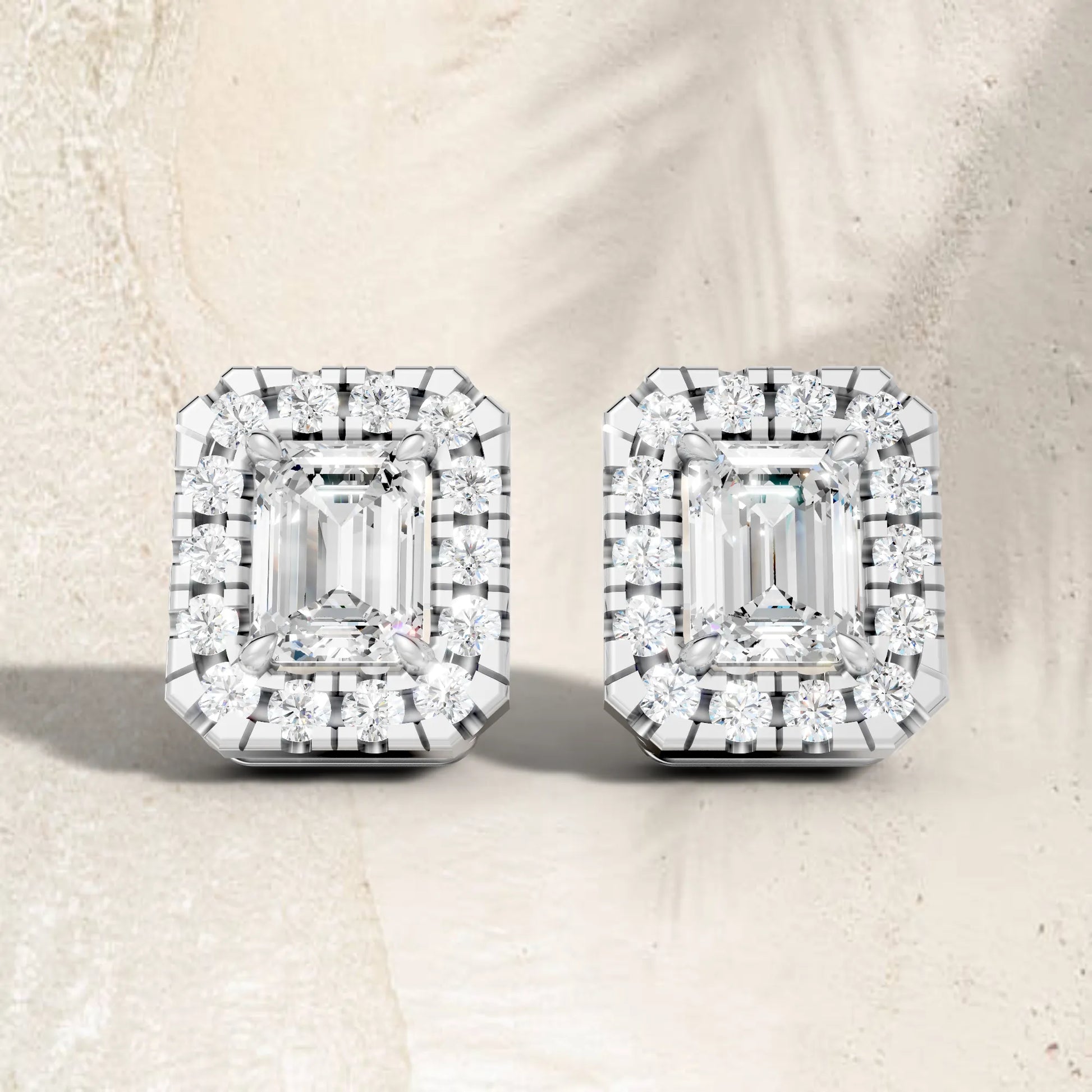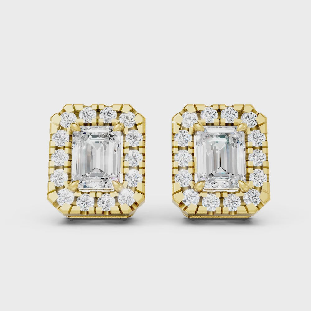This emerald cut lab-grown diamond stud, crafted in solid 14k gold, is framed by a radiant halo for added sparkle. A sophisticated design that pairs timeless beauty with modern brilliance.