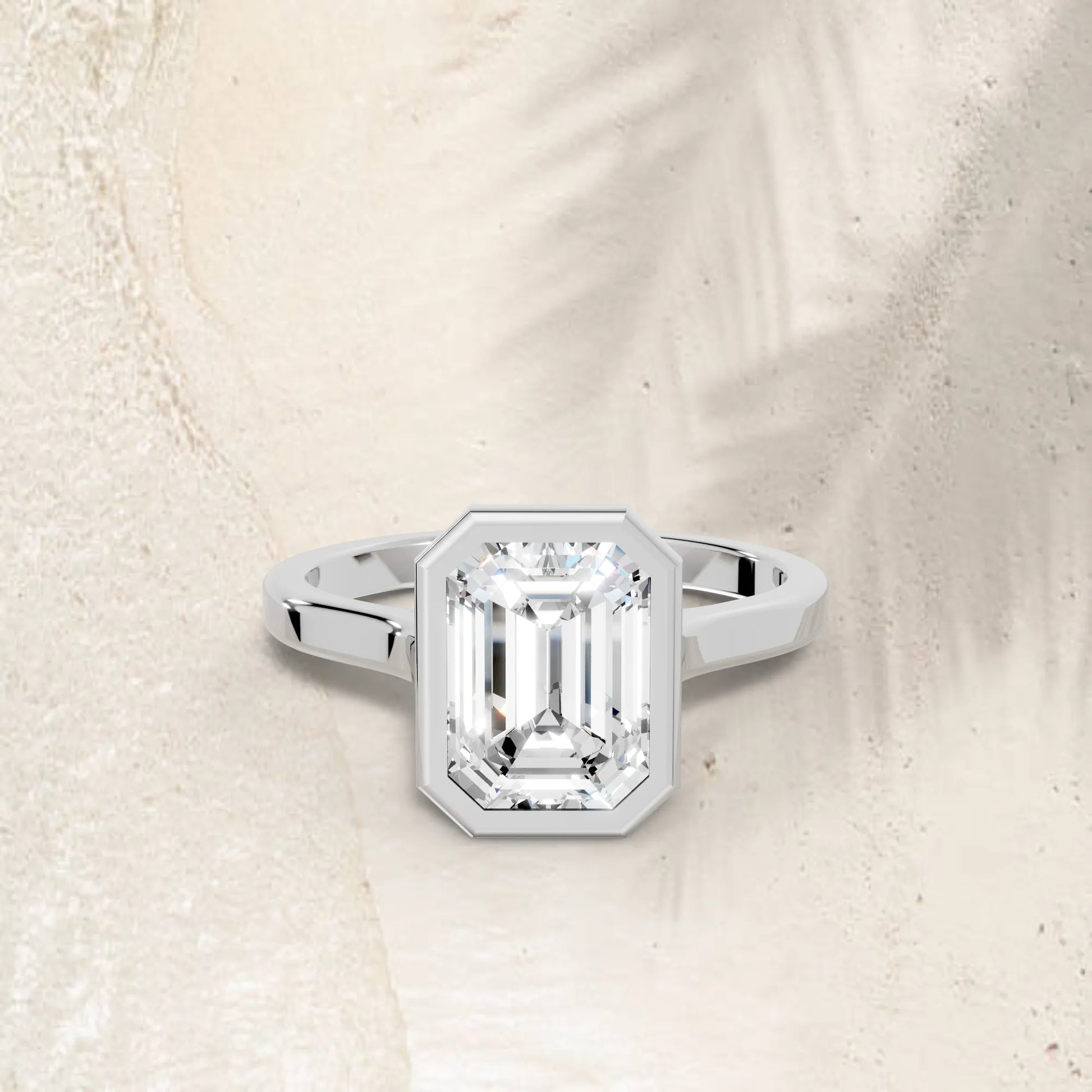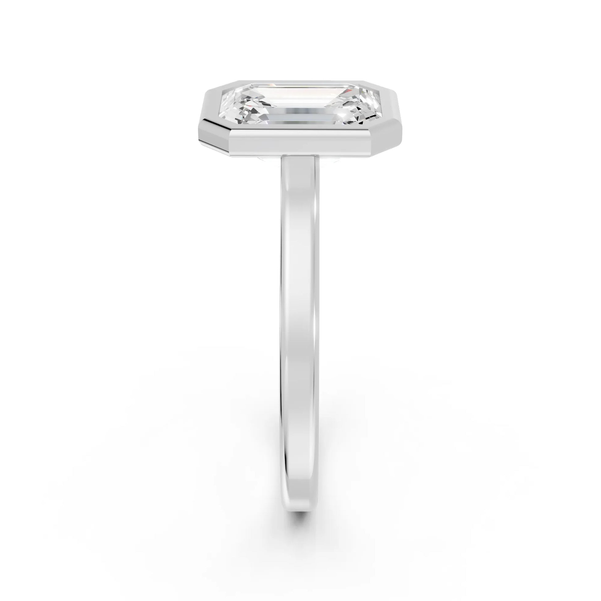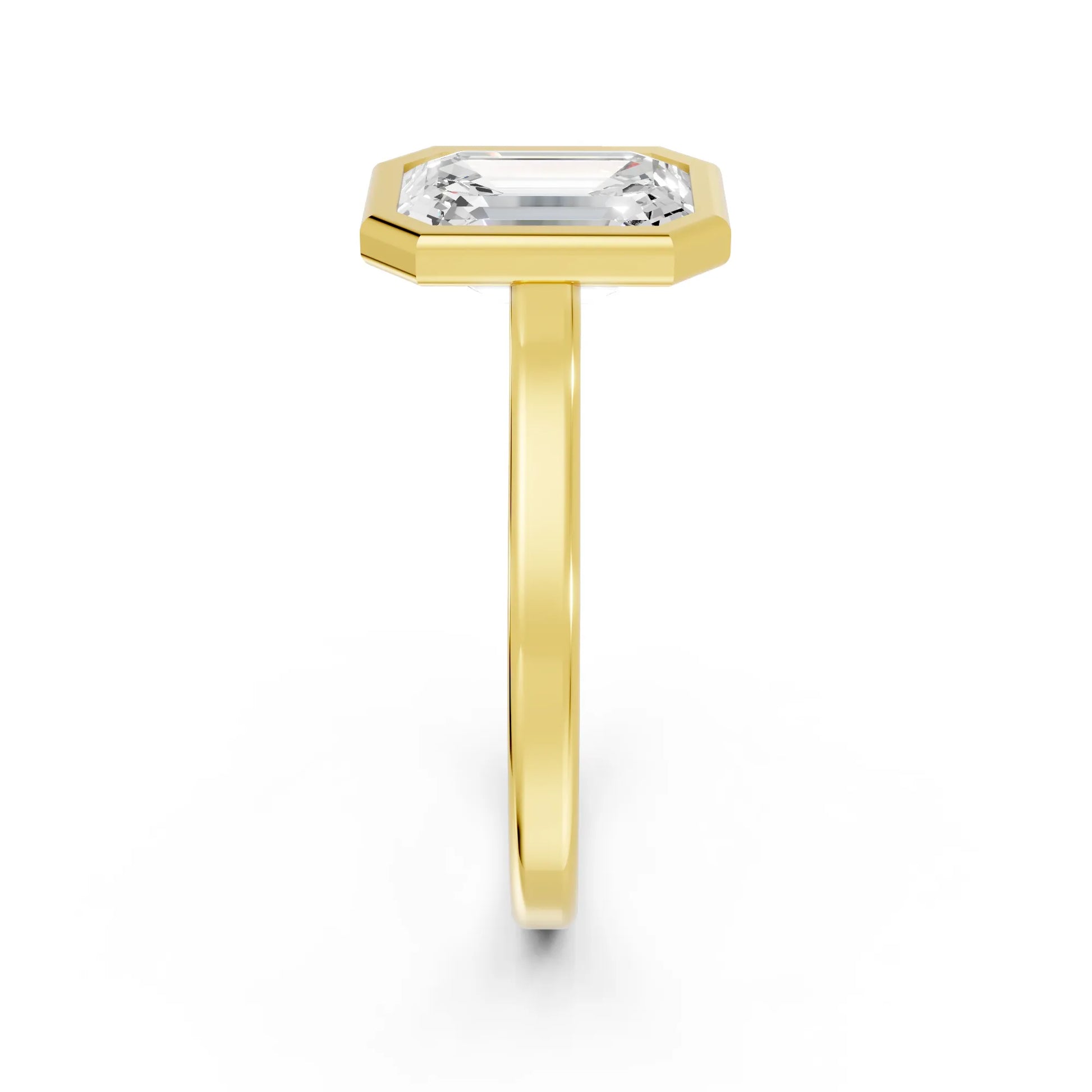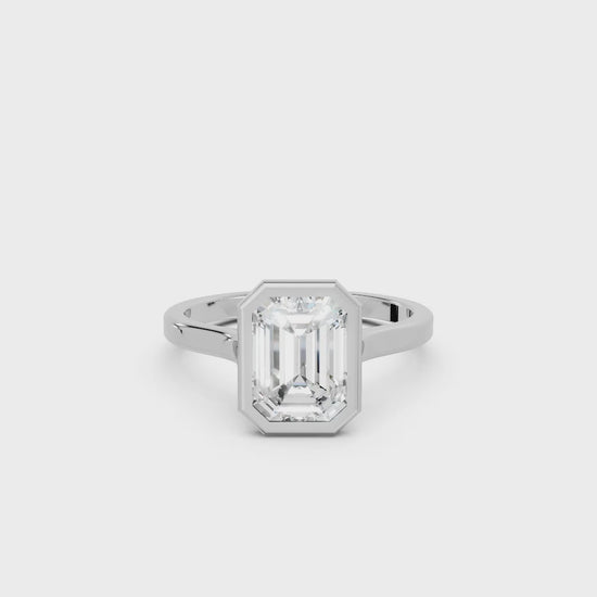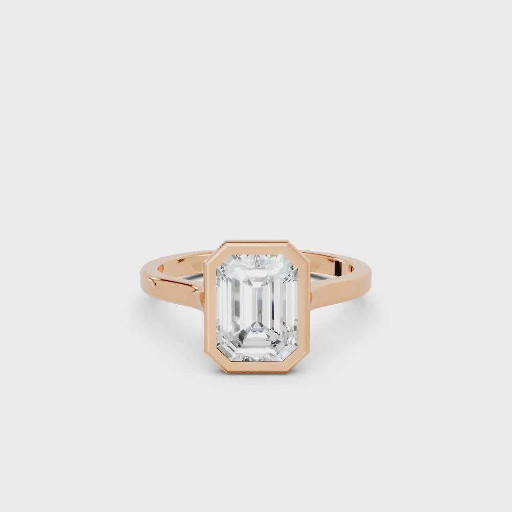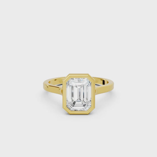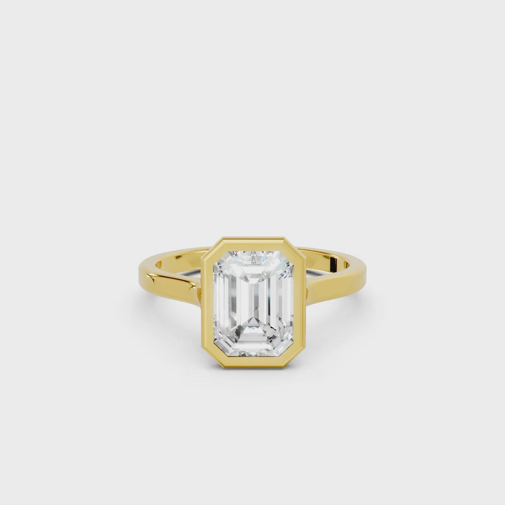 Crafted in solid 14k gold, this engagement ring features a sleek emerald cut lab-grown diamond set in a refined bezel. A contemporary design that highlights clean lines, secure brilliance, and timeless sophistication.
