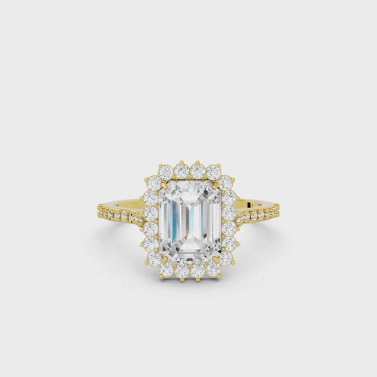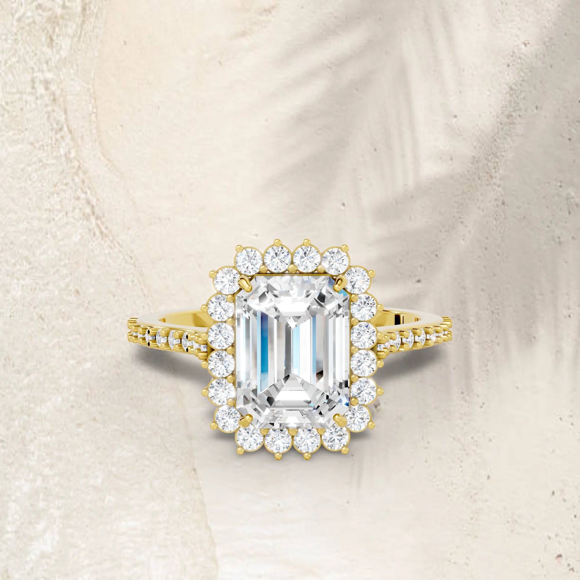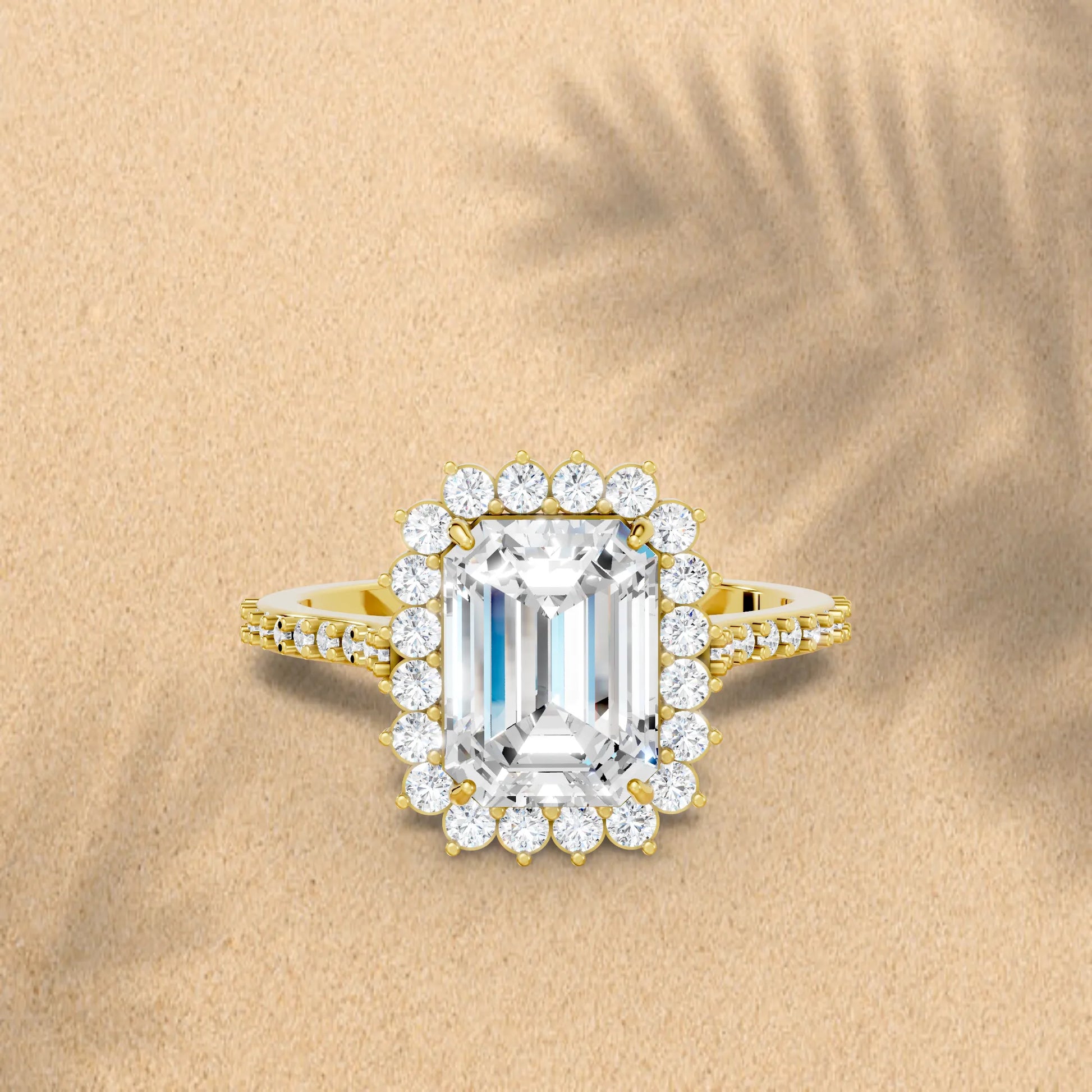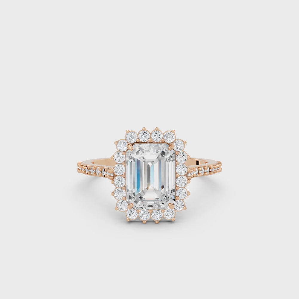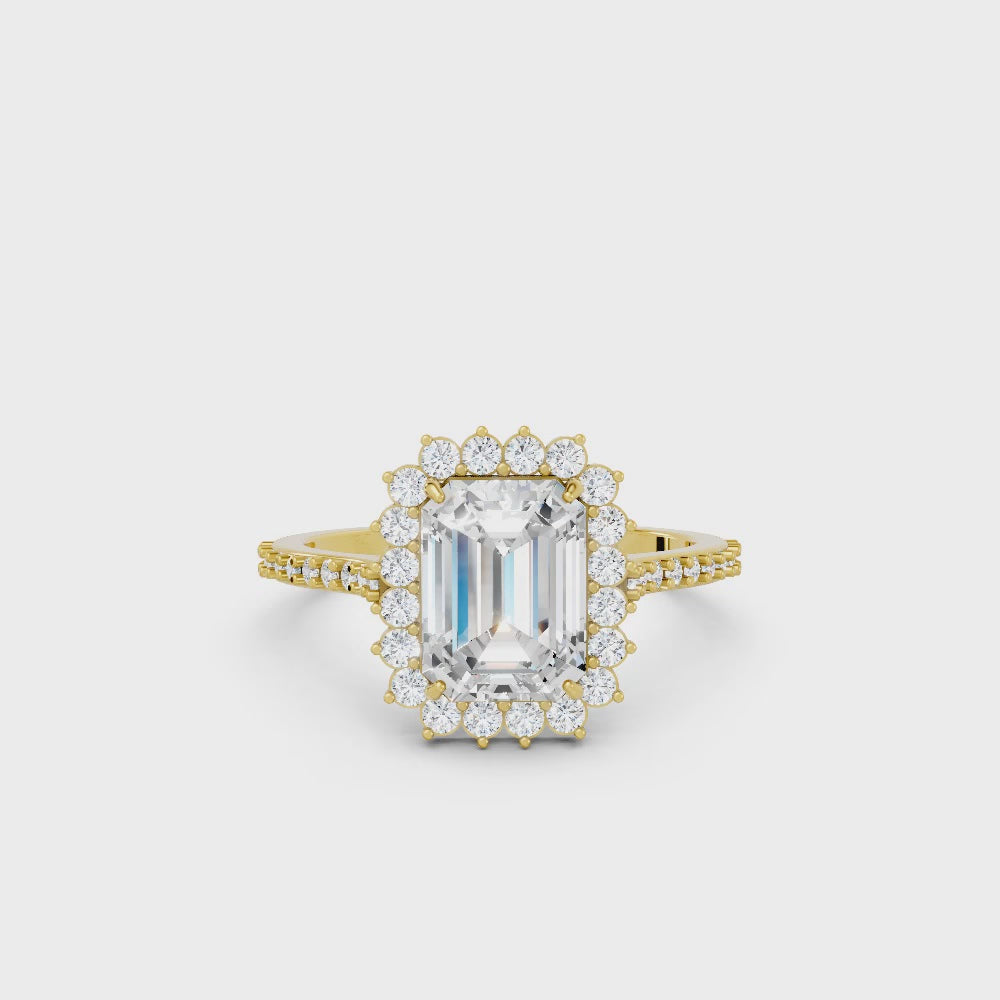 Crafted in solid 14k gold, this engagement ring showcases a sleek emerald cut lab-grown diamond framed by a floral-inspired halo. A pavé-set band enhances its brilliance, merging natural elegance with timeless sophistication.