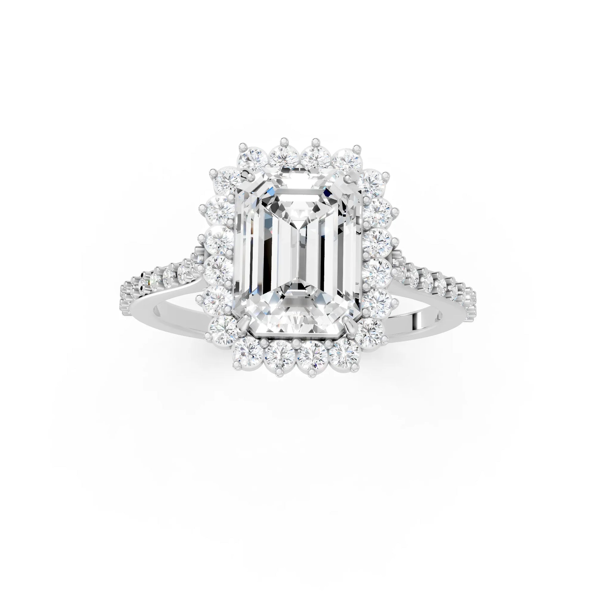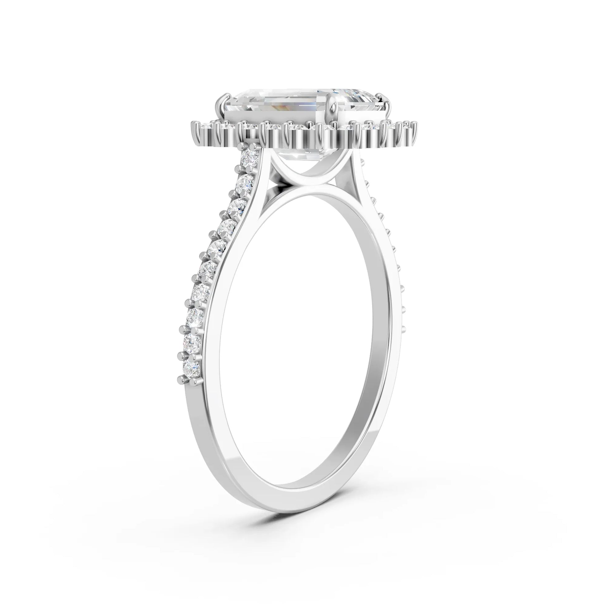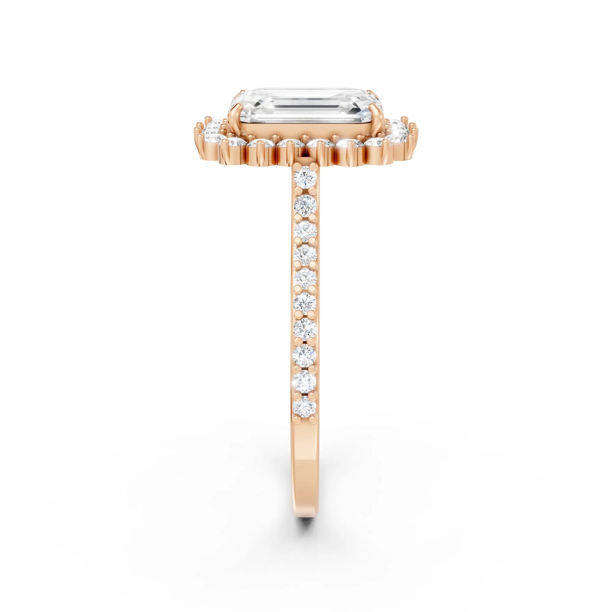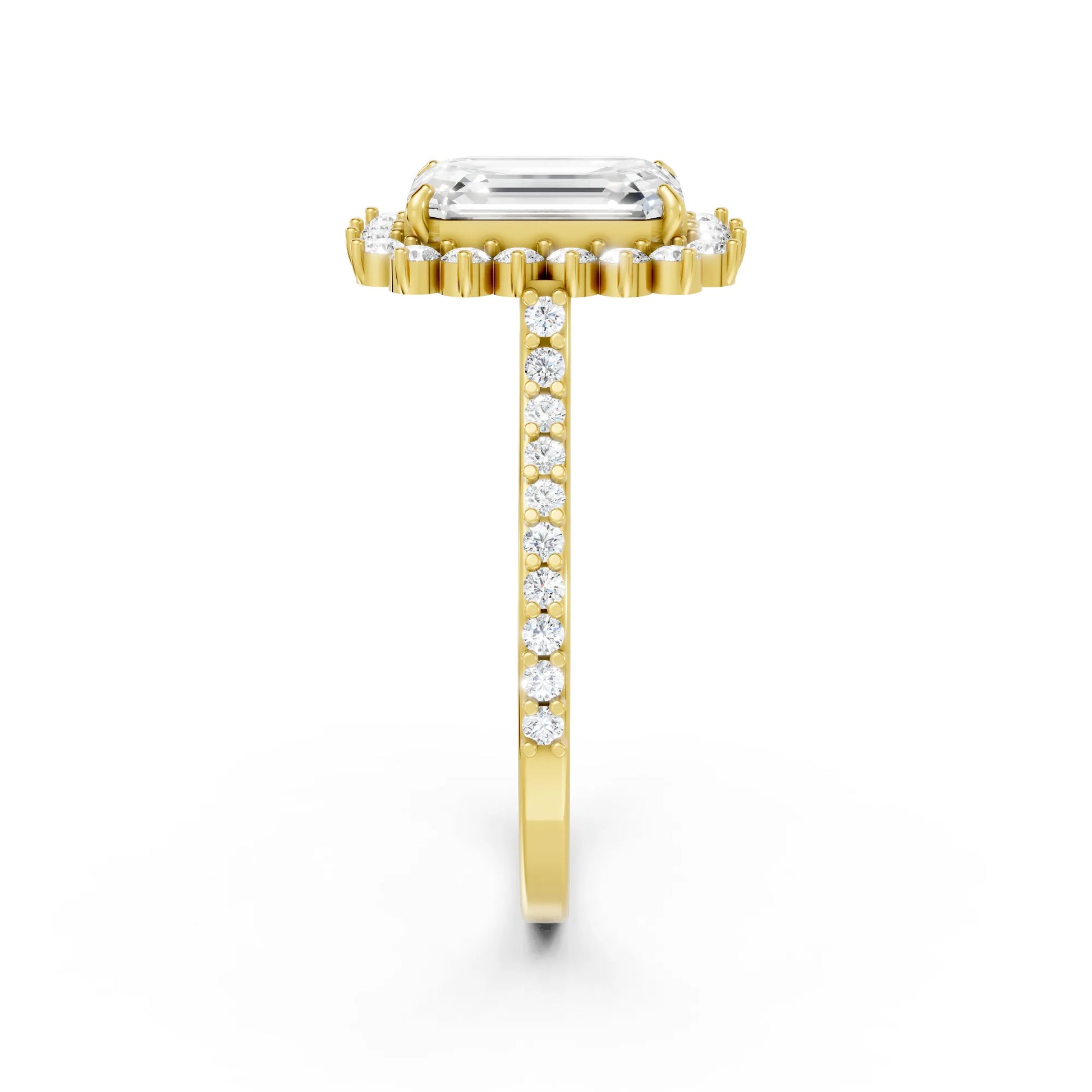 Crafted in solid 14k gold, this engagement ring showcases a sleek emerald cut lab-grown diamond framed by a floral-inspired halo. A pavé-set band enhances its brilliance, merging natural elegance with timeless sophistication.