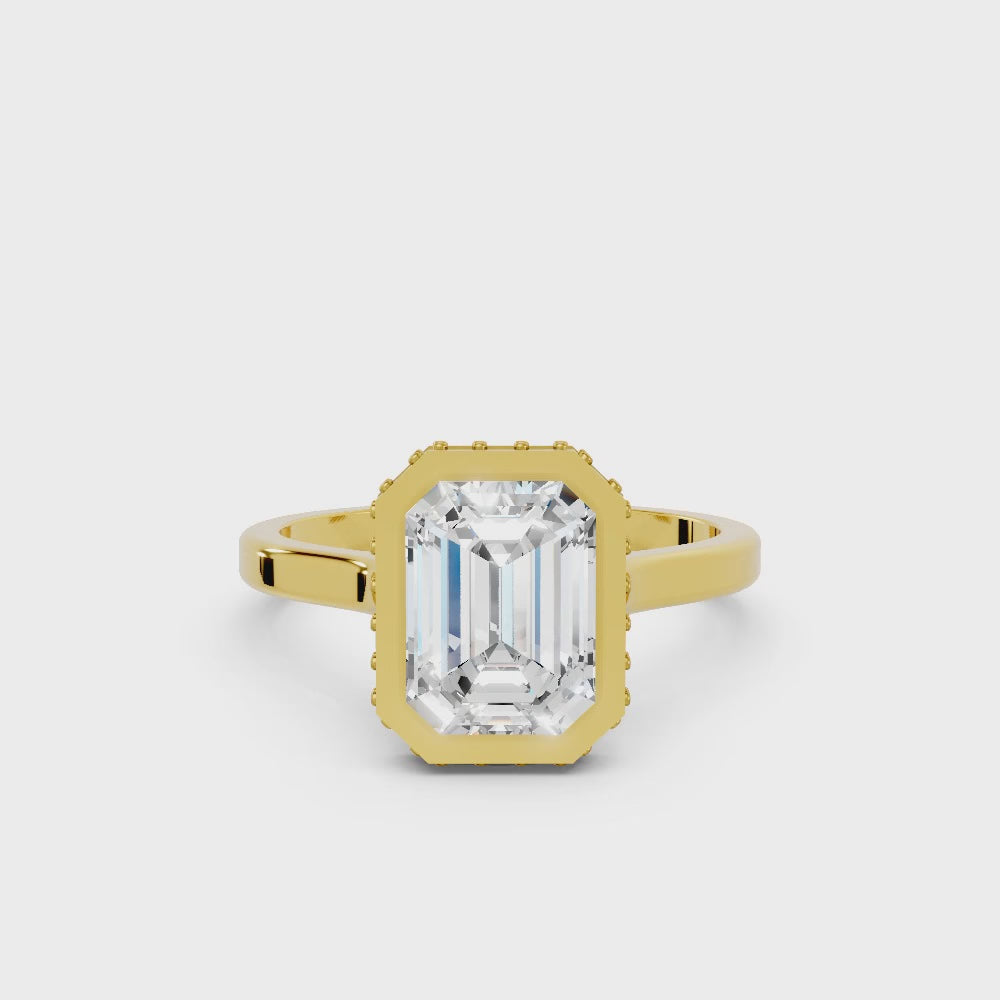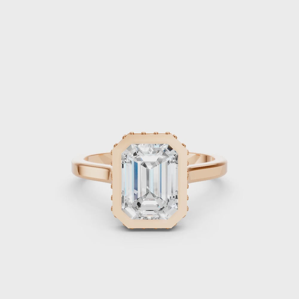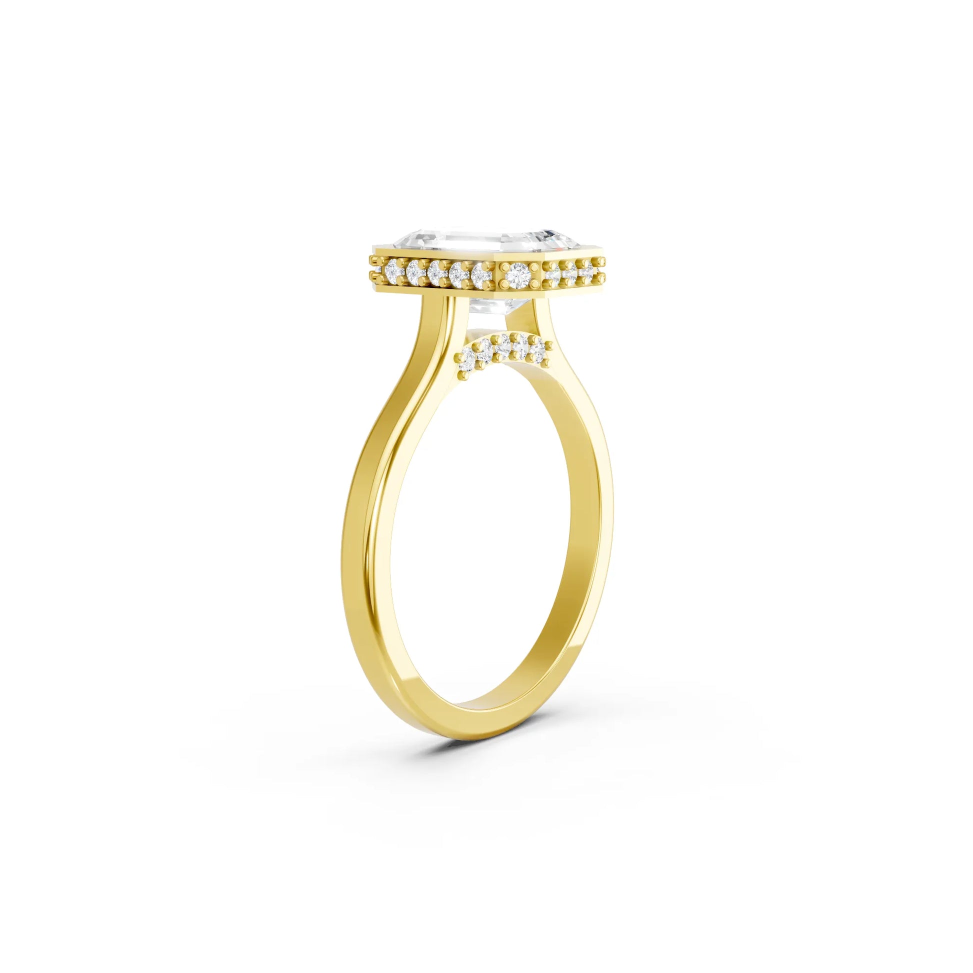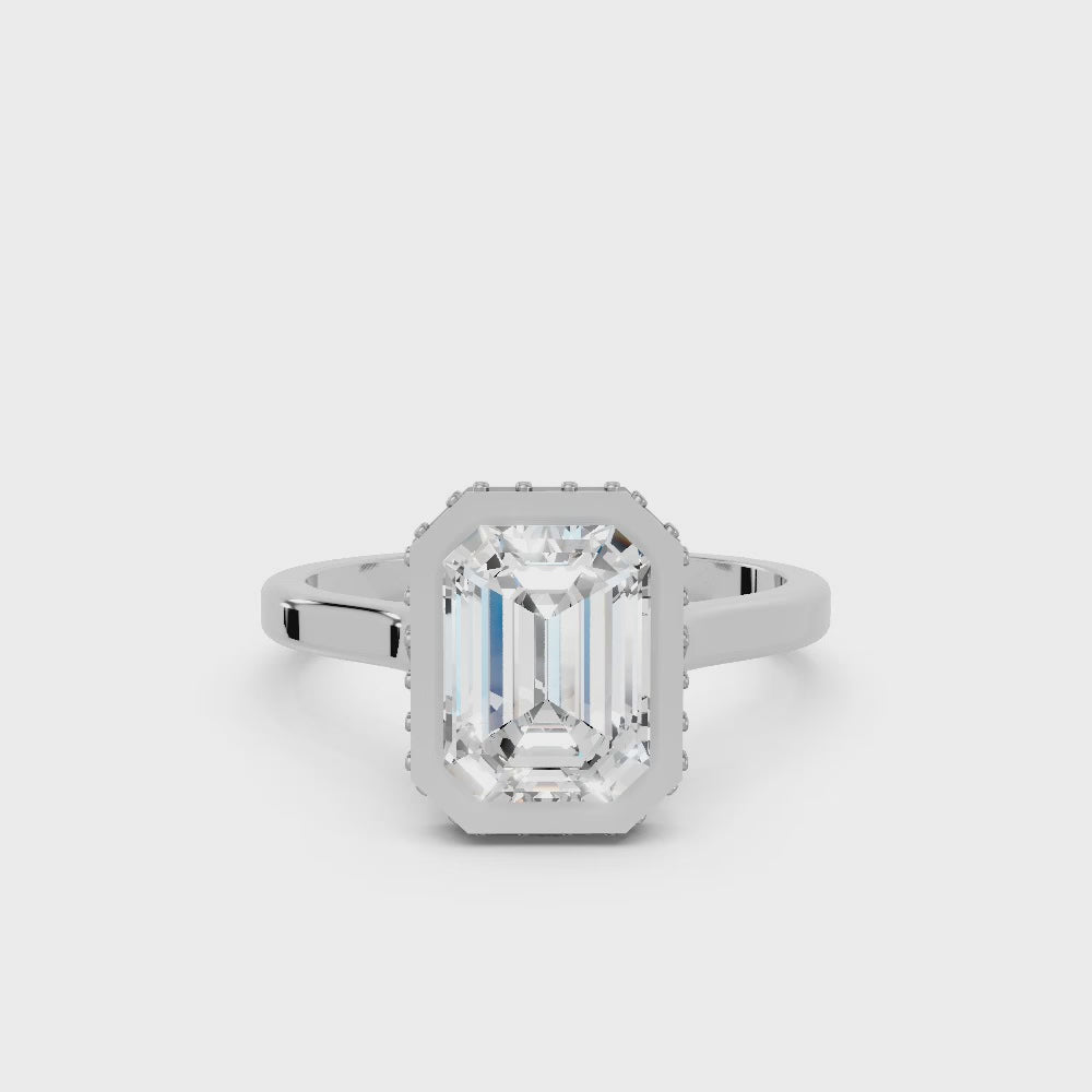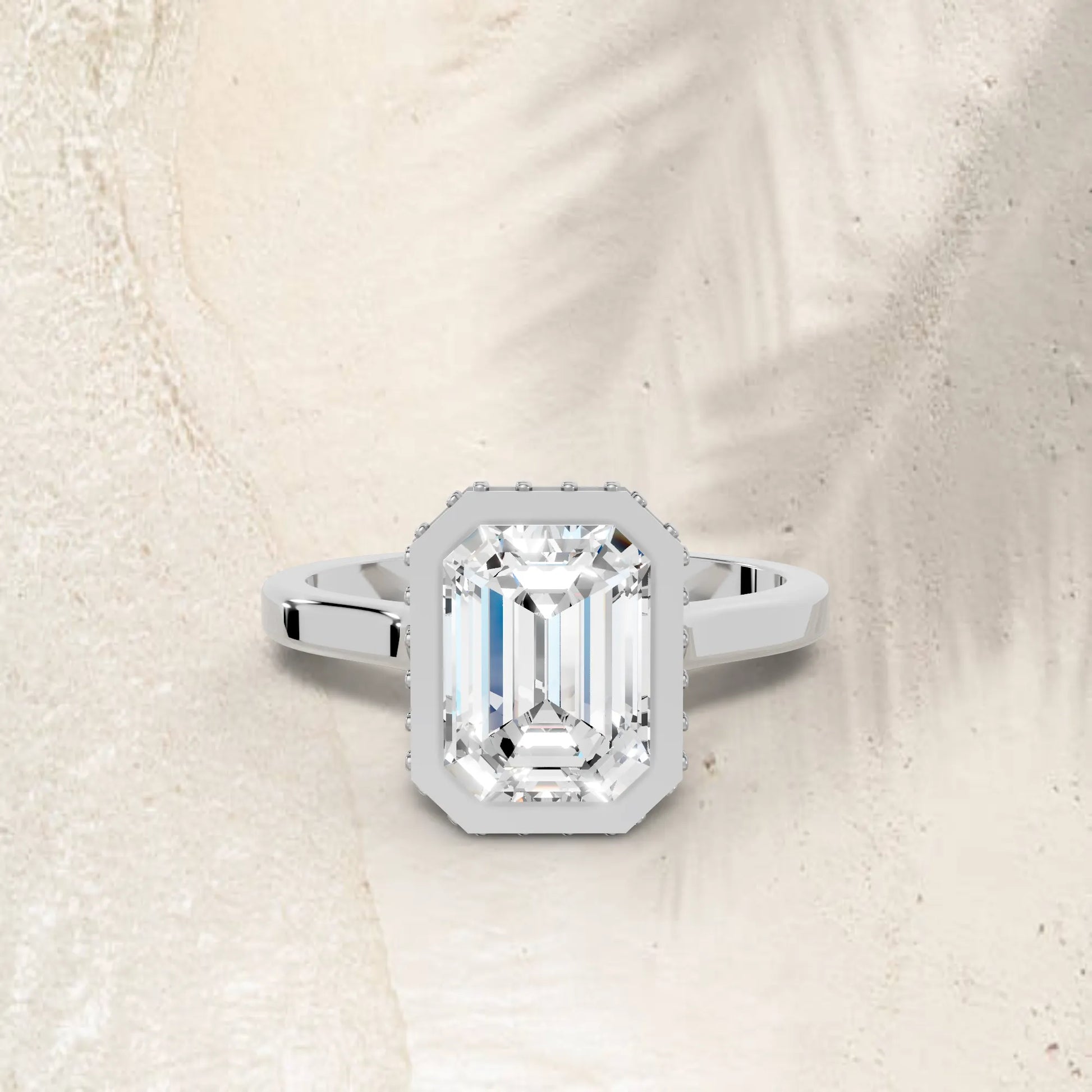 Crafted in solid 14k gold, this engagement ring showcases a sleek emerald cut lab-grown diamond in a refined bezel setting. A hidden halo beneath the stone adds radiant brilliance, merging modern minimalism with timeless sophistication.