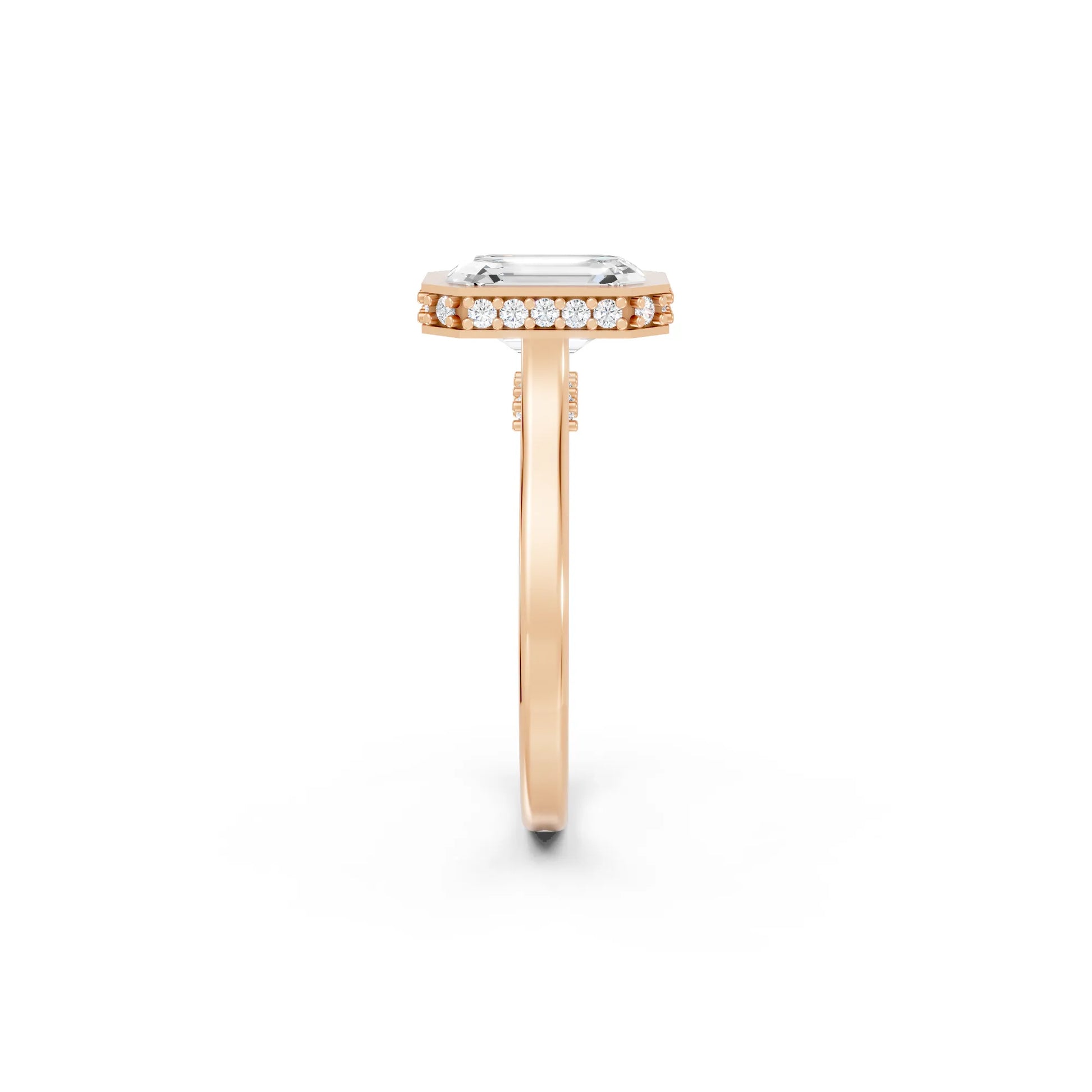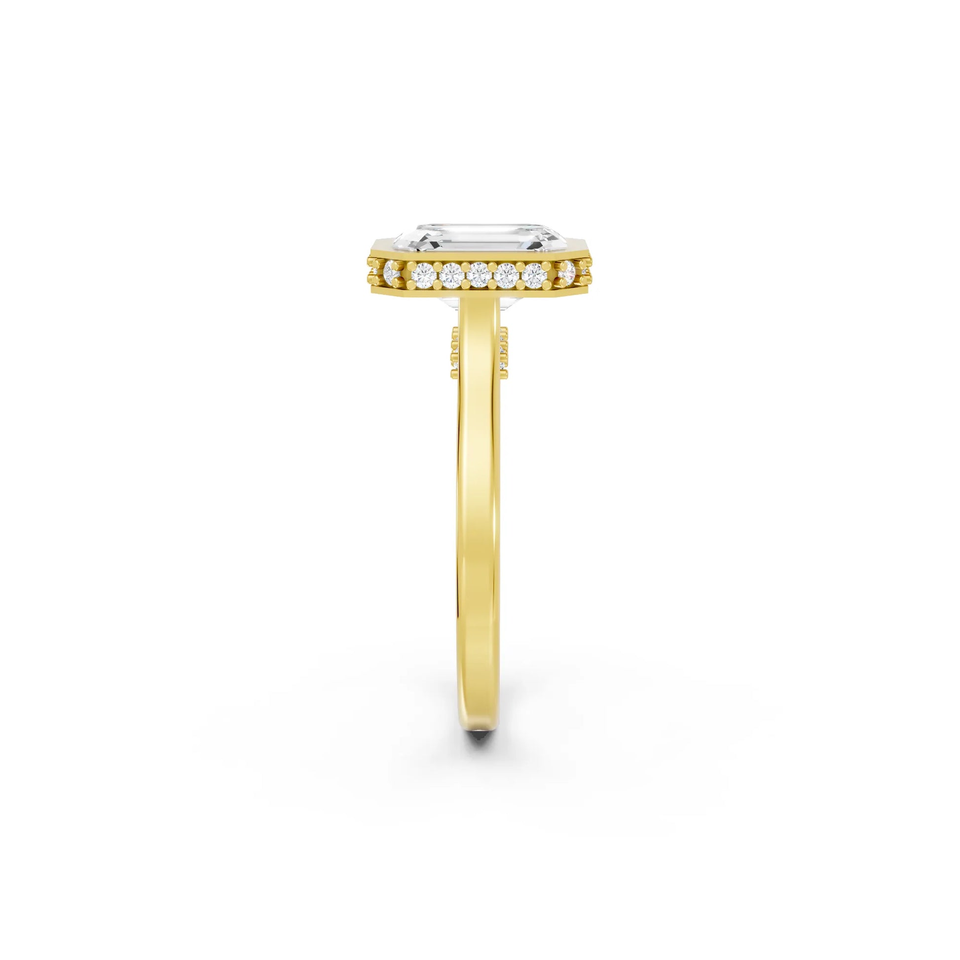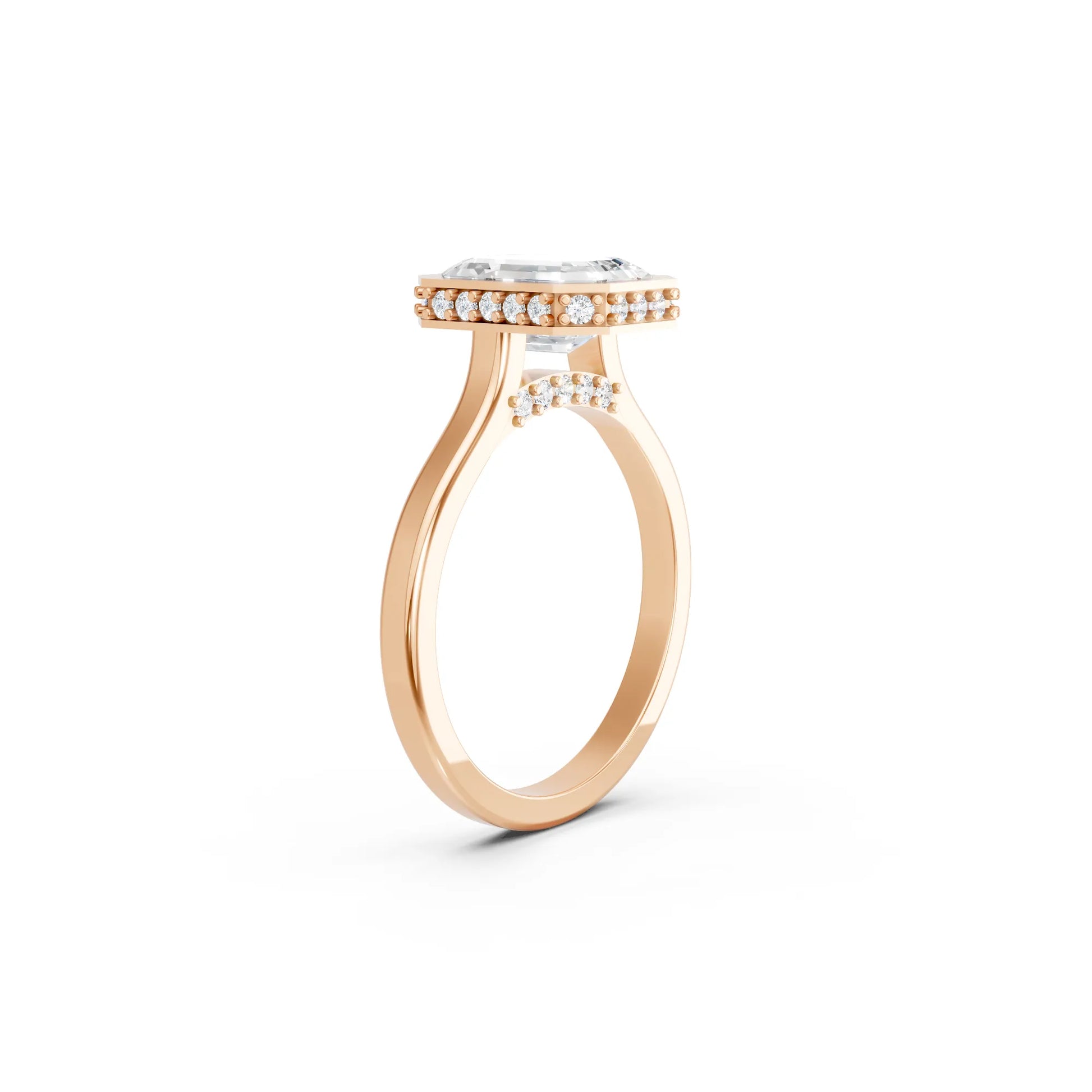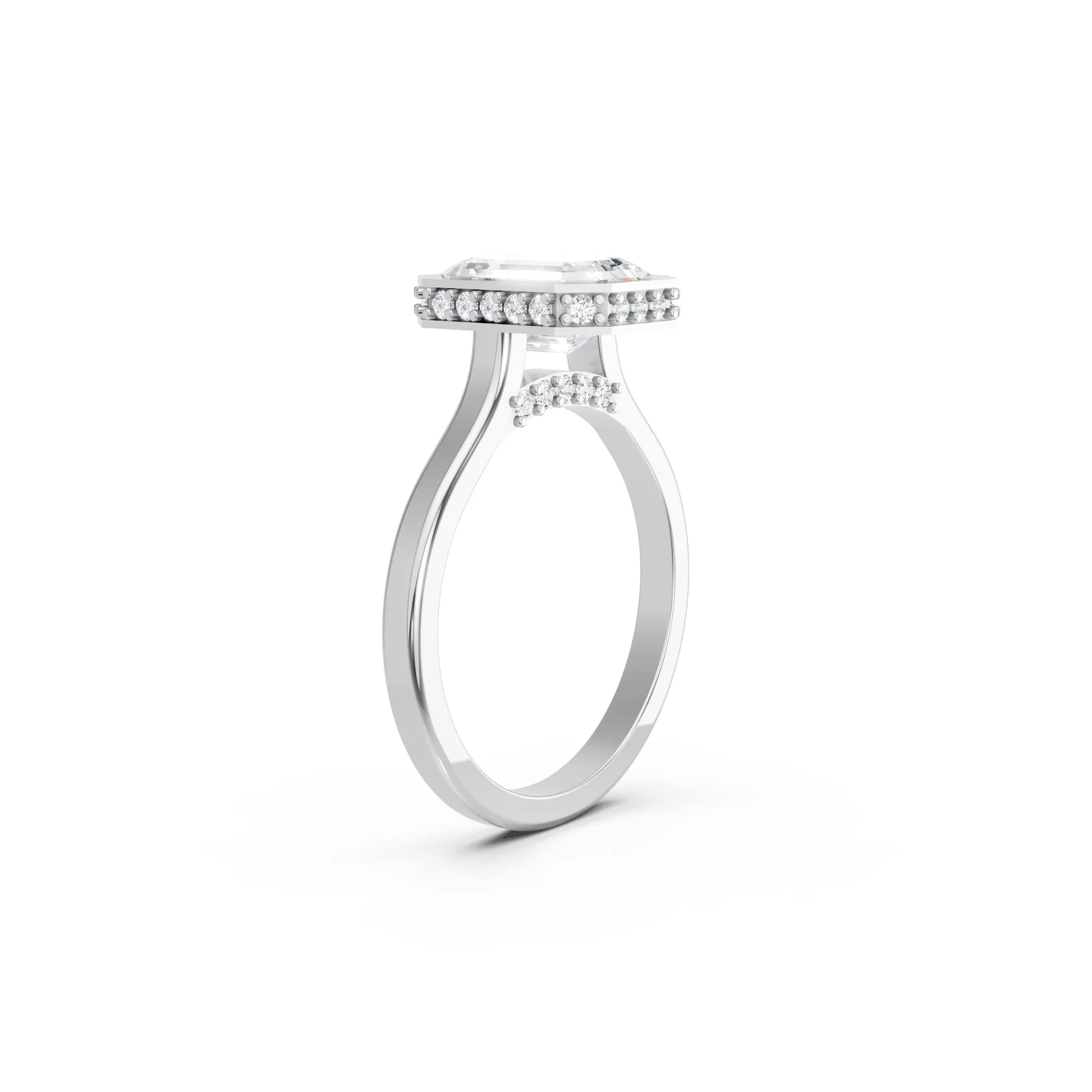 Crafted in solid 14k gold, this engagement ring showcases a sleek emerald cut lab-grown diamond in a refined bezel setting. A hidden halo beneath the stone adds radiant brilliance, merging modern minimalism with timeless sophistication.