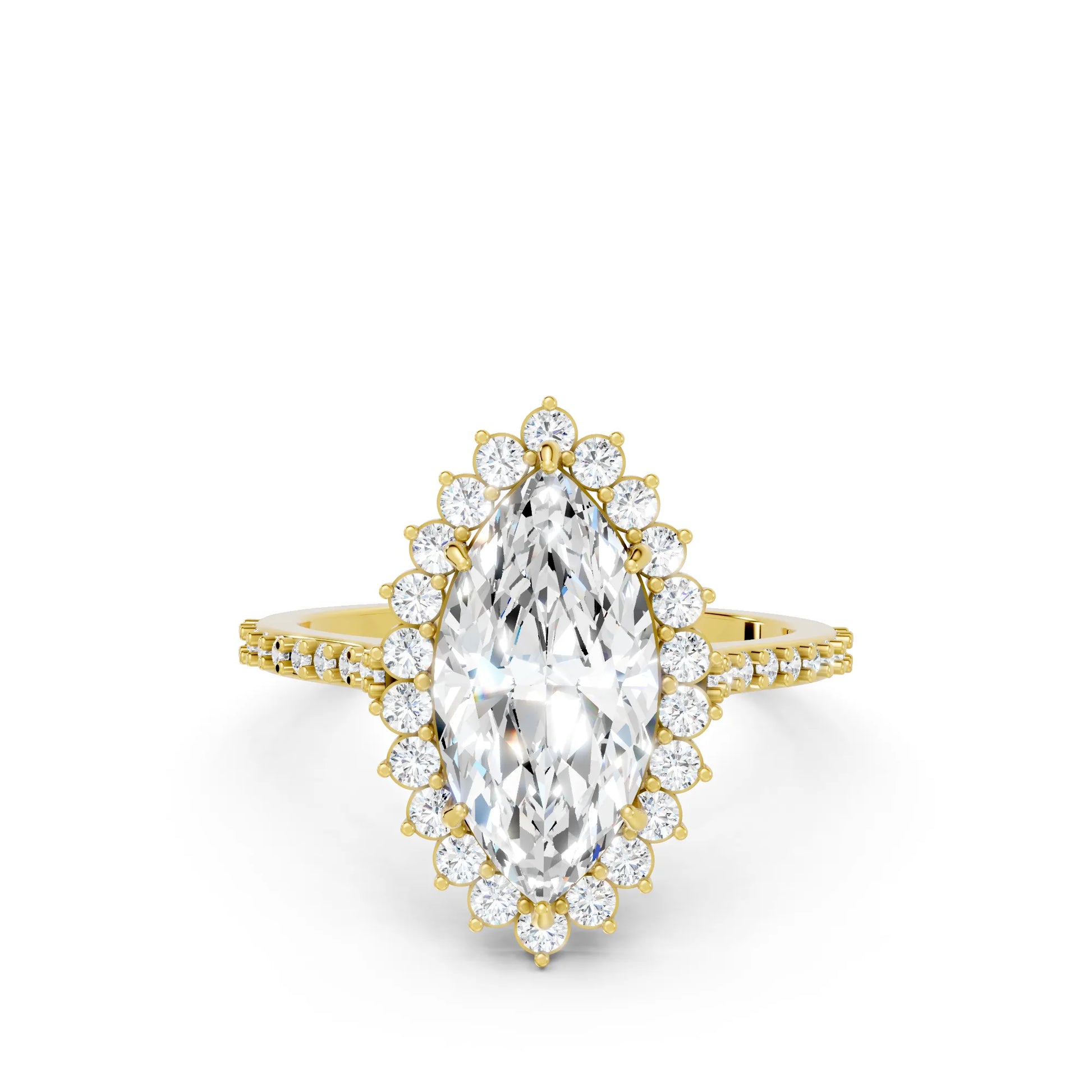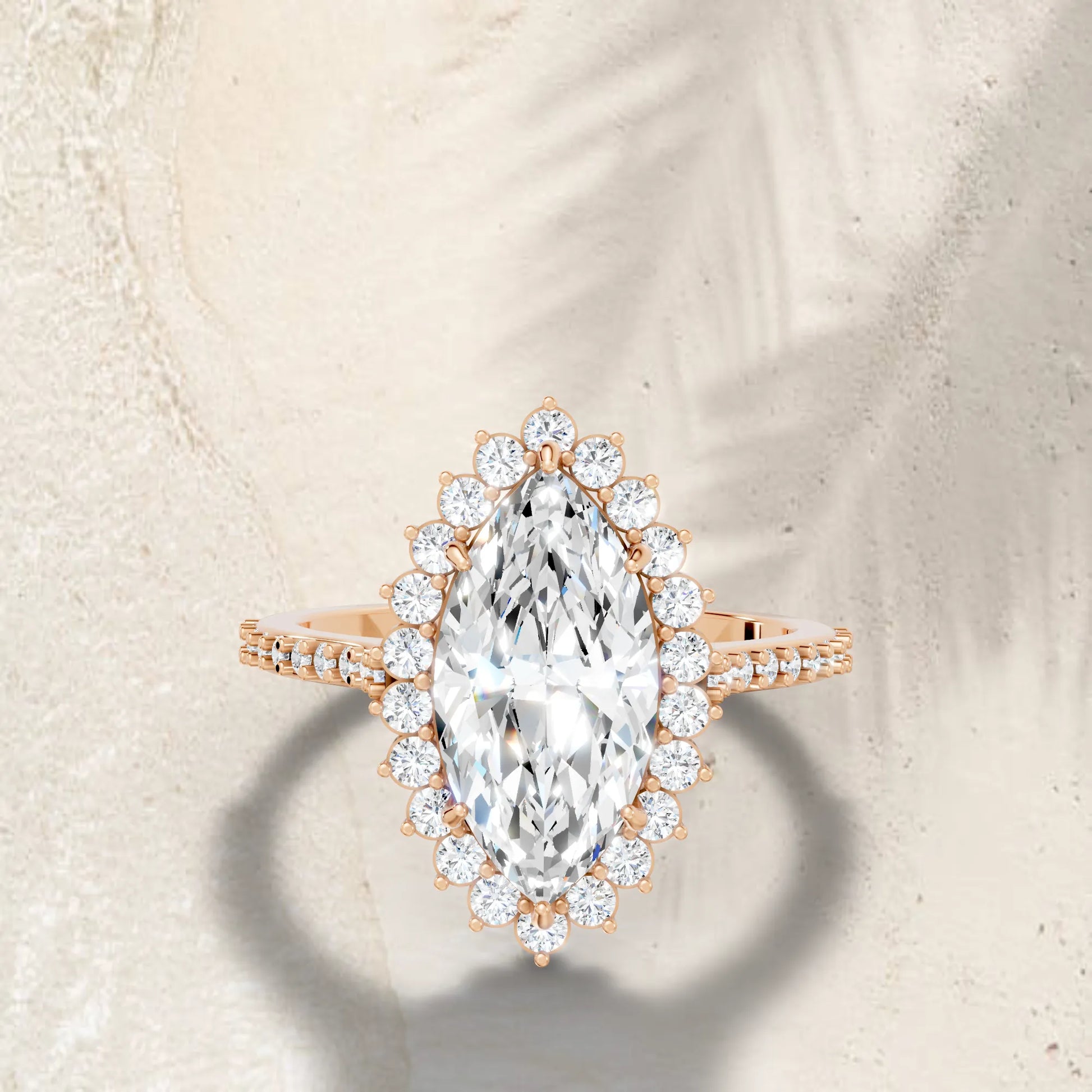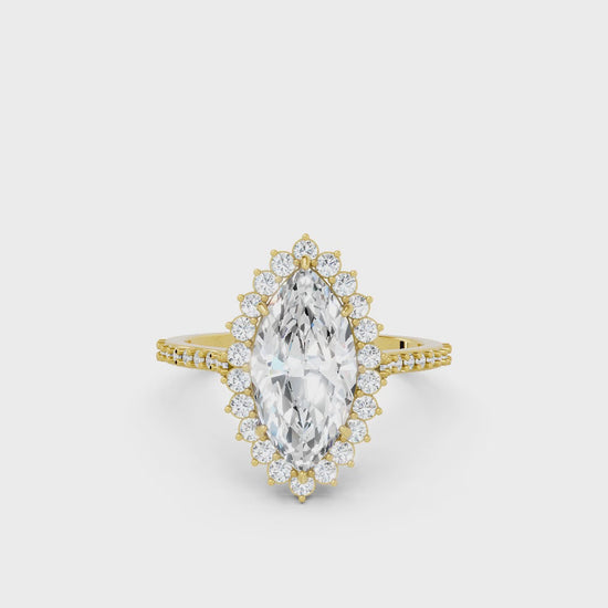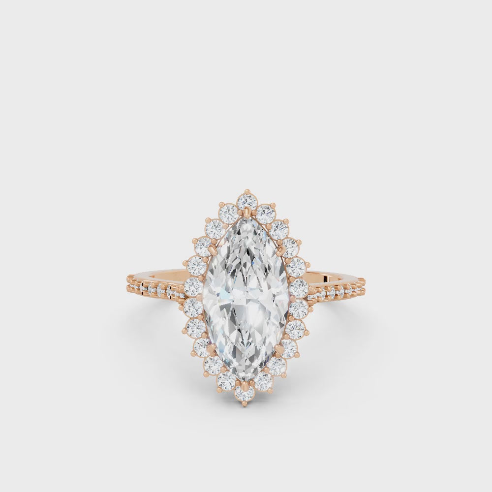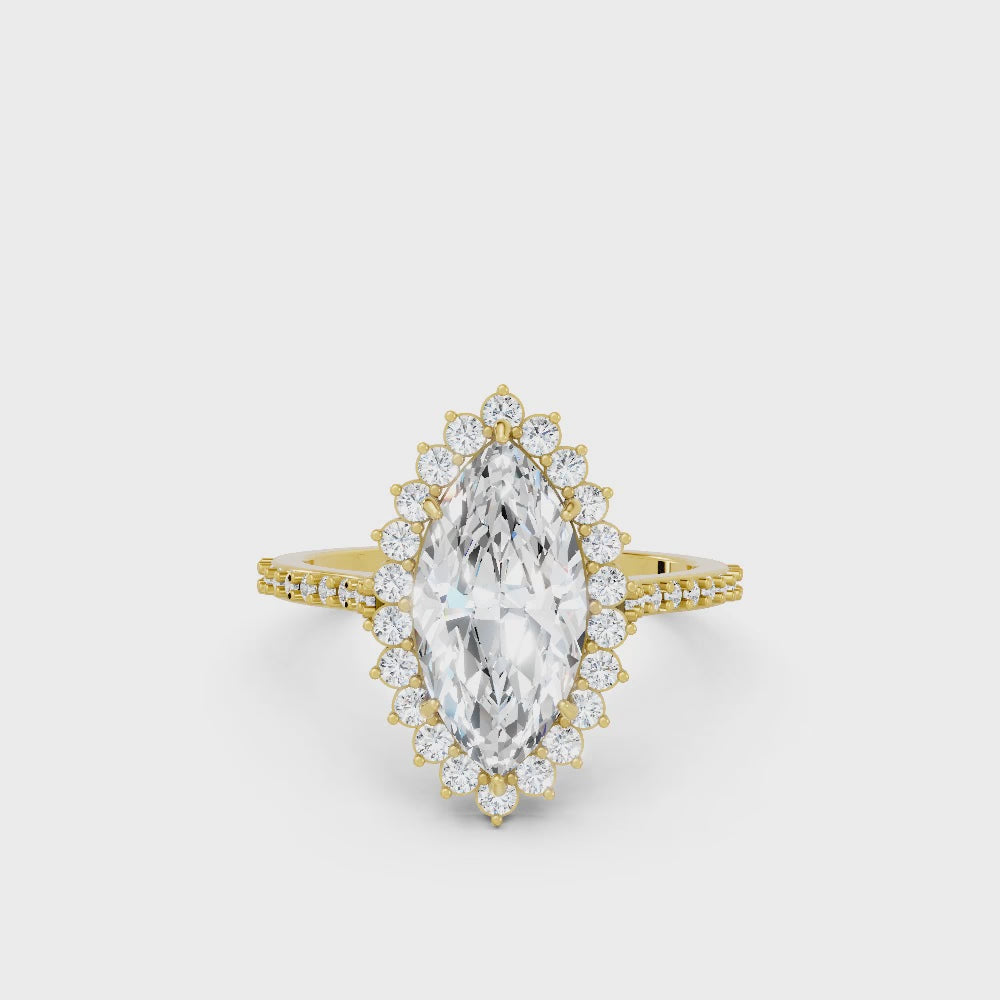 Crafted in solid 14k gold, this engagement ring showcases a graceful marquise cut lab-grown diamond surrounded by a floral-inspired halo. A pavé-set band enhances its brilliance, combining nature’s charm with timeless sophistication.