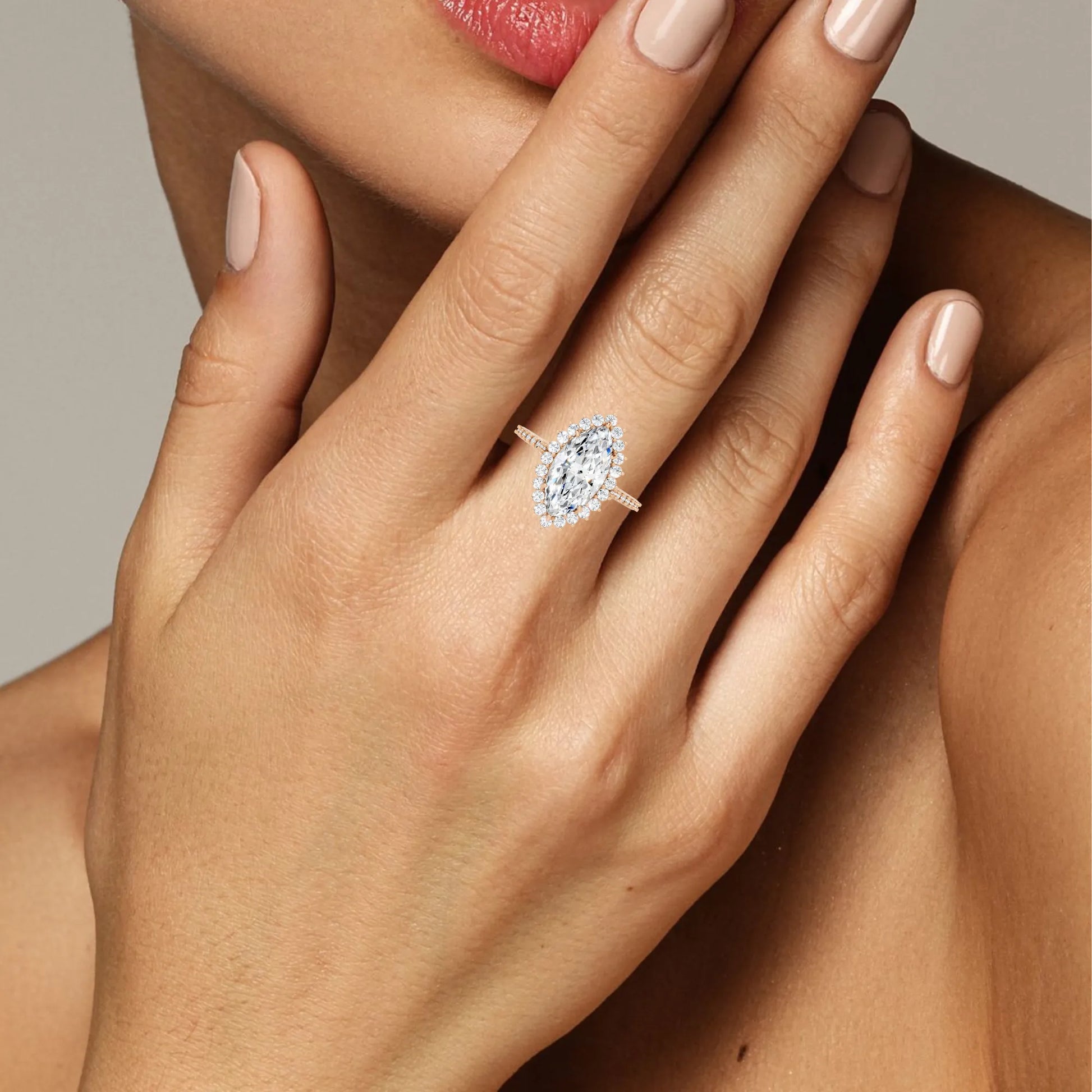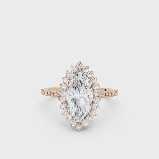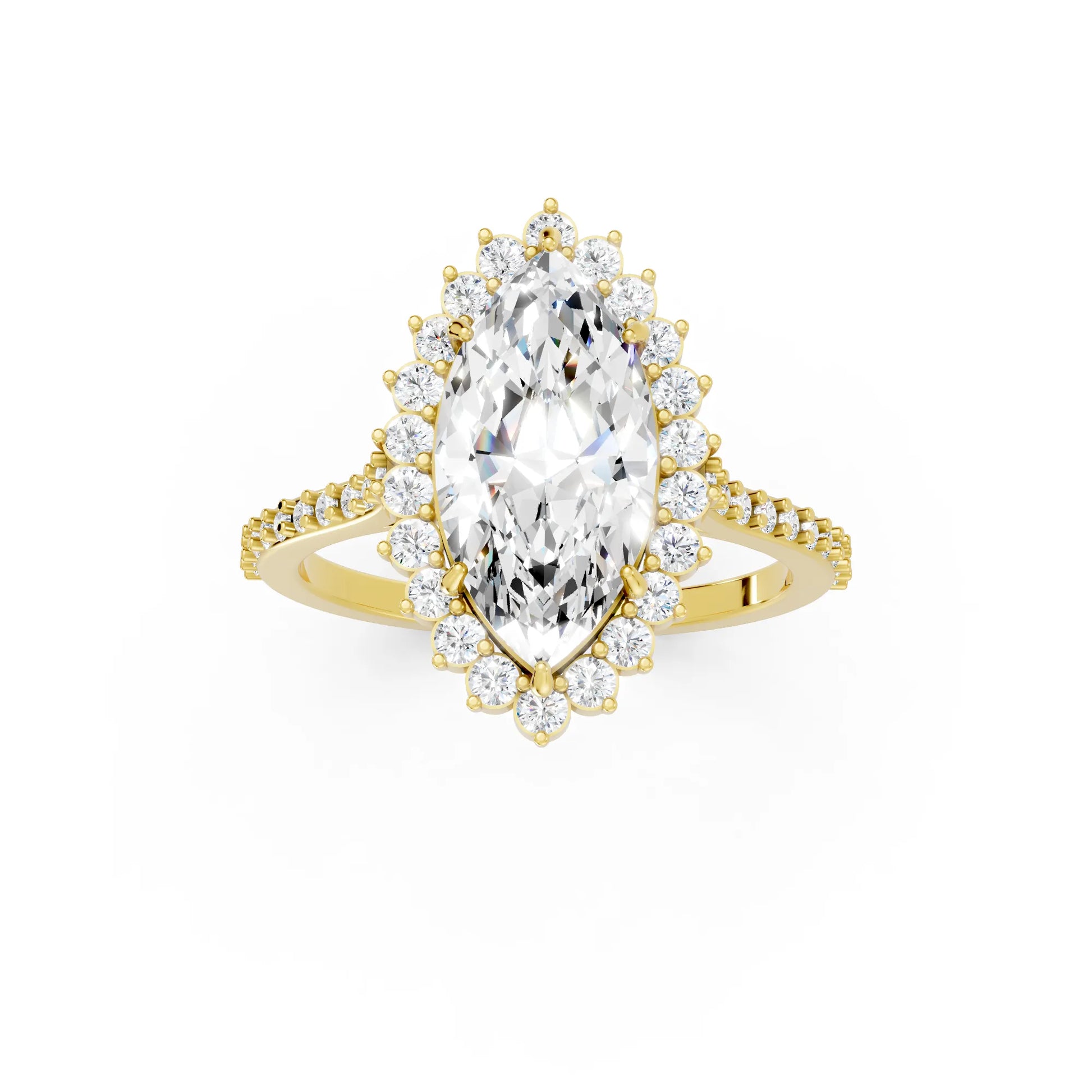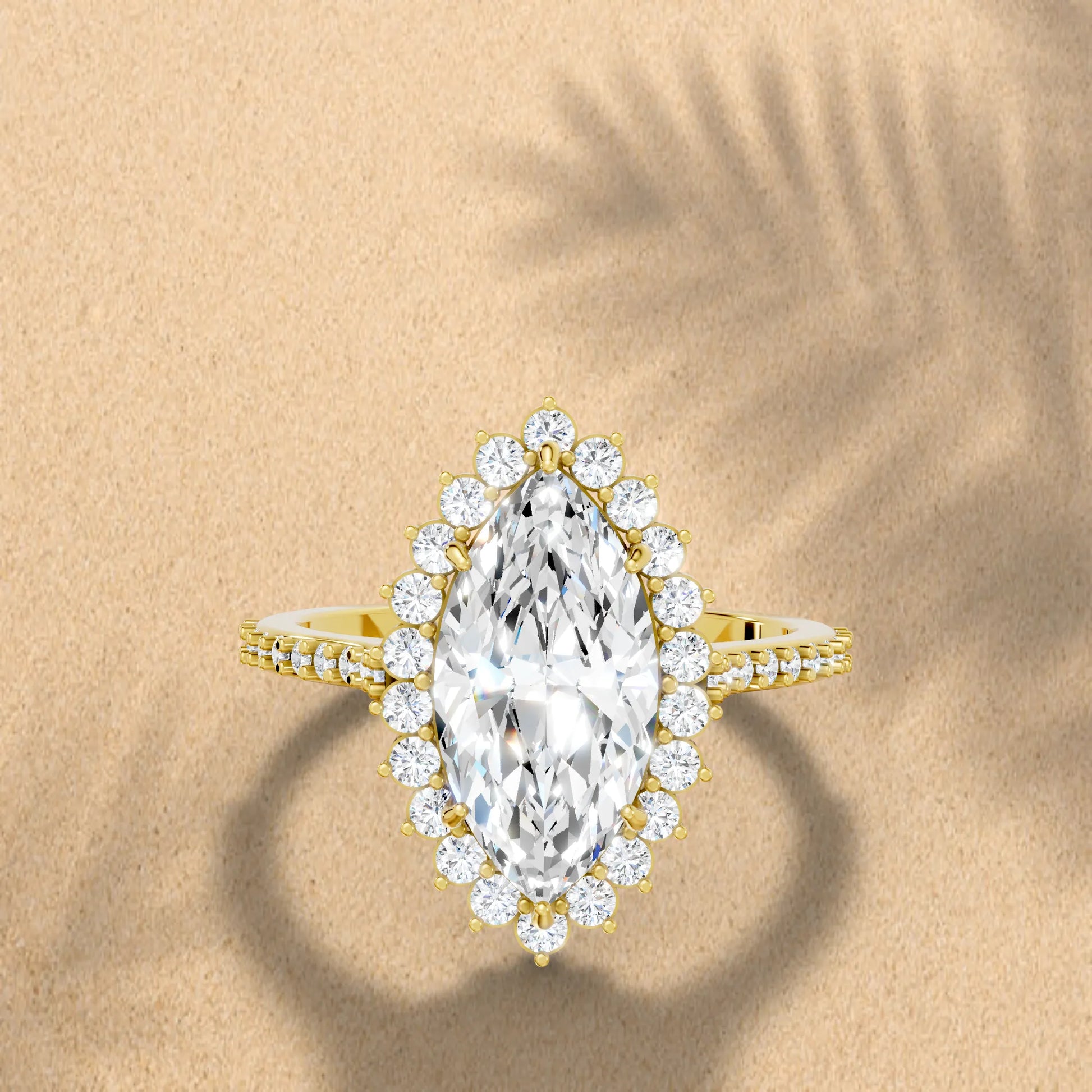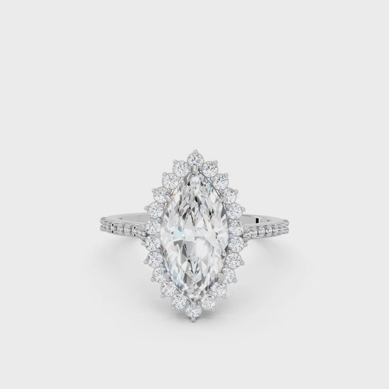 Crafted in solid 14k gold, this engagement ring showcases a graceful marquise cut lab-grown diamond surrounded by a floral-inspired halo. A pavé-set band enhances its brilliance, combining nature’s charm with timeless sophistication.