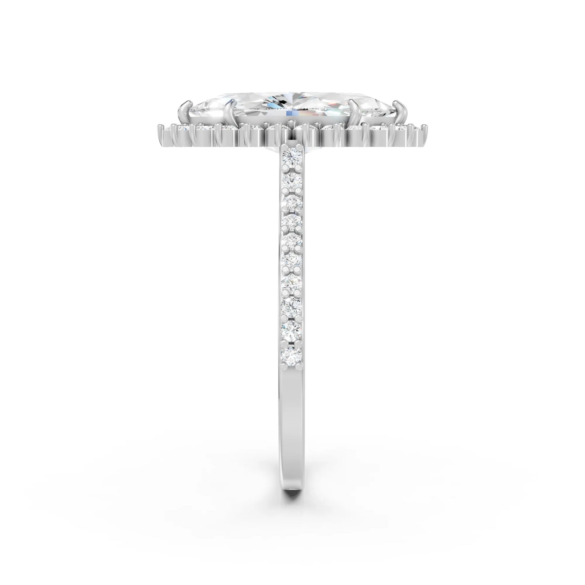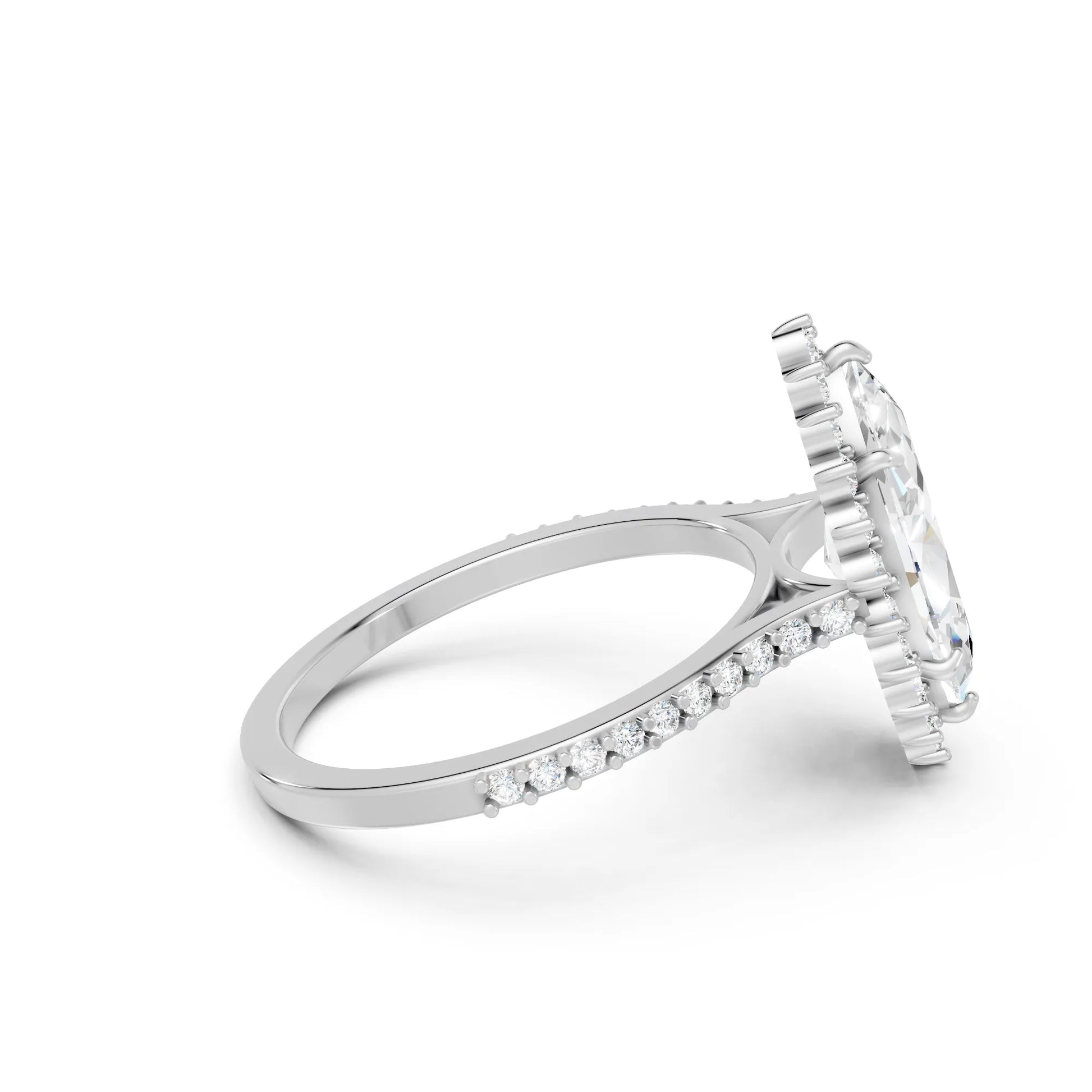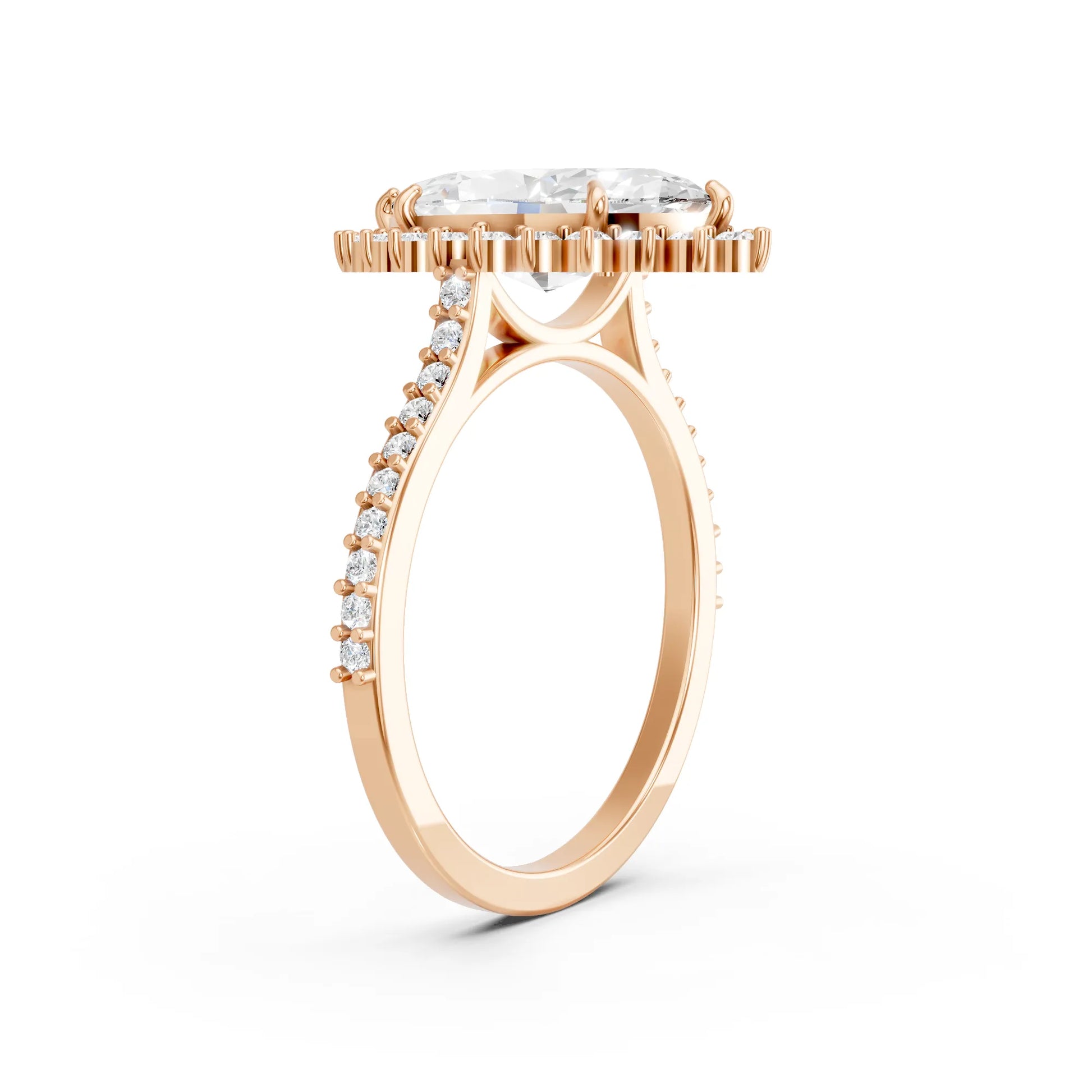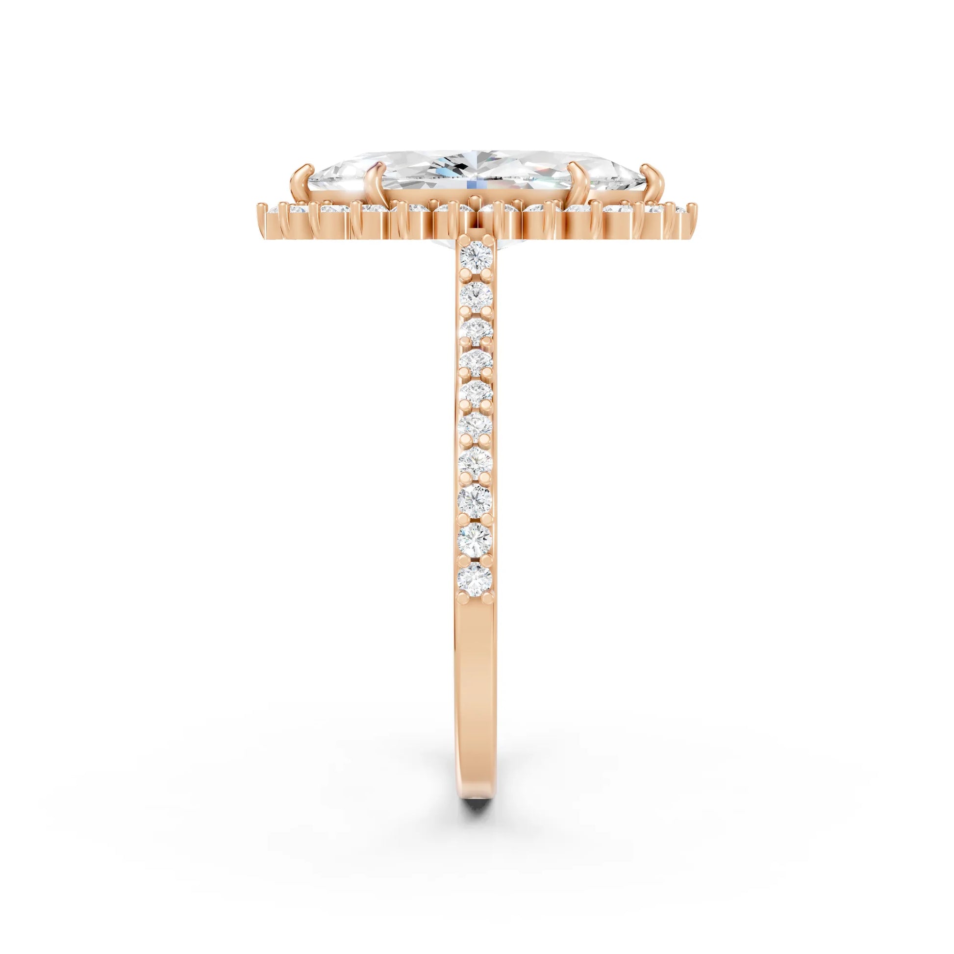 Crafted in solid 14k gold, this engagement ring showcases a graceful marquise cut lab-grown diamond surrounded by a floral-inspired halo. A pavé-set band enhances its brilliance, combining nature’s charm with timeless sophistication.