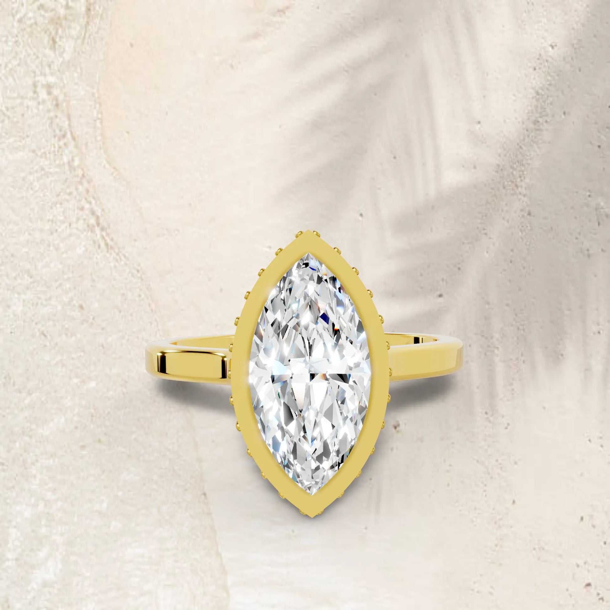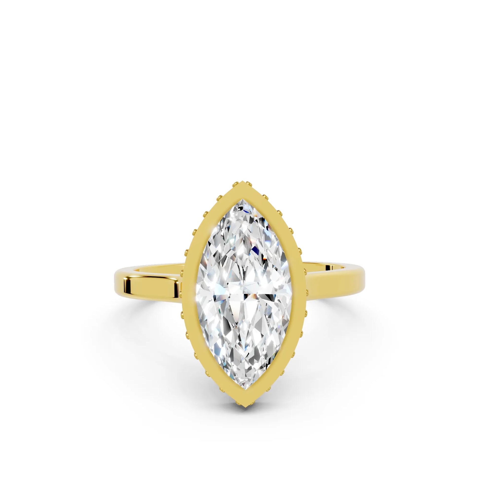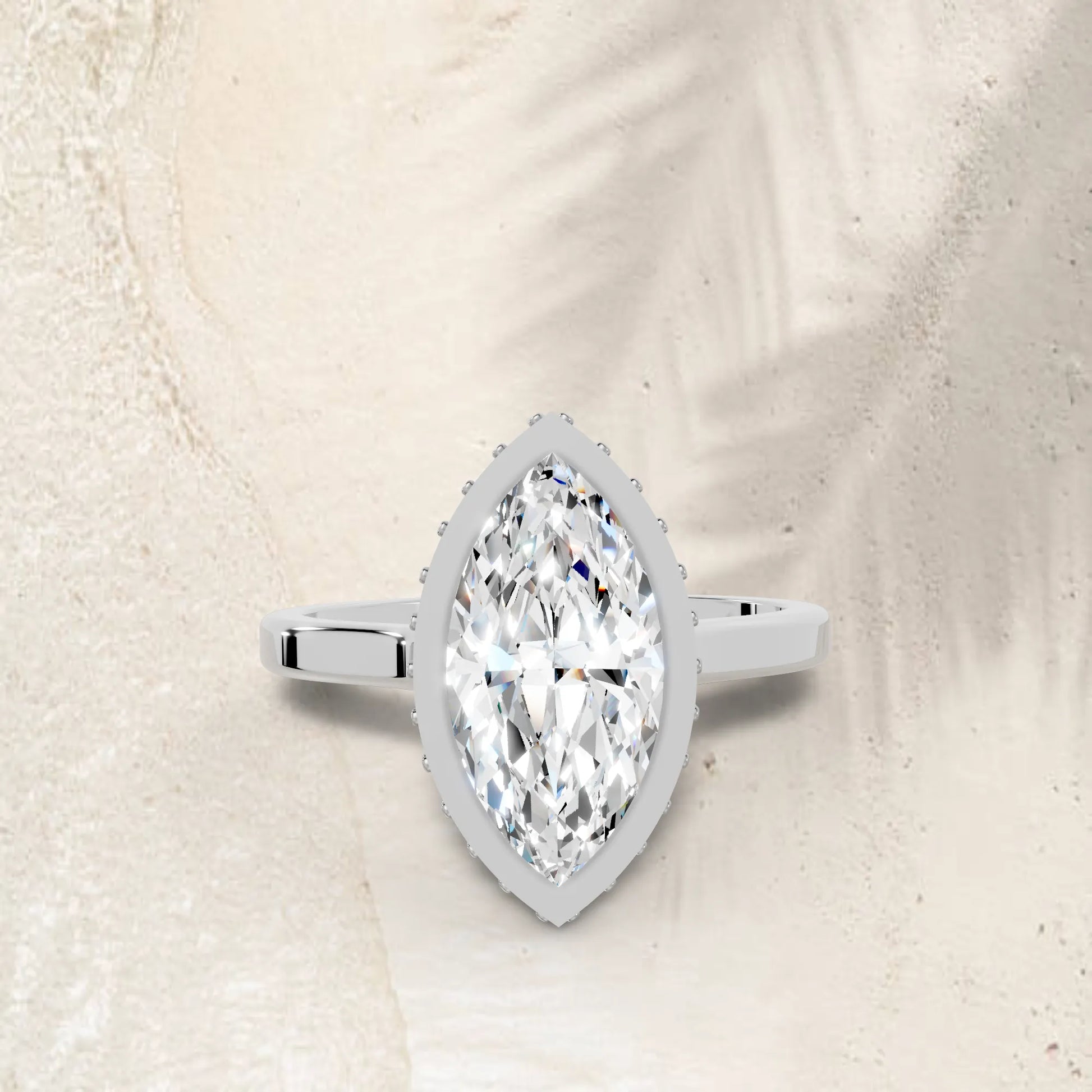 Crafted in solid 14k gold, this engagement ring showcases a graceful marquise cut lab-grown diamond in a smooth bezel setting. A hidden halo adds radiant sparkle, blending sleek modern style with timeless charm.