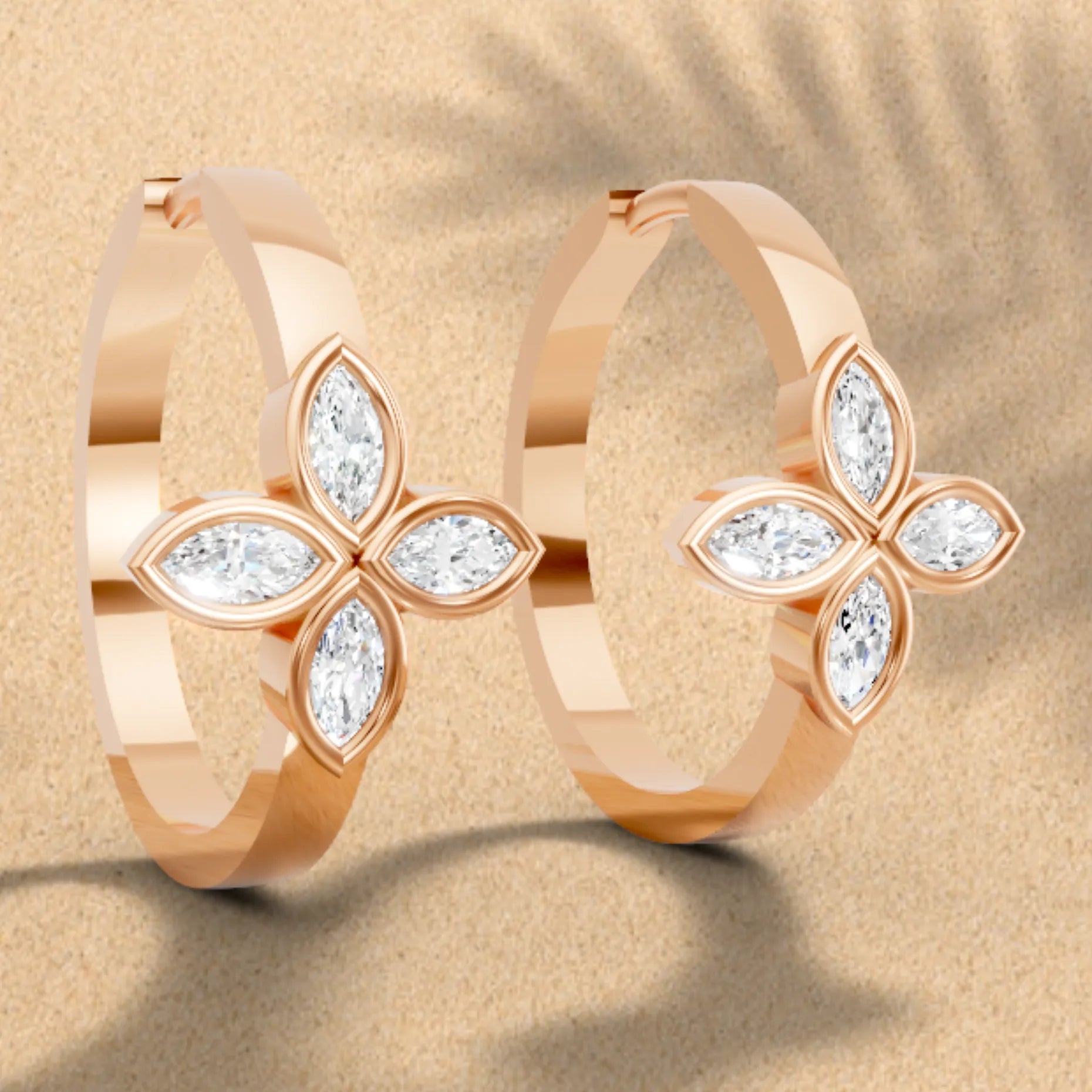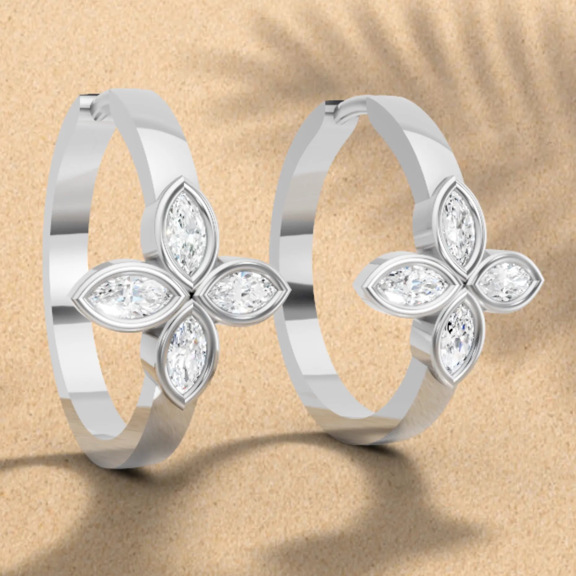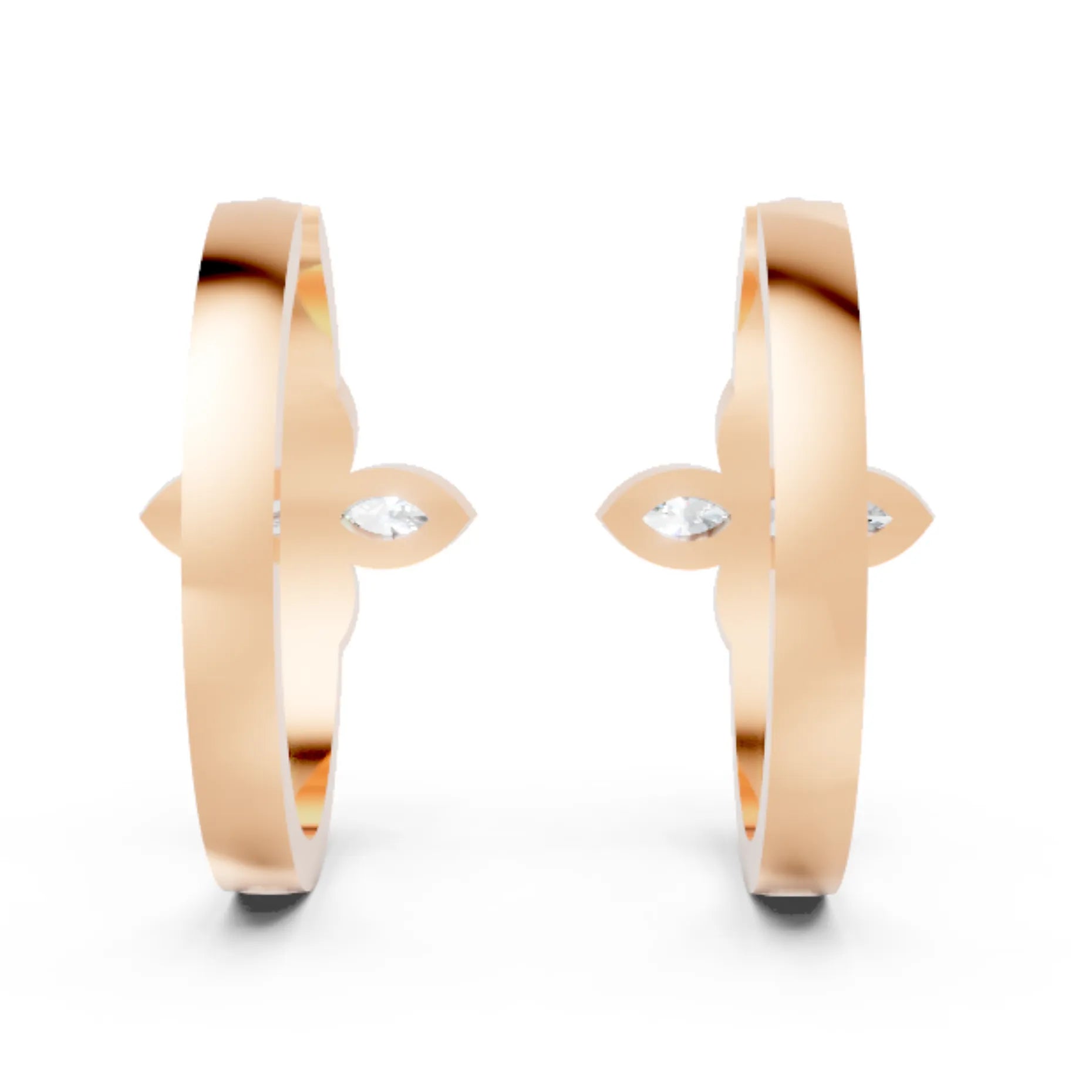 Crafted in solid 14k gold, this hoop earring features two marquise cut lab-grown diamonds in delicate floral bezel settings. A nature-inspired twin design that adds graceful sparkle with a modern touch.