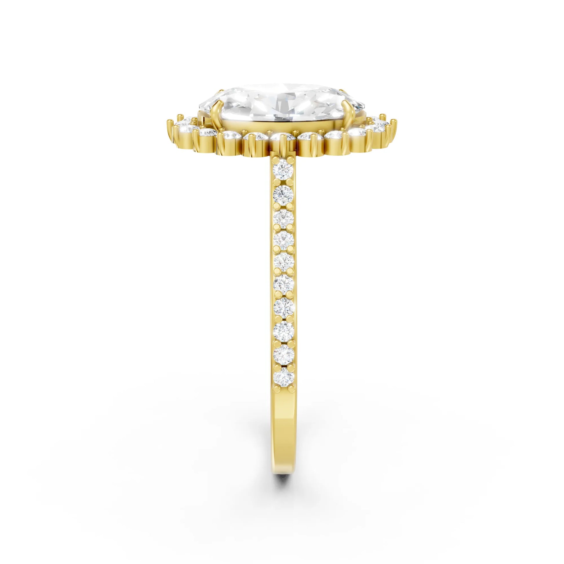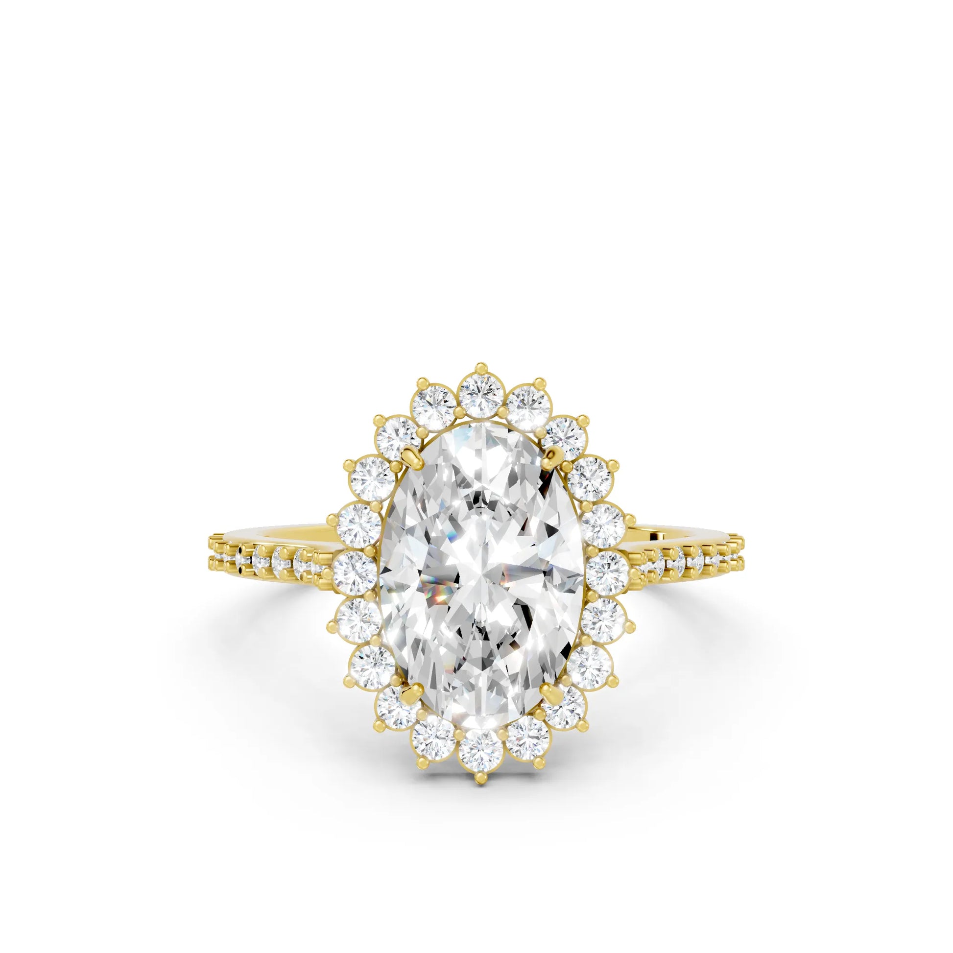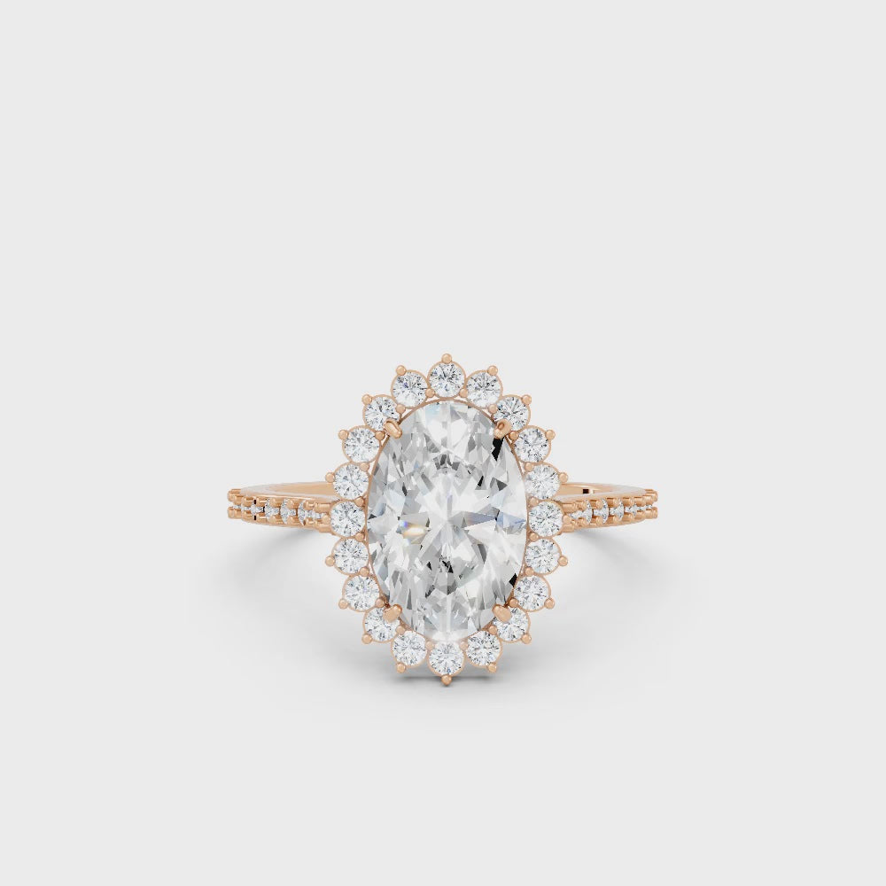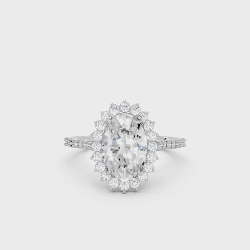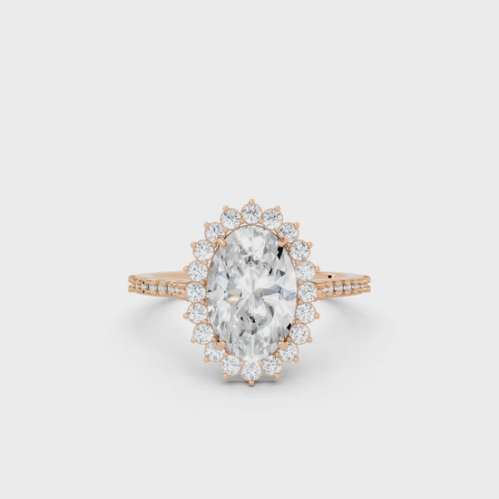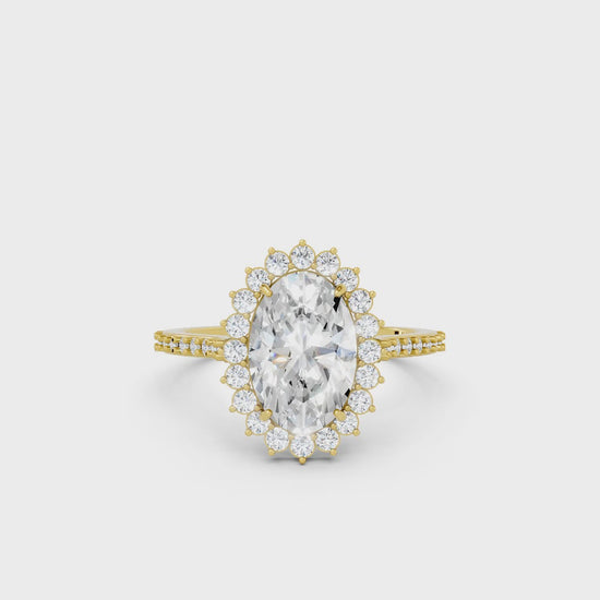 Crafted in solid 14k gold, this engagement ring features a brilliant oval cut lab-grown diamond encircled by a floral-inspired halo. The pavé-set band adds radiant sparkle, blending natural beauty with timeless elegance.