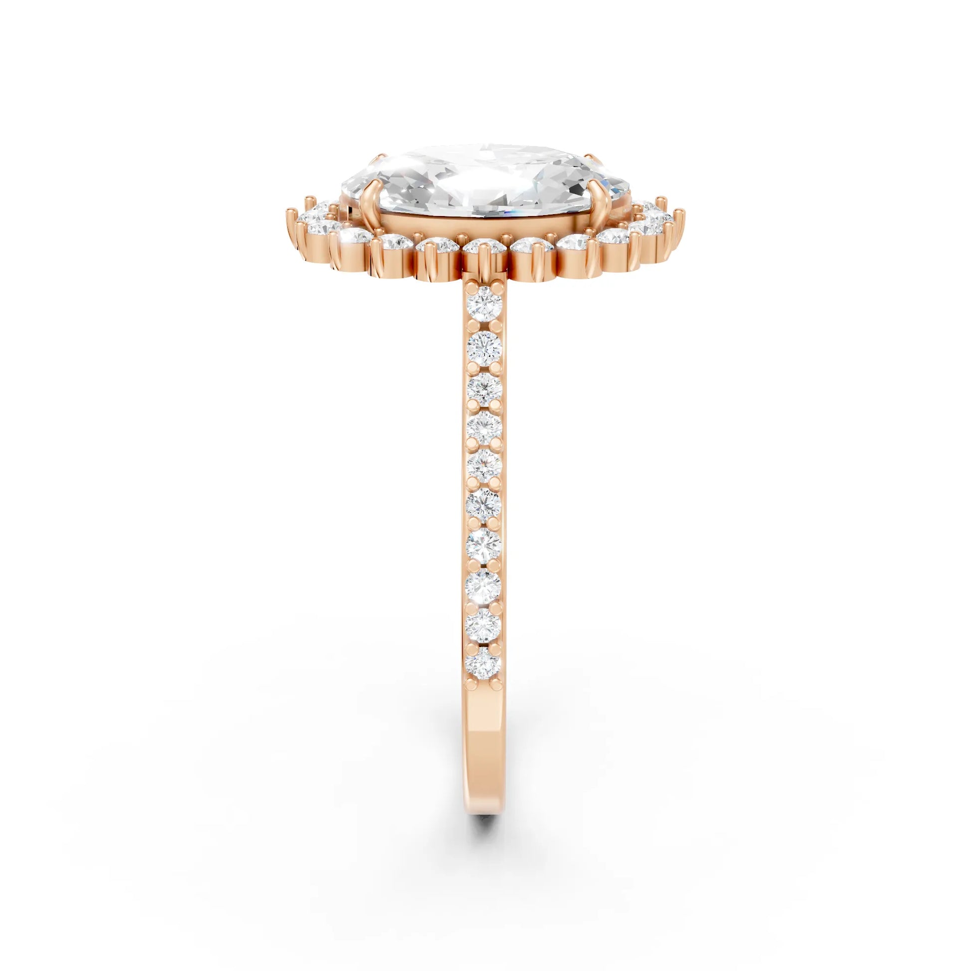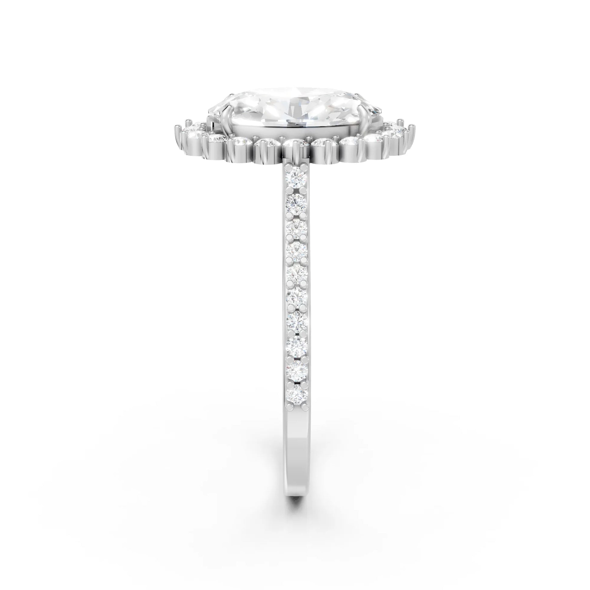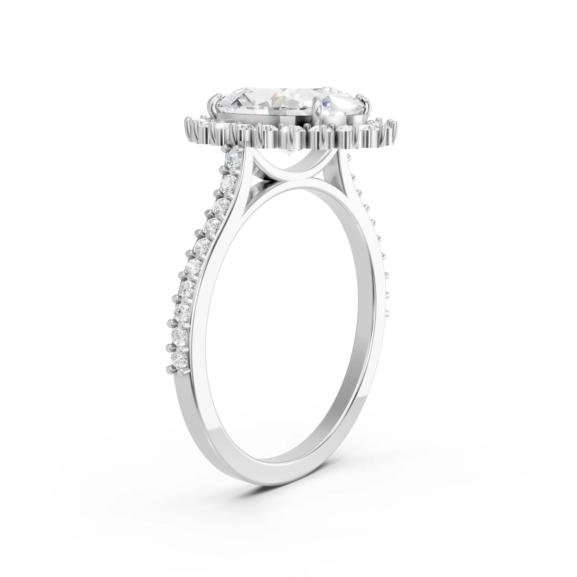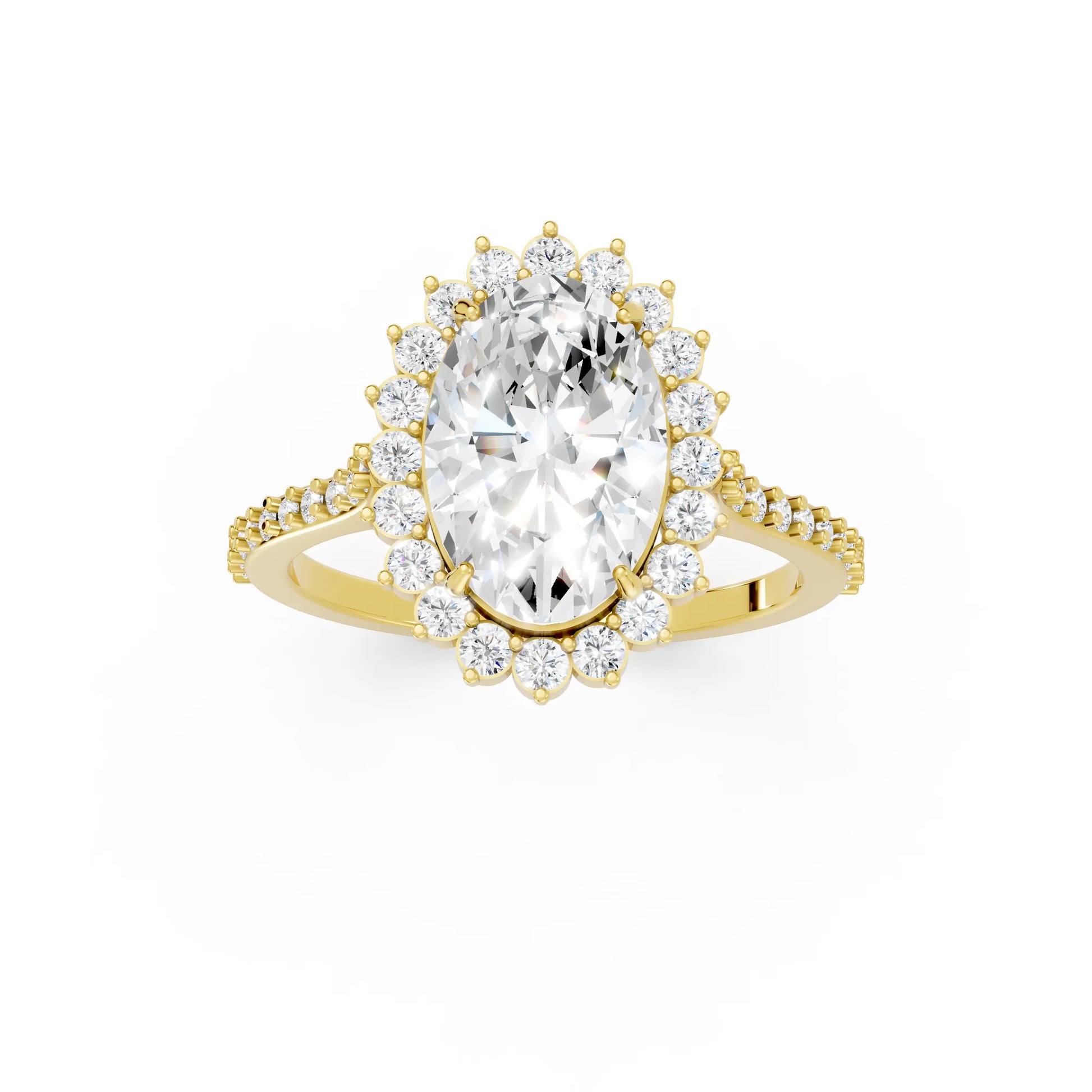 Crafted in solid 14k gold, this engagement ring features a brilliant oval cut lab-grown diamond encircled by a floral-inspired halo. The pavé-set band adds radiant sparkle, blending natural beauty with timeless elegance.