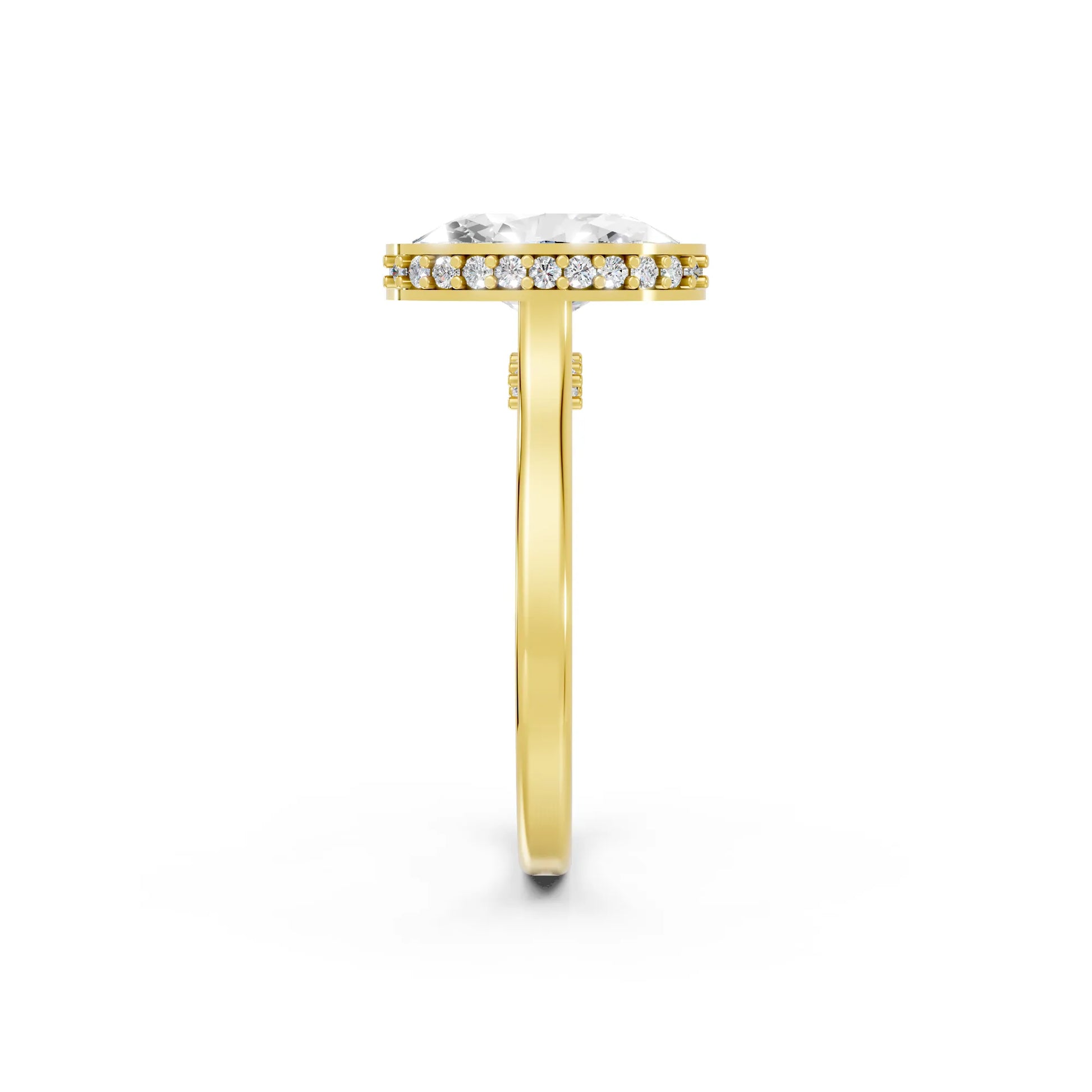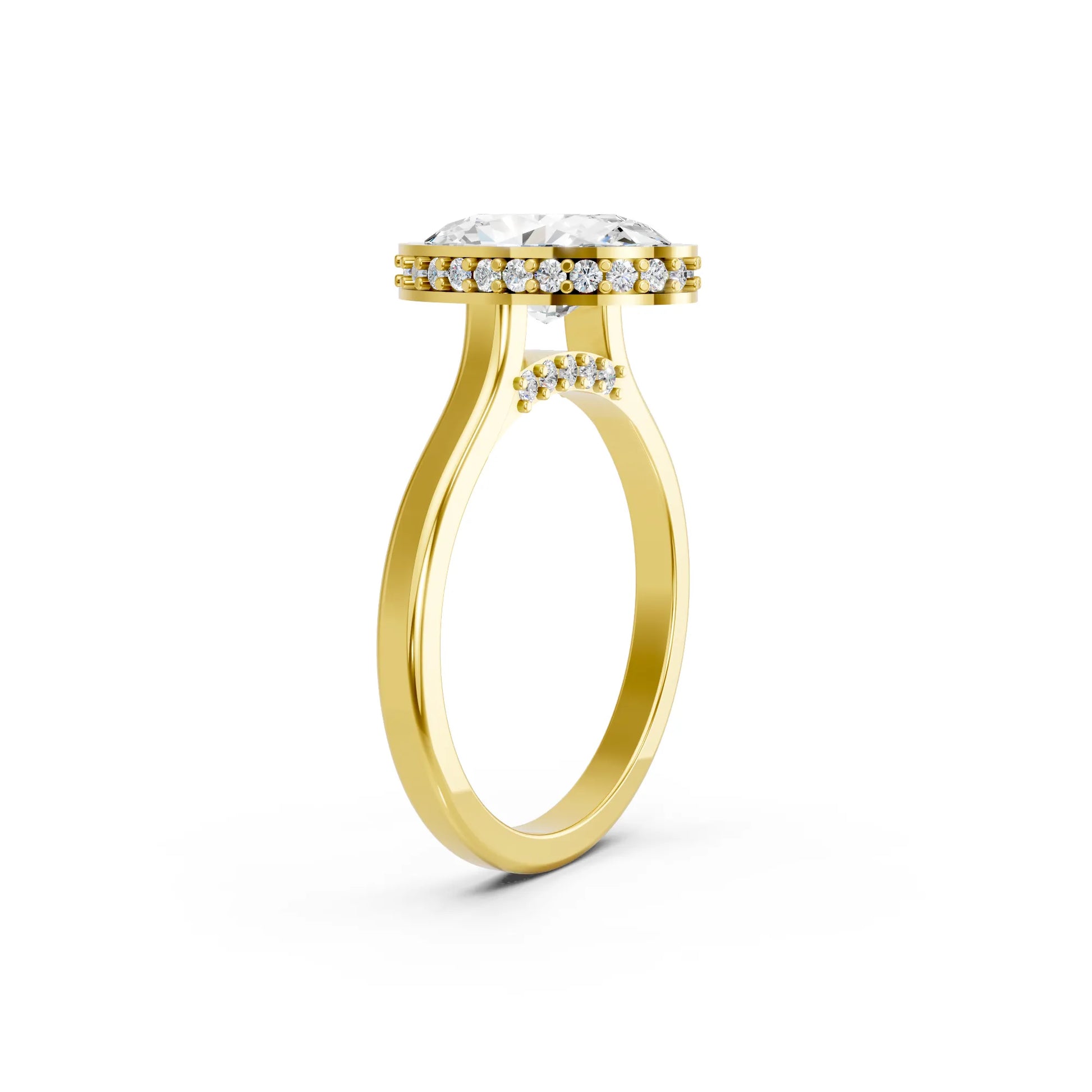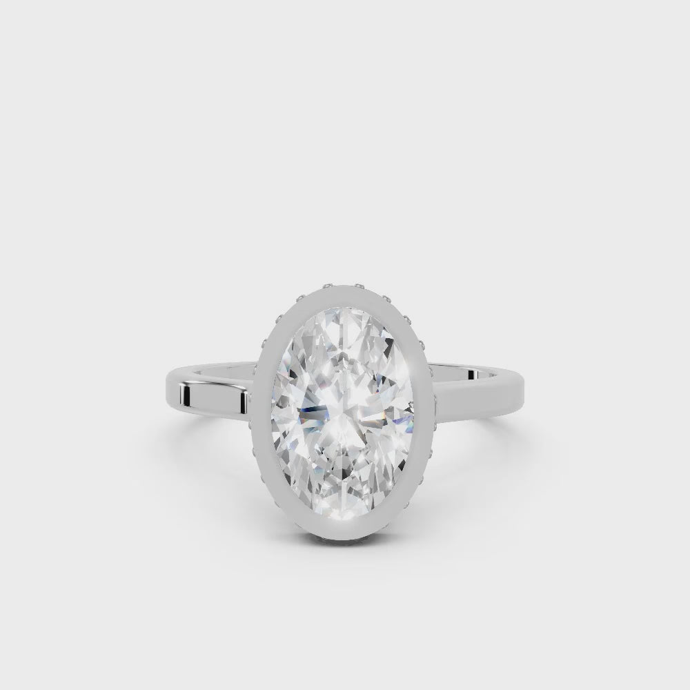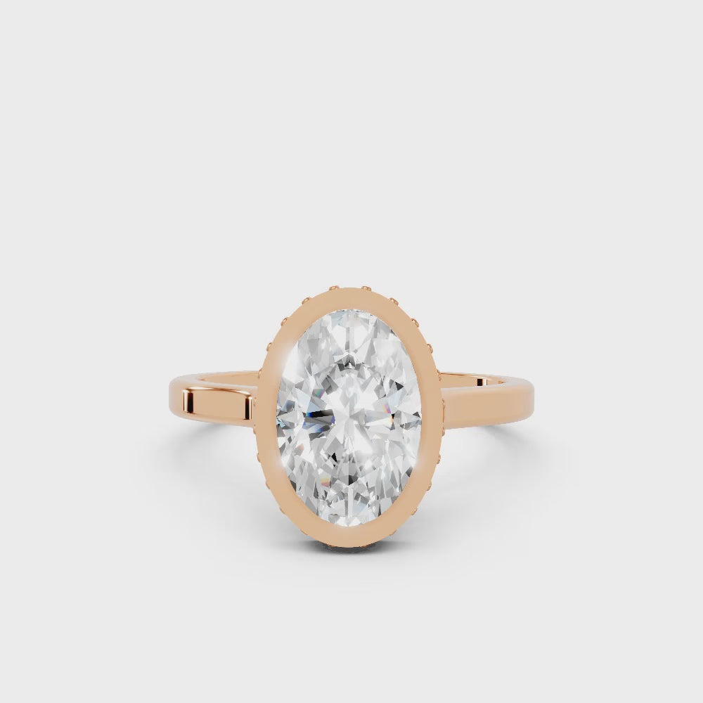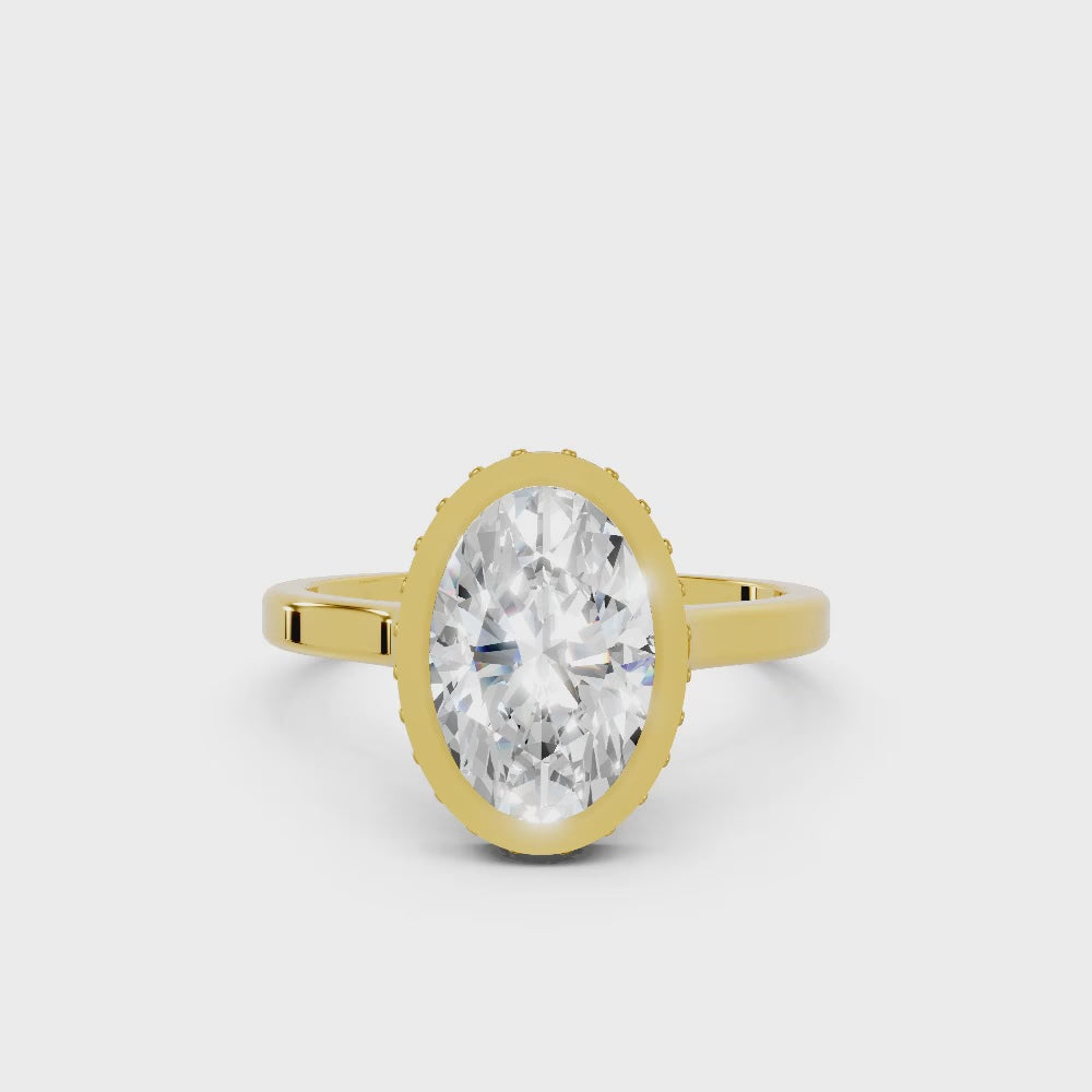 Crafted in solid 14k gold, this engagement ring features a brilliant oval cut lab-grown diamond set in a refined bezel. A hidden halo beneath the stone adds extra radiance, merging sleek modern design with timeless elegance.