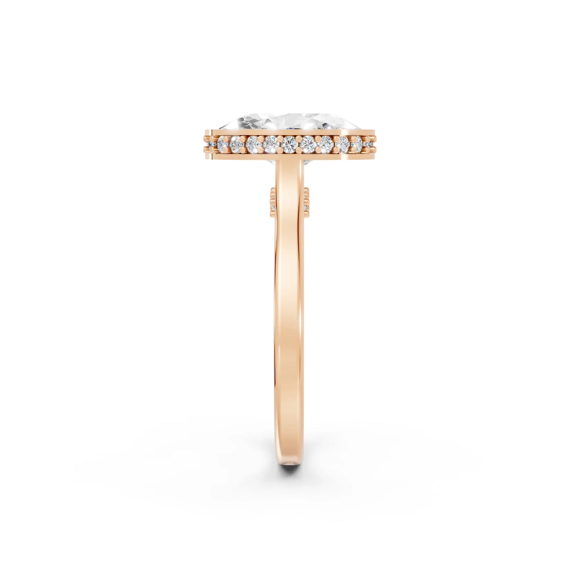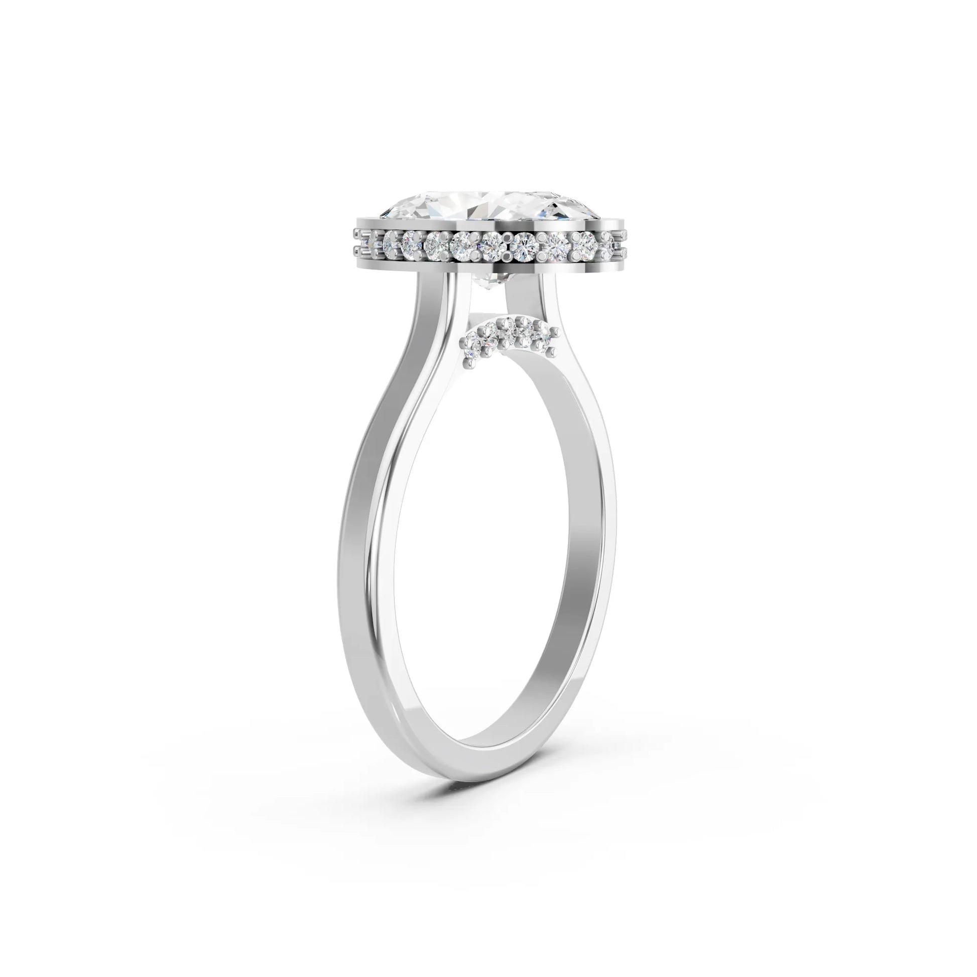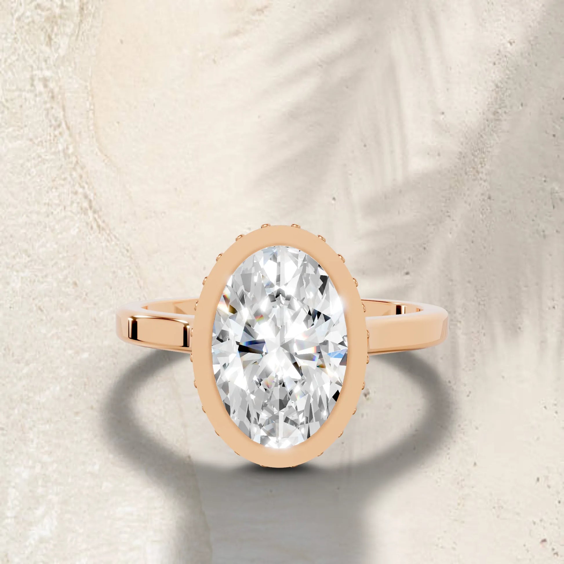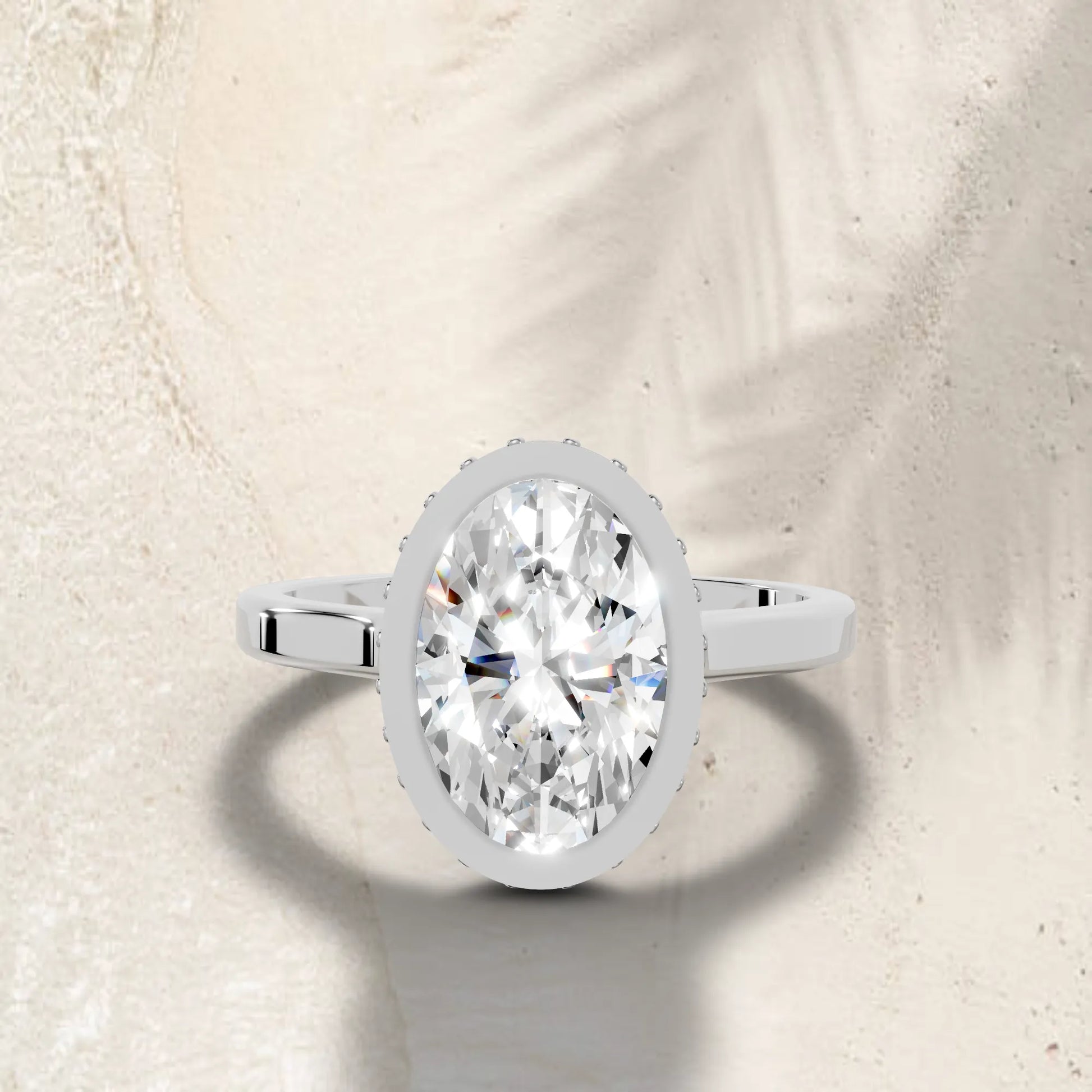 Crafted in solid 14k gold, this engagement ring features a brilliant oval cut lab-grown diamond set in a refined bezel. A hidden halo beneath the stone adds extra radiance, merging sleek modern design with timeless elegance.