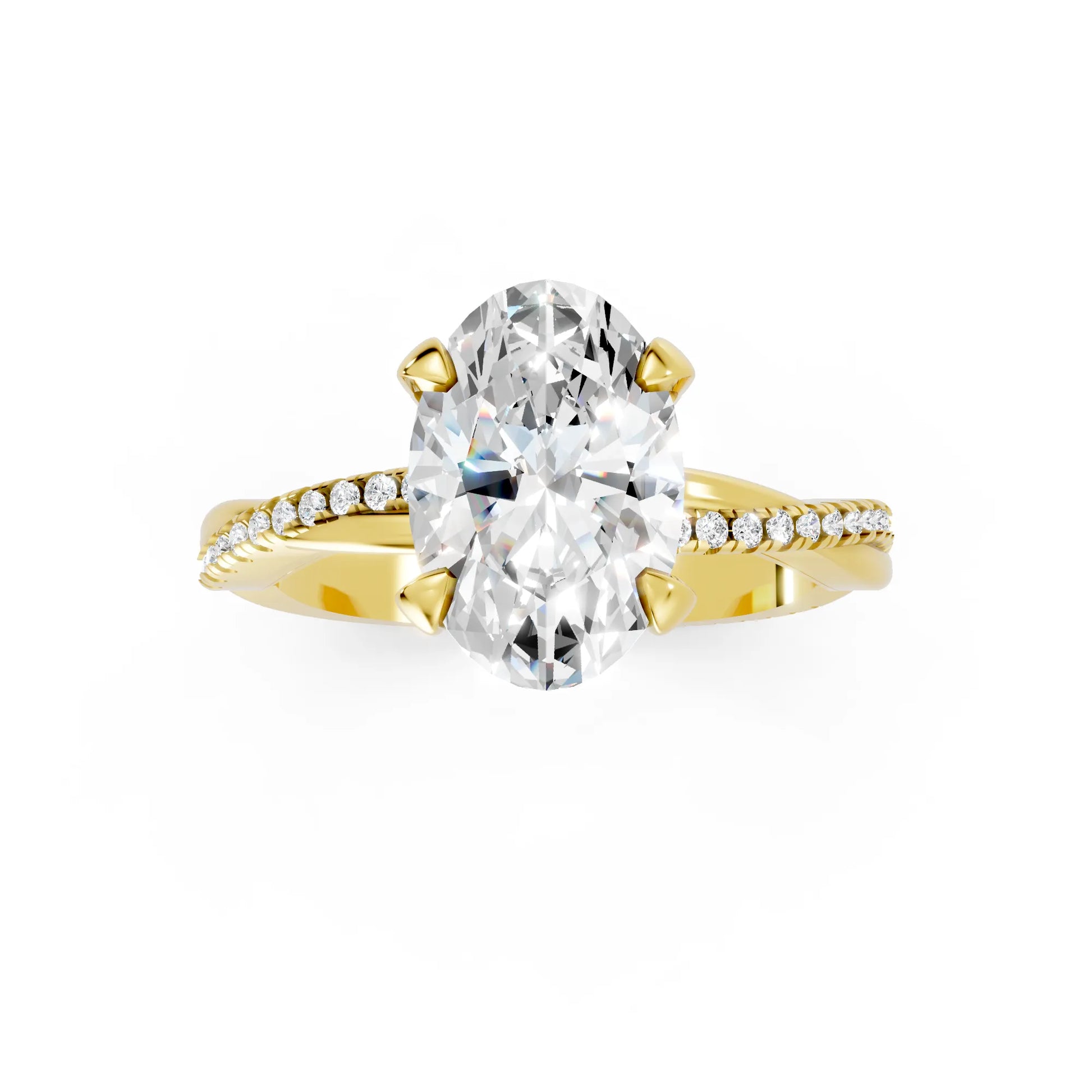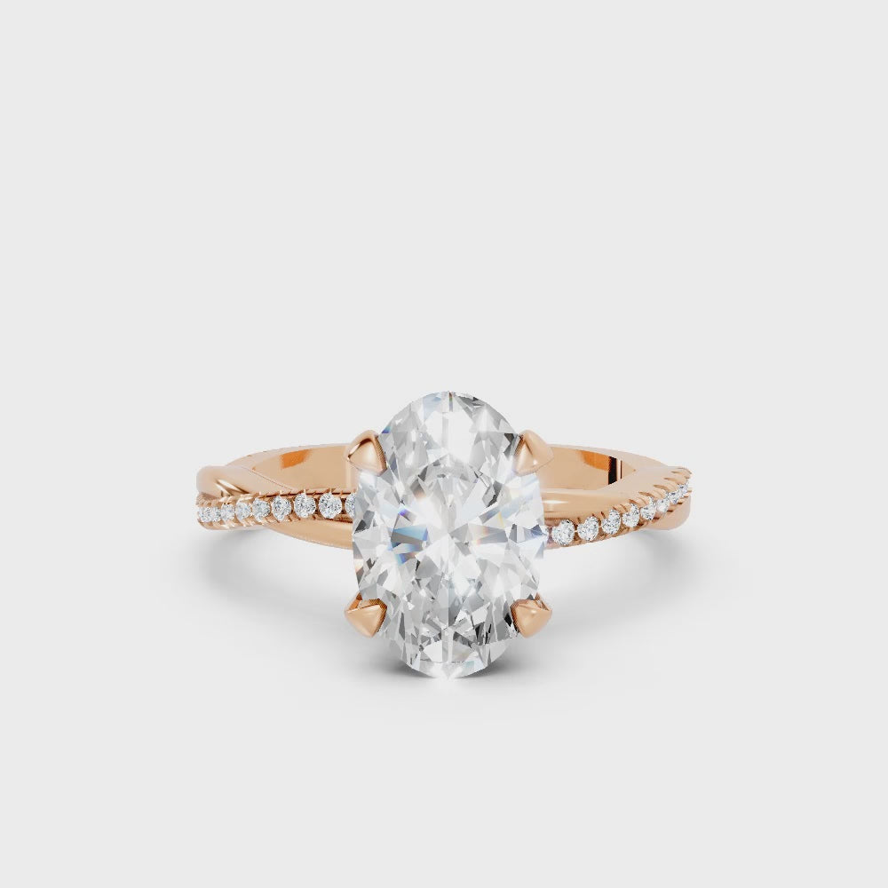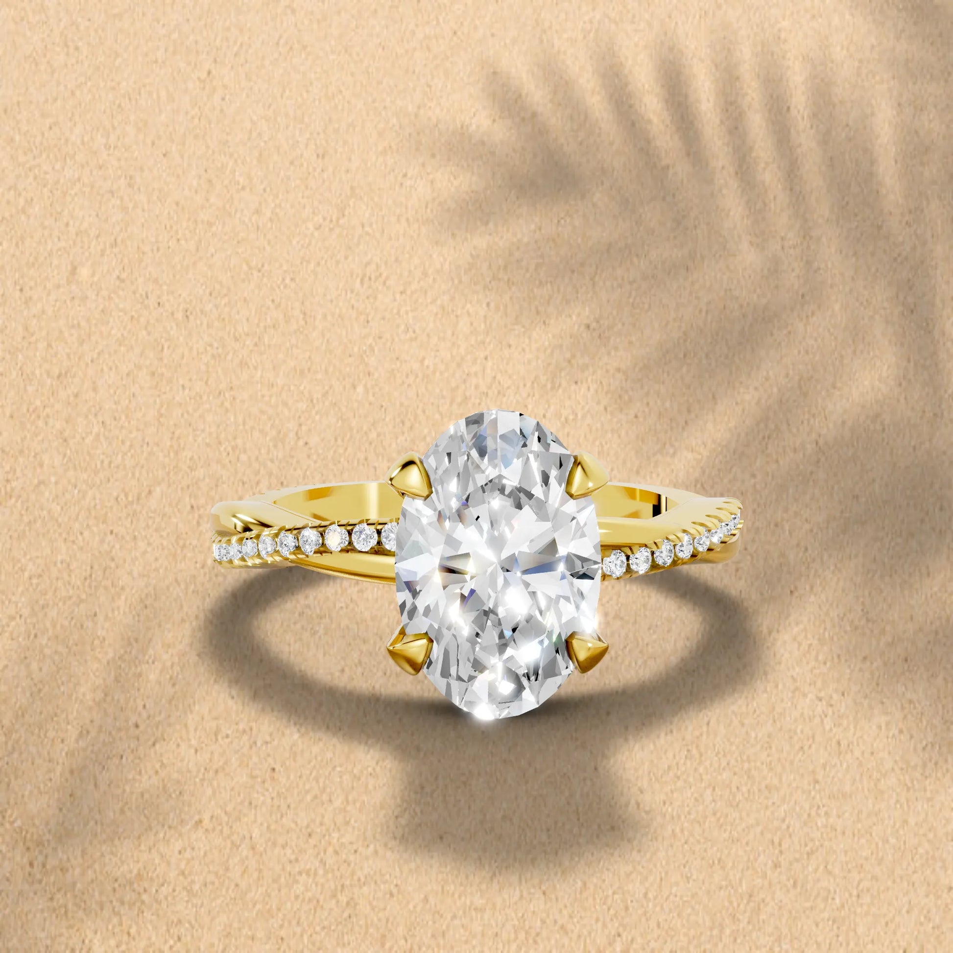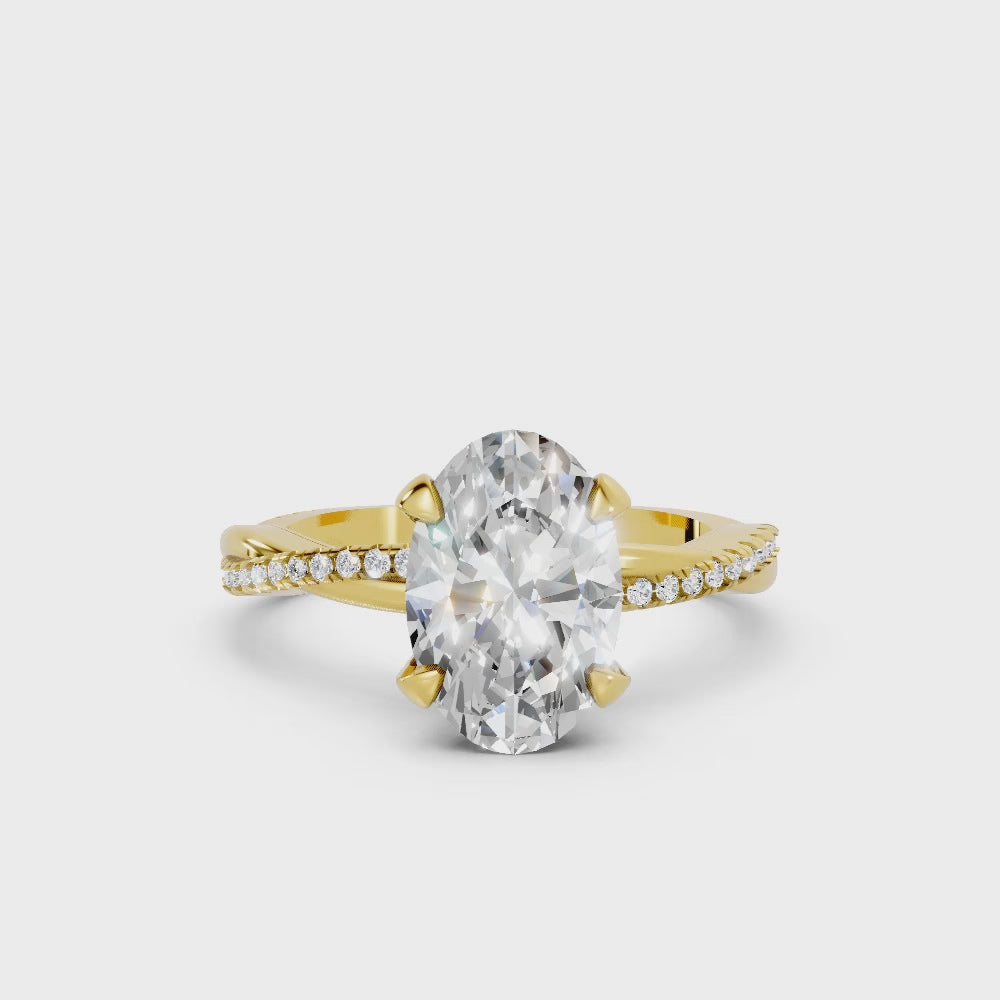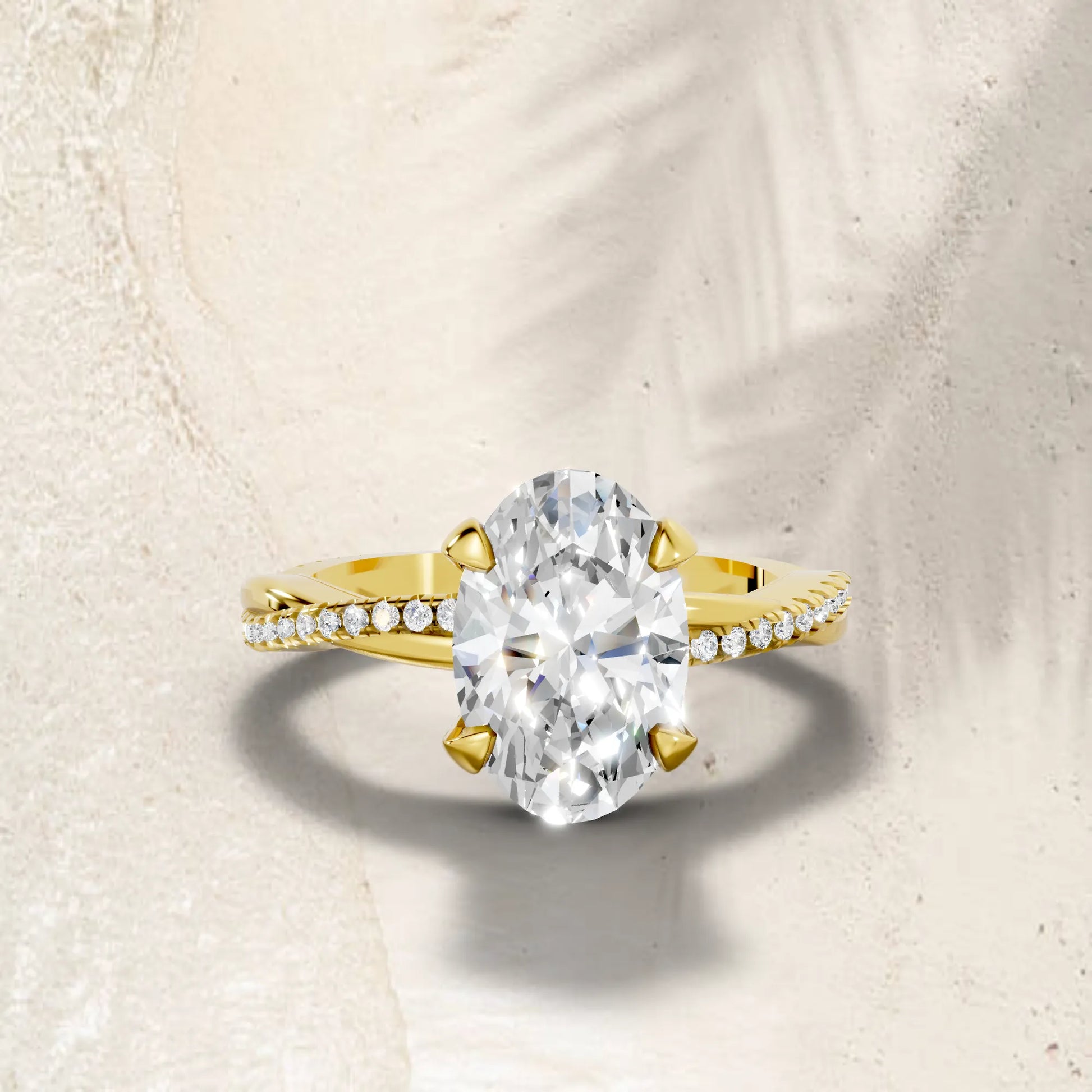 Crafted in solid 14k gold, this engagement ring features a brilliant oval cut lab-grown diamond set on a twisted vine band. A hidden halo adds extra radiance, merging natural-inspired beauty with modern sophistication.