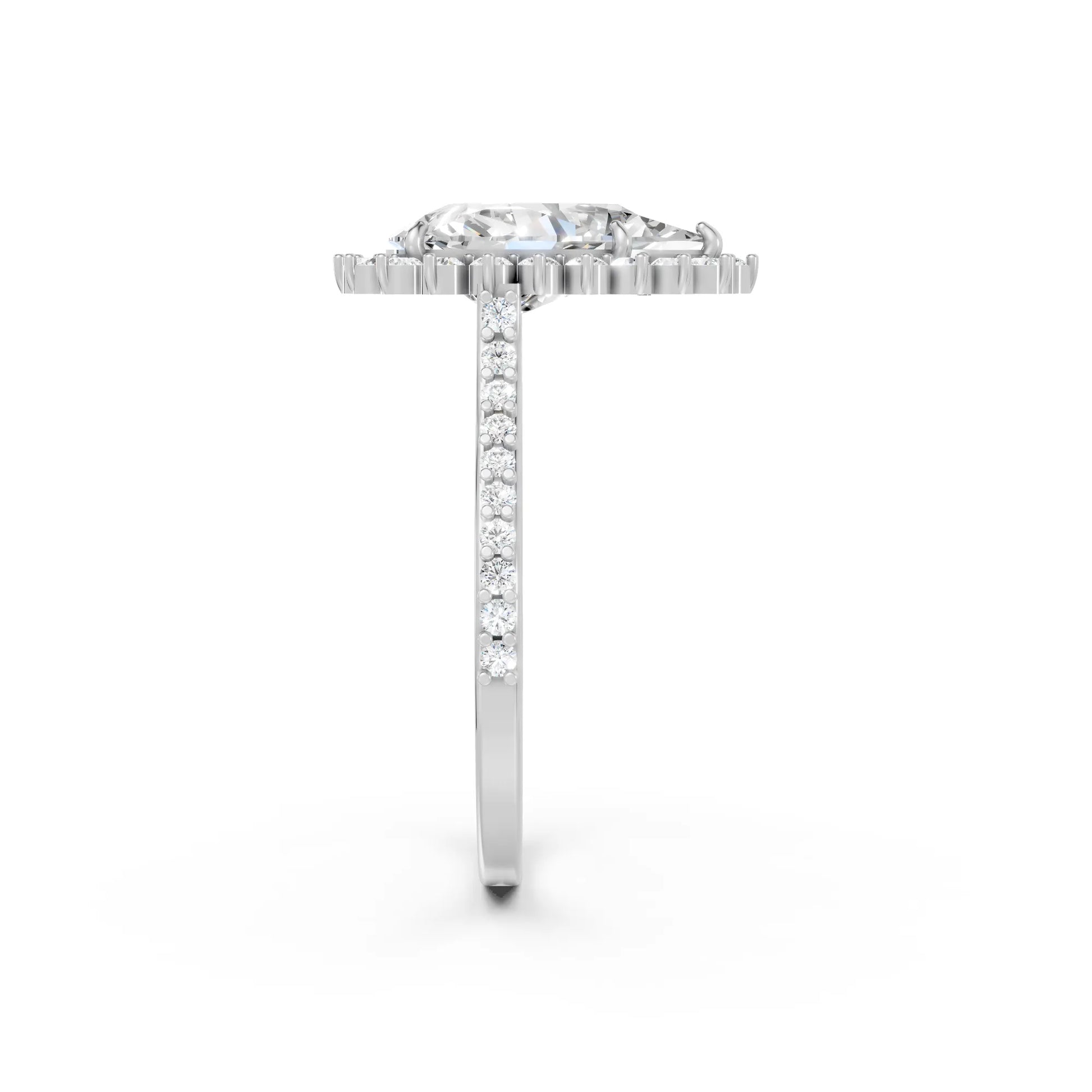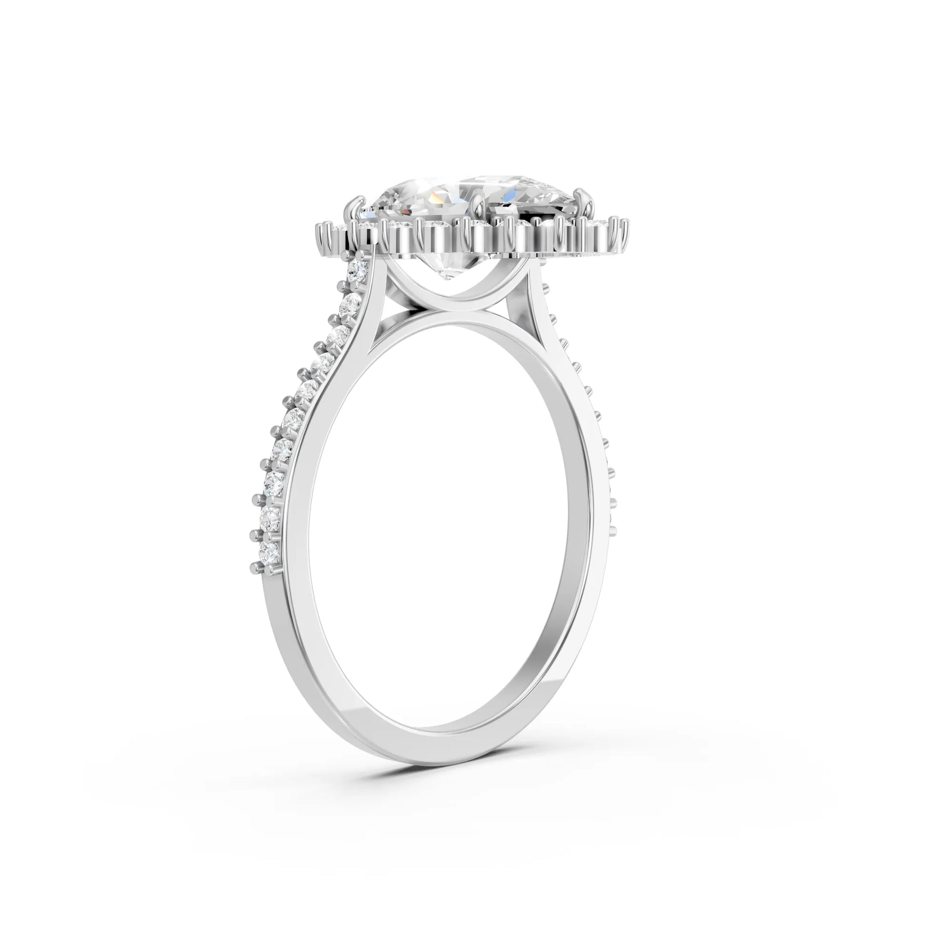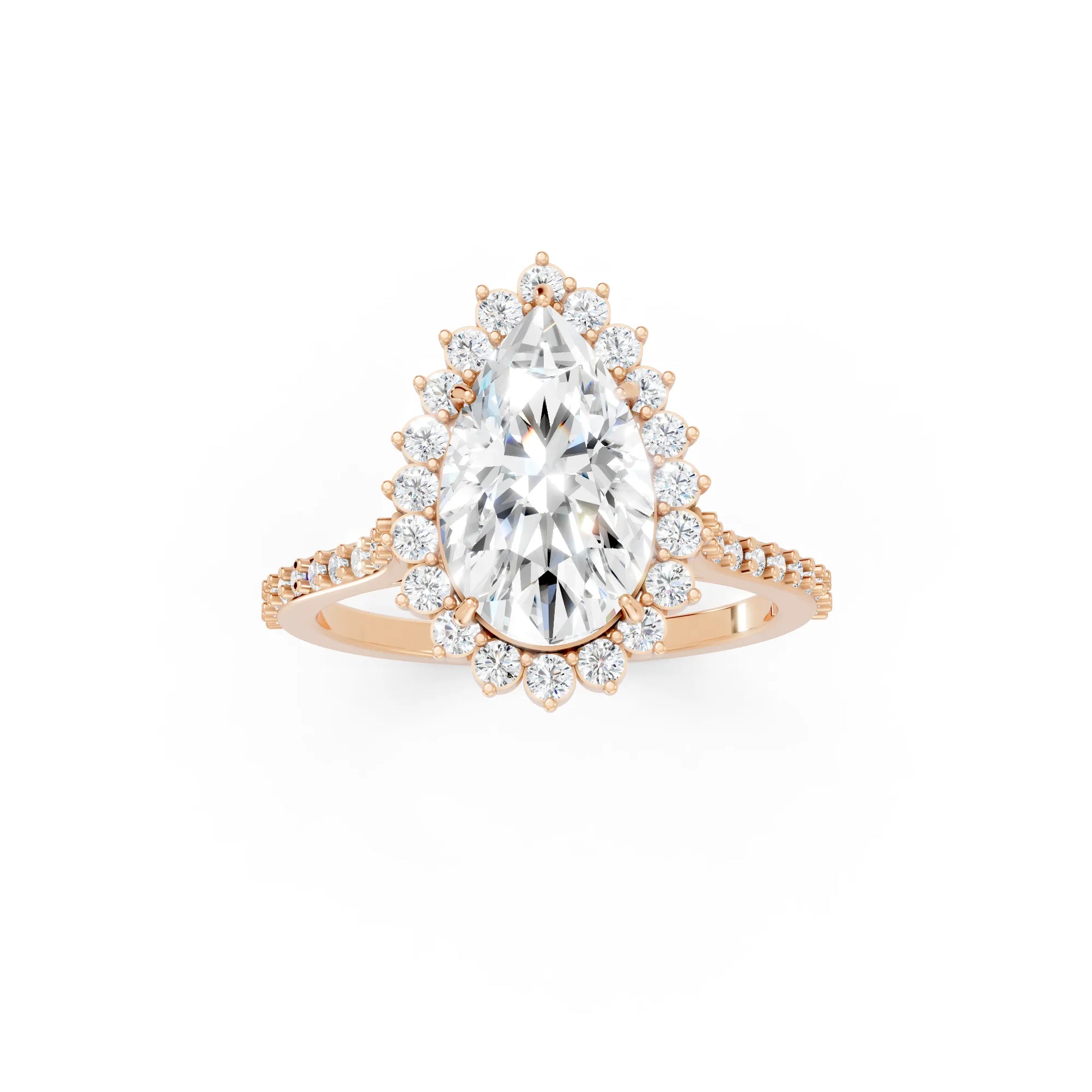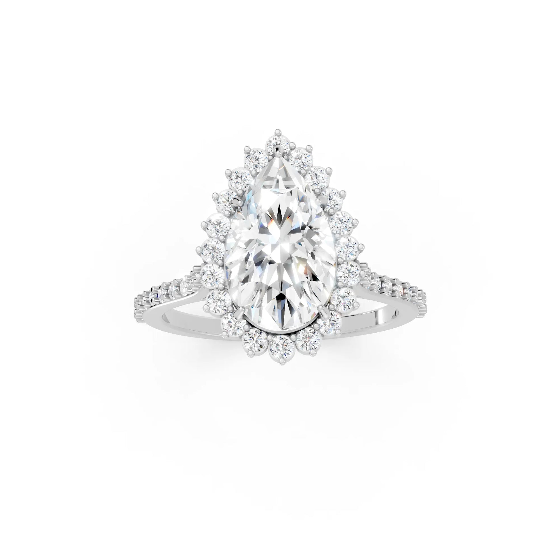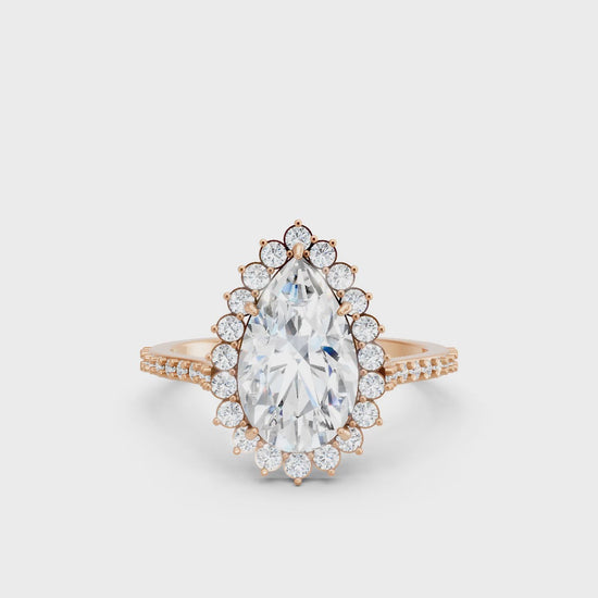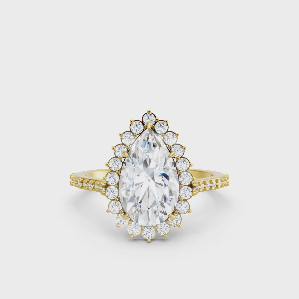 Crafted in solid 14k gold, this engagement ring highlights a dazzling pear cut lab-grown diamond framed by a floral-inspired halo. The pavé-set band enhances its brilliance, creating a romantic design full of elegance and charm.