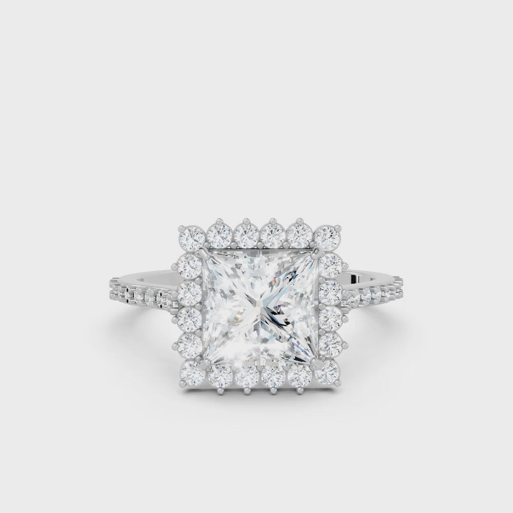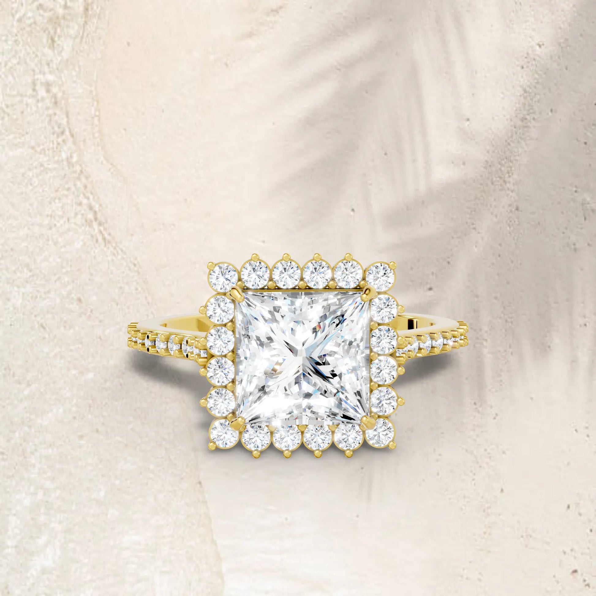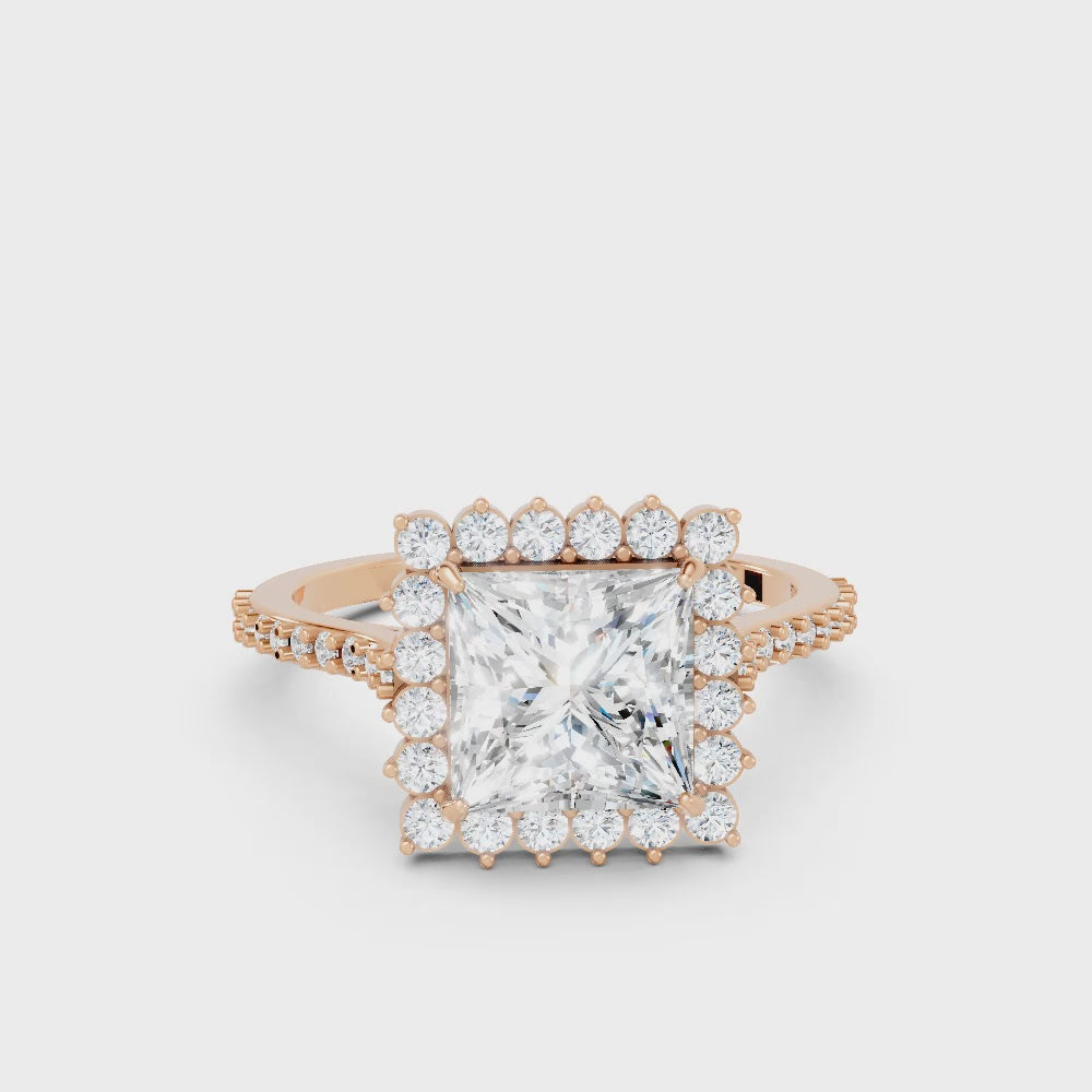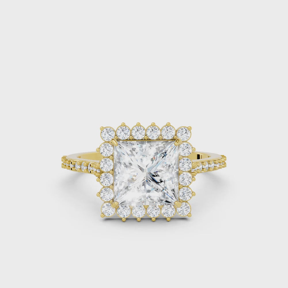 Crafted in solid 14k gold, this engagement ring features a striking princess cut lab-grown diamond surrounded by a floral-inspired halo. A pavé-set band adds extra brilliance, blending bold sparkle with timeless romance.