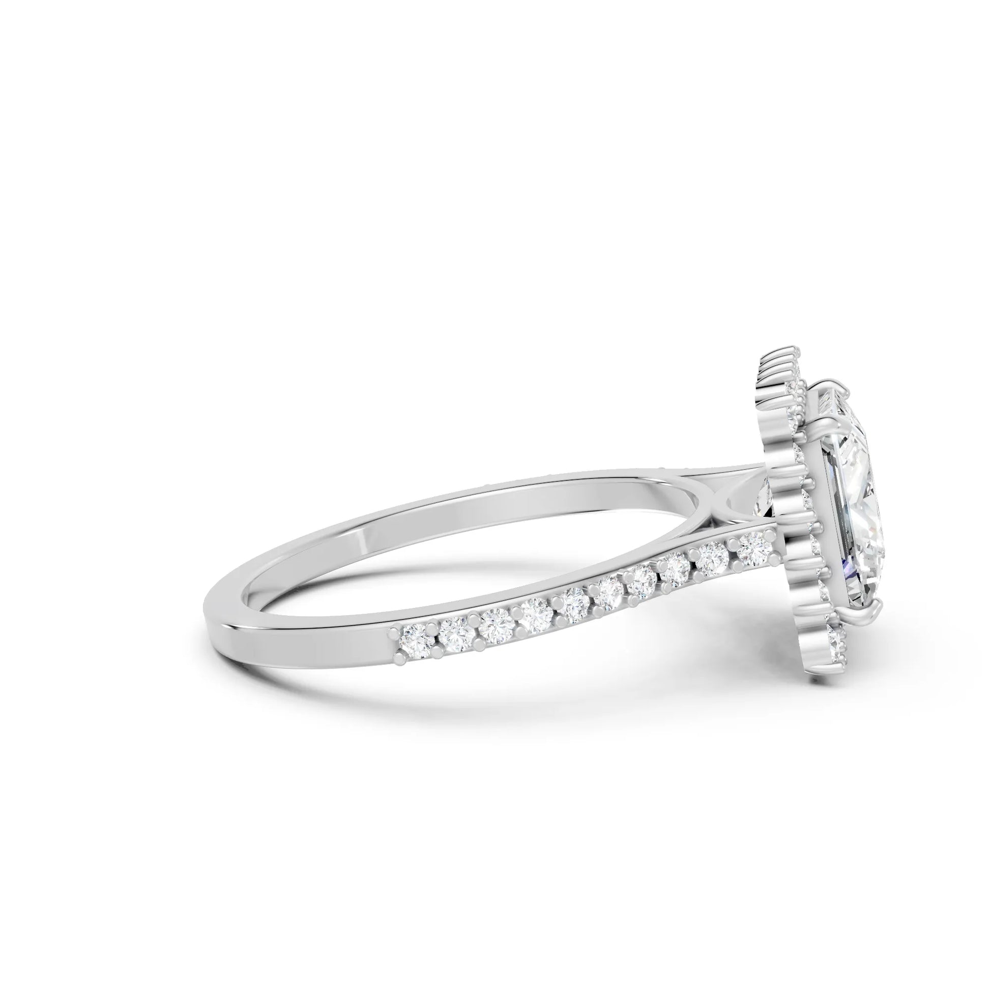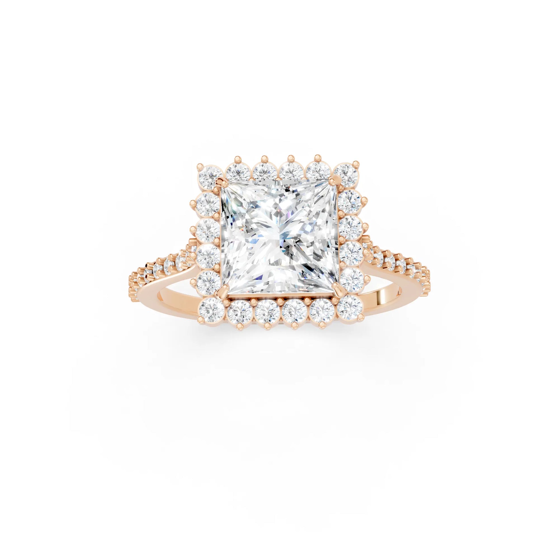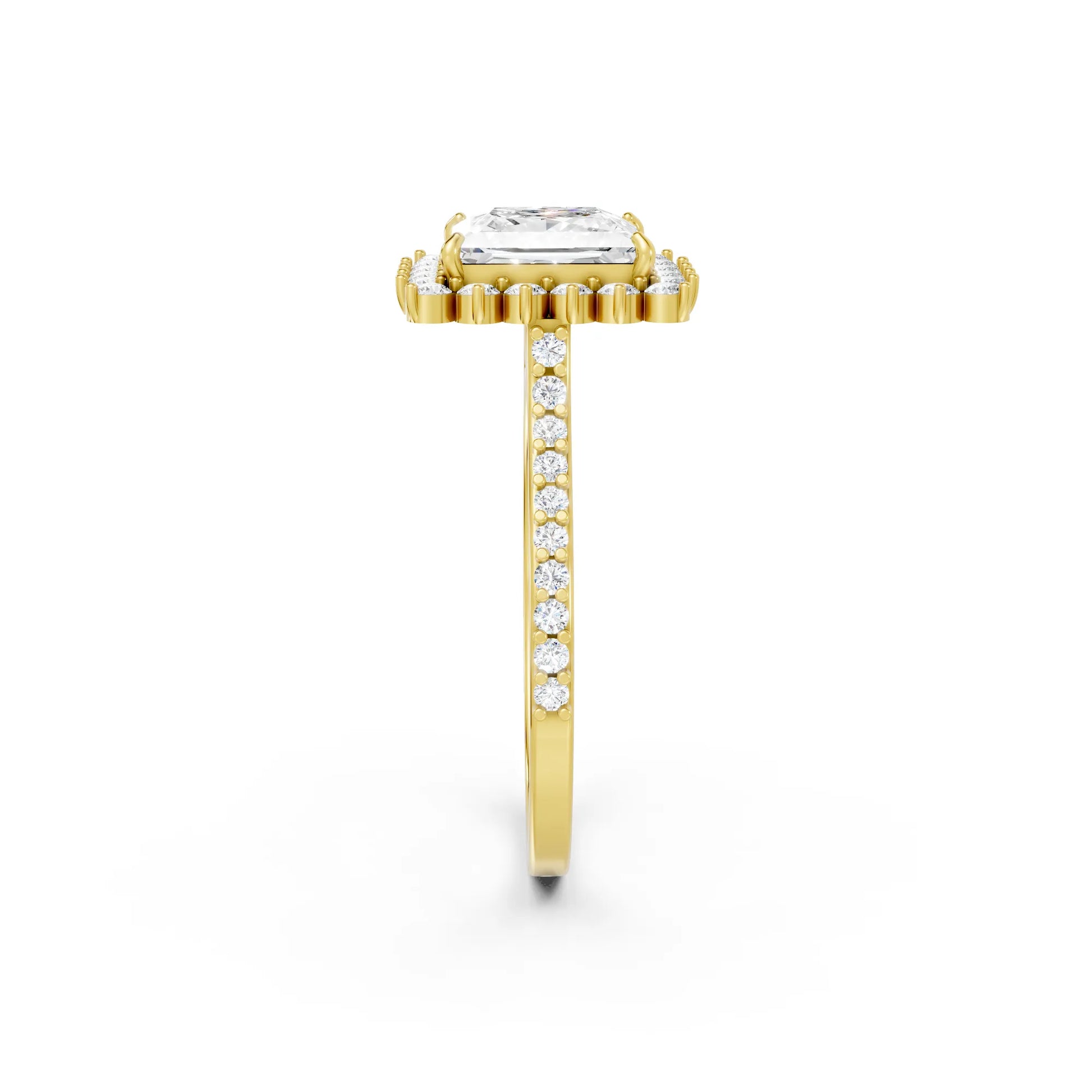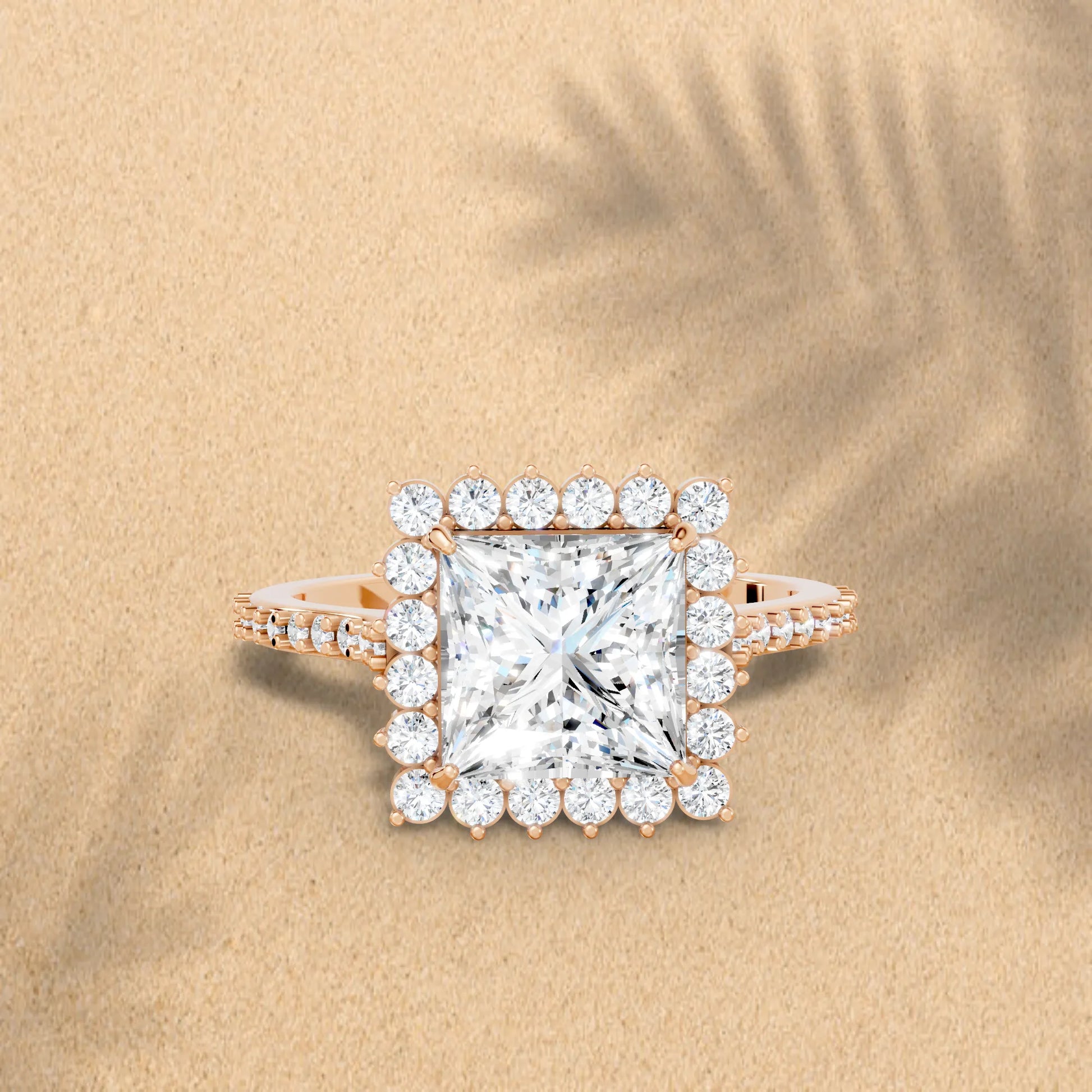 Crafted in solid 14k gold, this engagement ring features a striking princess cut lab-grown diamond surrounded by a floral-inspired halo. A pavé-set band adds extra brilliance, blending bold sparkle with timeless romance.
