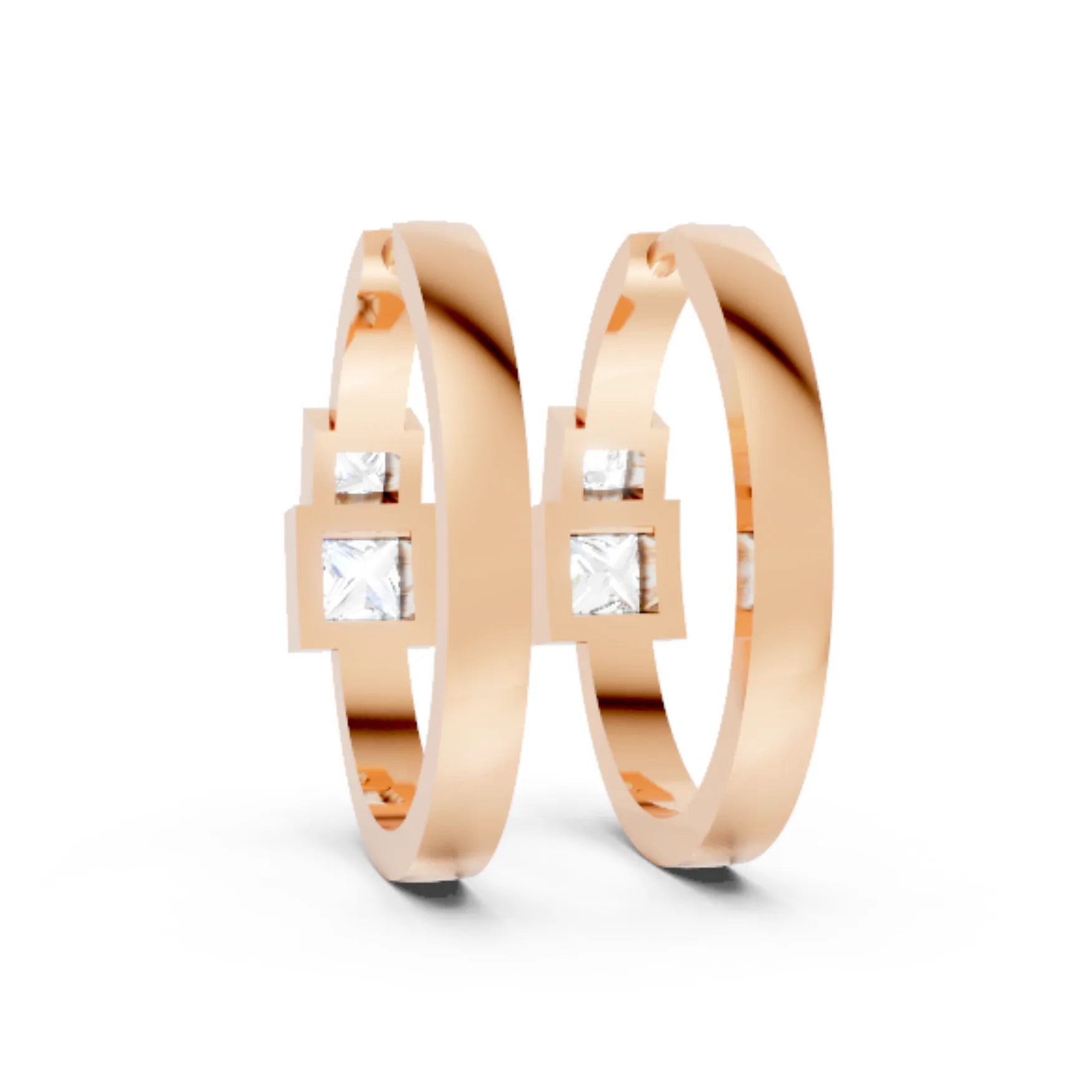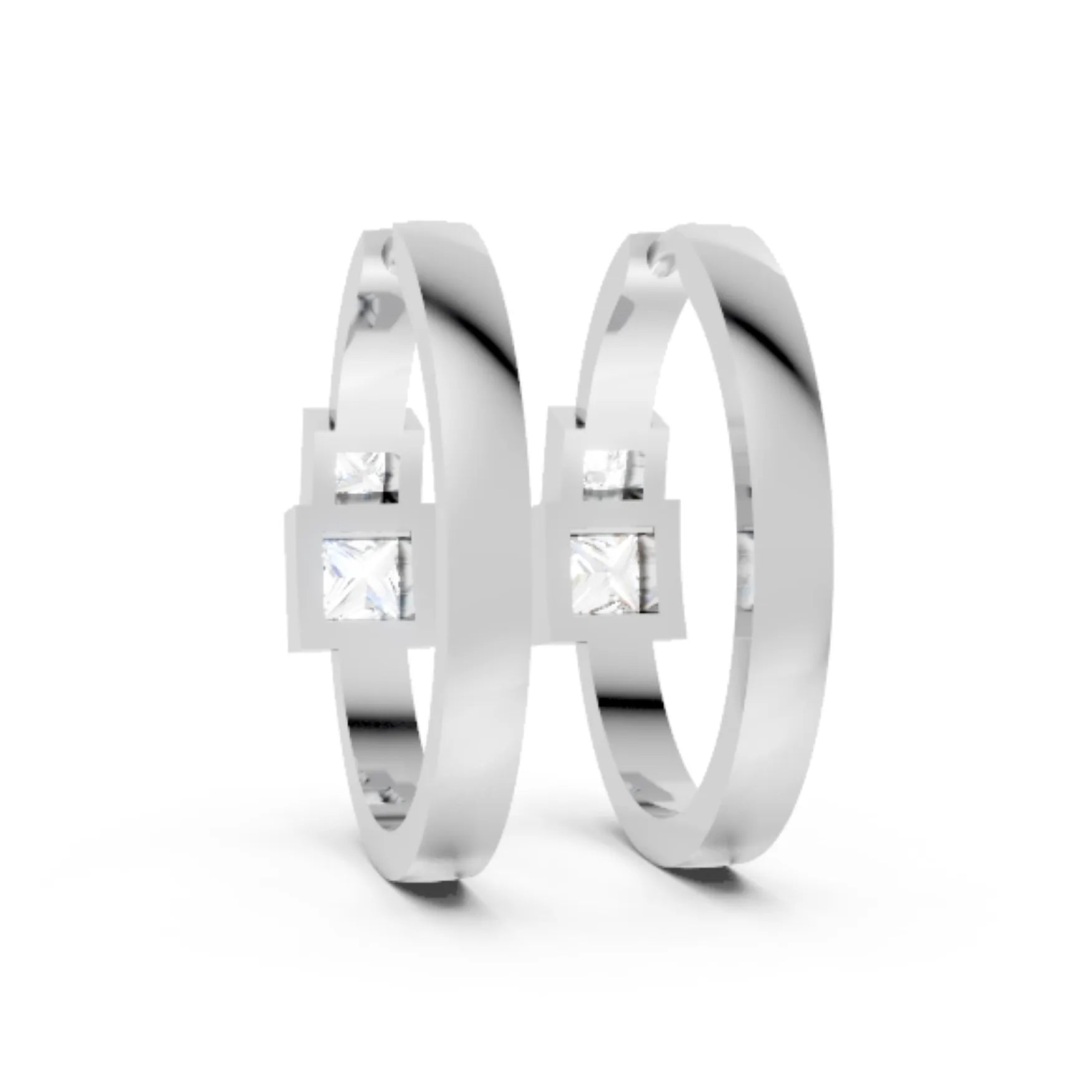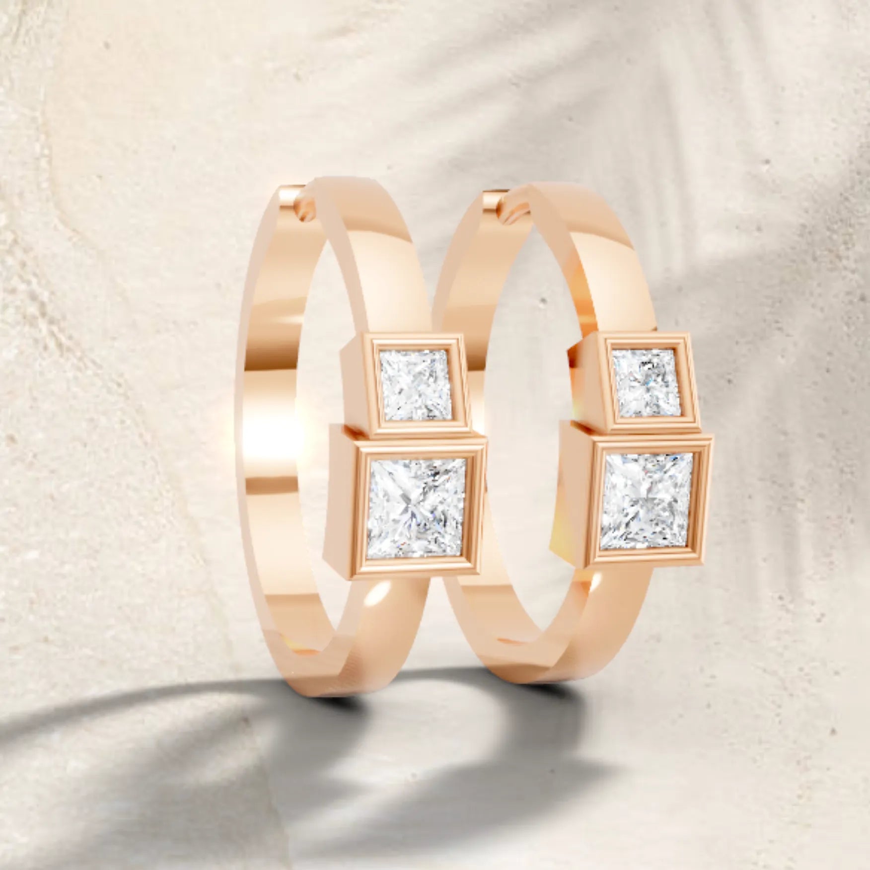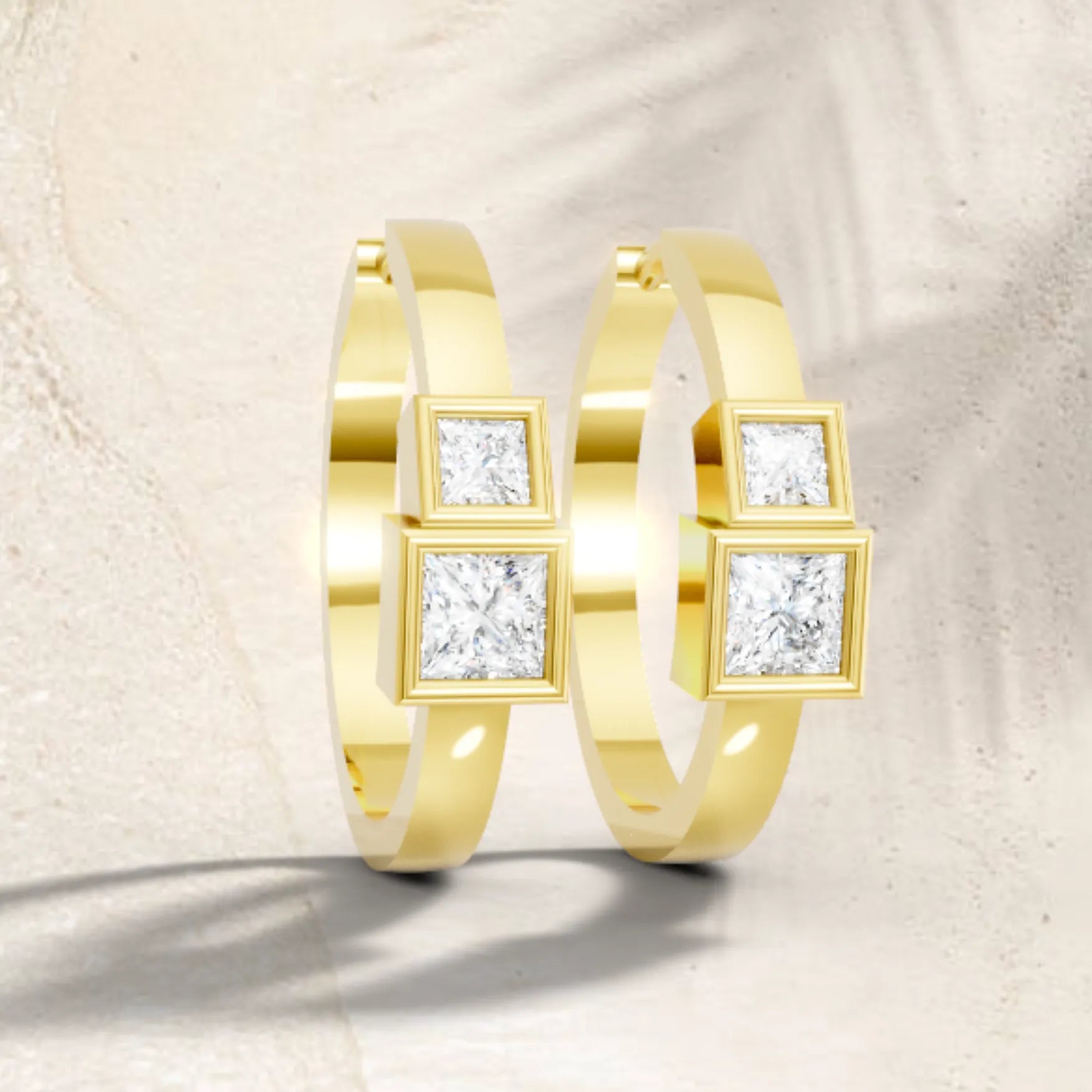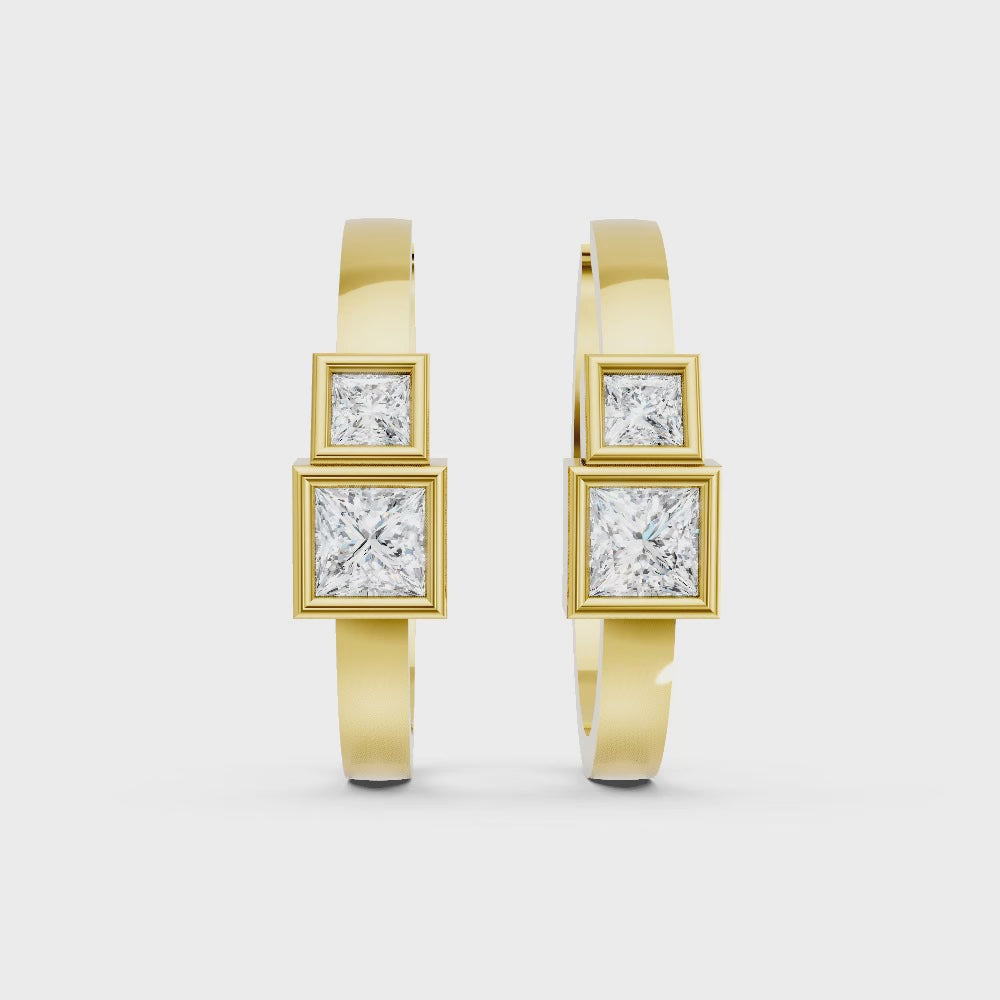 Crafted in solid 14k gold, this hoop earring showcases two princess cut lab-grown diamonds in sleek bezel settings. A chic twin-stone design that combines sharp brilliance with modern minimalism for everyday elegance.