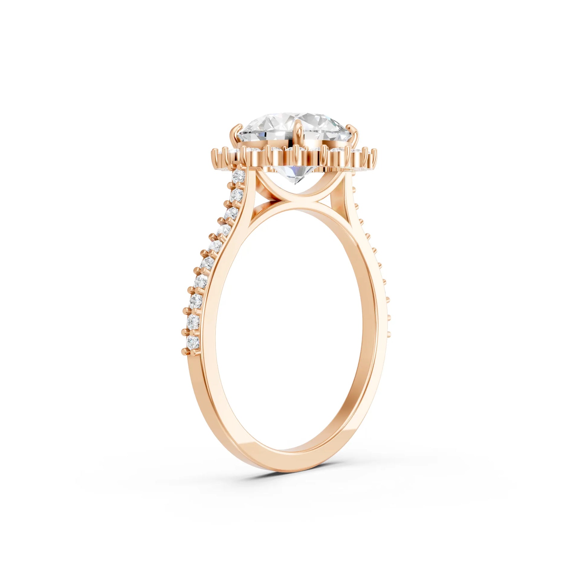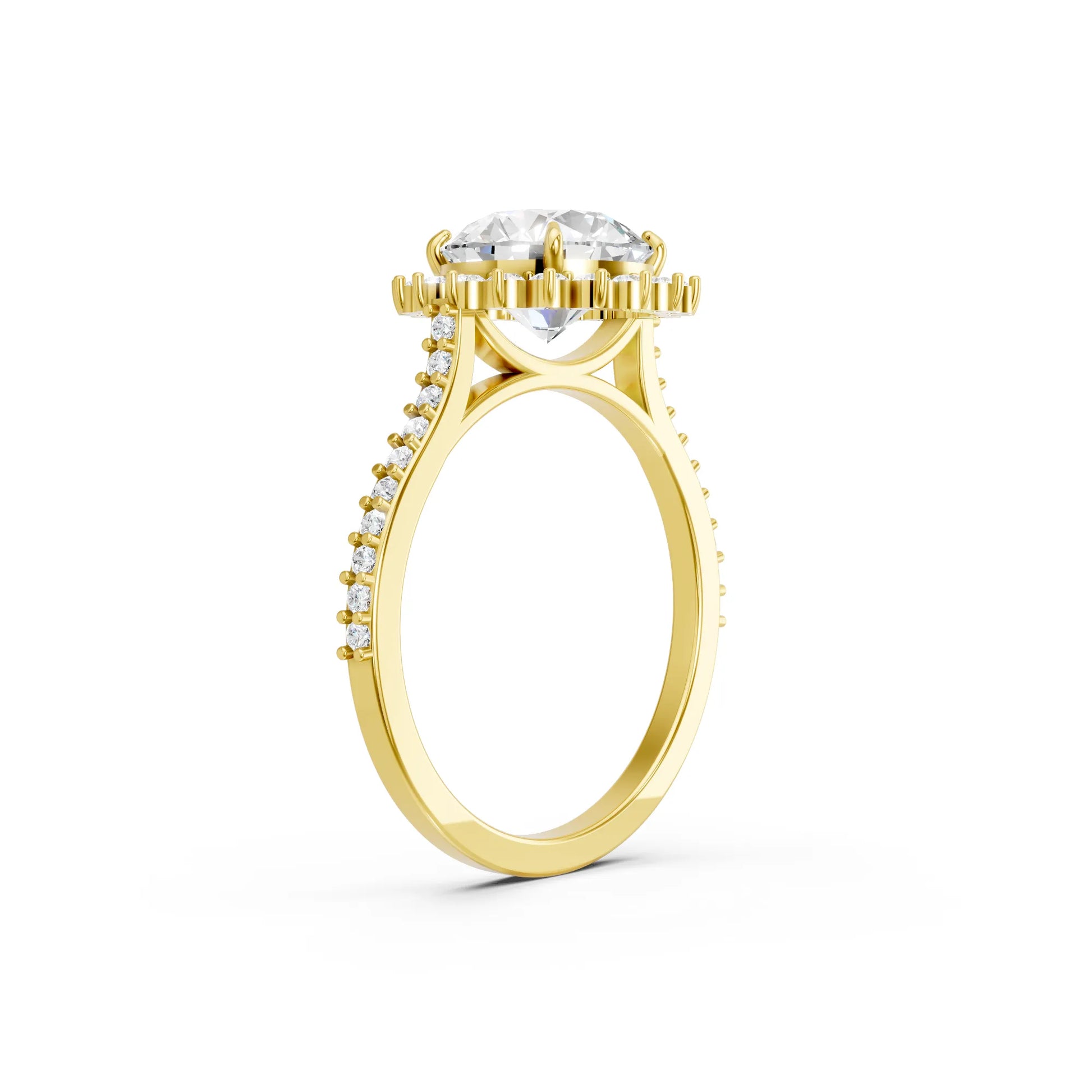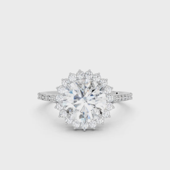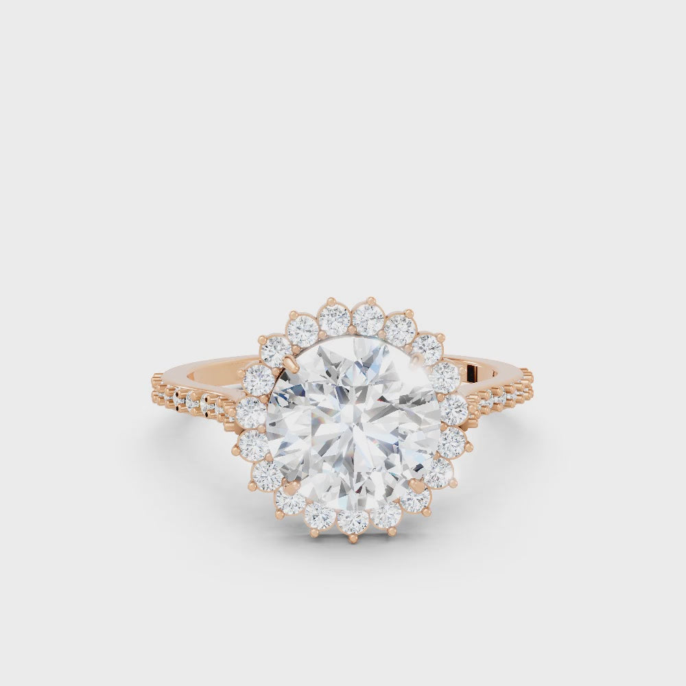Crafted in solid 14k gold, this engagement ring features a brilliant round cut lab-grown diamond surrounded by a floral-inspired halo. The pavé-set band adds radiant sparkle, blending timeless romance with natural charm.