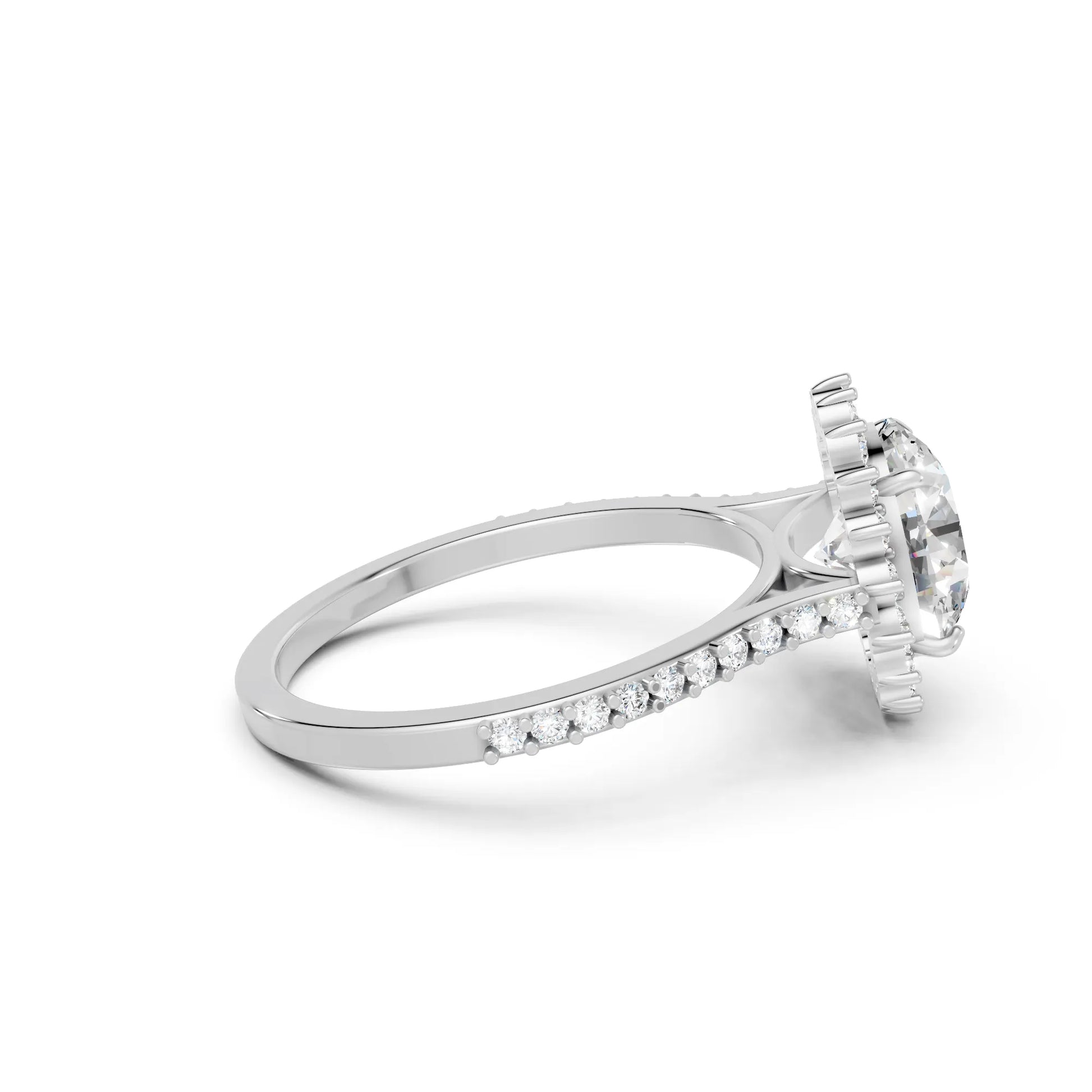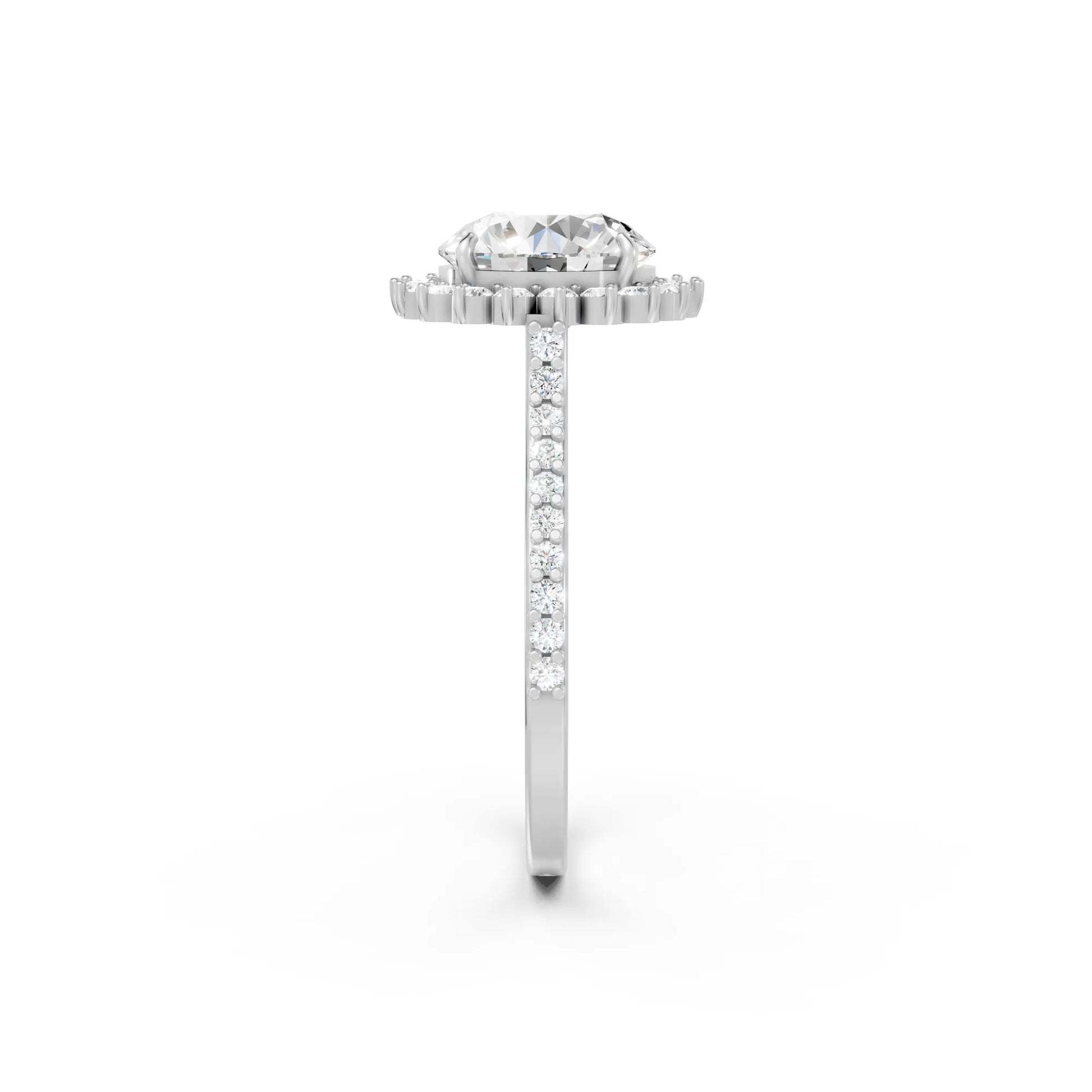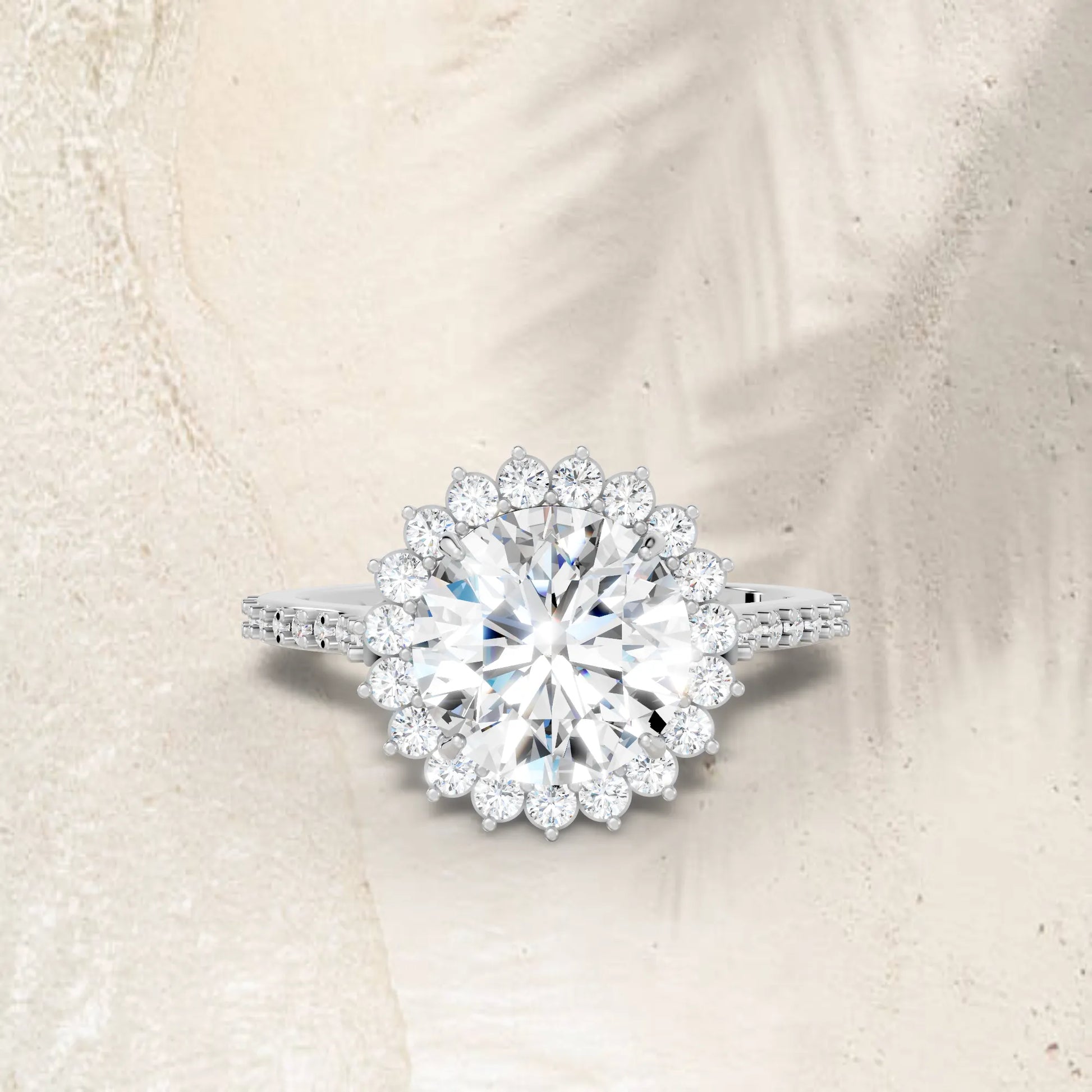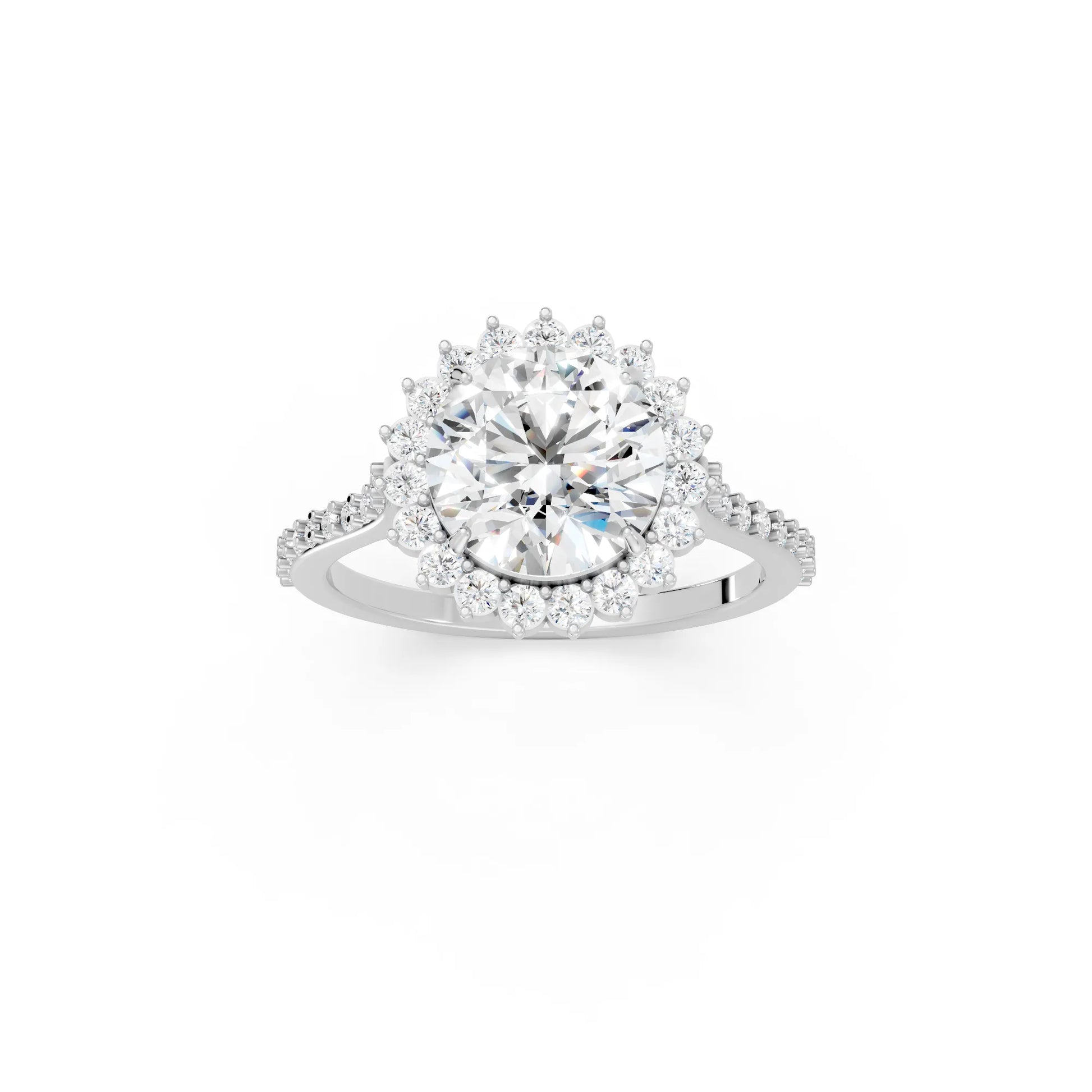 Crafted in solid 14k gold, this engagement ring features a brilliant round cut lab-grown diamond surrounded by a floral-inspired halo. The pavé-set band adds radiant sparkle, blending timeless romance with natural charm.