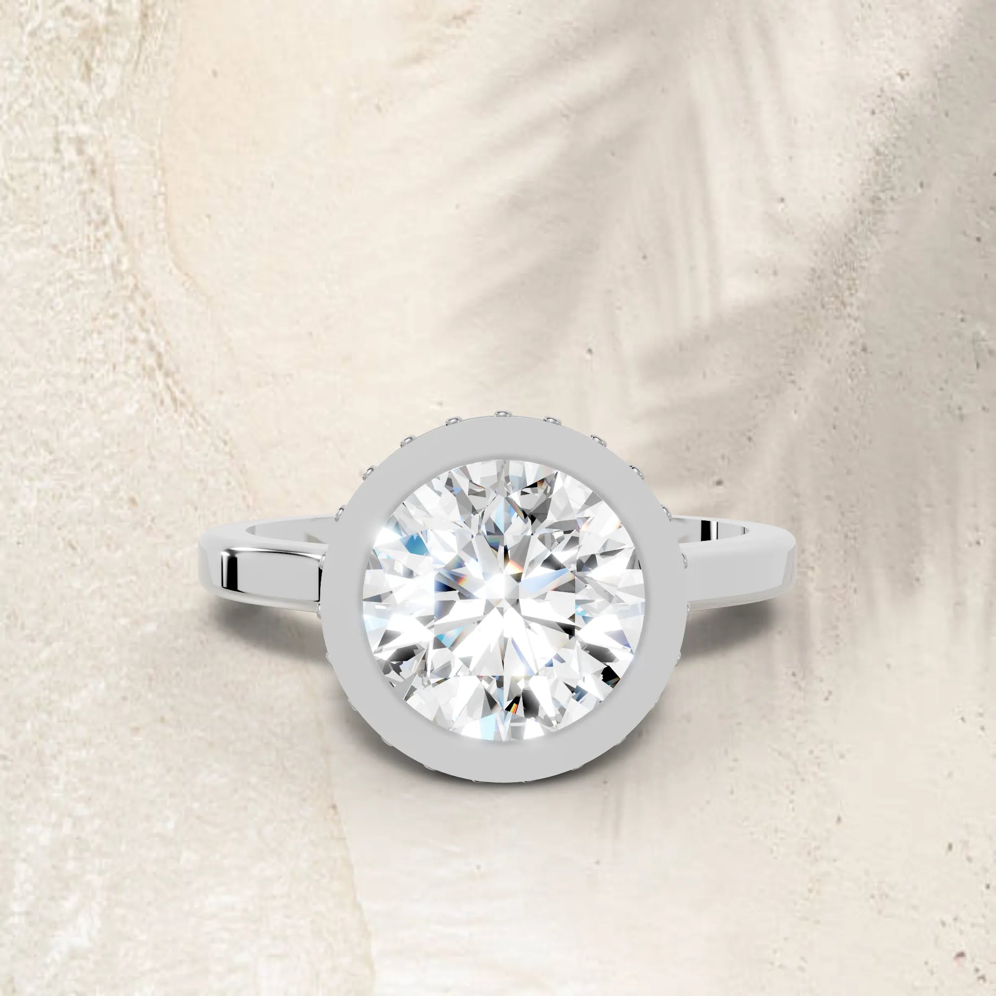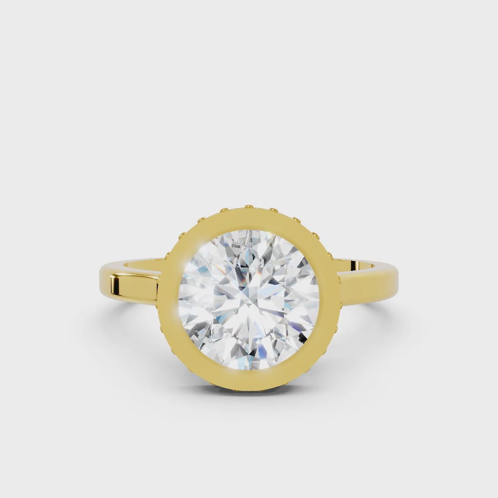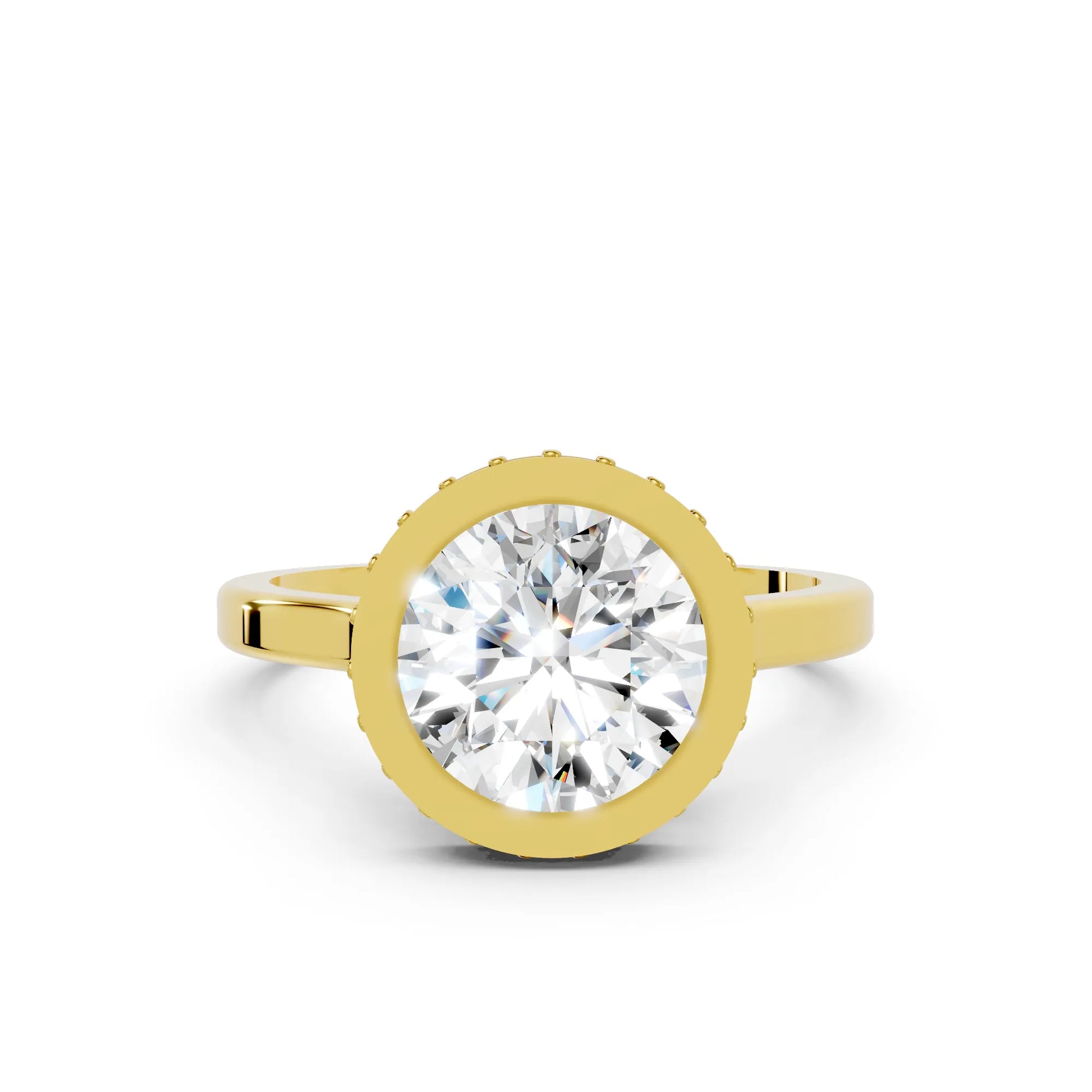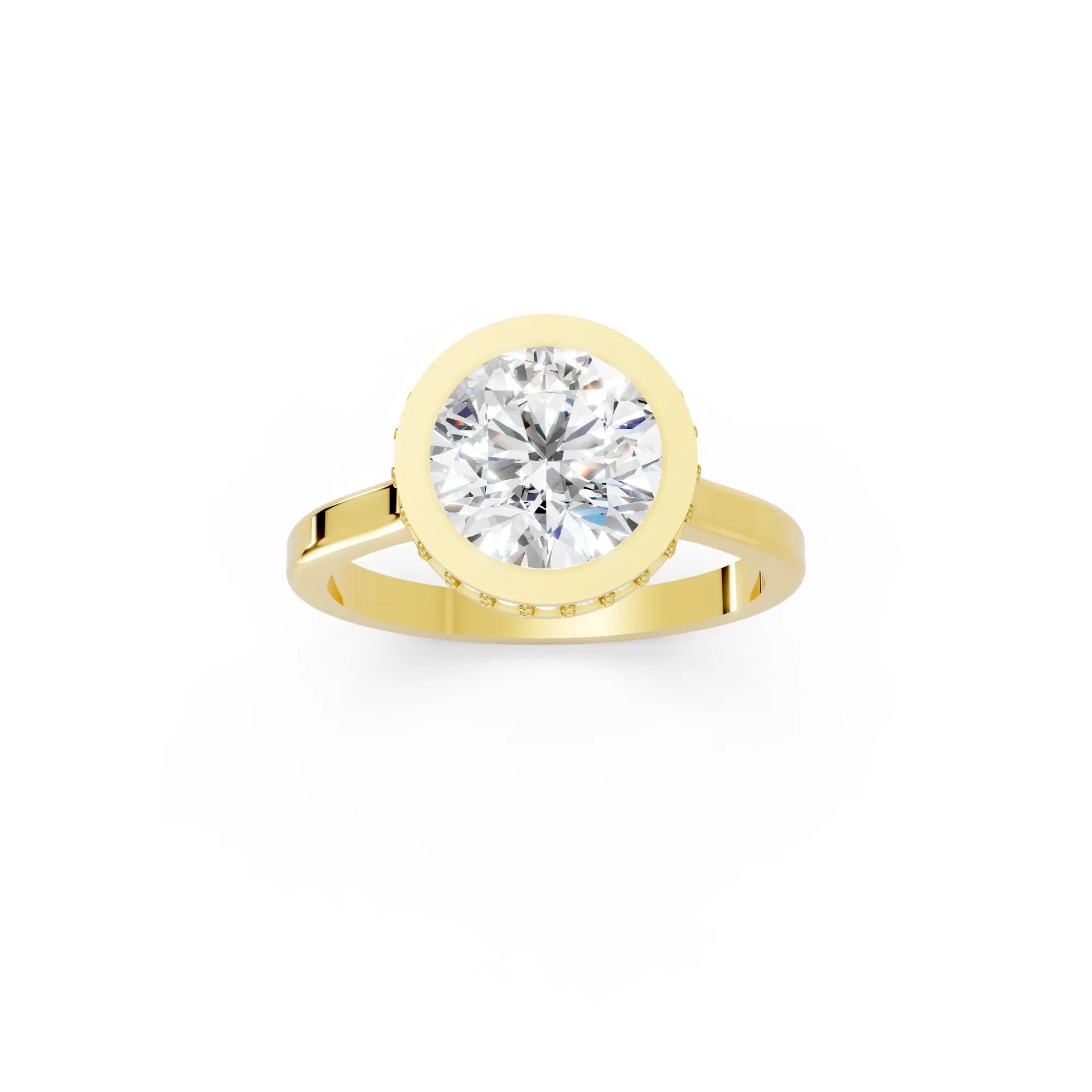 Crafted in solid 14k gold, this engagement ring features a brilliant round cut lab-grown diamond secured in a sleek bezel. A hidden halo beneath the stone adds radiant sparkle, merging classic beauty with modern design.