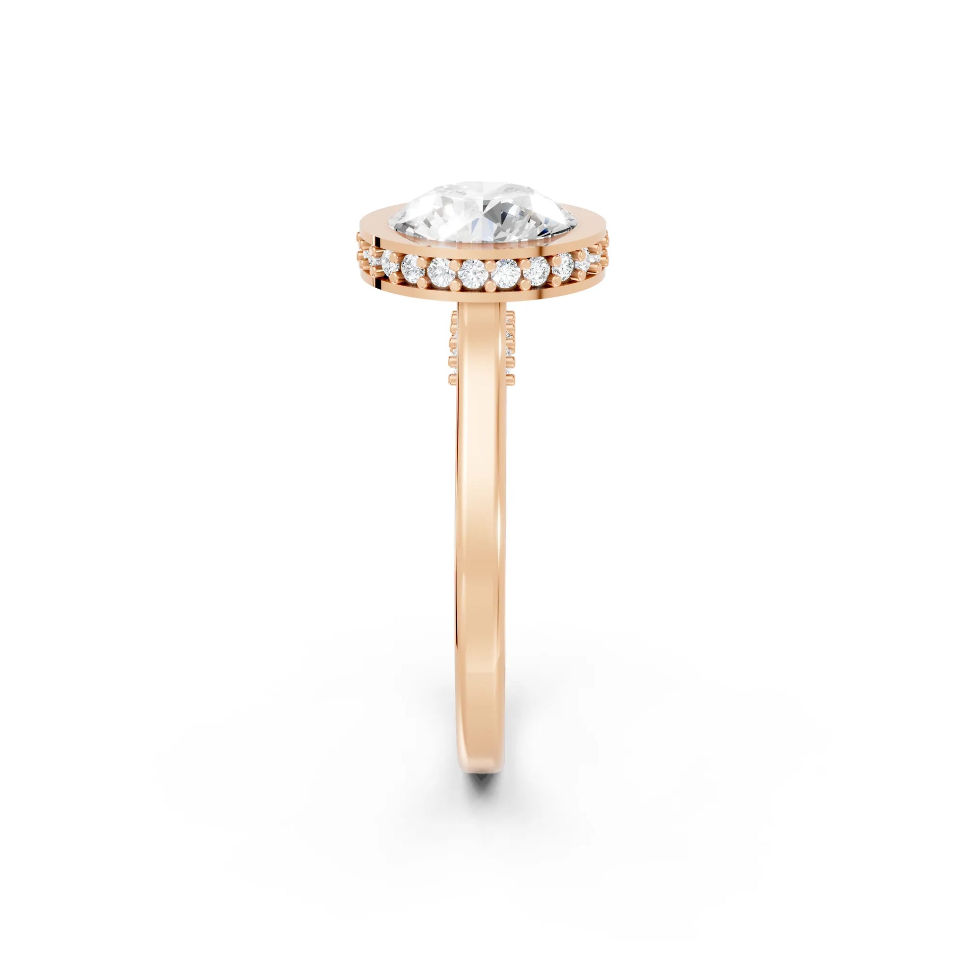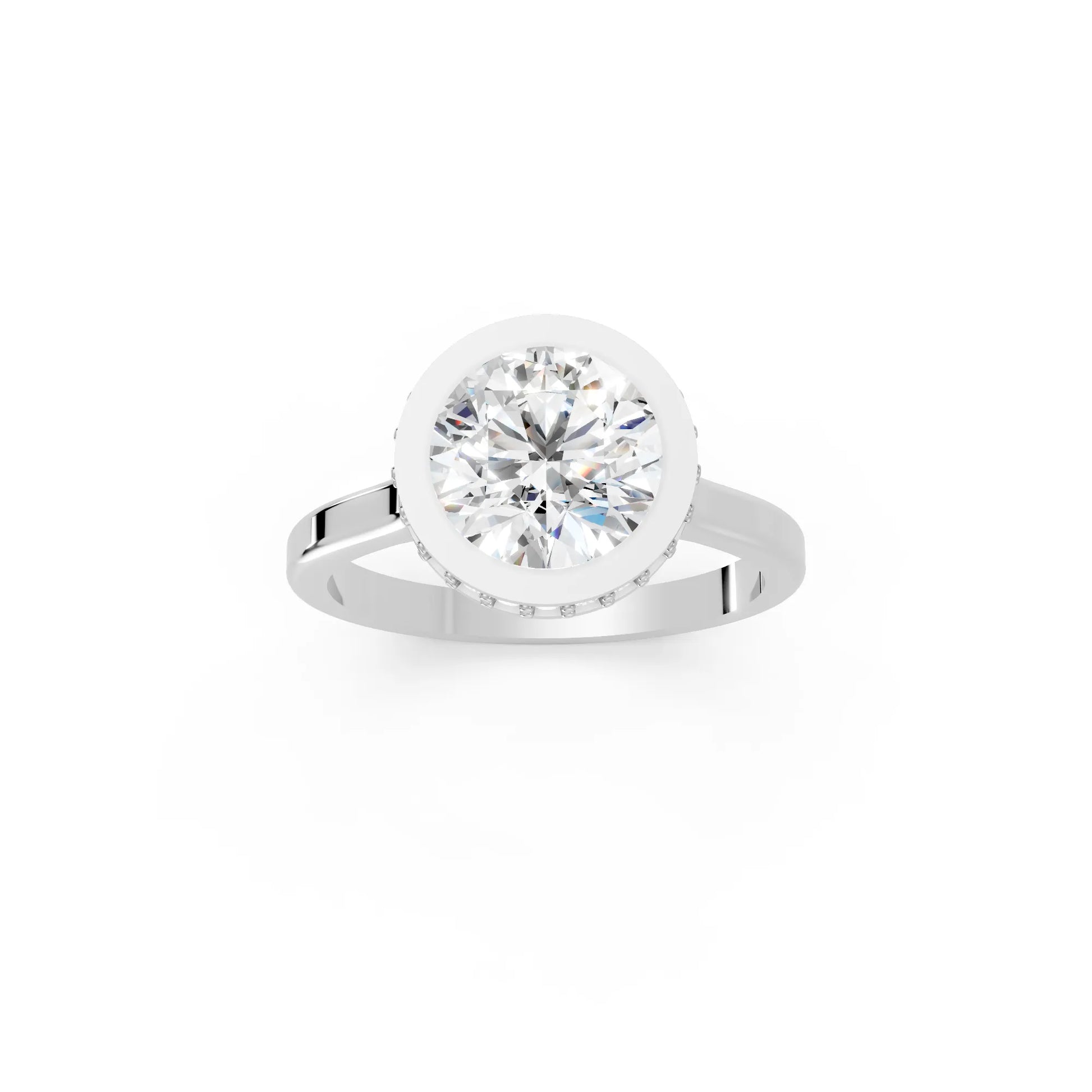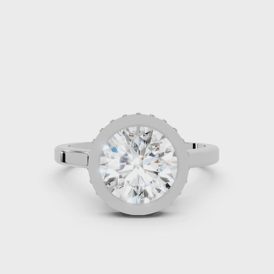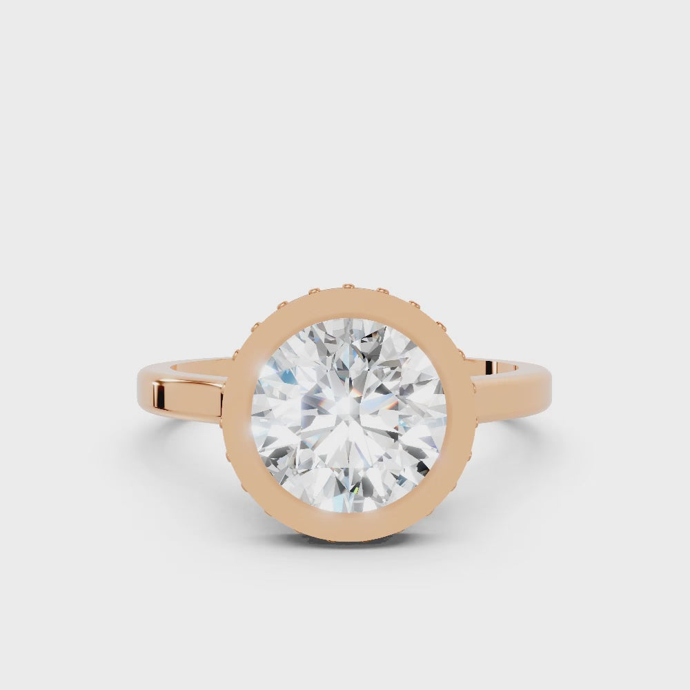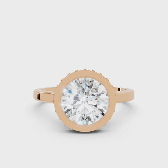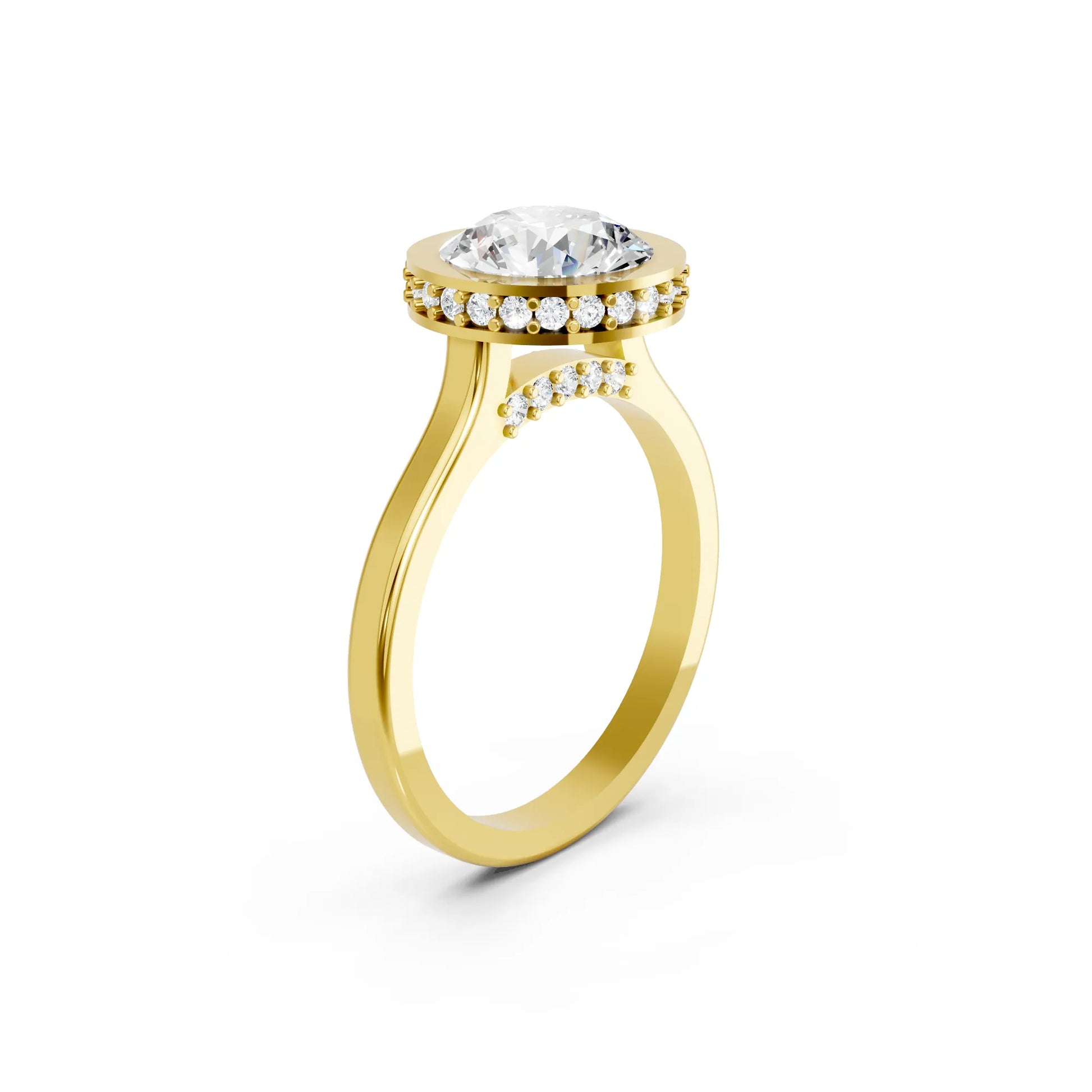 Crafted in solid 14k gold, this engagement ring features a brilliant round cut lab-grown diamond secured in a sleek bezel. A hidden halo beneath the stone adds radiant sparkle, merging classic beauty with modern design.