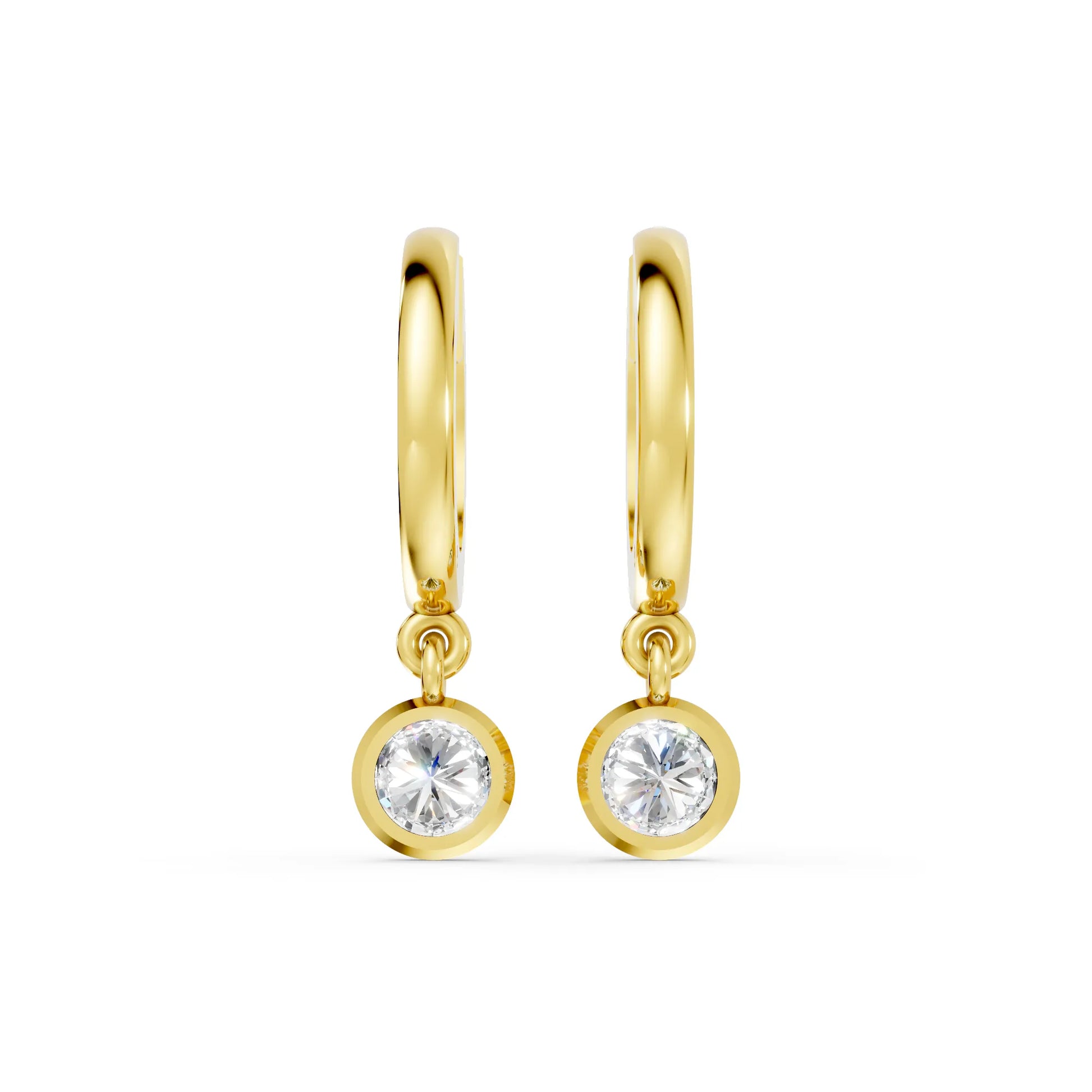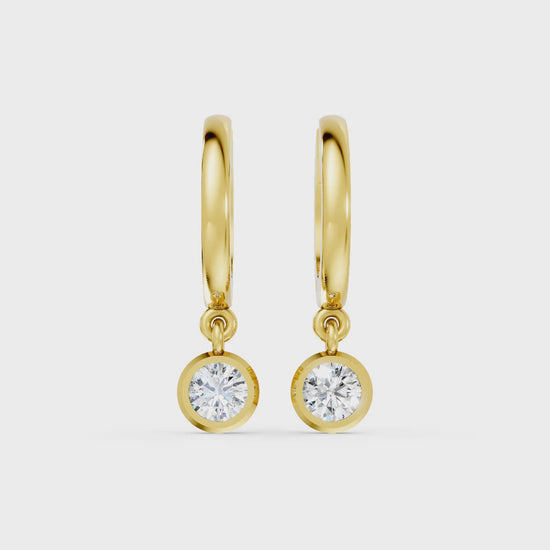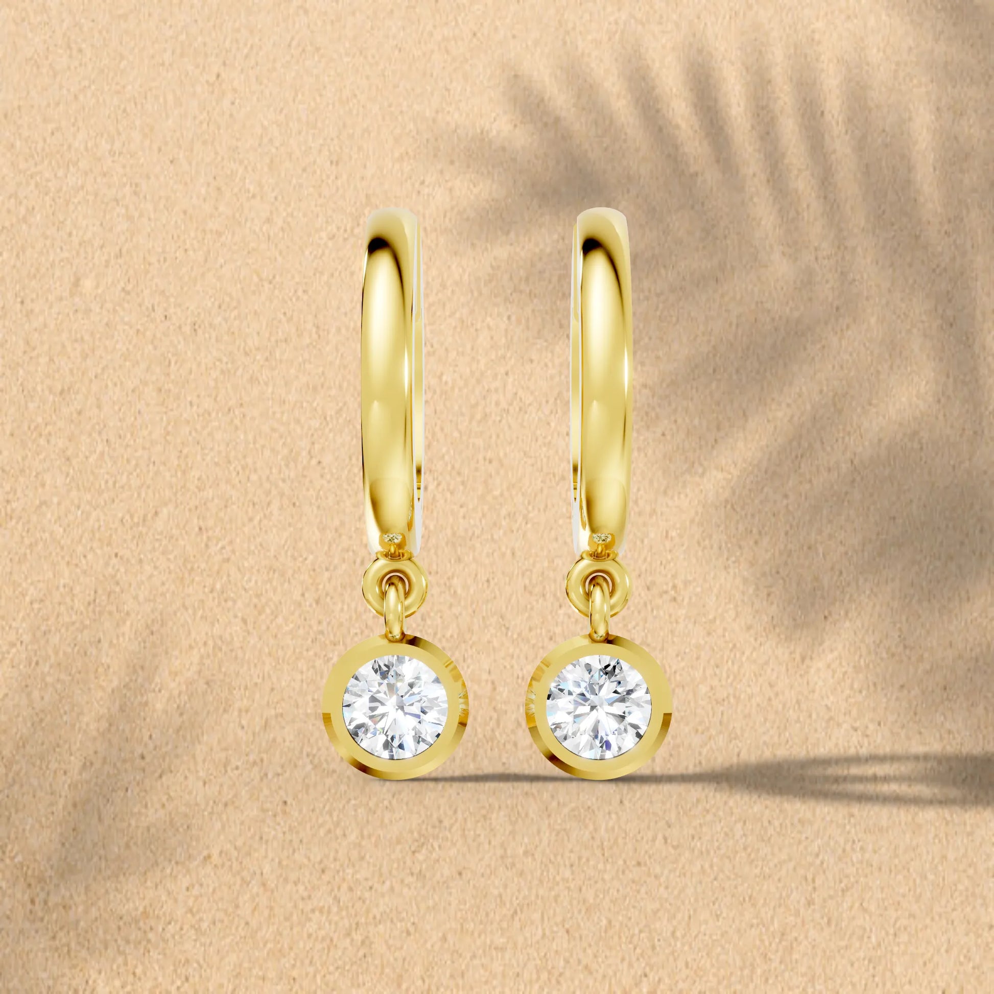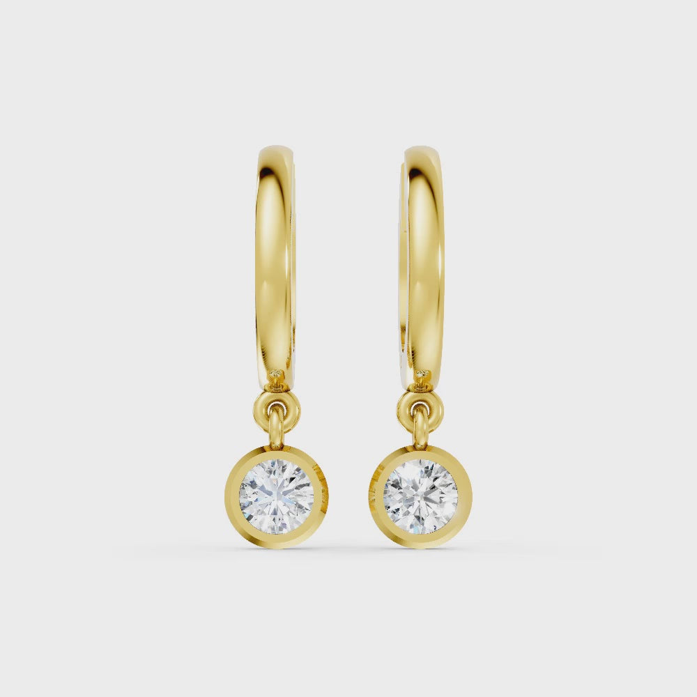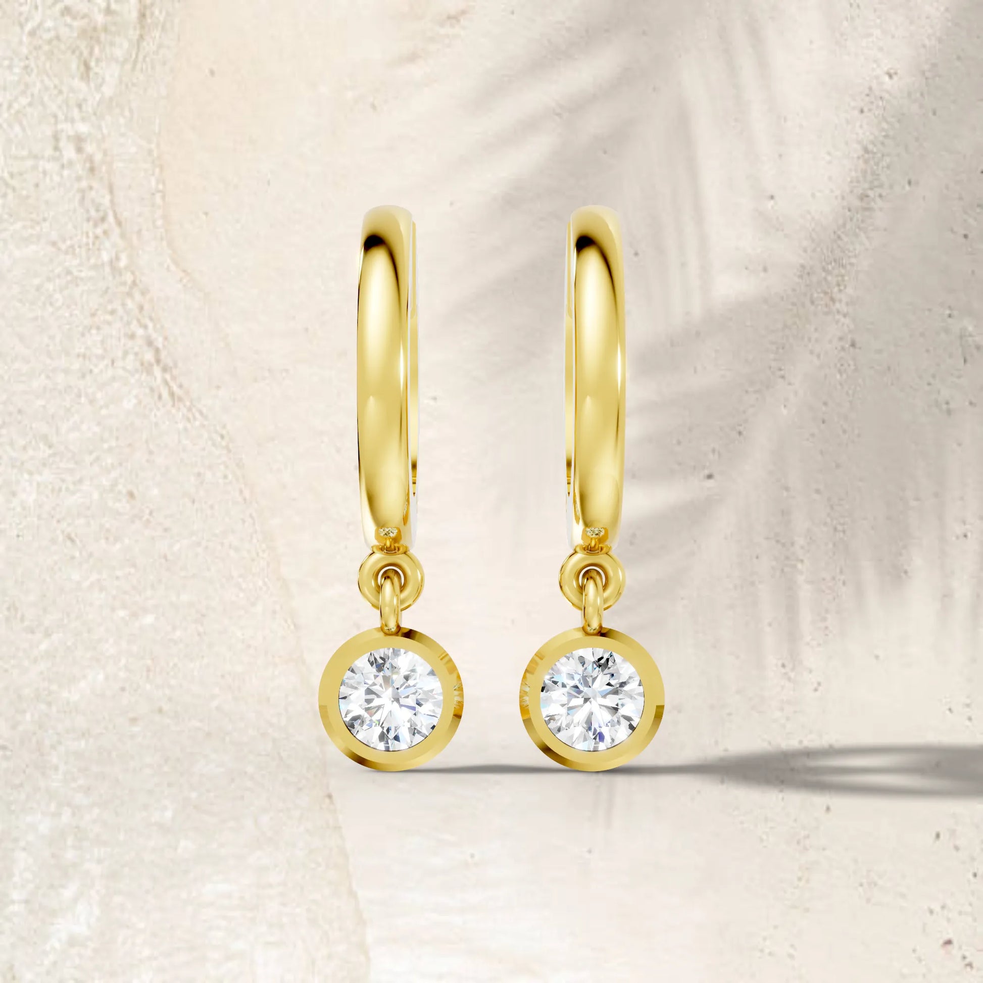 Crafted in solid 14k gold, this huggie hoop features a round cut lab-grown diamond in a sleek knife-edge bezel drop. A timeless yet modern design that delivers radiant sparkle for any occasion.