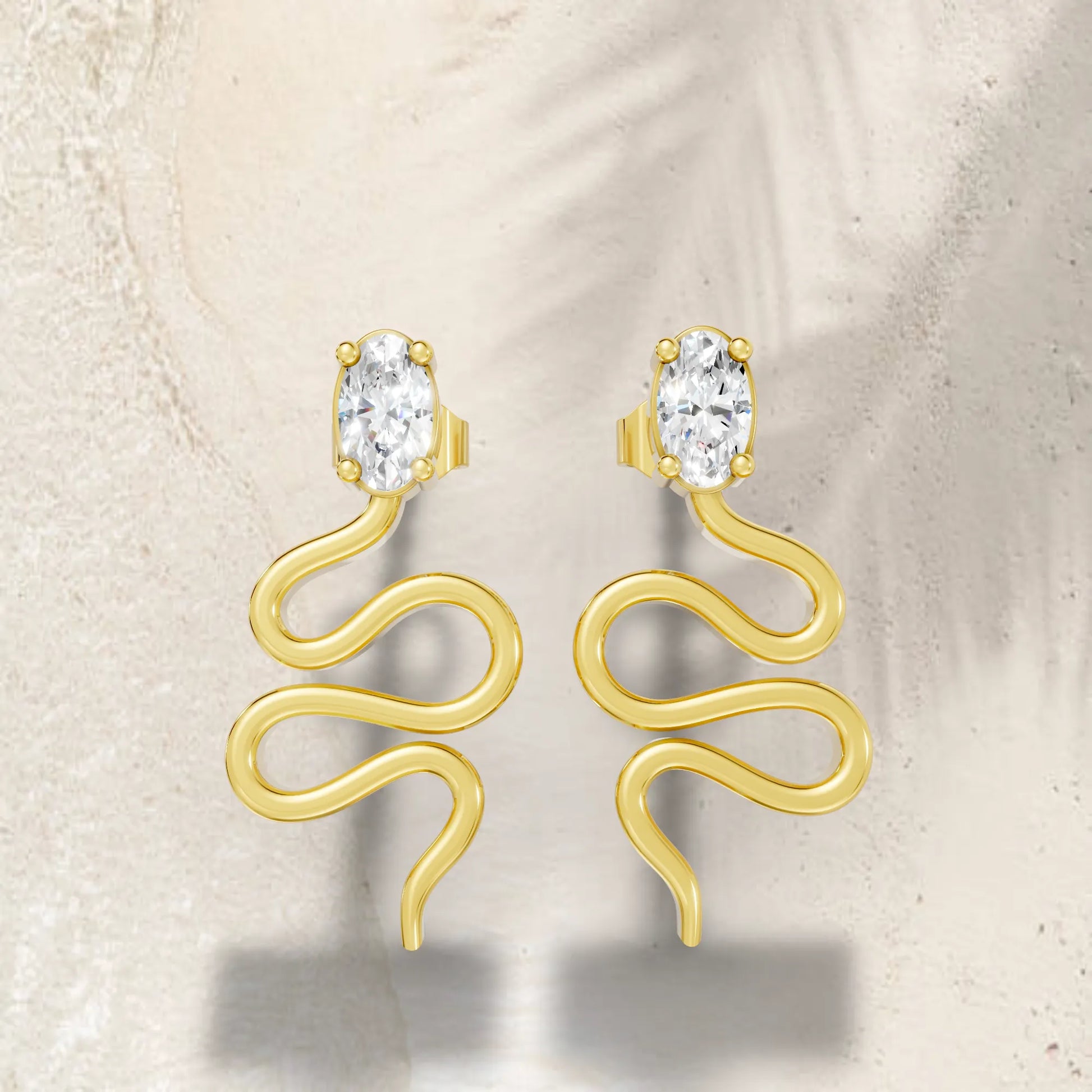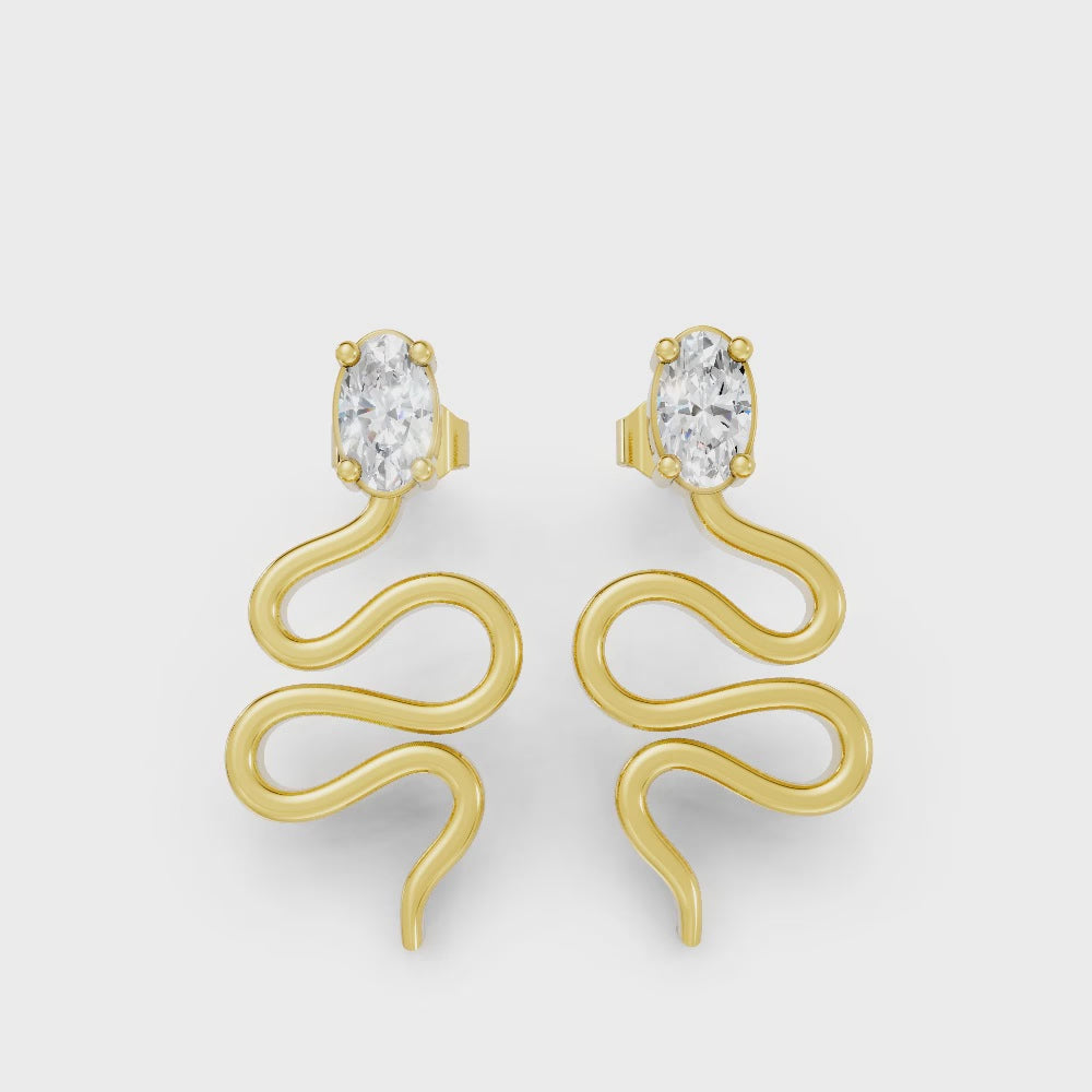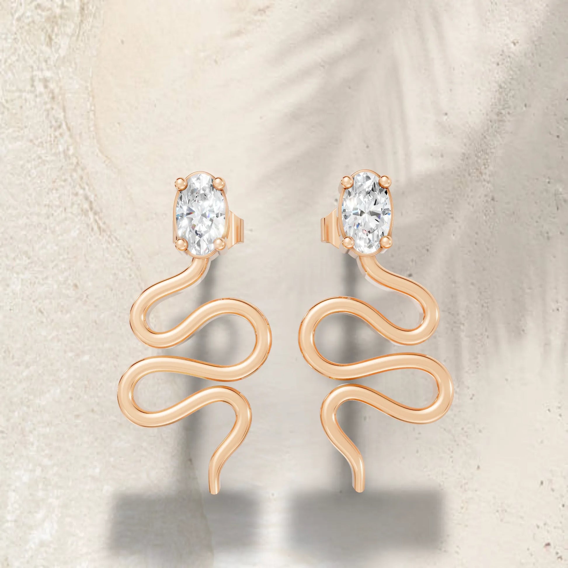 Crafted in solid 14k gold, these Snake Inspired earrings feature oval cut lab-grown diamonds in secure prong settings. A bold yet refined design that blends natural artistry with radiant brilliance.