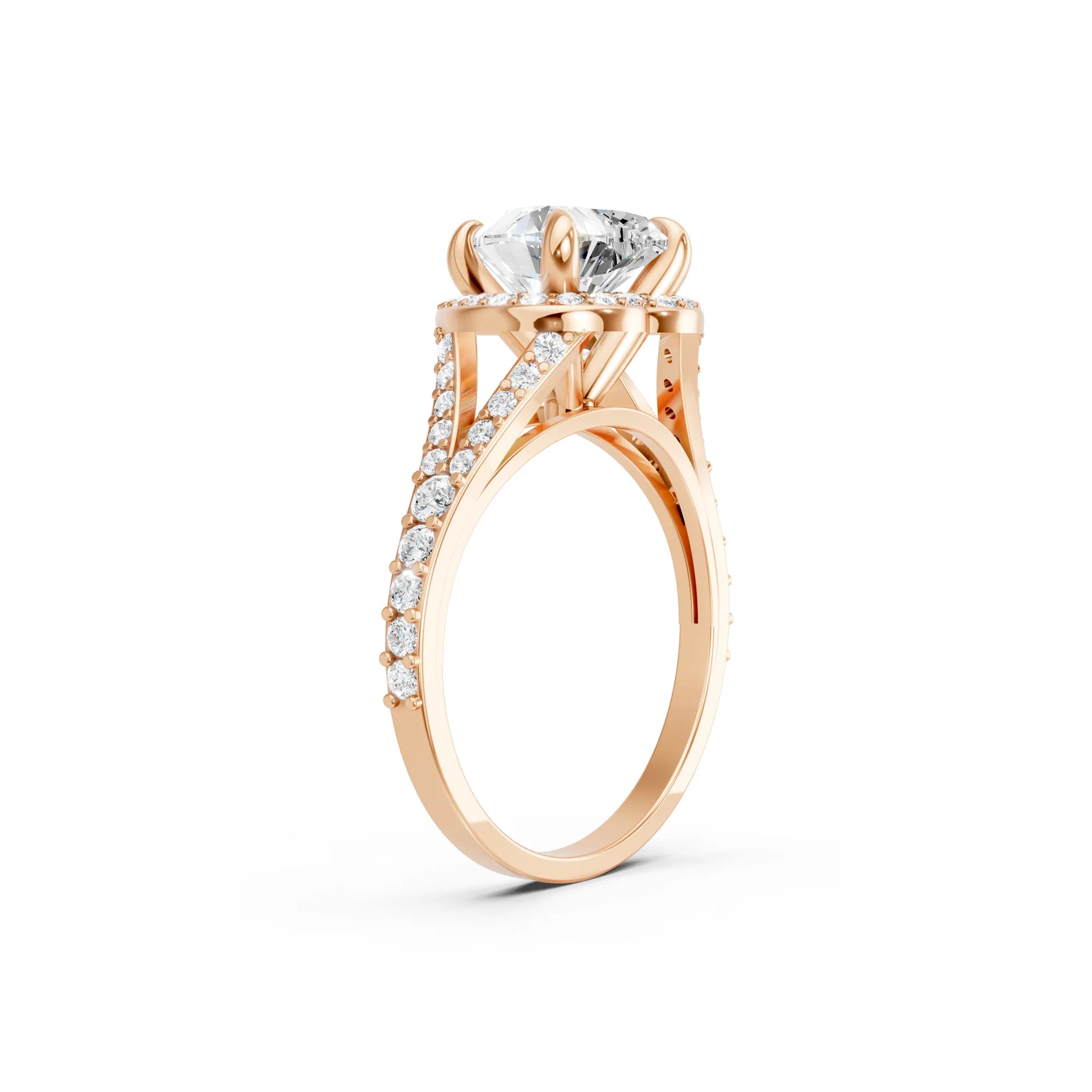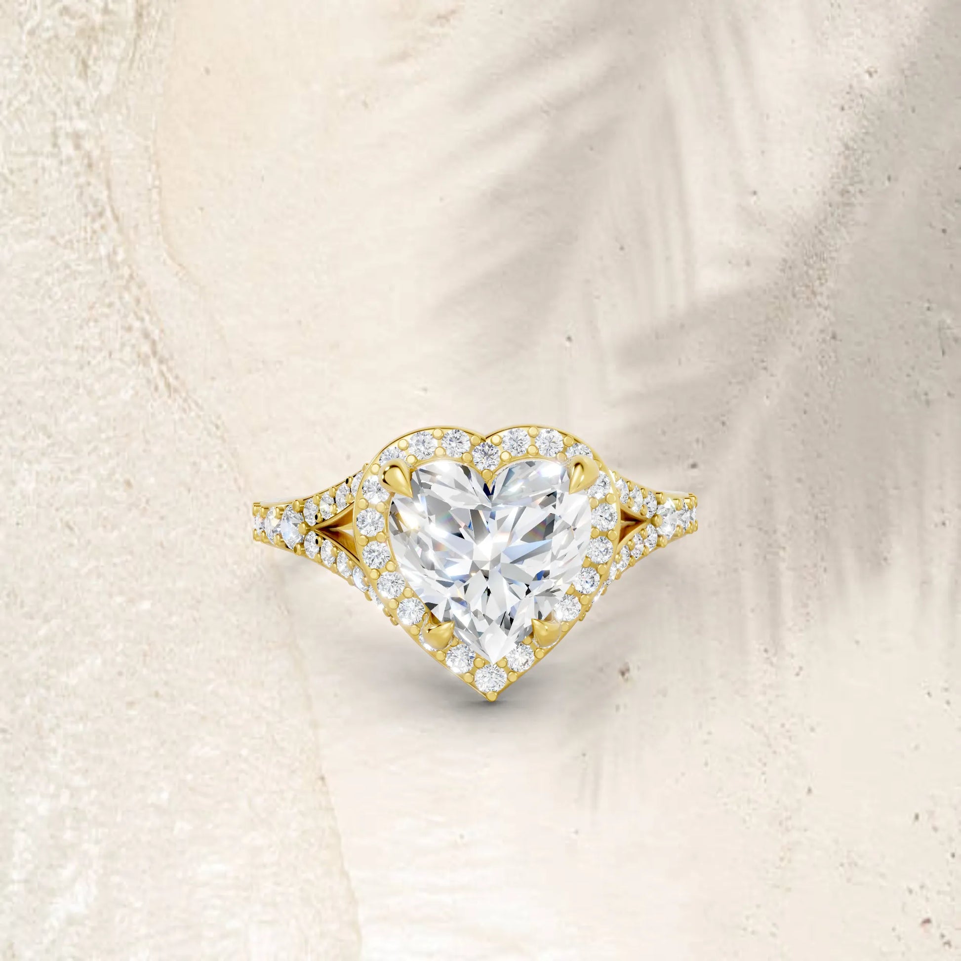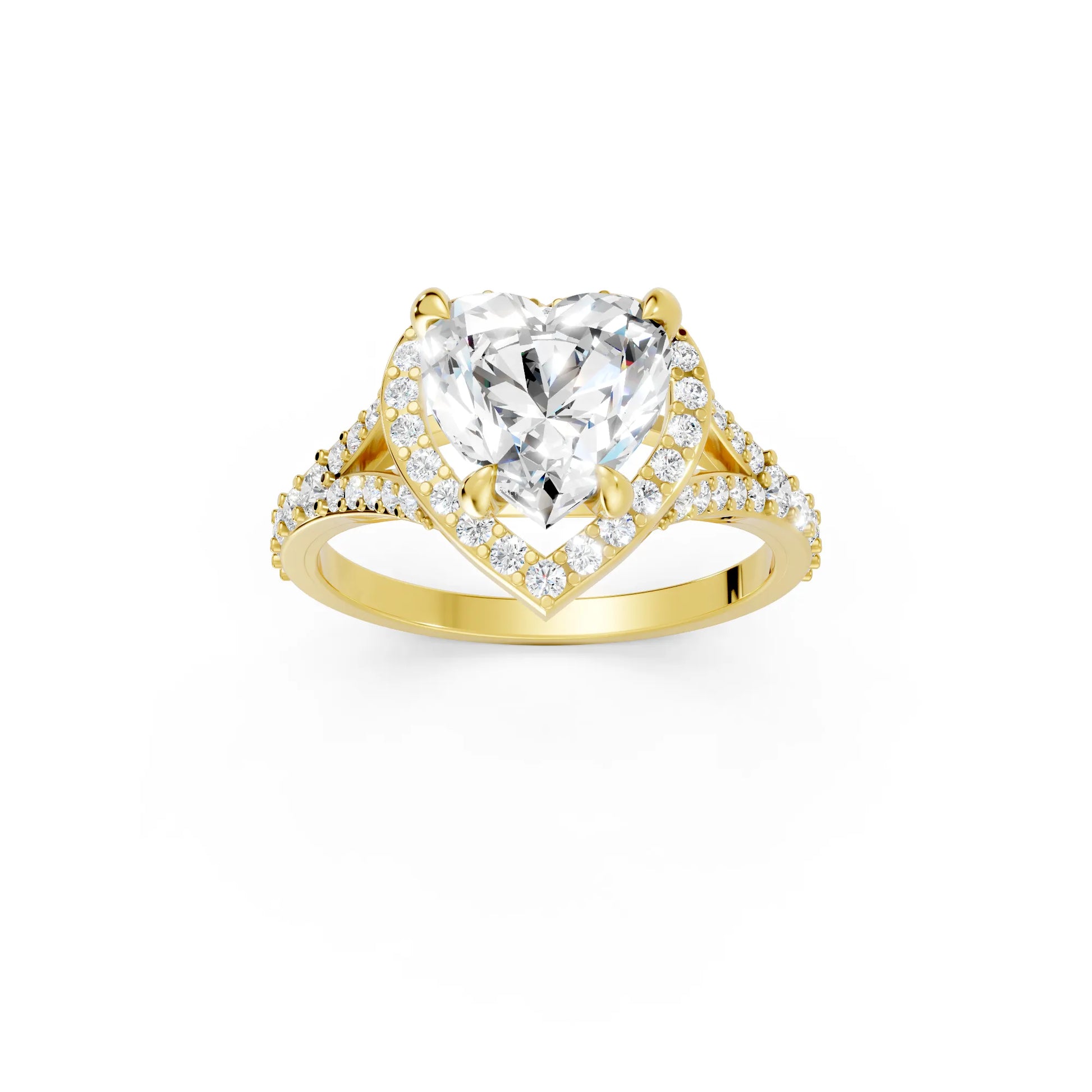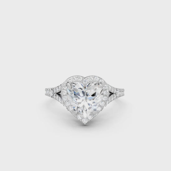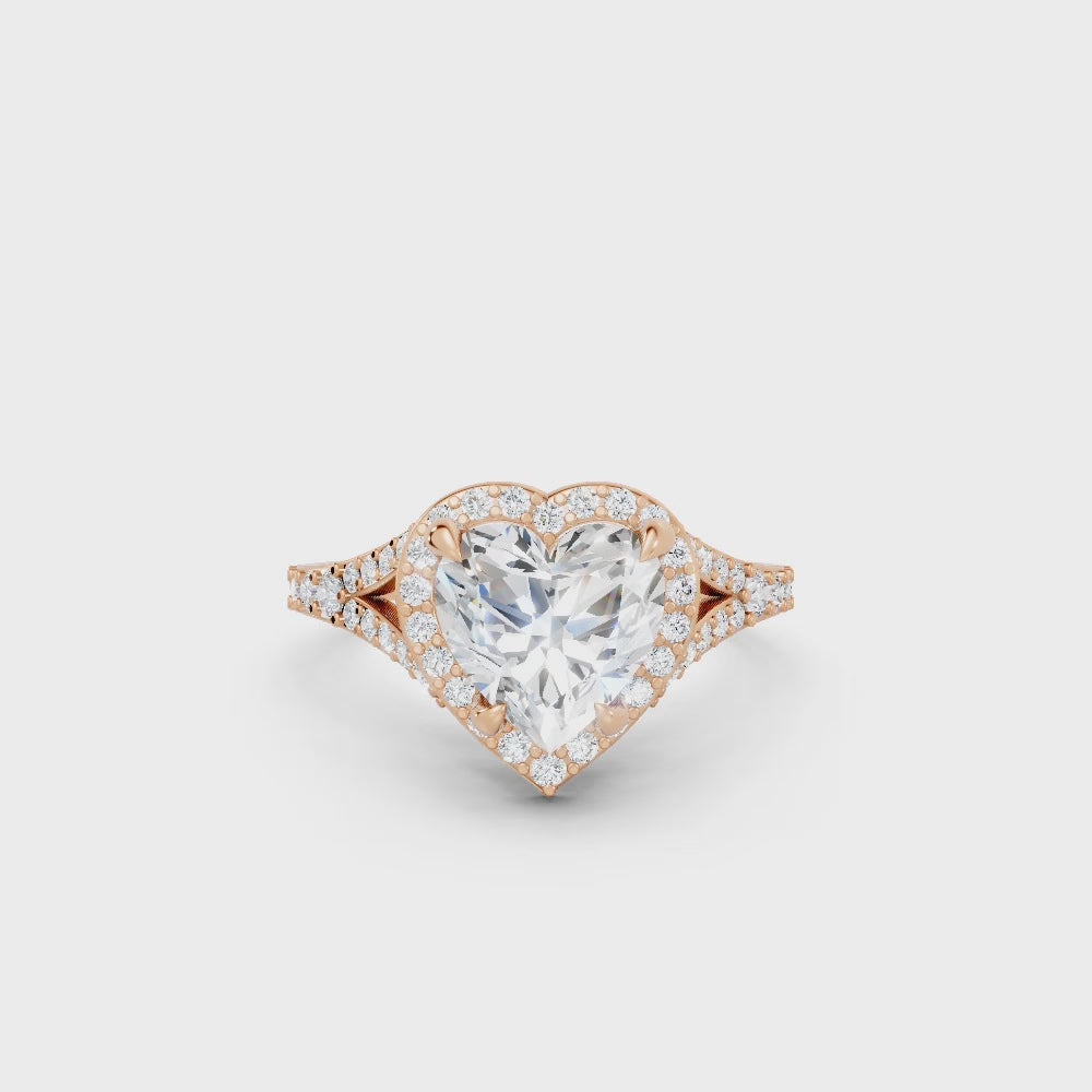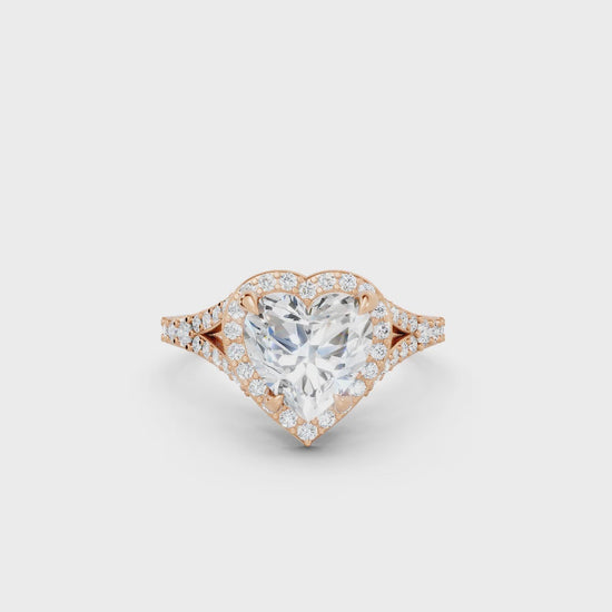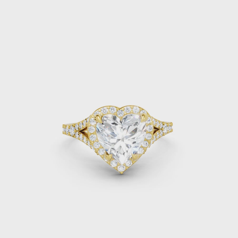 Celebrate love with this heart cut lab-grown diamond ring, crafted in solid 14k gold. A radiant halo and split shank design add brilliance and elegance, creating a sustainable symbol of romance and commitment.