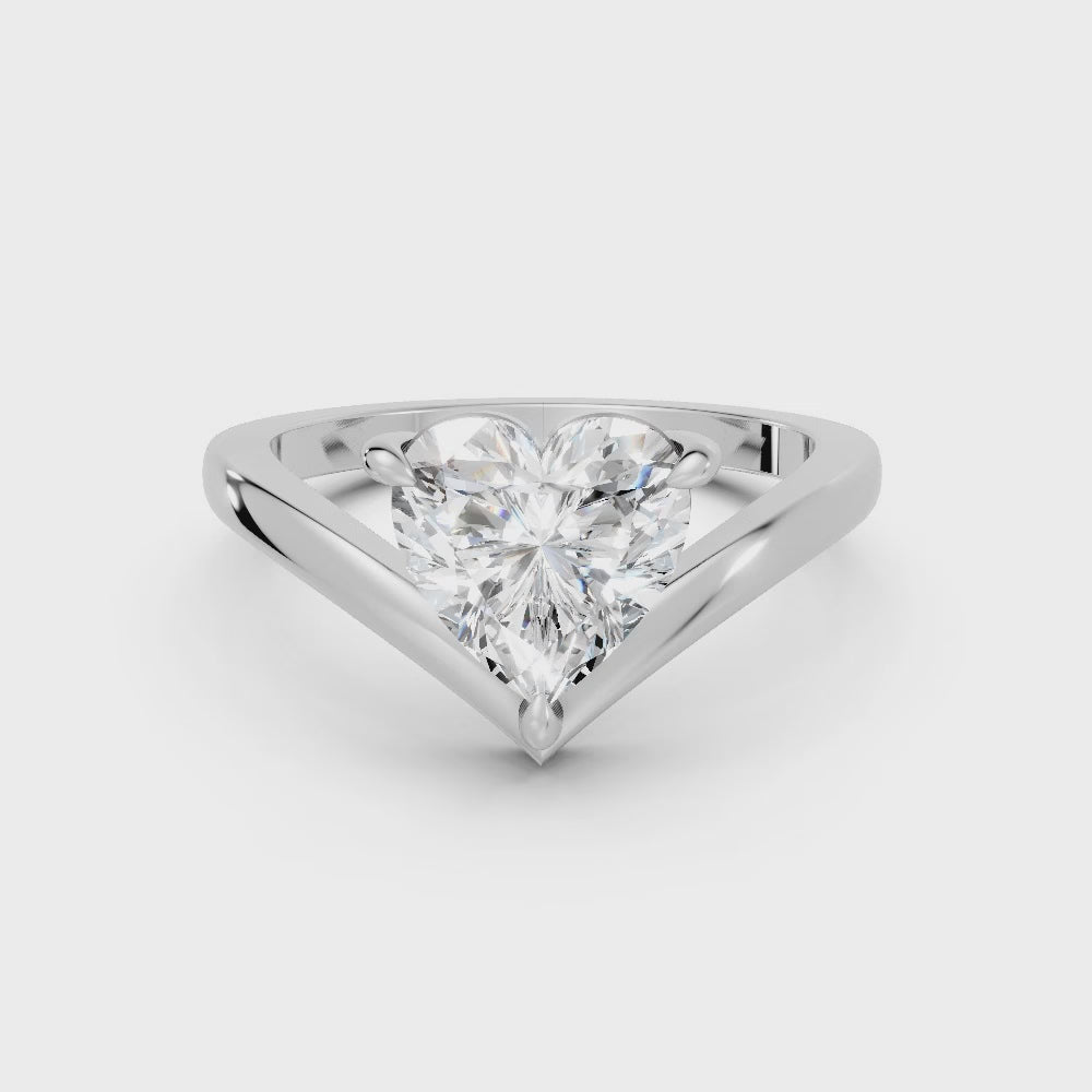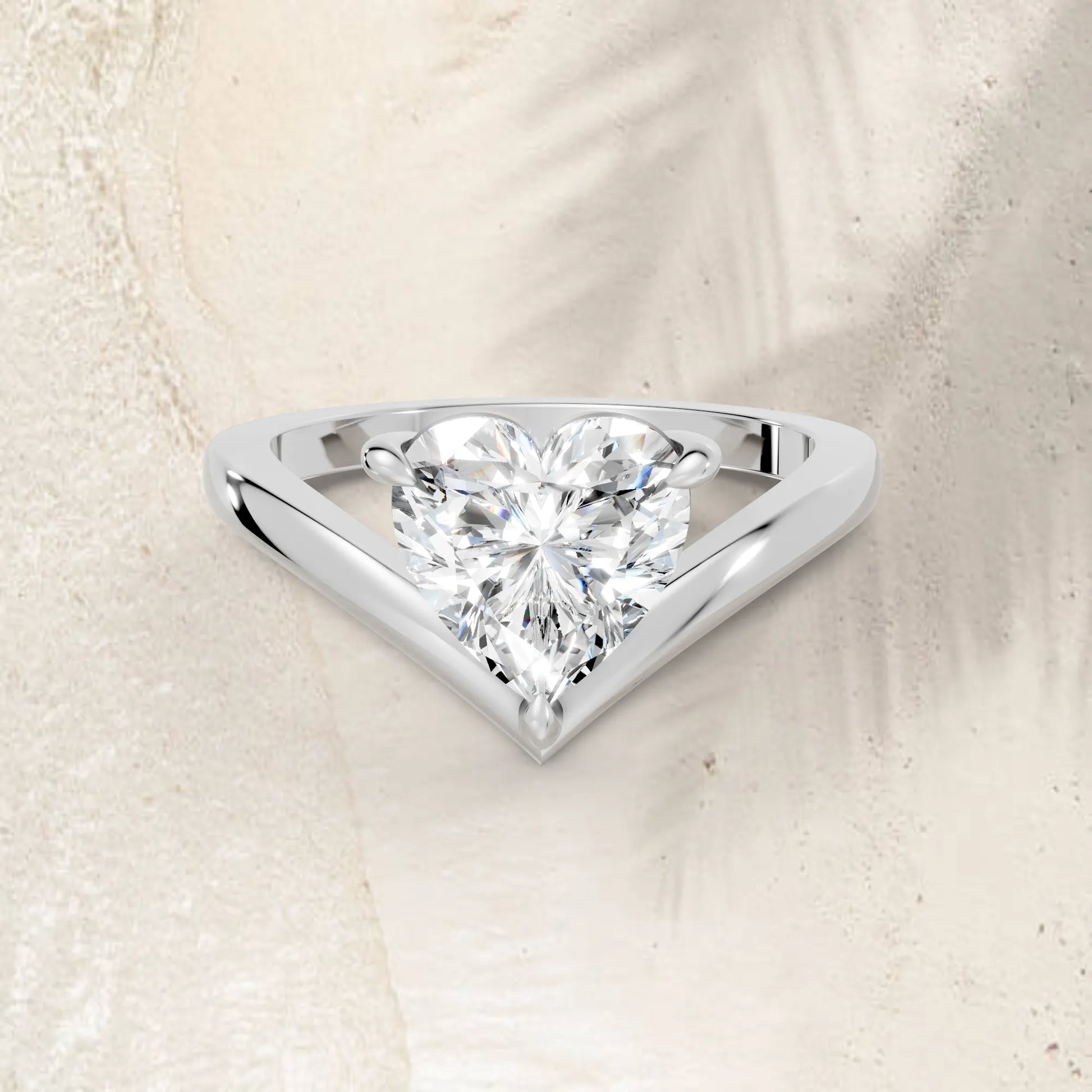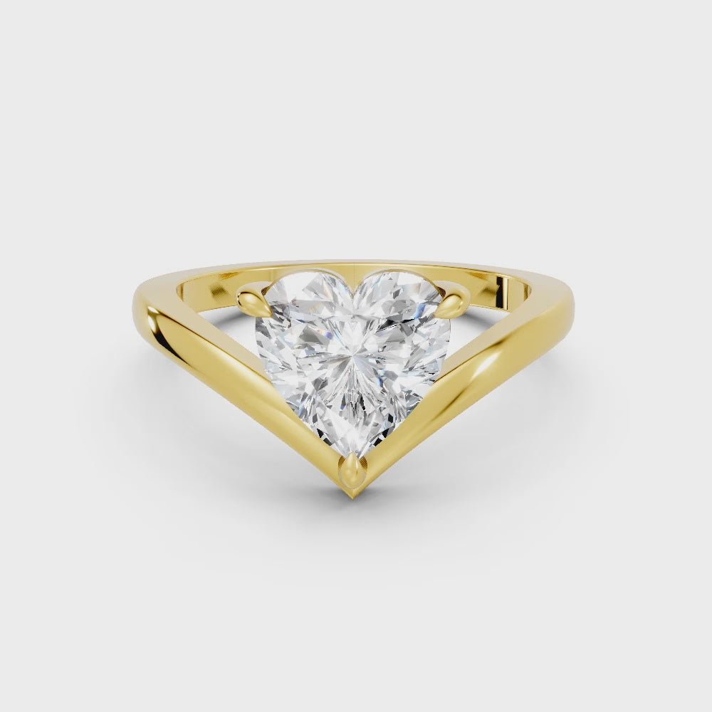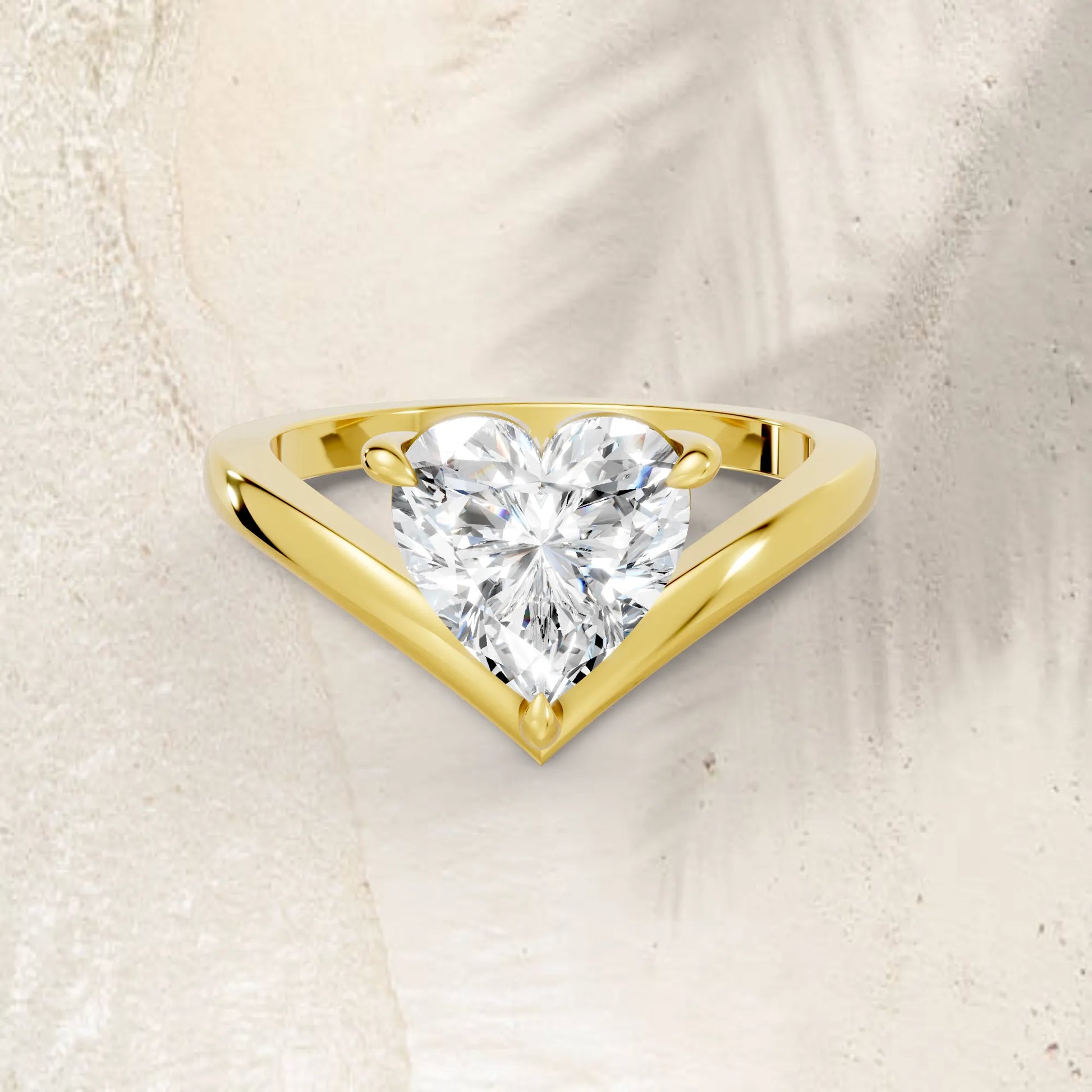 This engagement ring, crafted in solid 14k gold, showcases a romantic heart cut lab-grown diamond in a sleek V-shaped design. A symbolic piece that represents love, brilliance, and everlasting devotion.