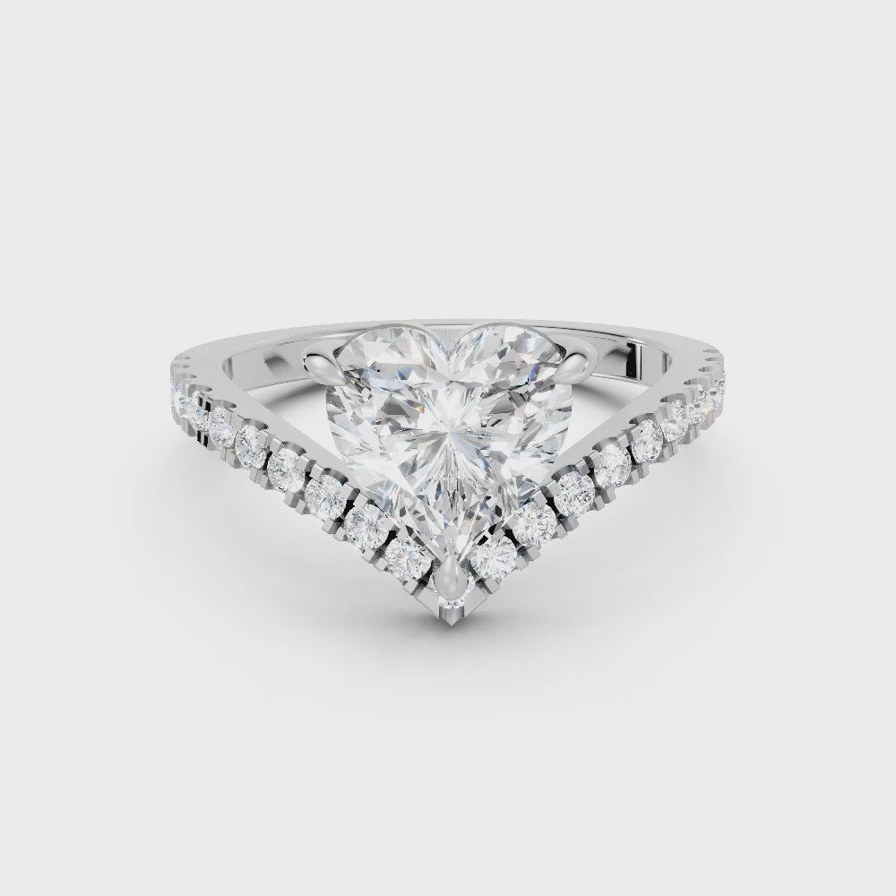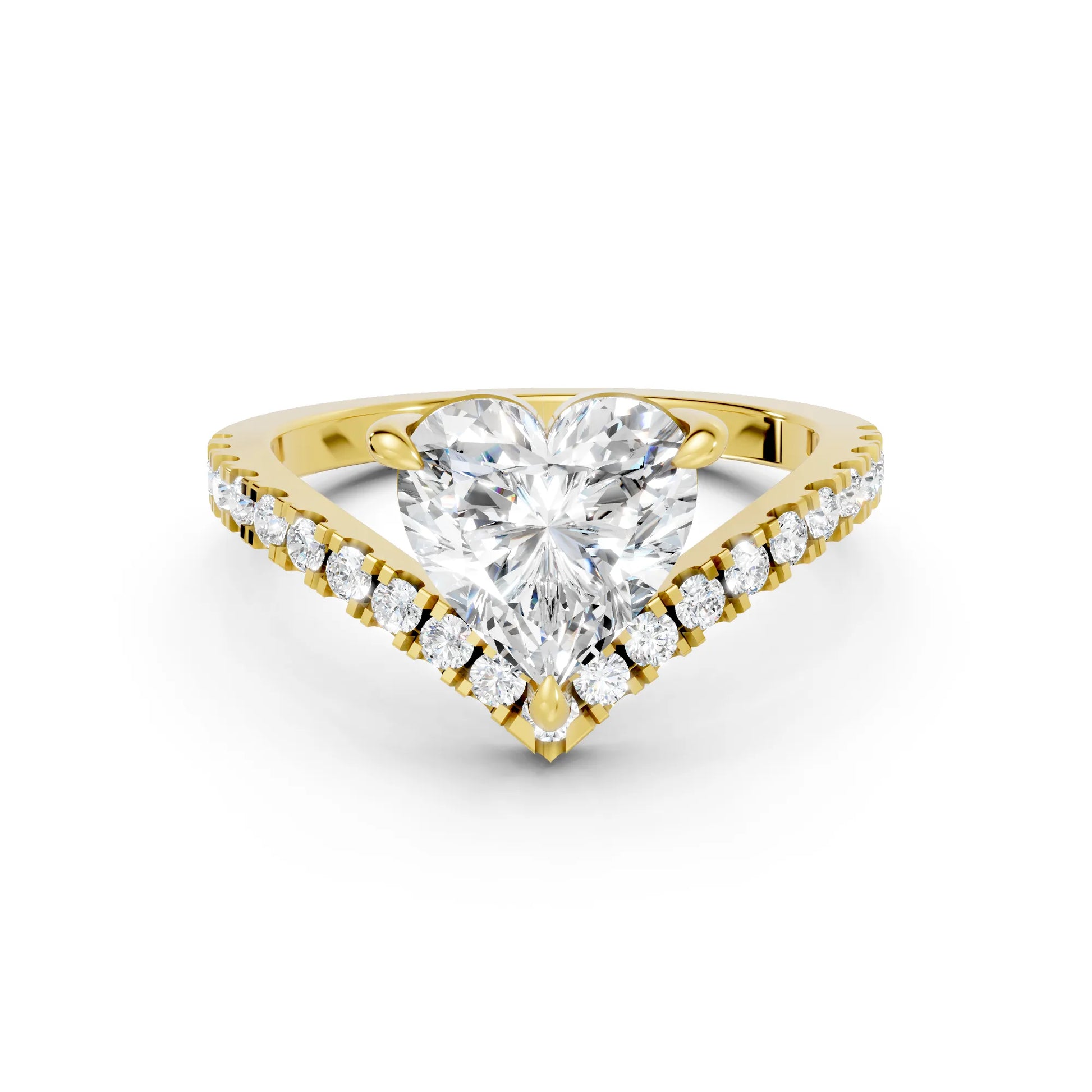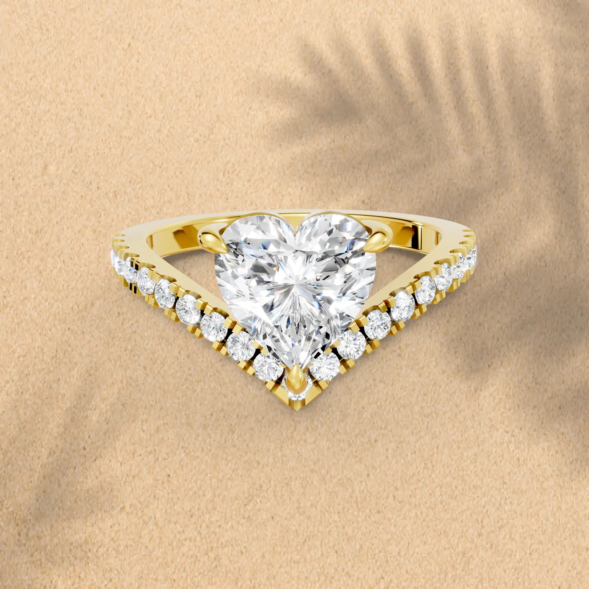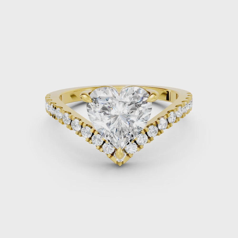 Crafted in solid 14k gold, this engagement ring features a romantic heart cut lab-grown diamond in a graceful V-shaped design. Sparkling side accents enhance its brilliance, creating a meaningful symbol of love and unity.