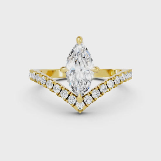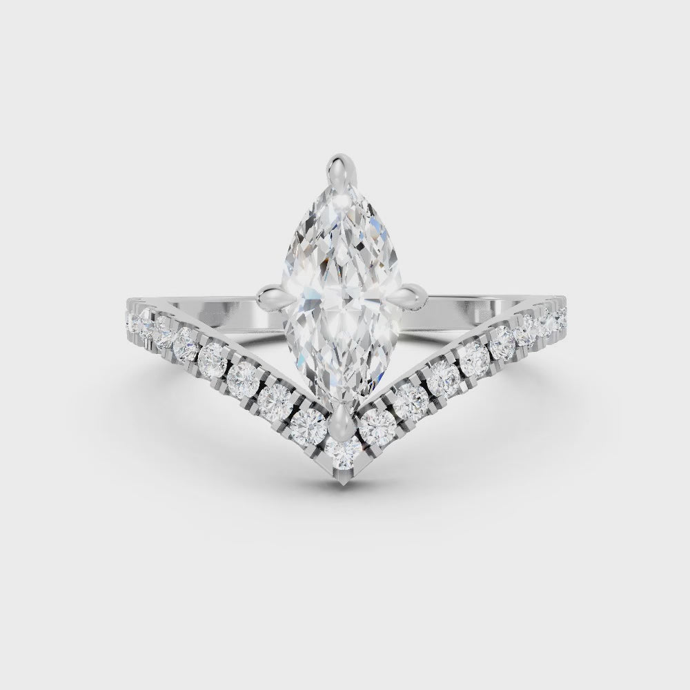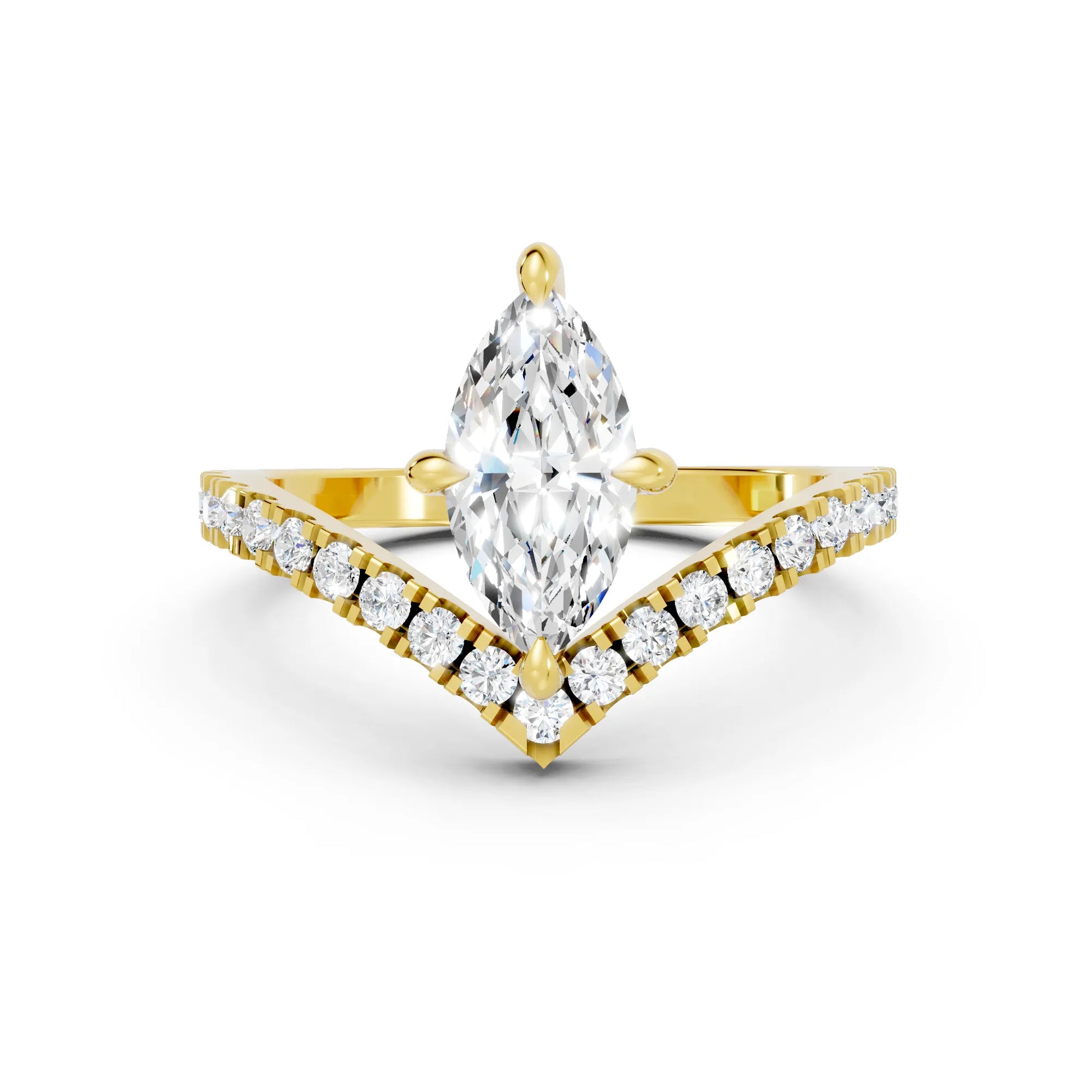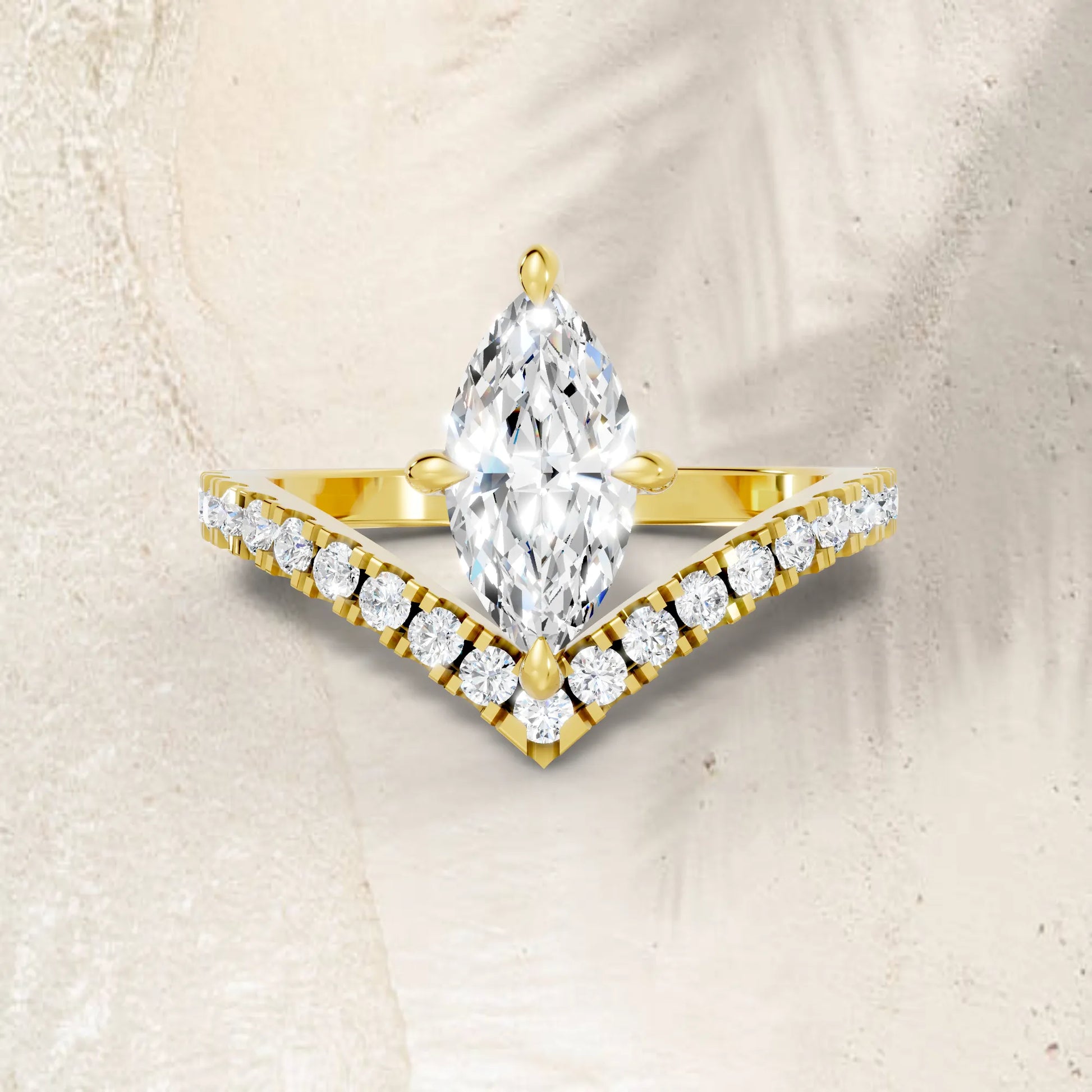 Crafted in solid 14k gold, this engagement ring features a marquise cut lab-grown diamond in a graceful V-shaped design. Sparkling side accents enhance its elongated brilliance, symbolizing love, harmony, and timeless beauty.