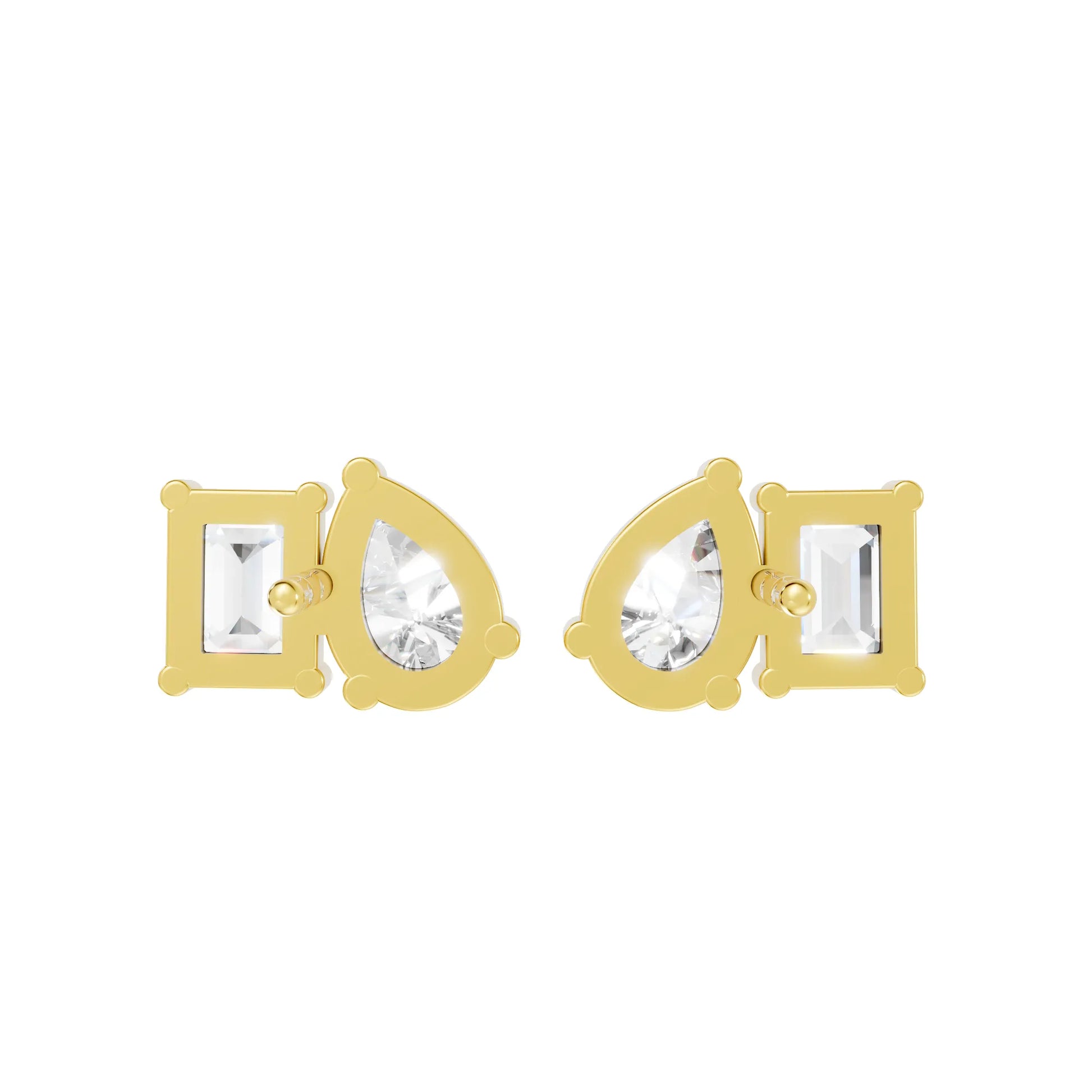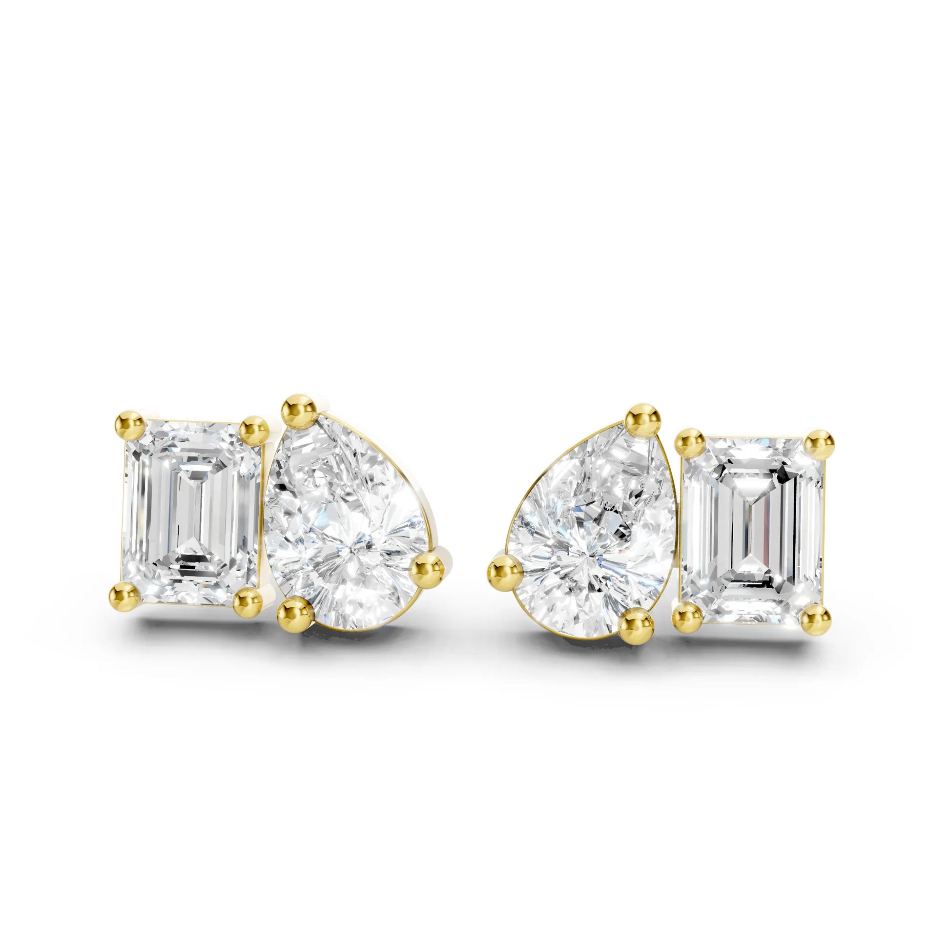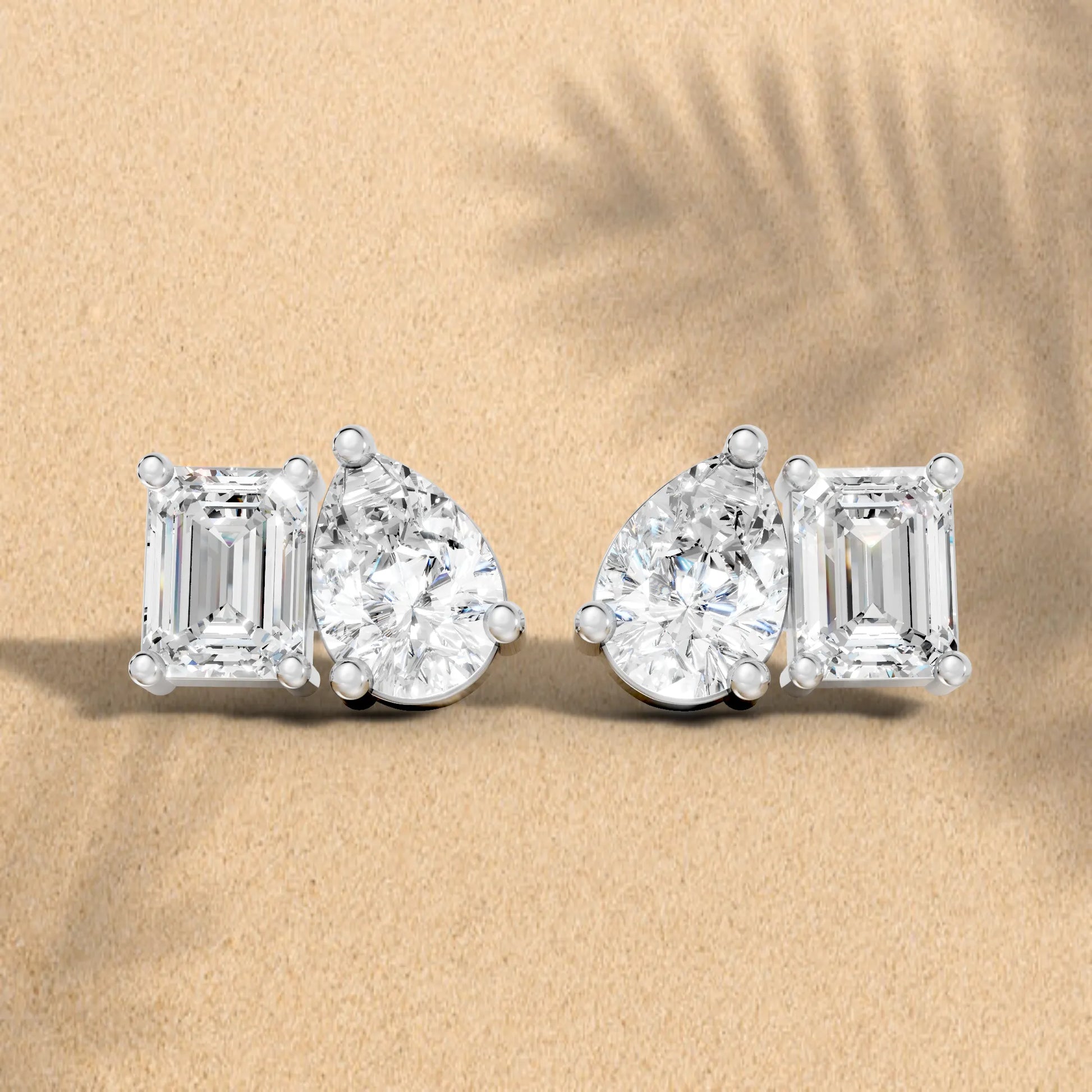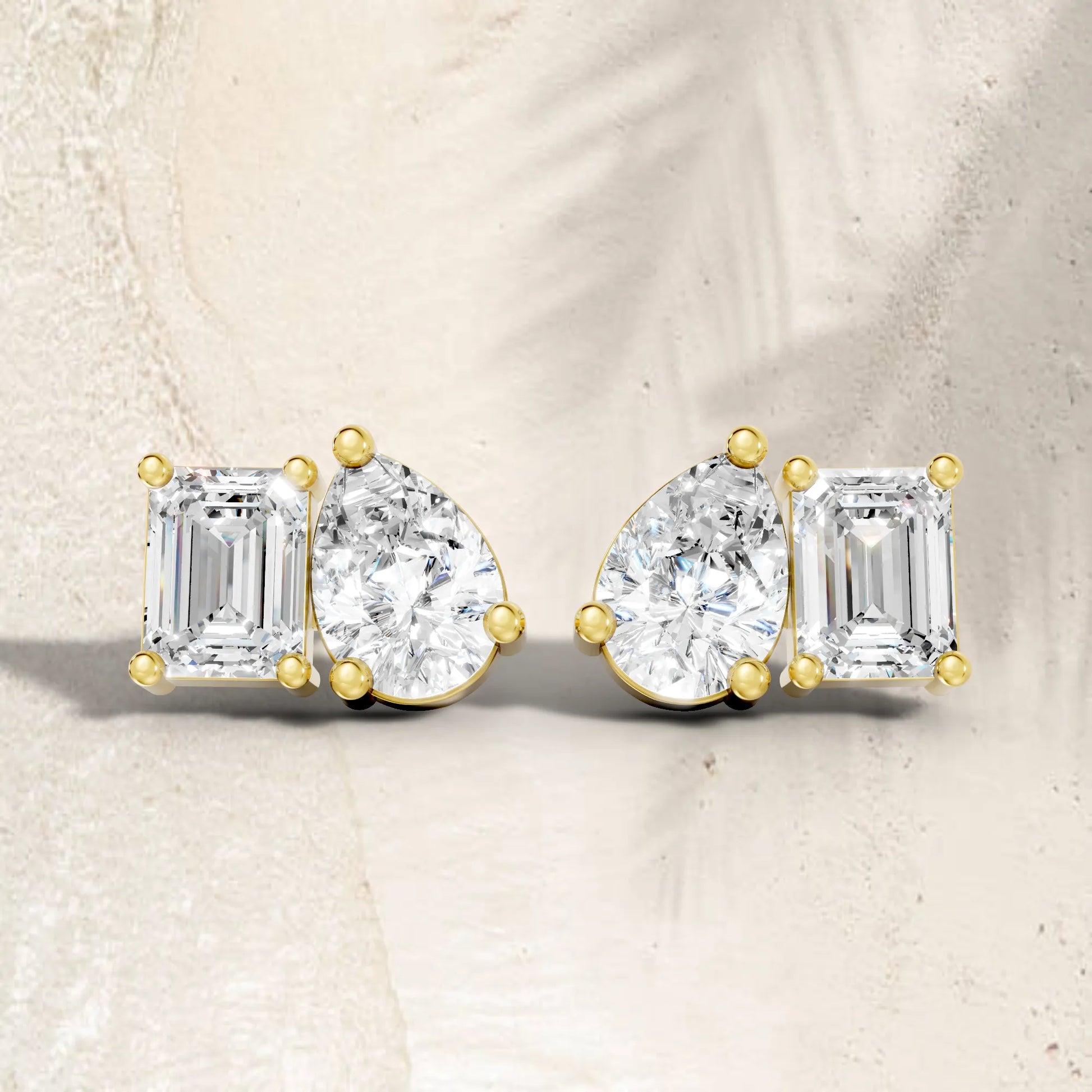This Toi et Moi stud earring, crafted in solid 14k gold, features a graceful pear cut and a sleek emerald cut lab-grown diamond. A chic two-stone design that symbolizes harmony and adds timeless sparkle to any style.