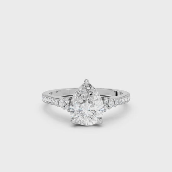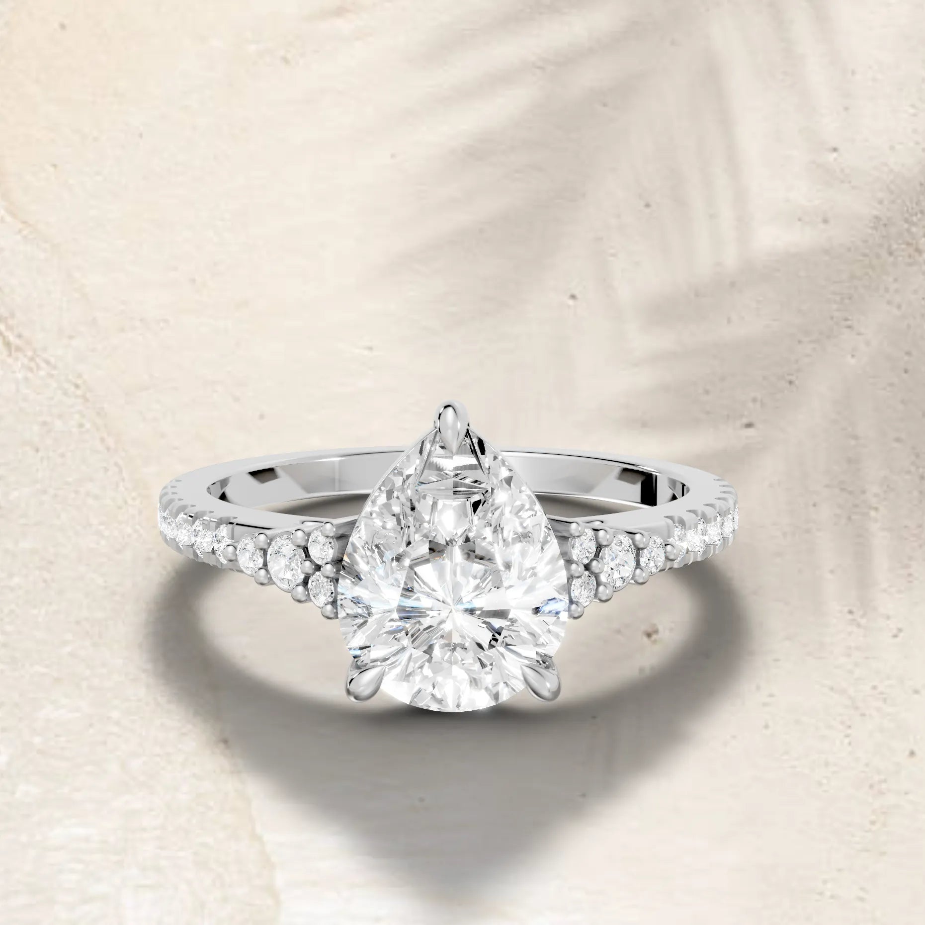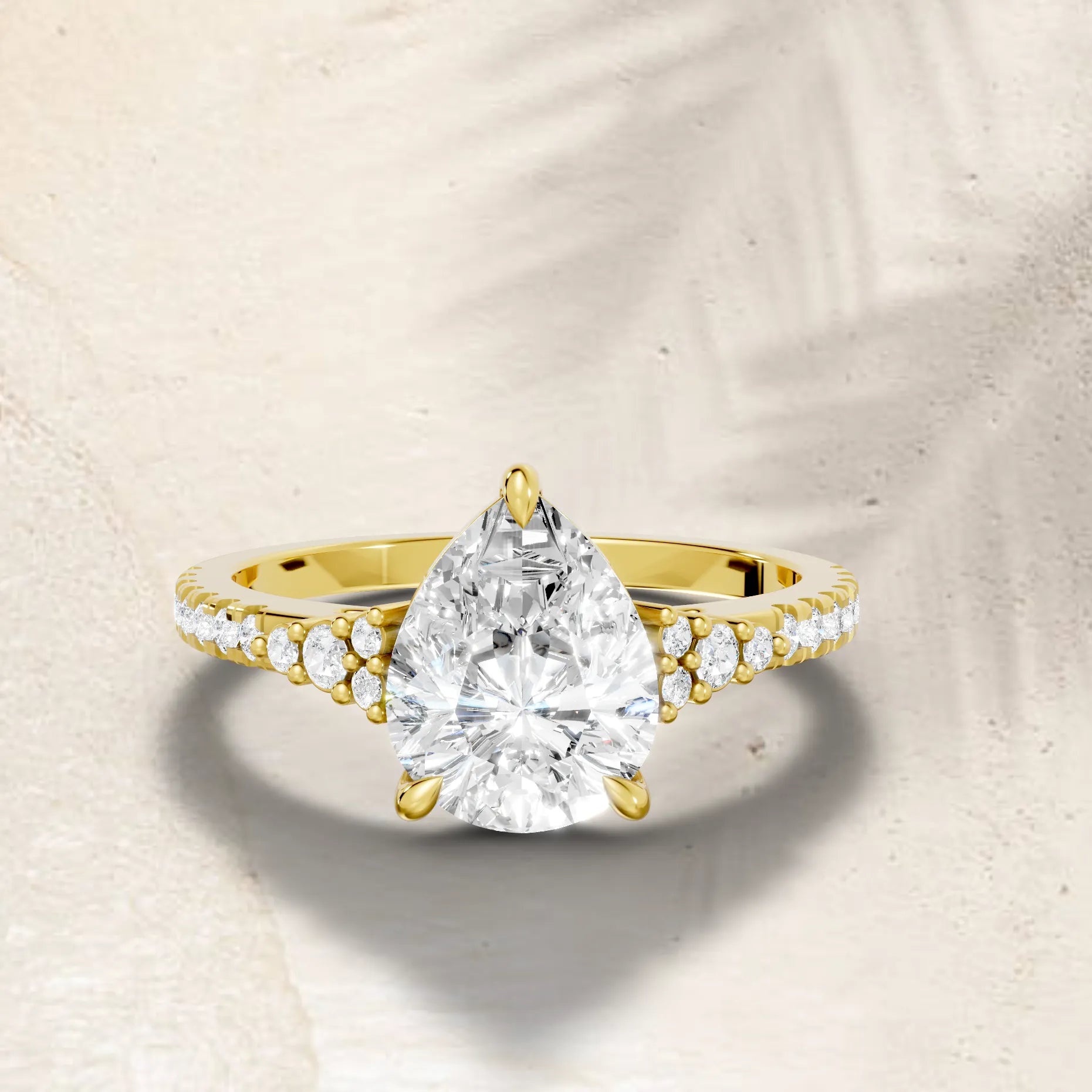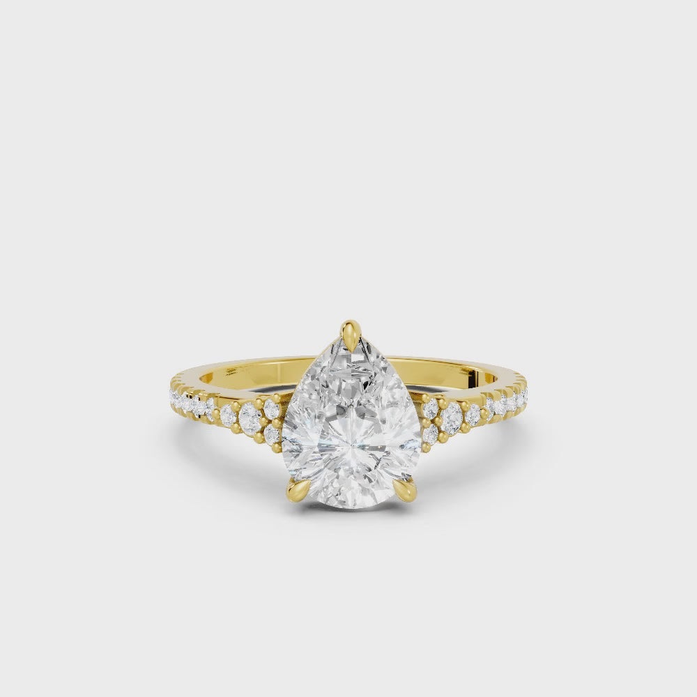 Crafted in solid 14k gold, this pear cut lab-grown diamond cathedral ring features a sparkling side cluster and accent stones for added brilliance. A modern design that beautifully symbolizes love and sophistication.