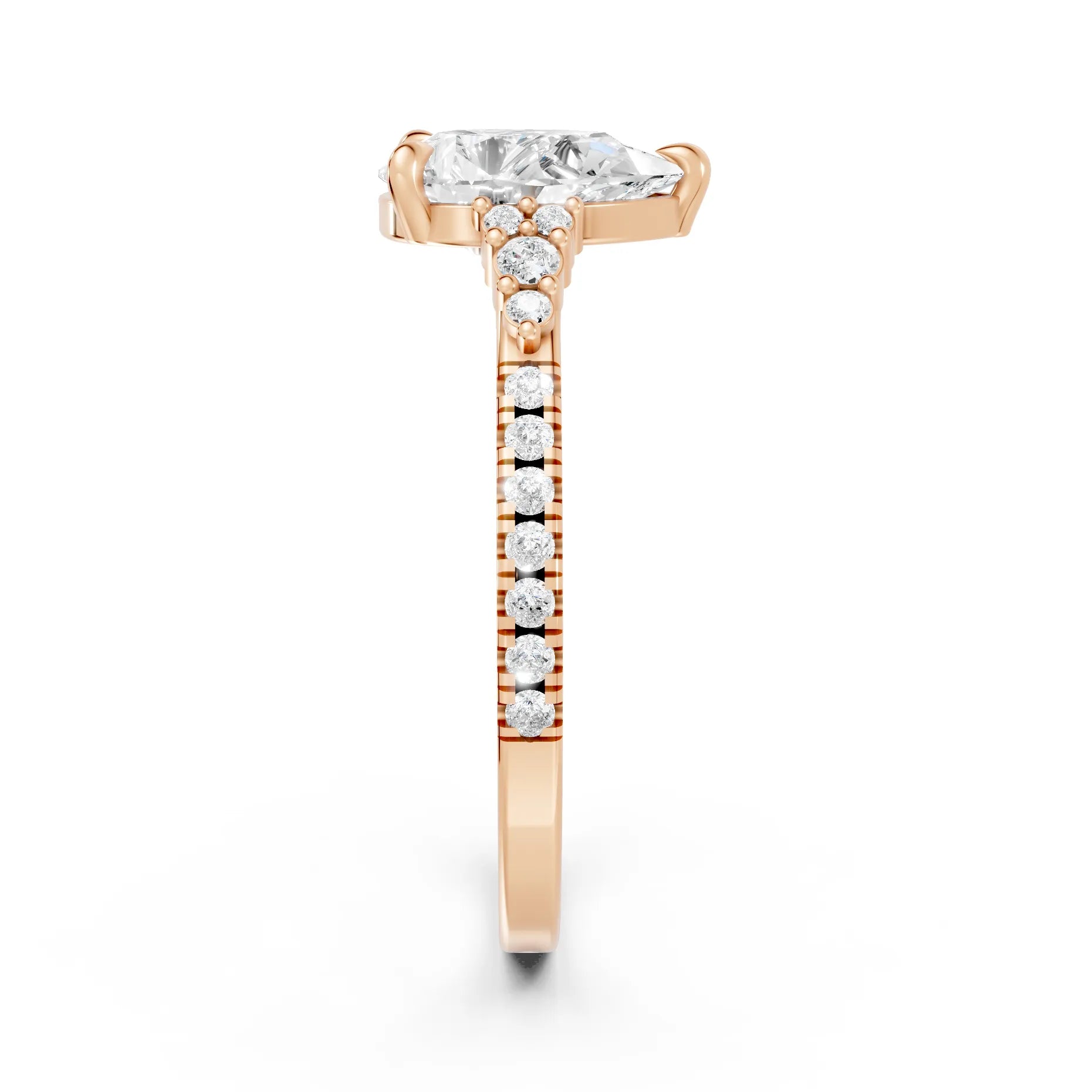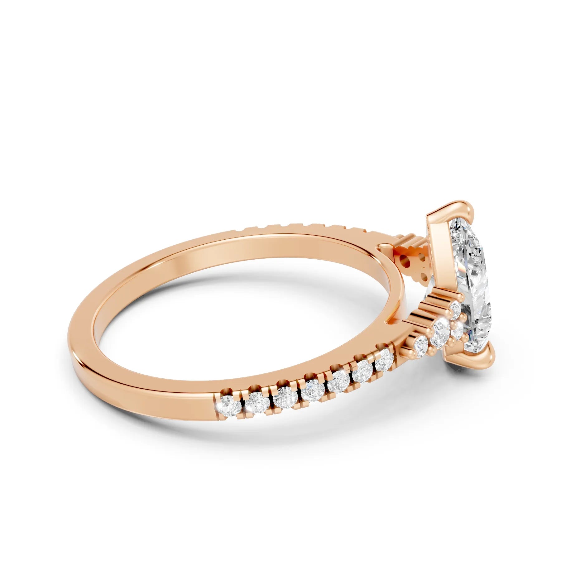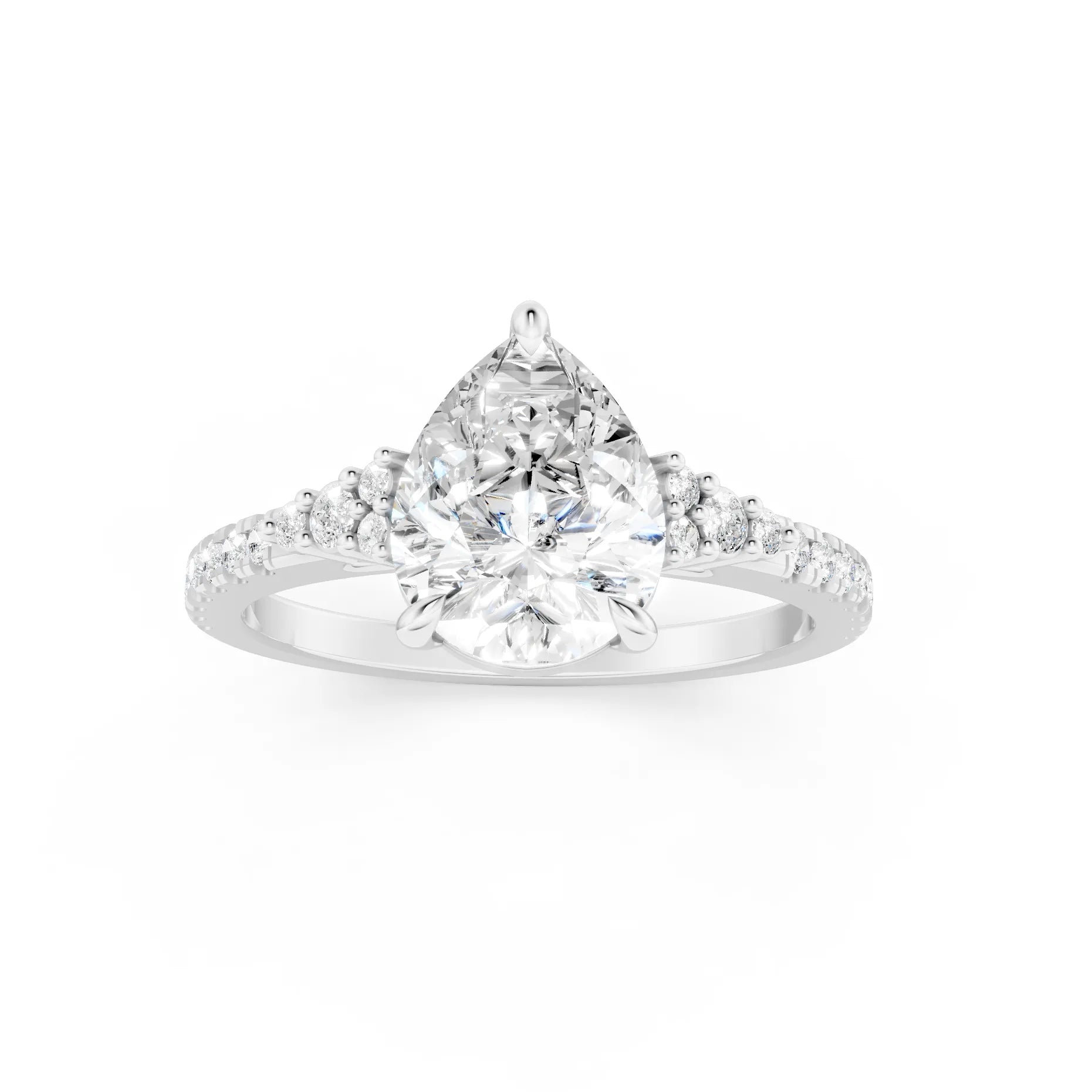 Crafted in solid 14k gold, this pear cut lab-grown diamond cathedral ring features a sparkling side cluster and accent stones for added brilliance. A modern design that beautifully symbolizes love and sophistication.