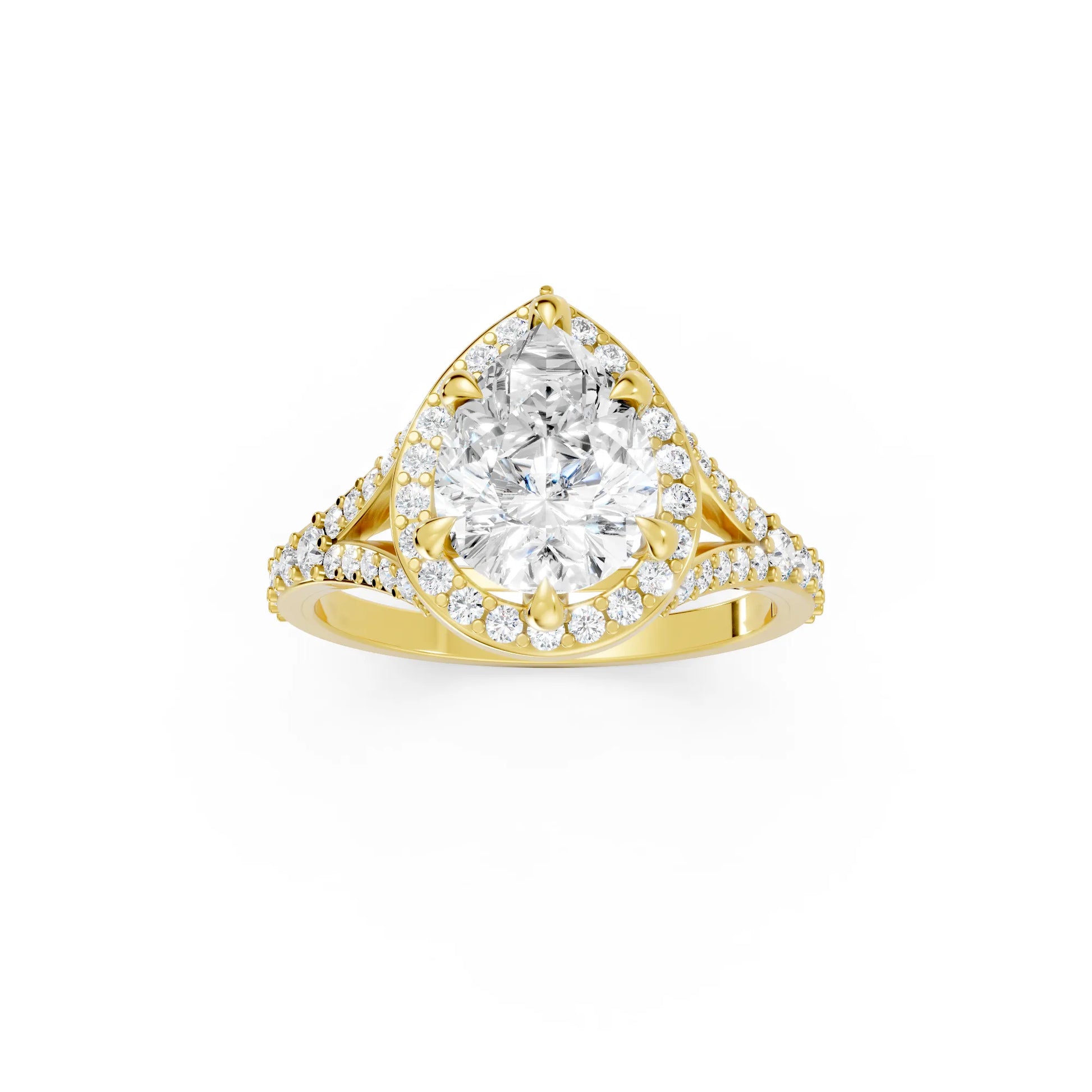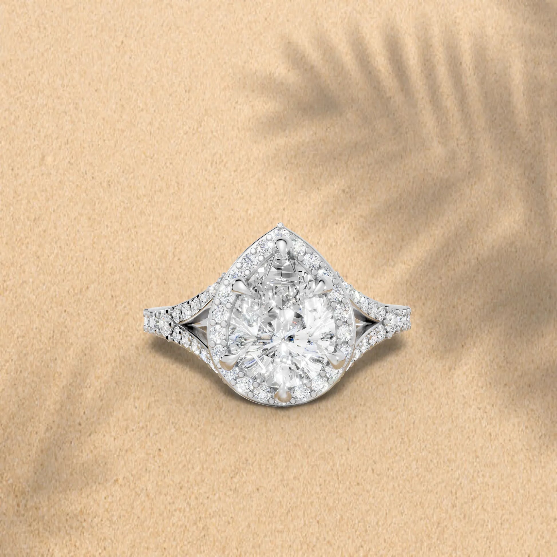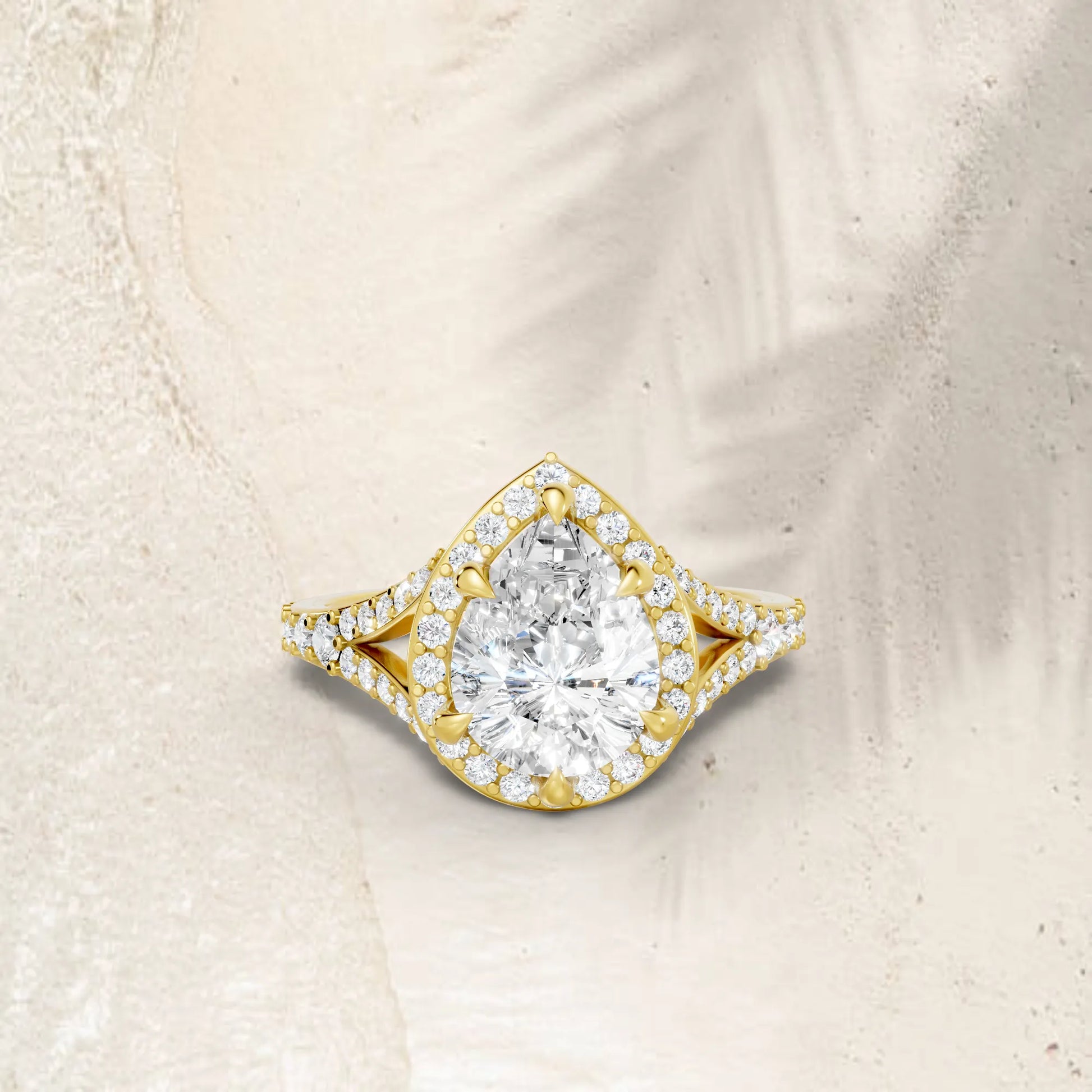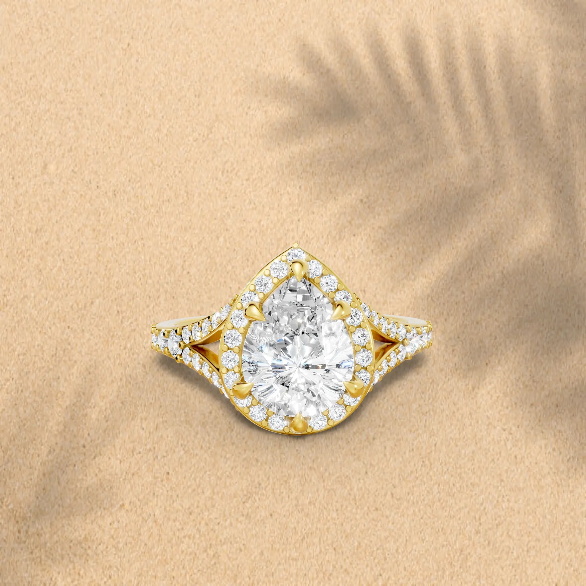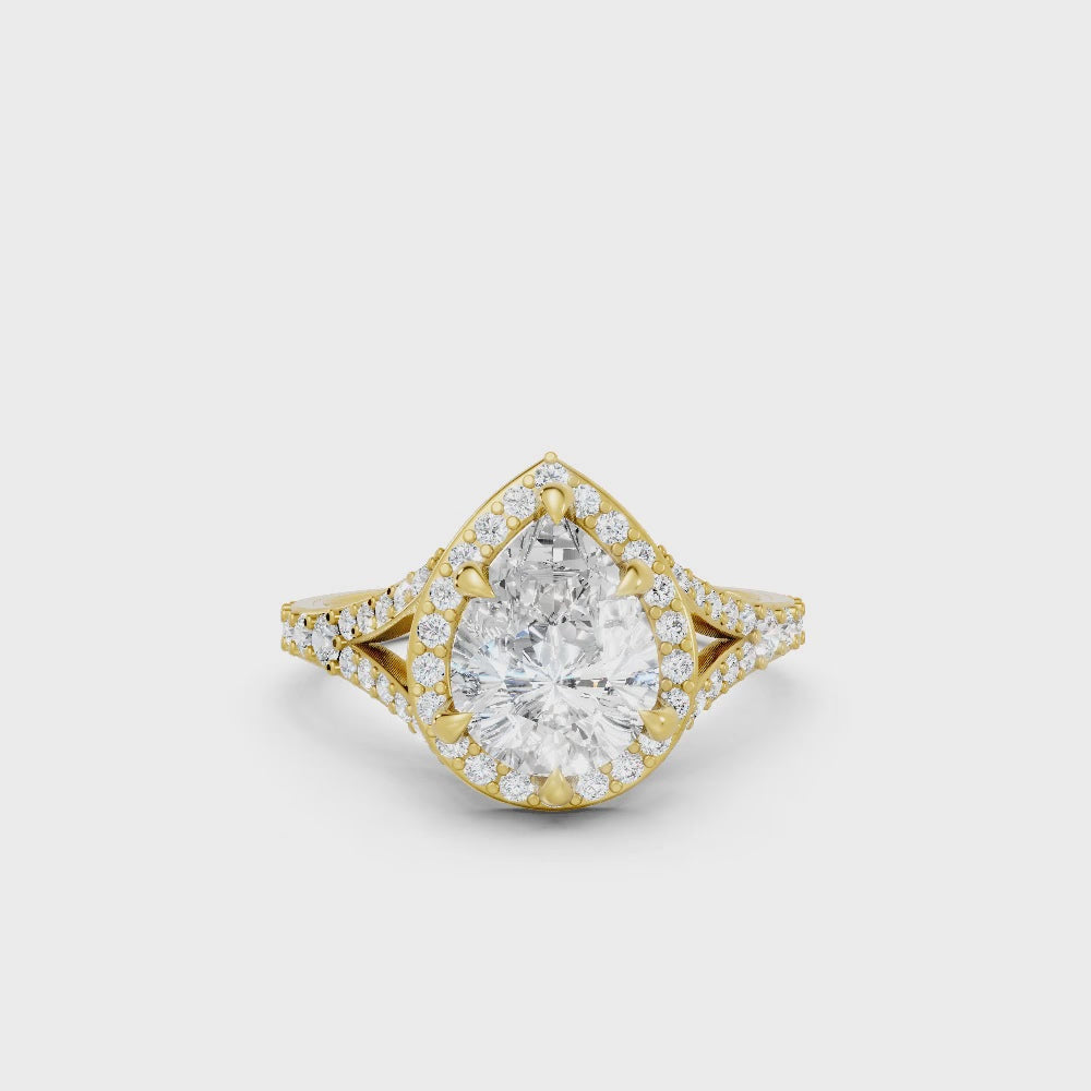 Celebrate timeless elegance with this pear cut lab-grown diamond ring, crafted in solid 14k gold. A radiant halo and split shank band with prong-set diamonds create brilliance from every angle, blending modern sophistication with sustainable luxury.
