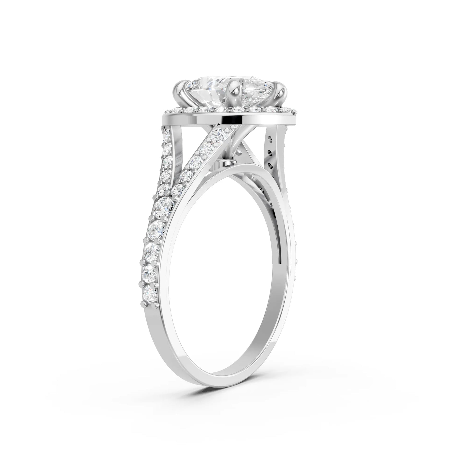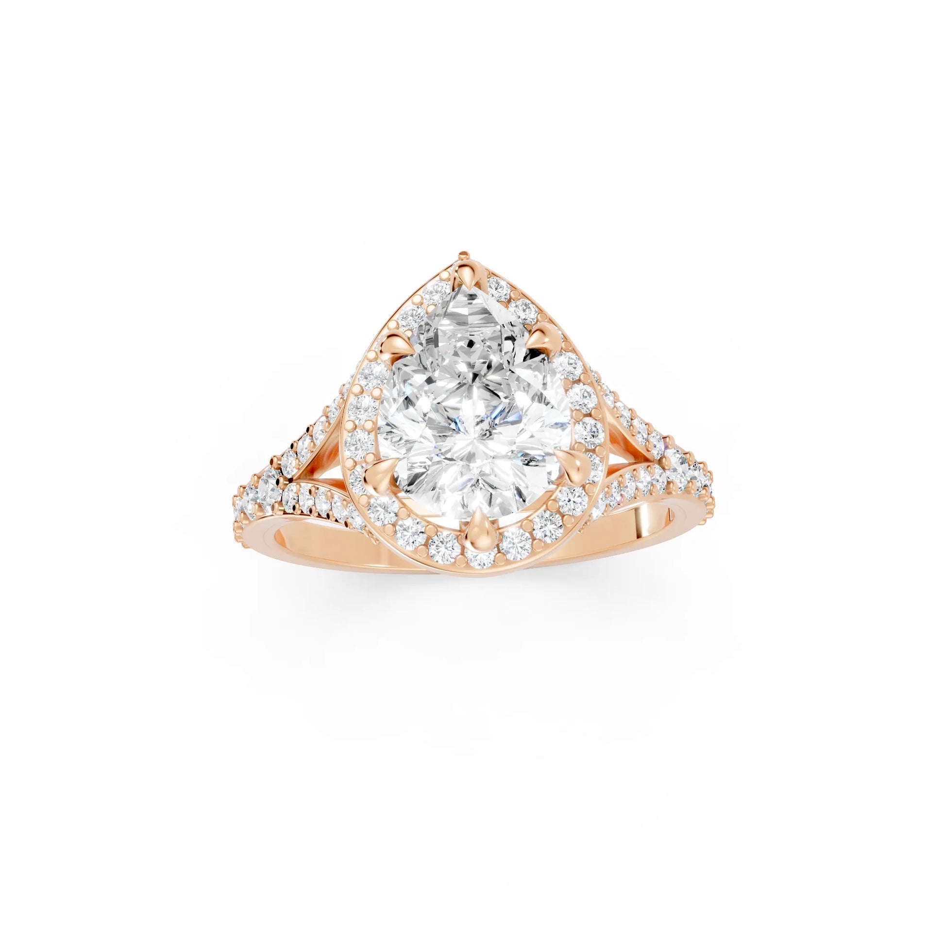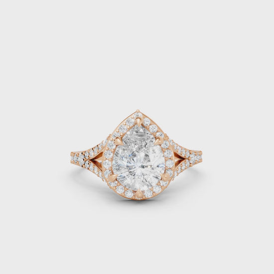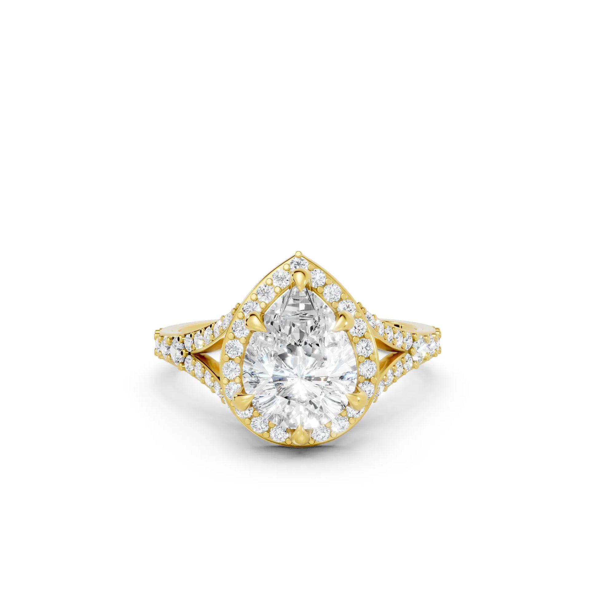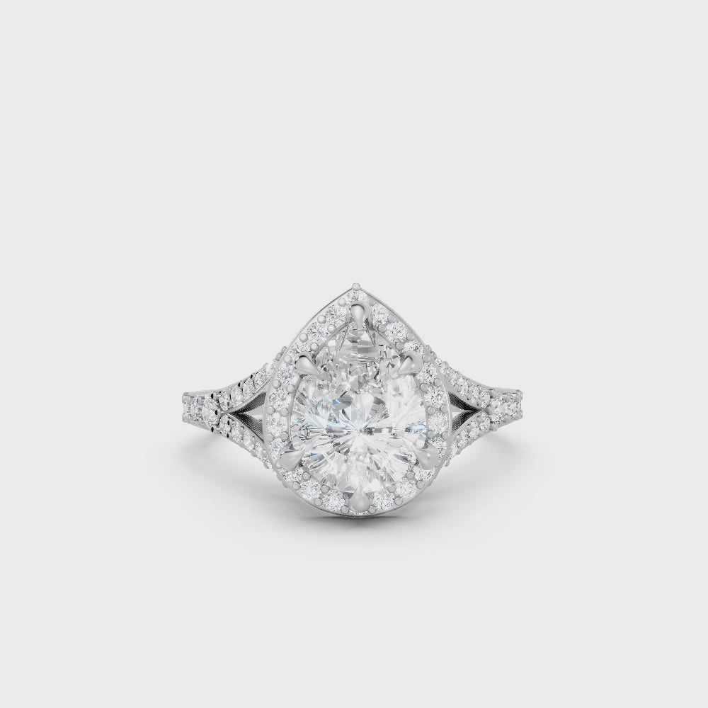 Celebrate timeless elegance with this pear cut lab-grown diamond ring, crafted in solid 14k gold. A radiant halo and split shank band with prong-set diamonds create brilliance from every angle, blending modern sophistication with sustainable luxury.