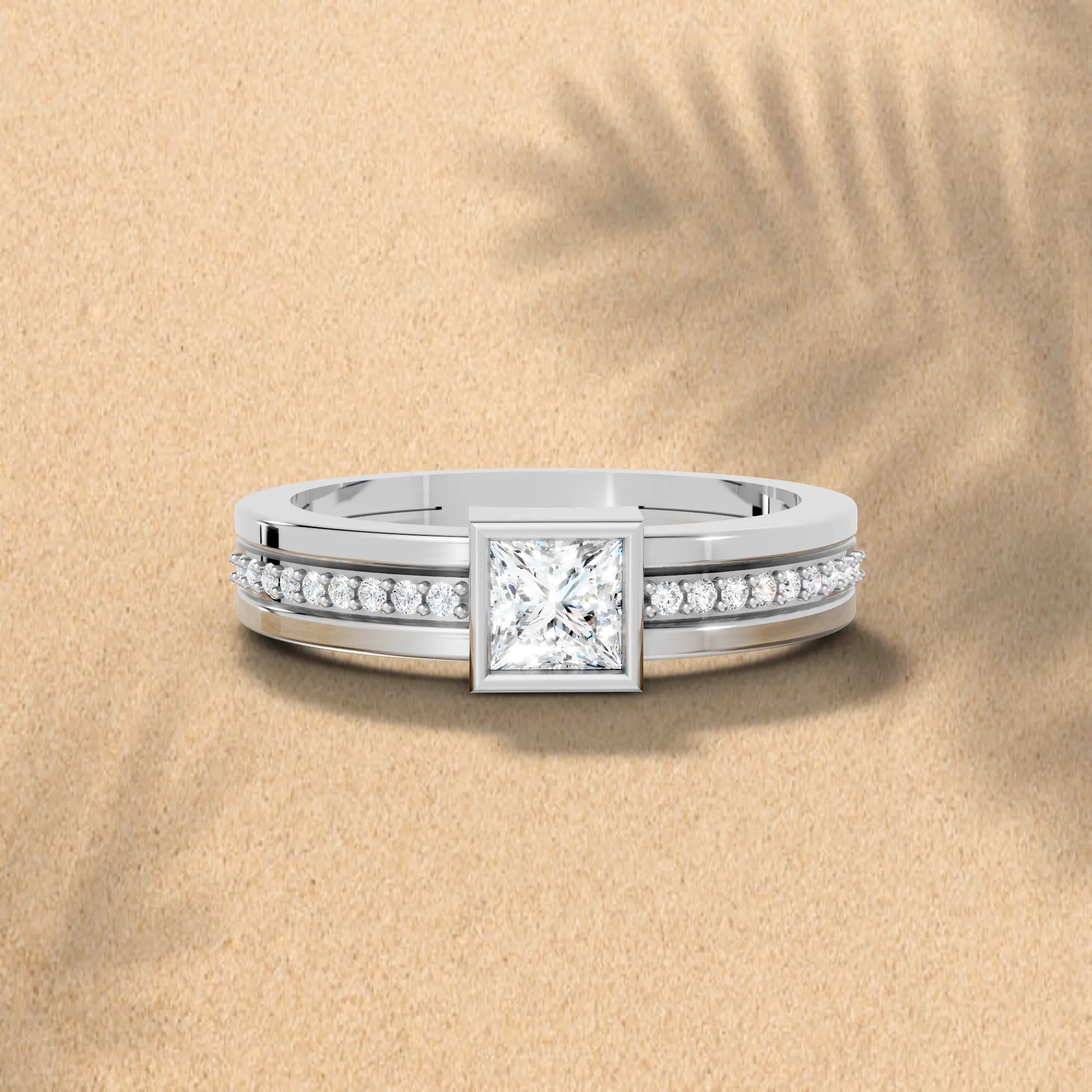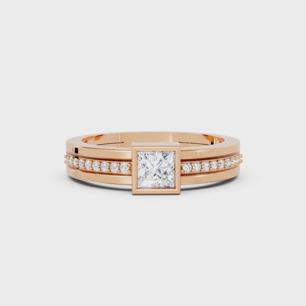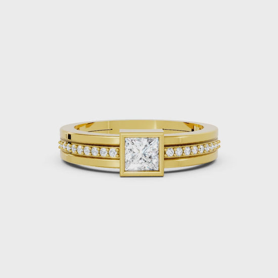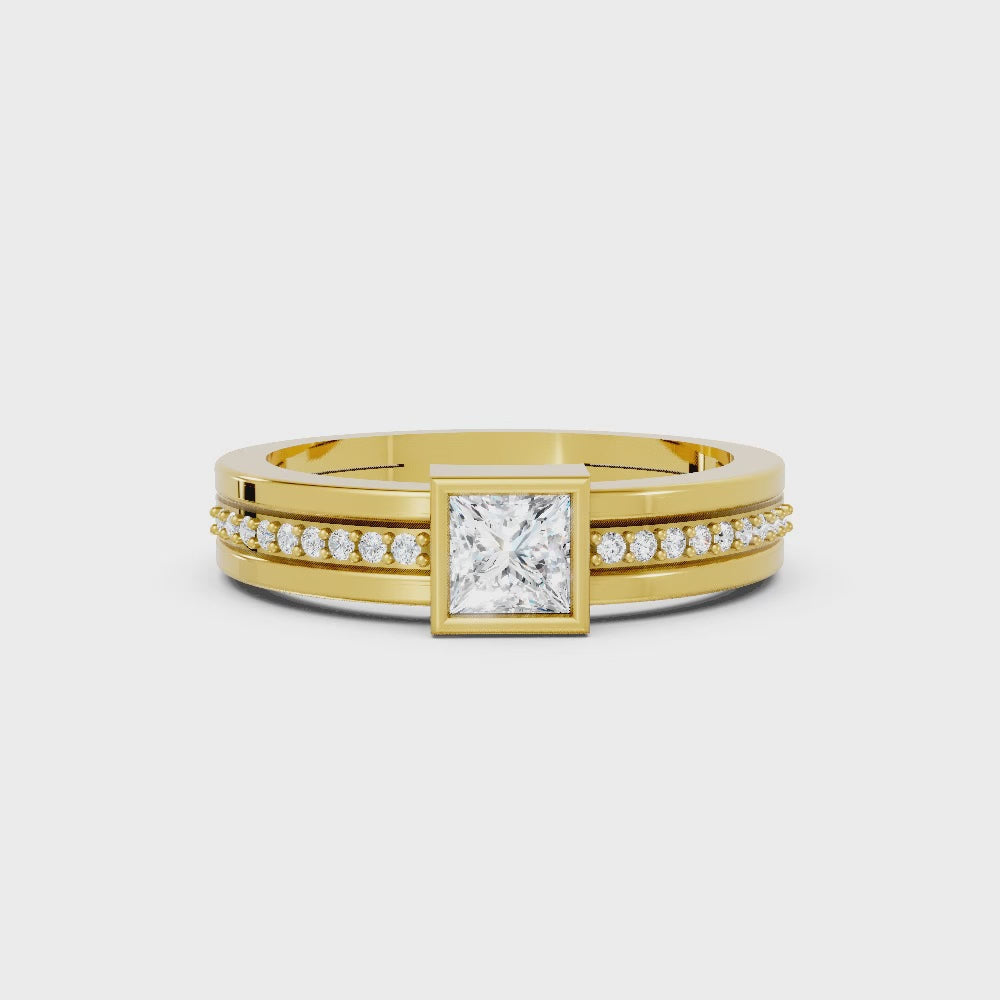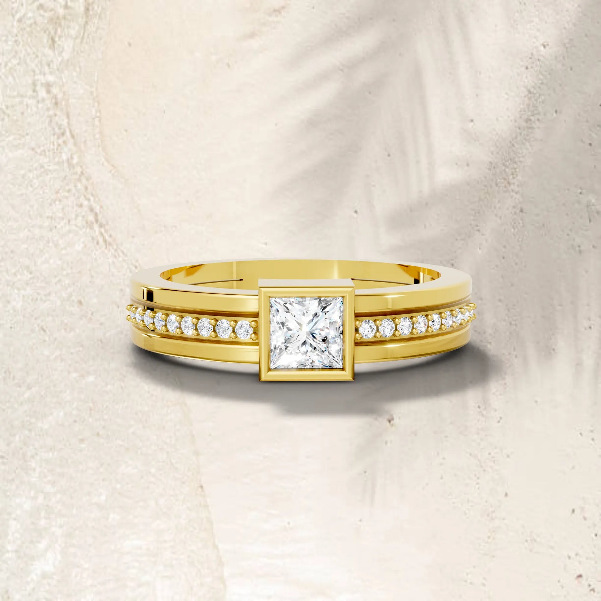 This engagement ring, crafted in solid 14k gold, showcases a princess cut lab-grown diamond in a sleek bezel setting. Sparkling side accents and a bold double band design enhance its brilliance, symbolizing love and unity.