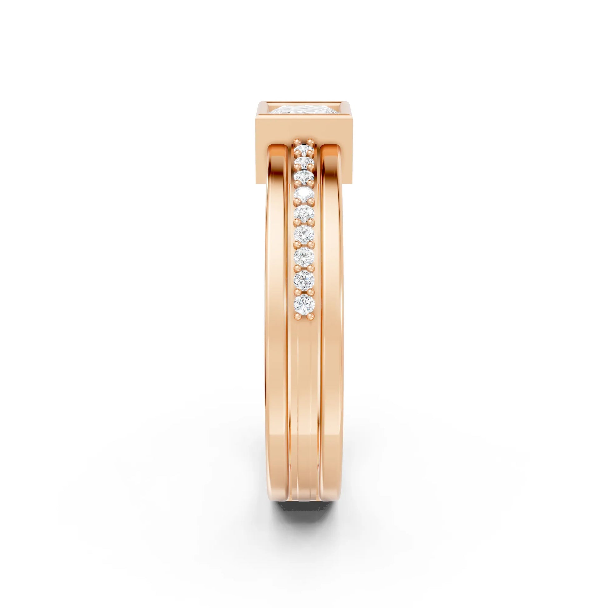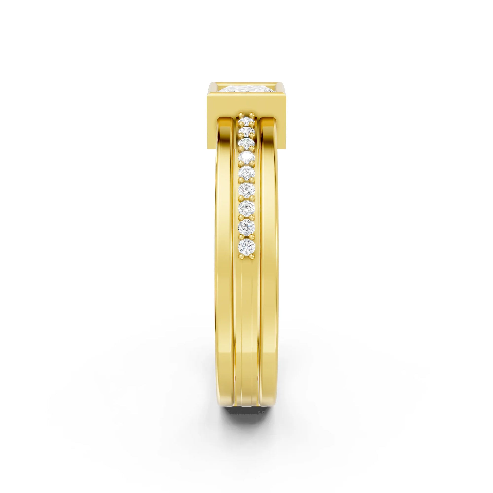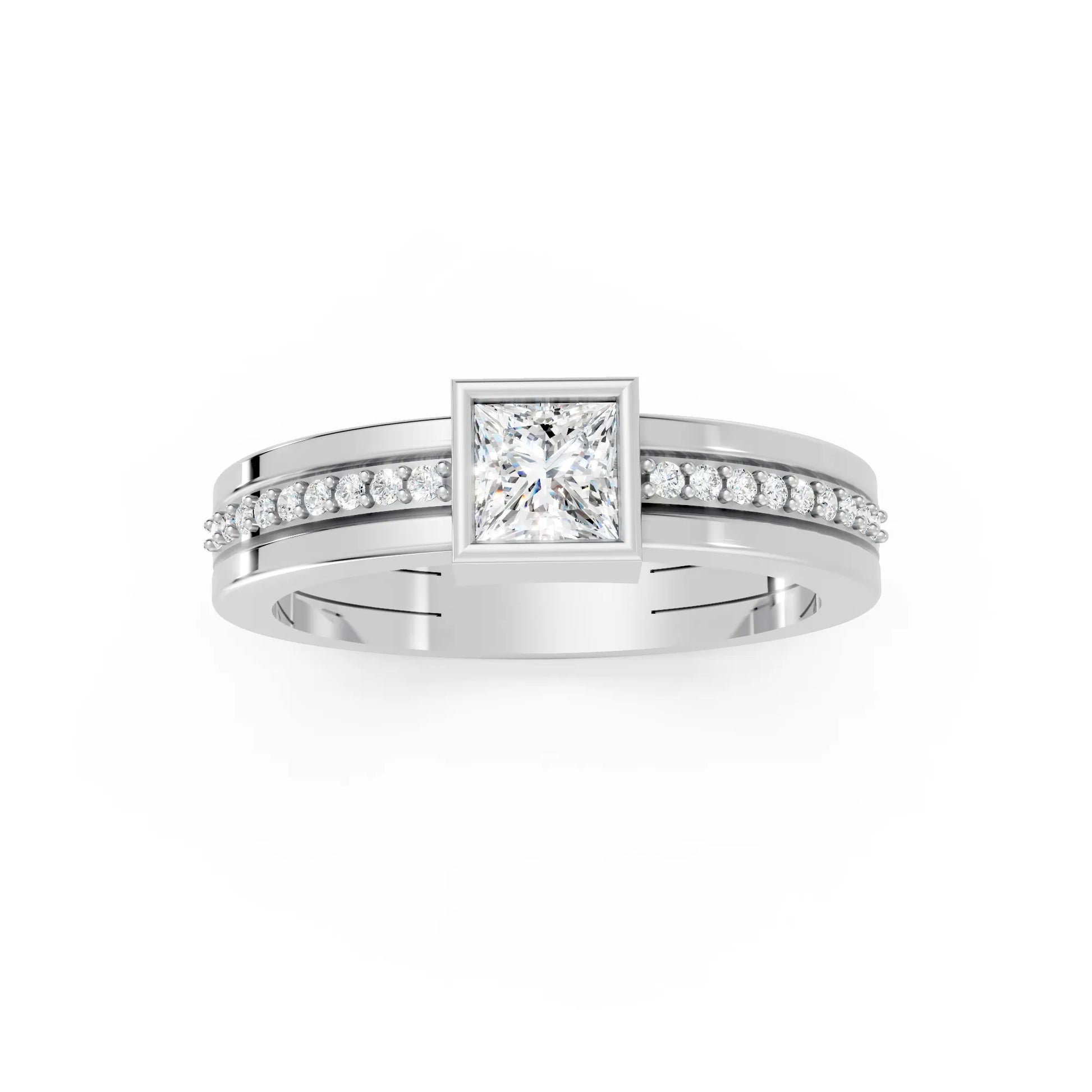 This engagement ring, crafted in solid 14k gold, showcases a princess cut lab-grown diamond in a sleek bezel setting. Sparkling side accents and a bold double band design enhance its brilliance, symbolizing love and unity.