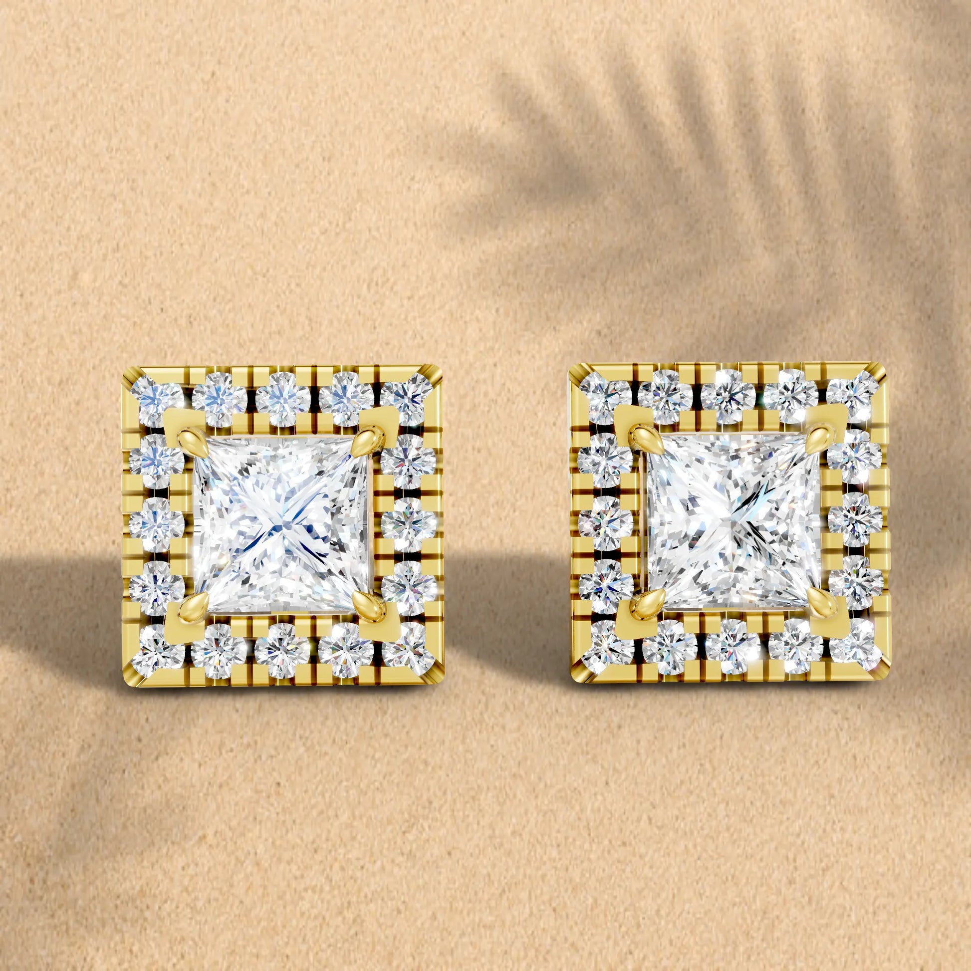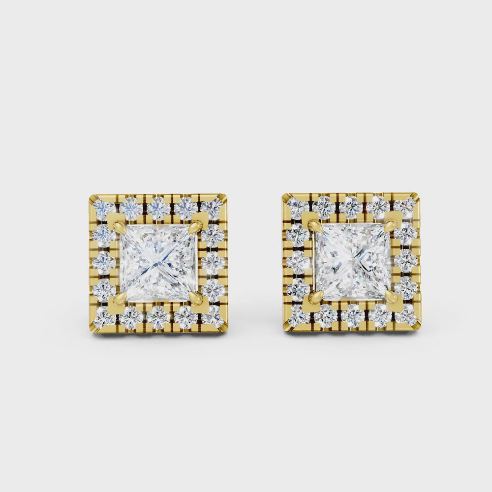 This princess cut lab-grown diamond stud, crafted in solid 14k gold, is framed by a brilliant halo that enhances its fiery sparkle. A chic and modern piece that adds radiant beauty to any jewelry collection.