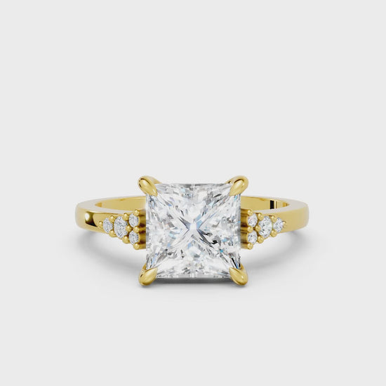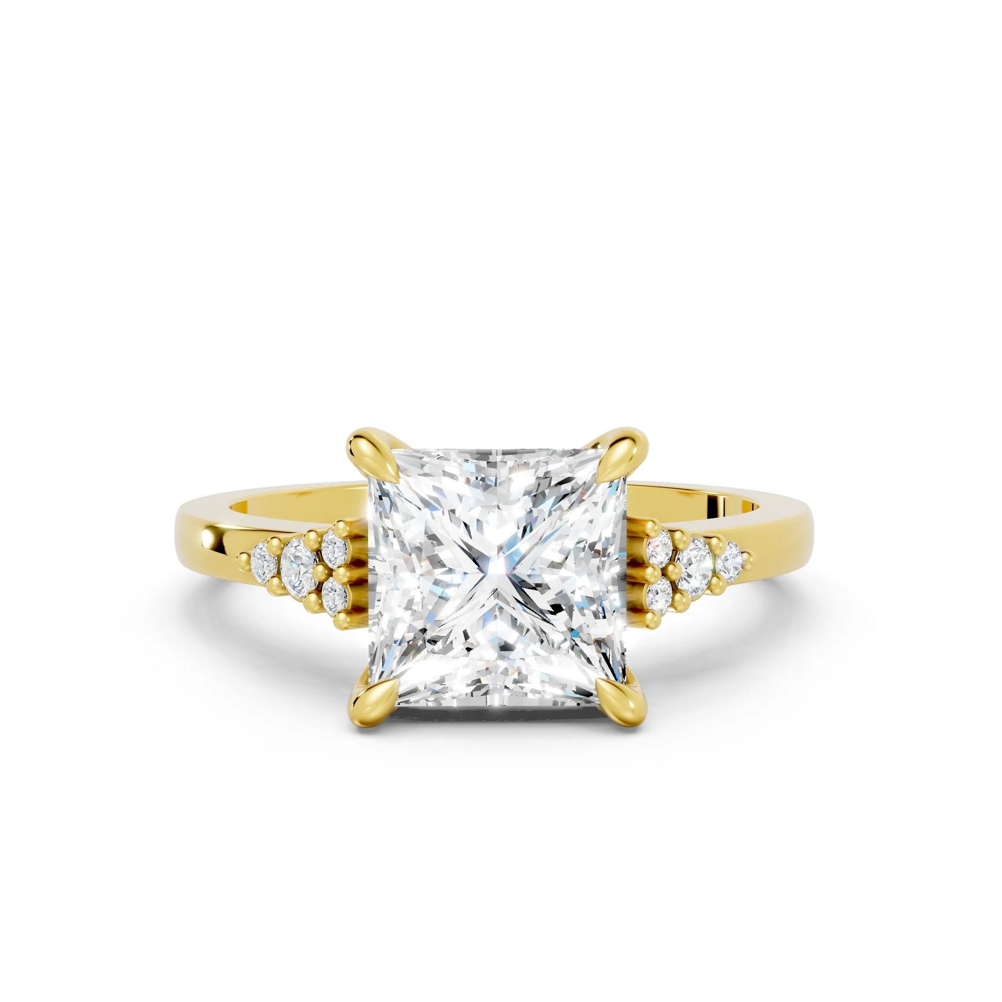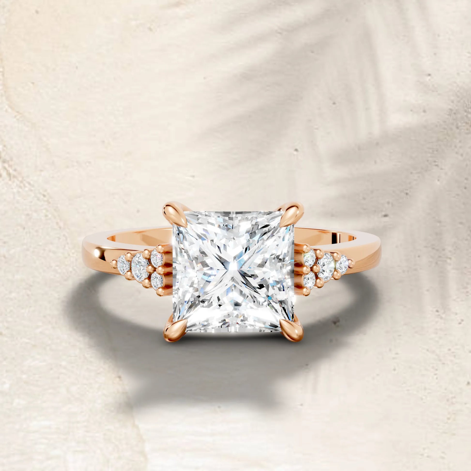 Elegant and timeless, this cathedral-style ring features a princess cut lab-grown diamond with sparkling side clusters and accents, crafted in solid 14k gold for brilliance, sustainability, and lasting beauty.