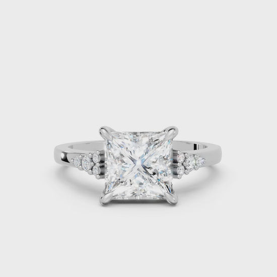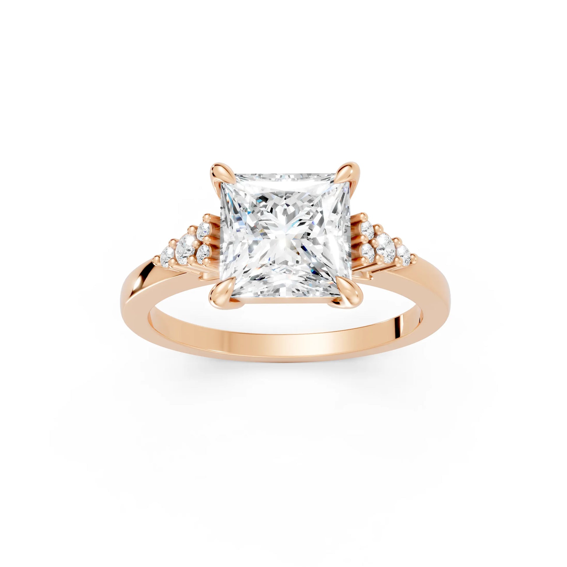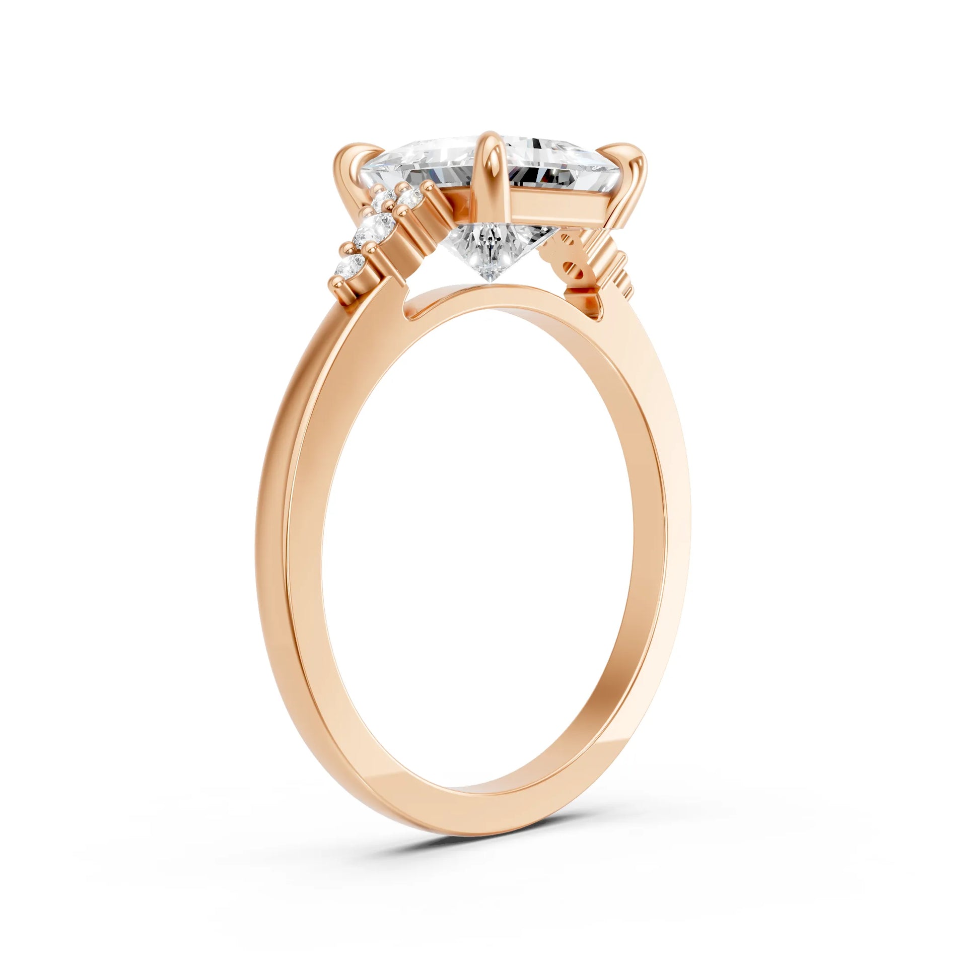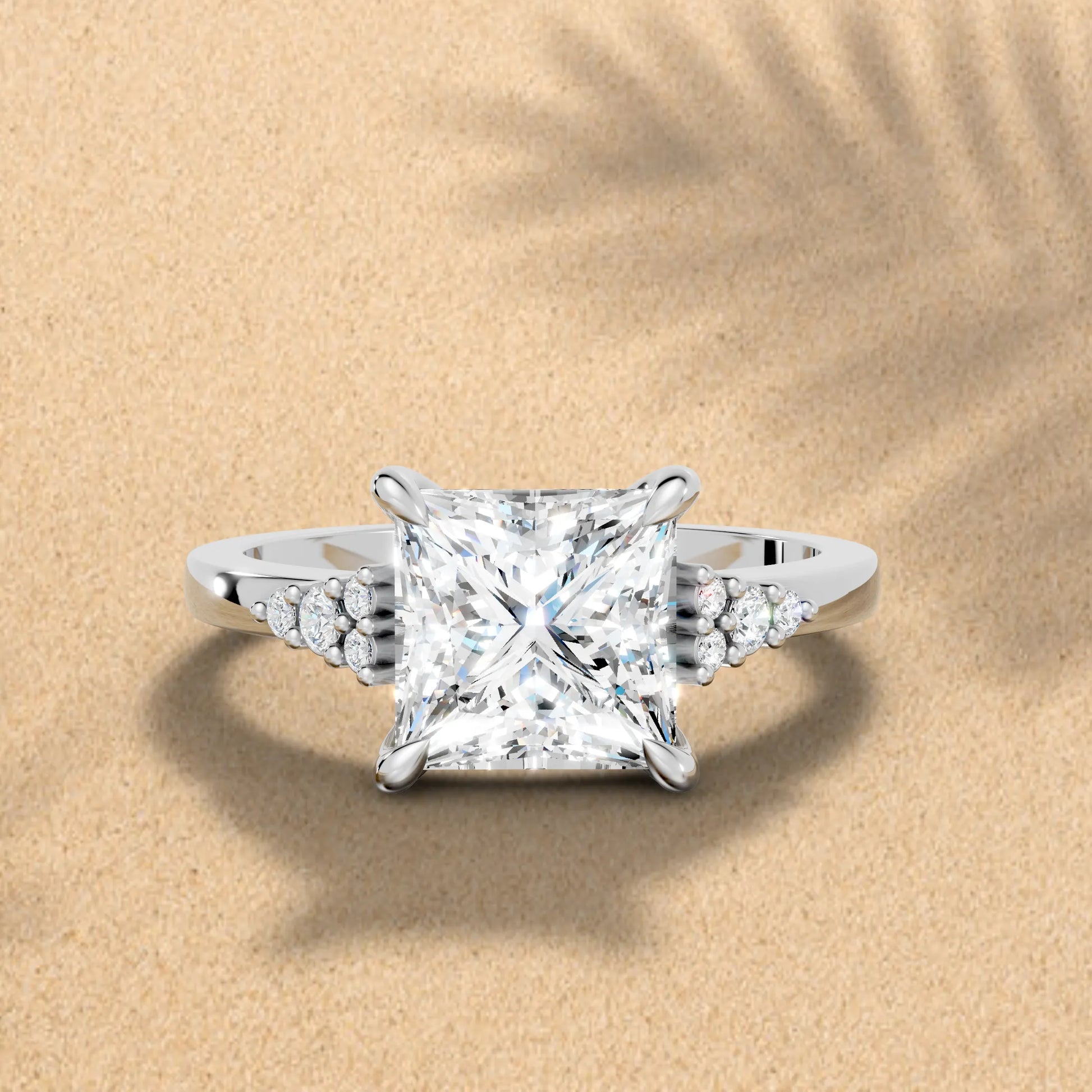 Elegant and timeless, this cathedral-style ring features a princess cut lab-grown diamond with sparkling side clusters and accents, crafted in solid 14k gold for brilliance, sustainability, and lasting beauty.