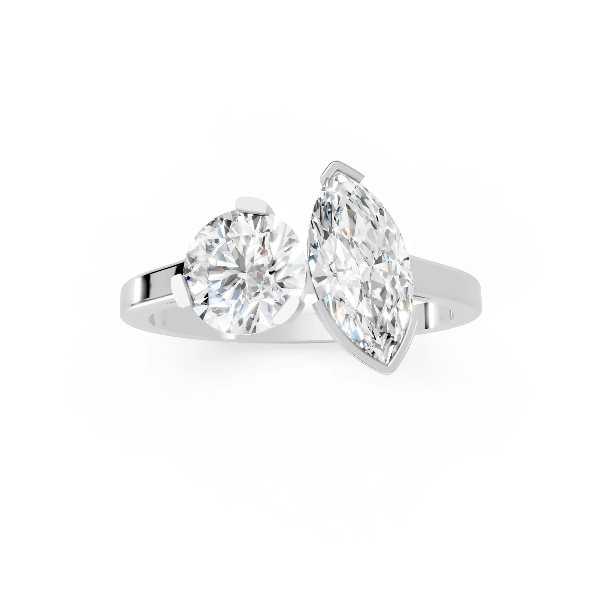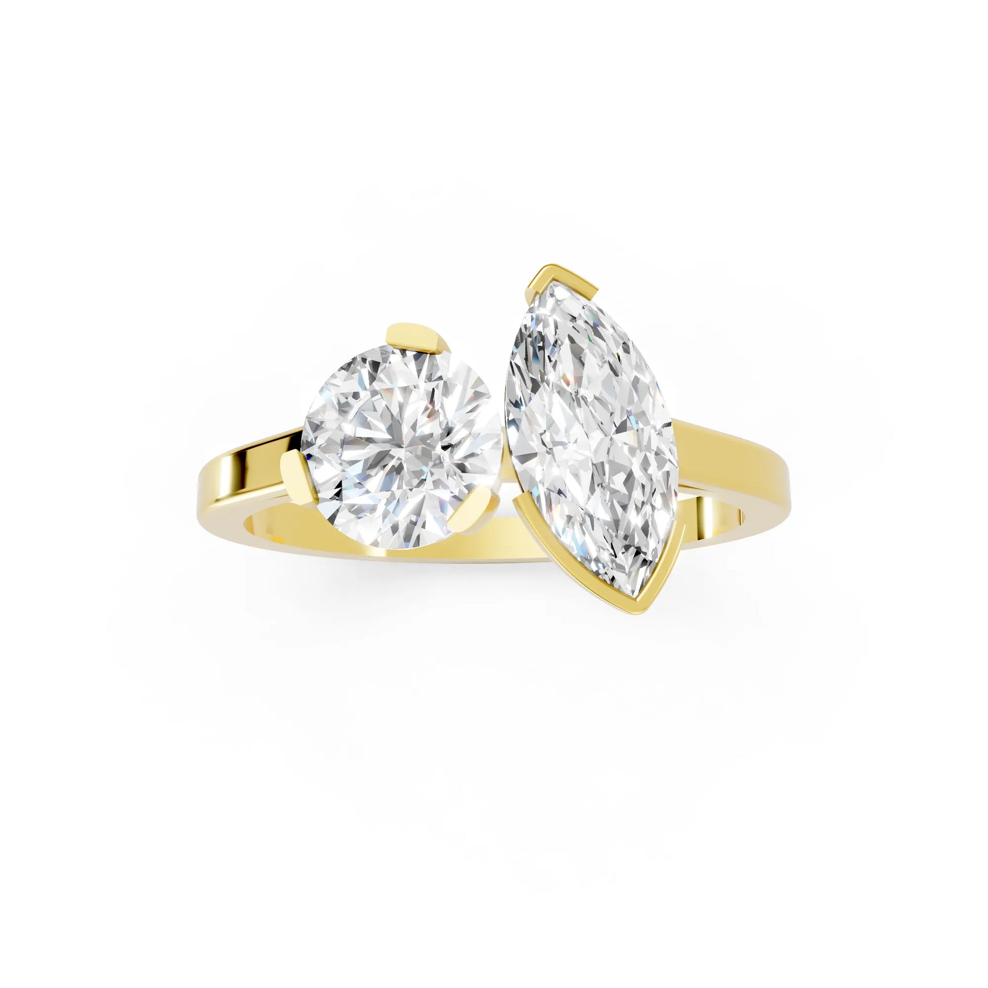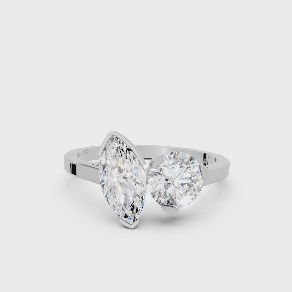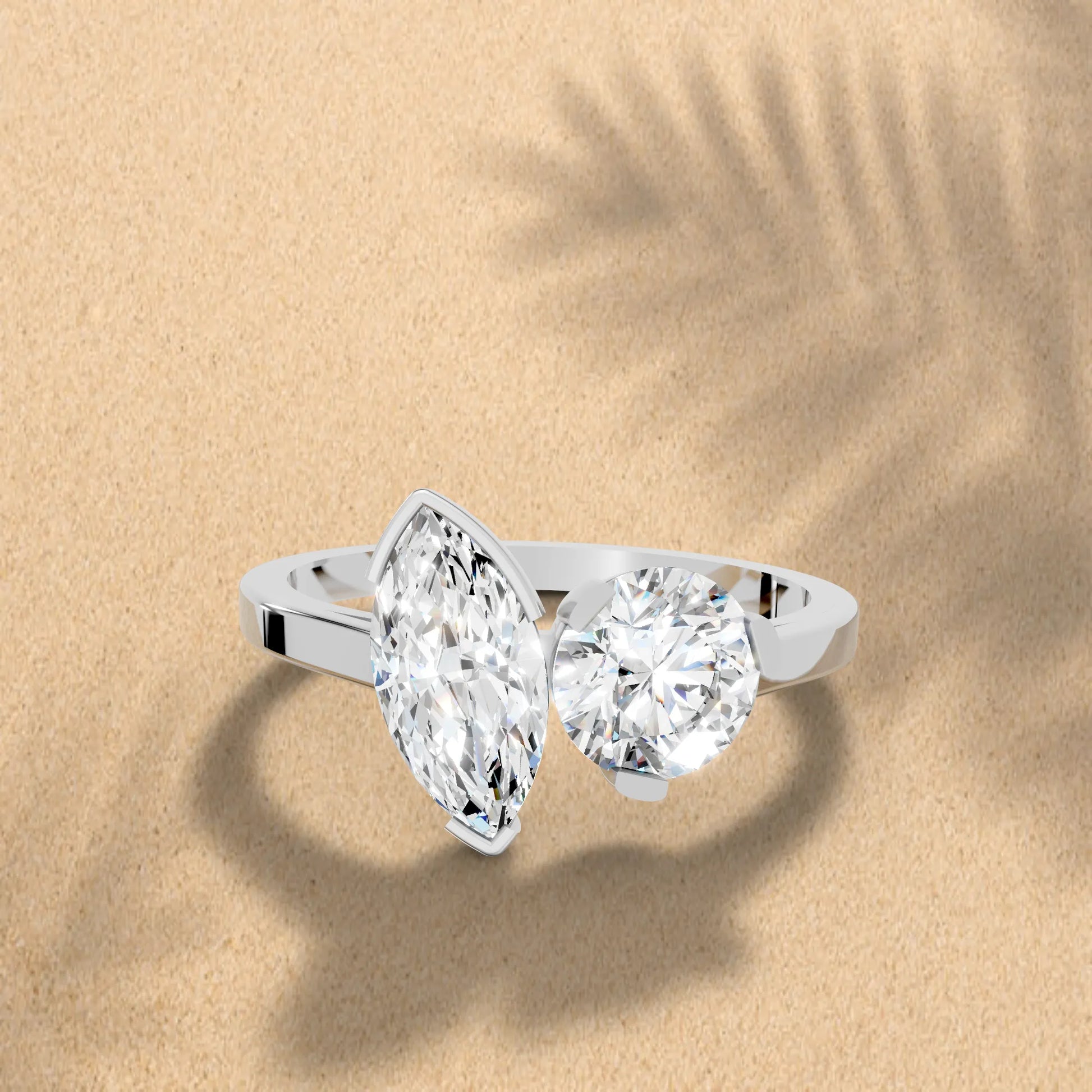 Celebrate timeless elegance with this Toi et Moi ring, crafted in solid 14k gold. Featuring a brilliant round diamond paired with a pear cut diamond in a sleek half-bezel setting, it symbolizes two souls united with brilliance and style.