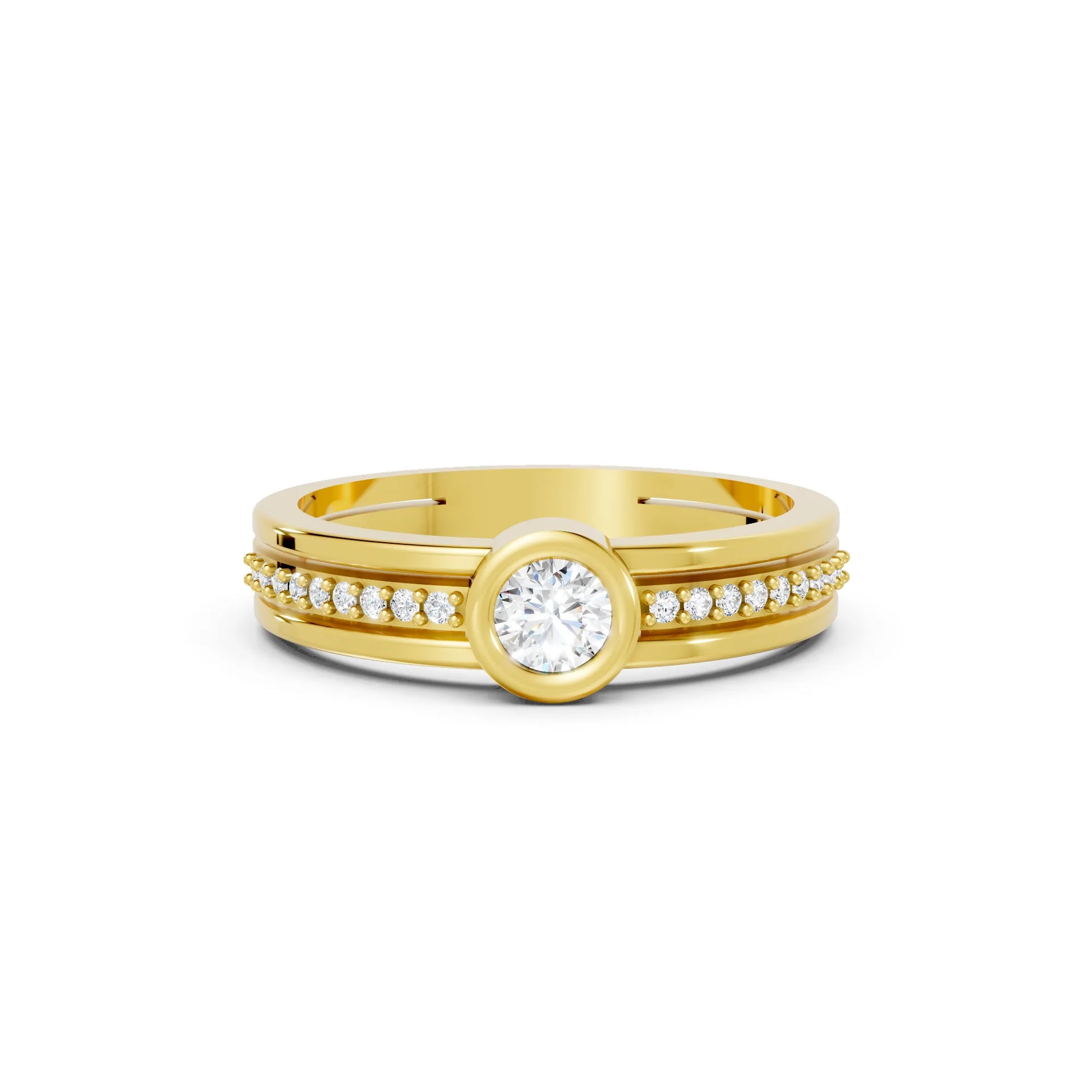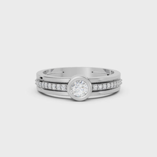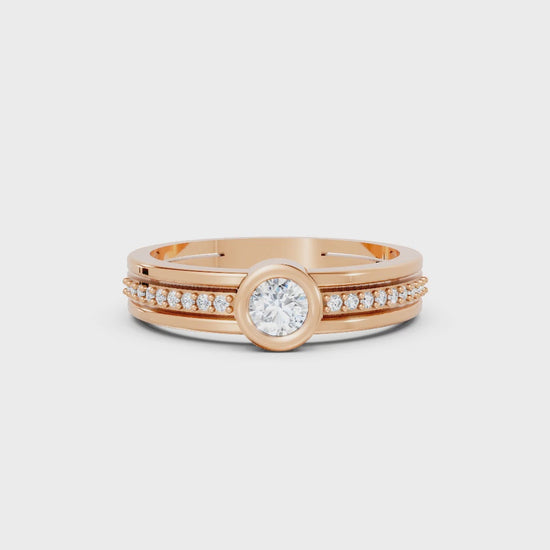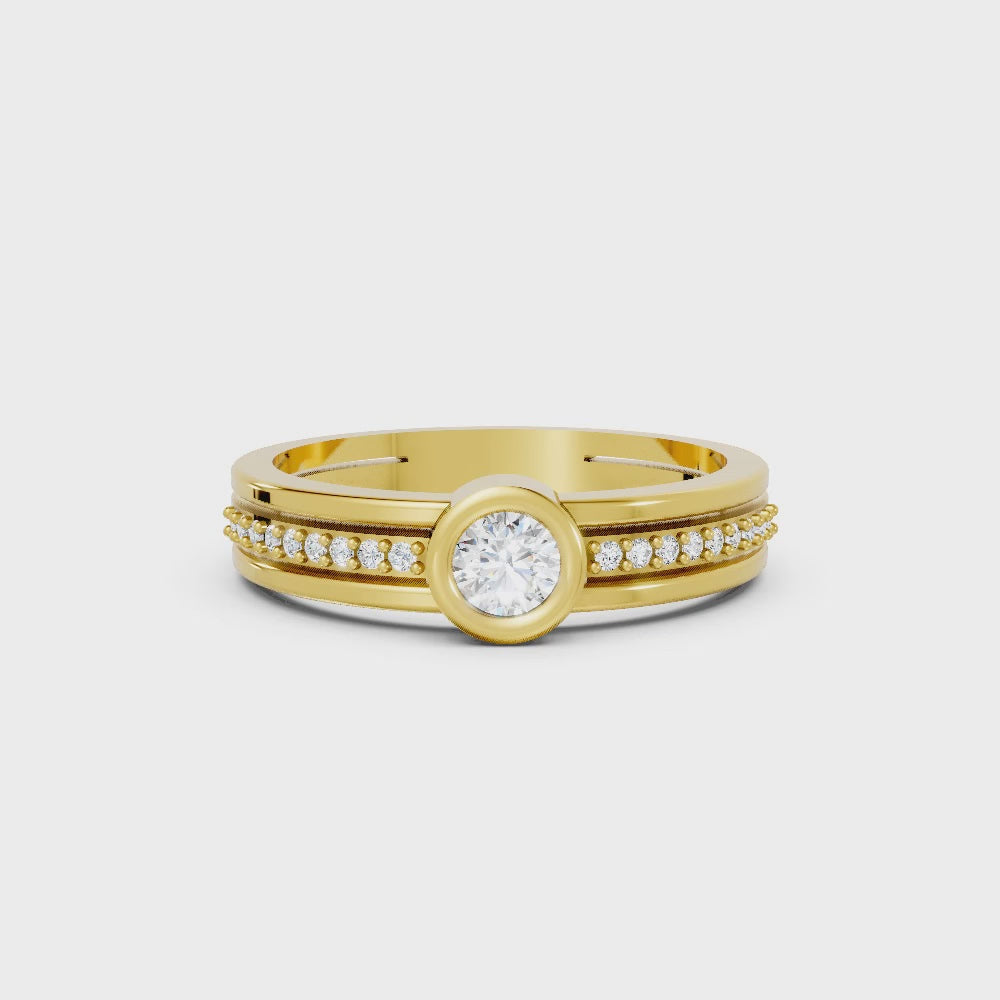 This engagement ring, crafted in solid 14k gold, features a brilliant round cut lab-grown diamond in a sleek bezel setting. Sparkling side accents and a modern double band design add extra radiance, symbolizing love and unity.