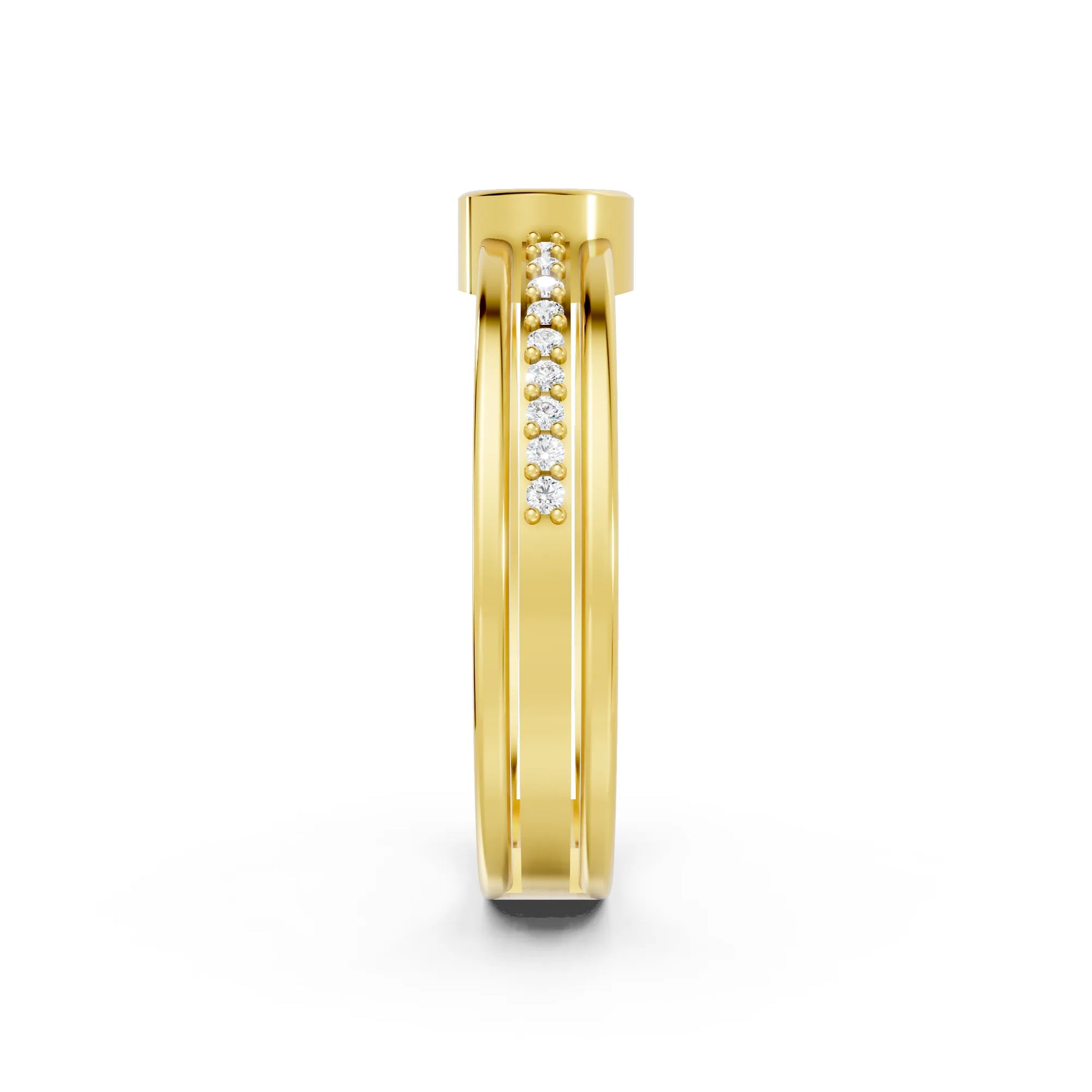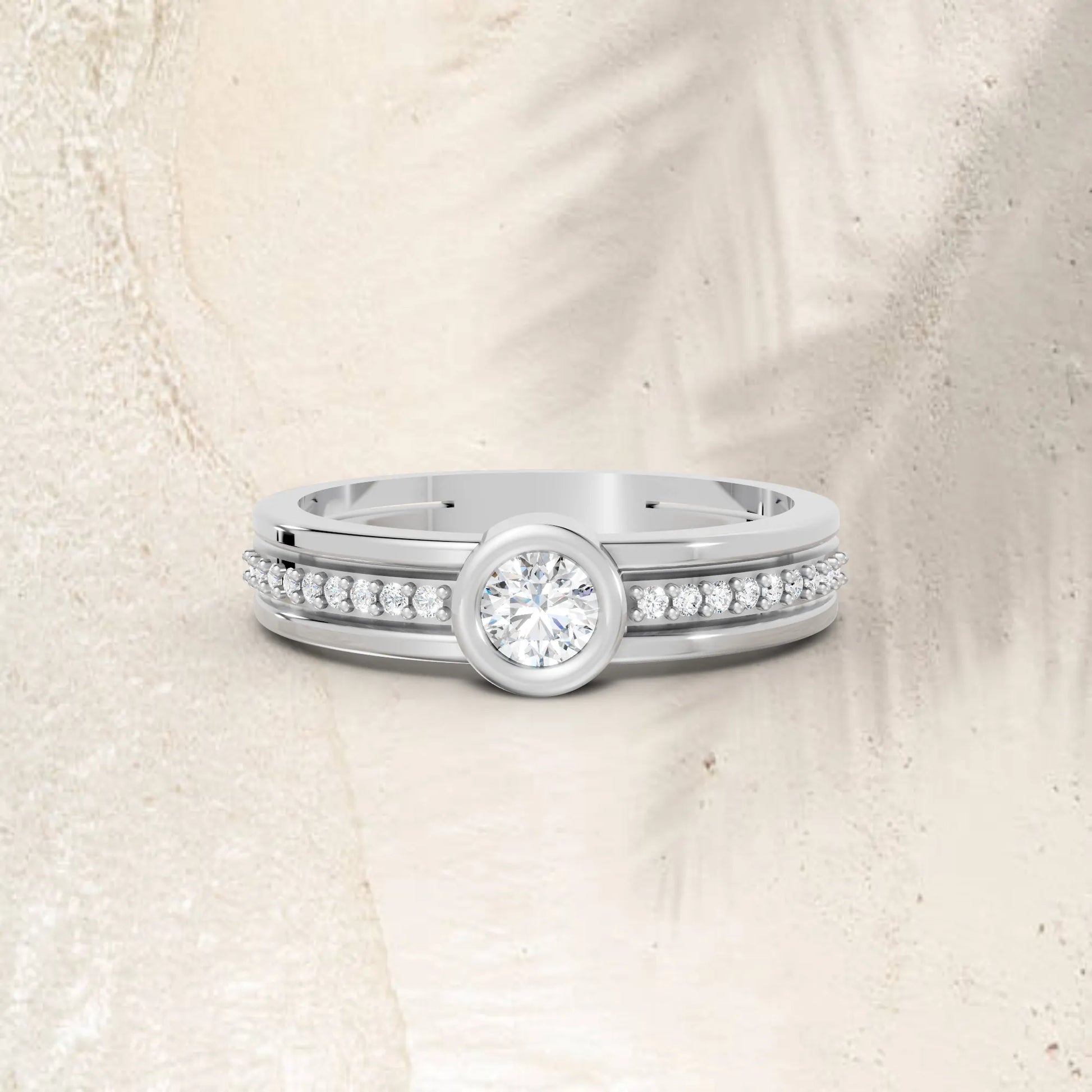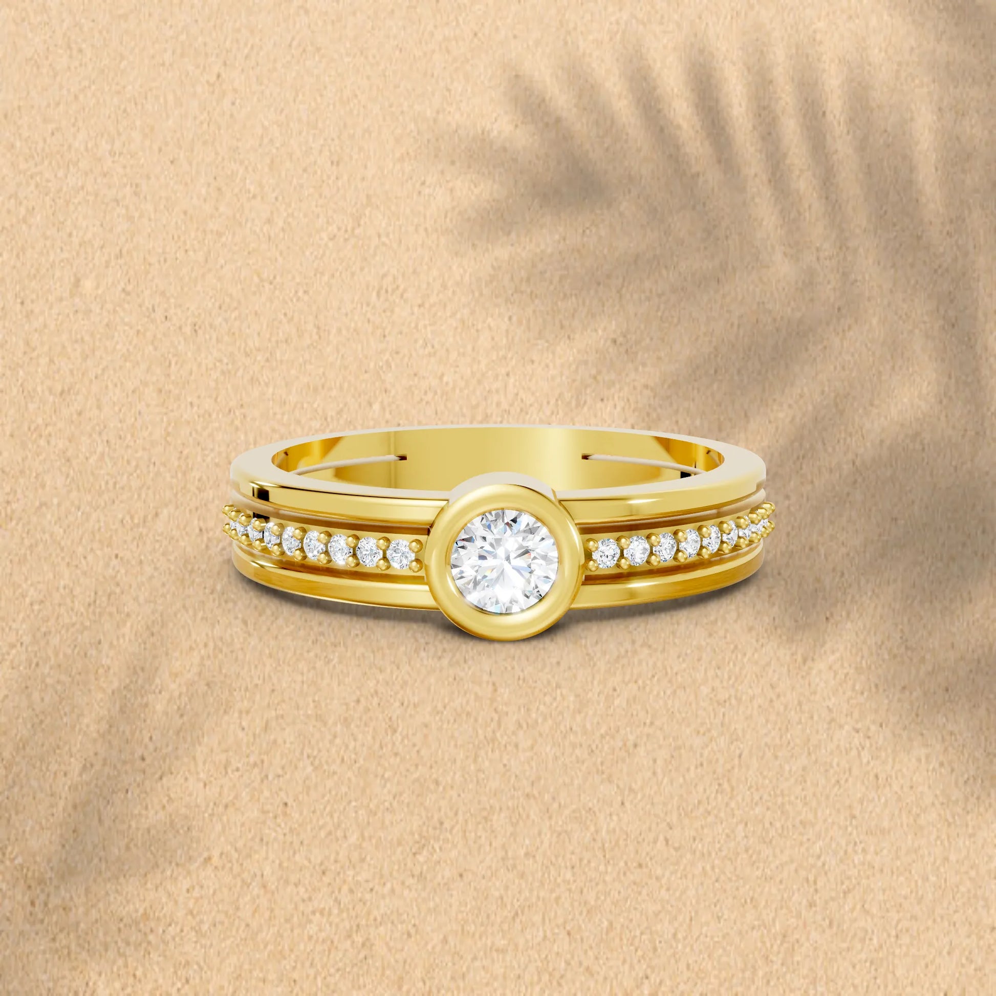 This engagement ring, crafted in solid 14k gold, features a brilliant round cut lab-grown diamond in a sleek bezel setting. Sparkling side accents and a modern double band design add extra radiance, symbolizing love and unity.