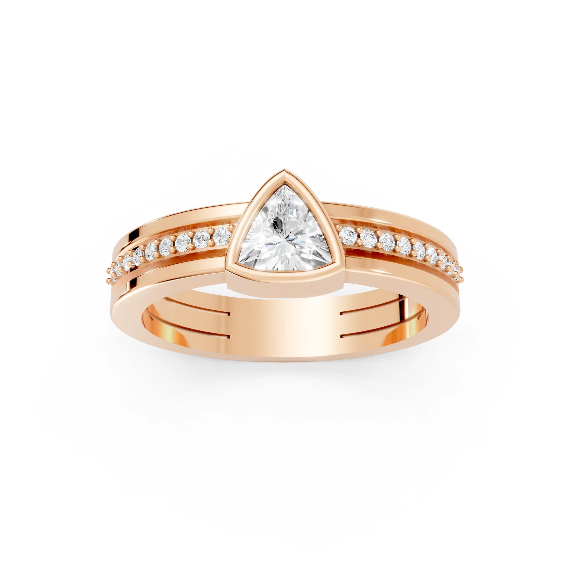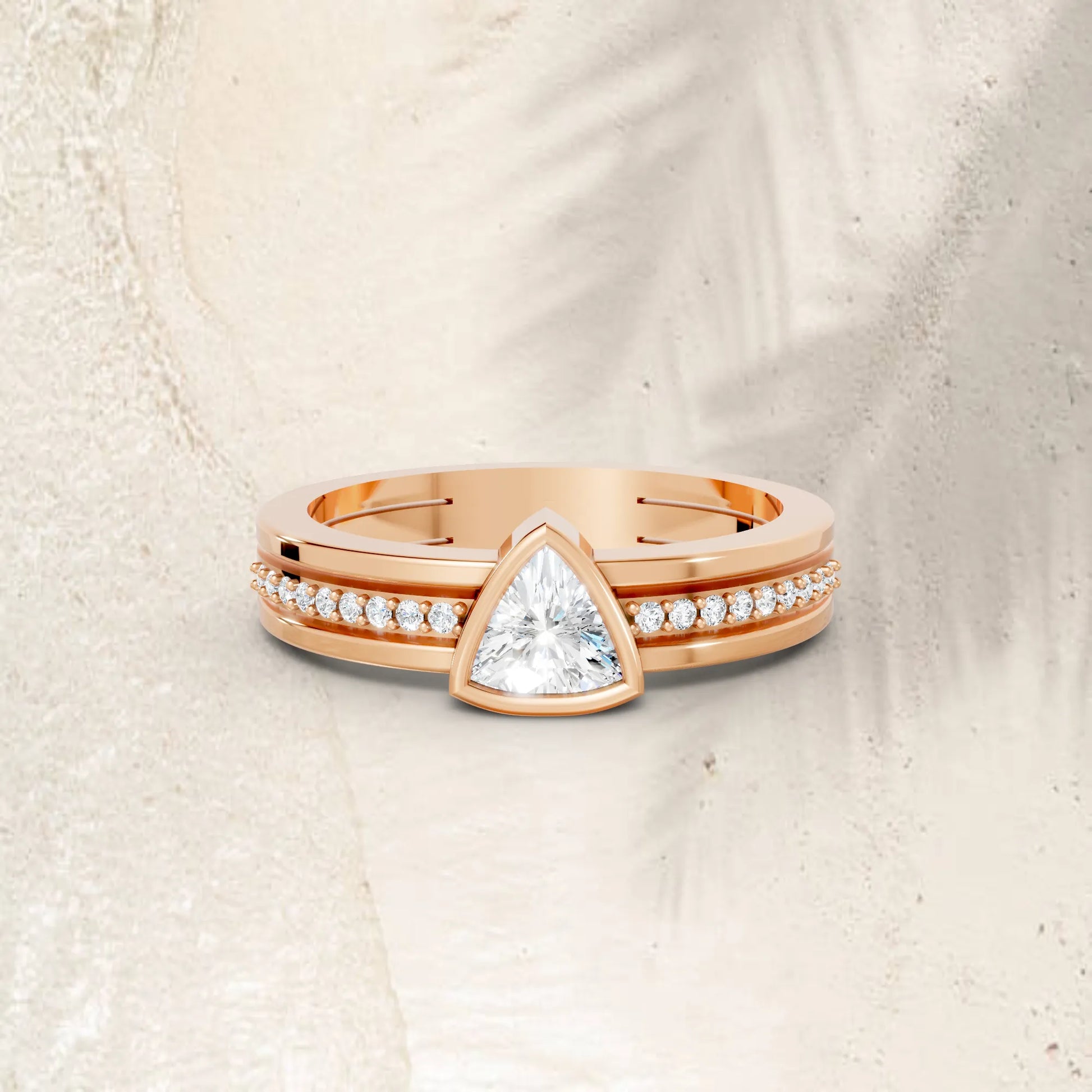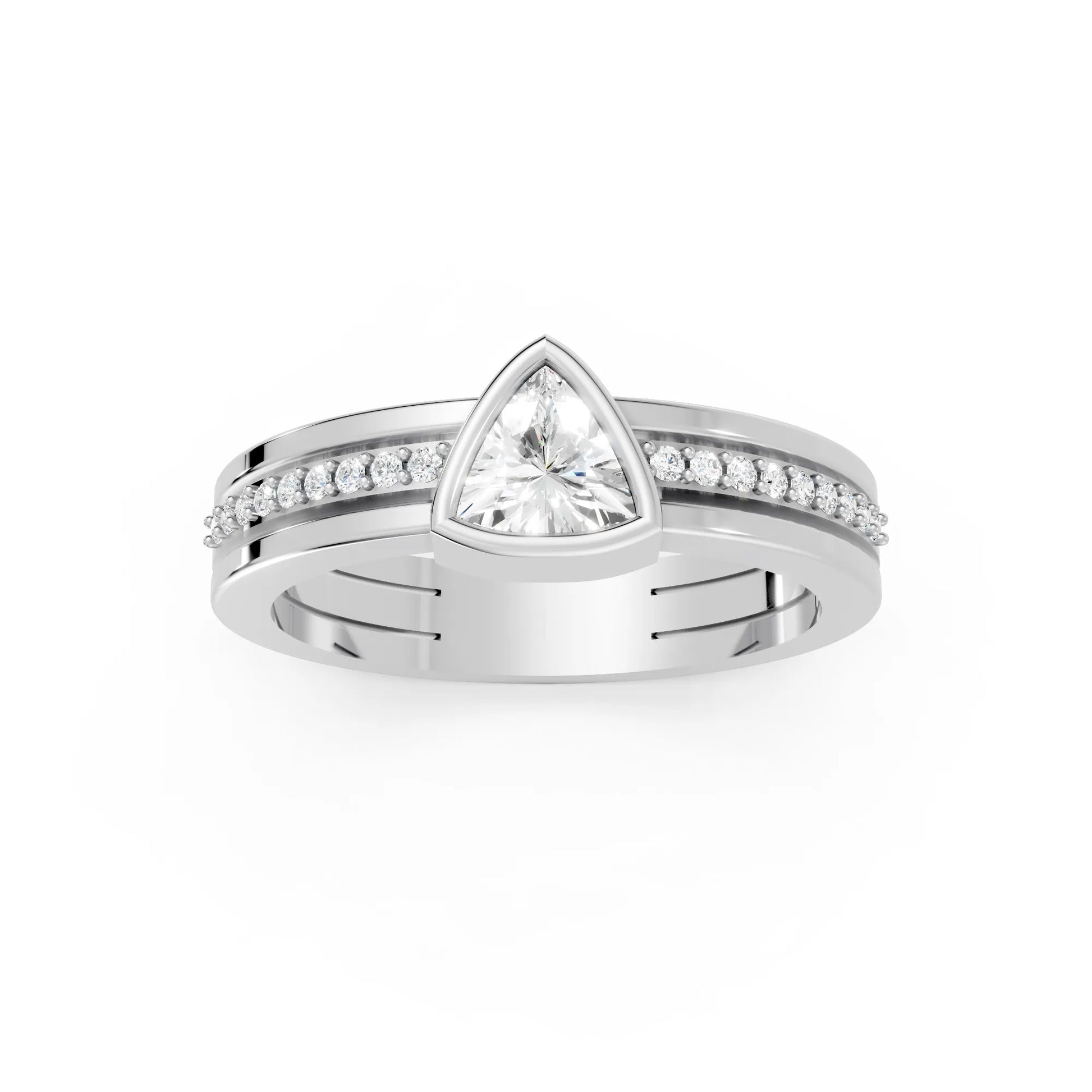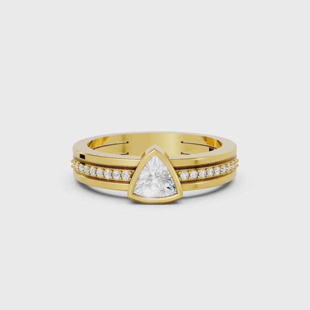 This engagement ring, crafted in solid 14k gold, features a bold trillion cut lab-grown diamond in a sleek bezel setting. Sparkling side accents and a striking double band design enhance its brilliance, symbolizing love and unity.