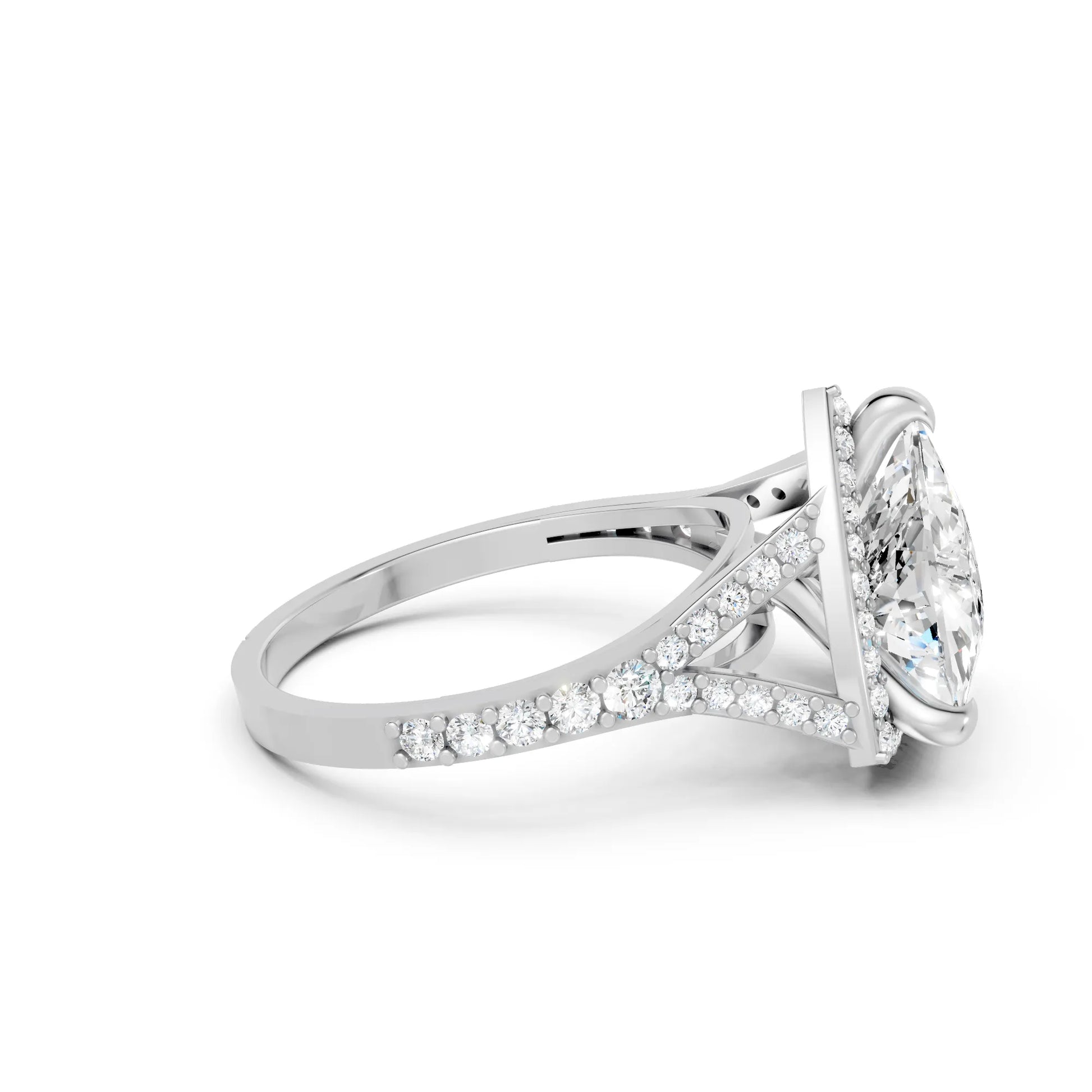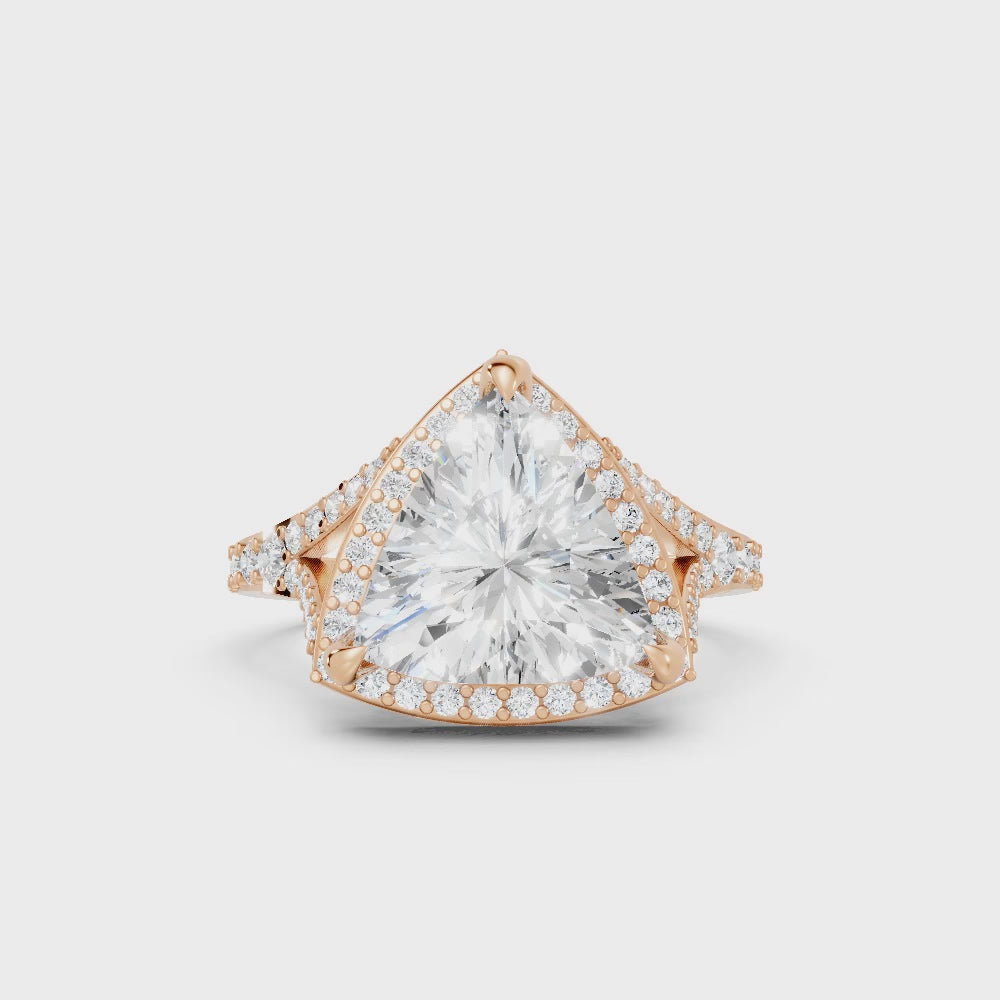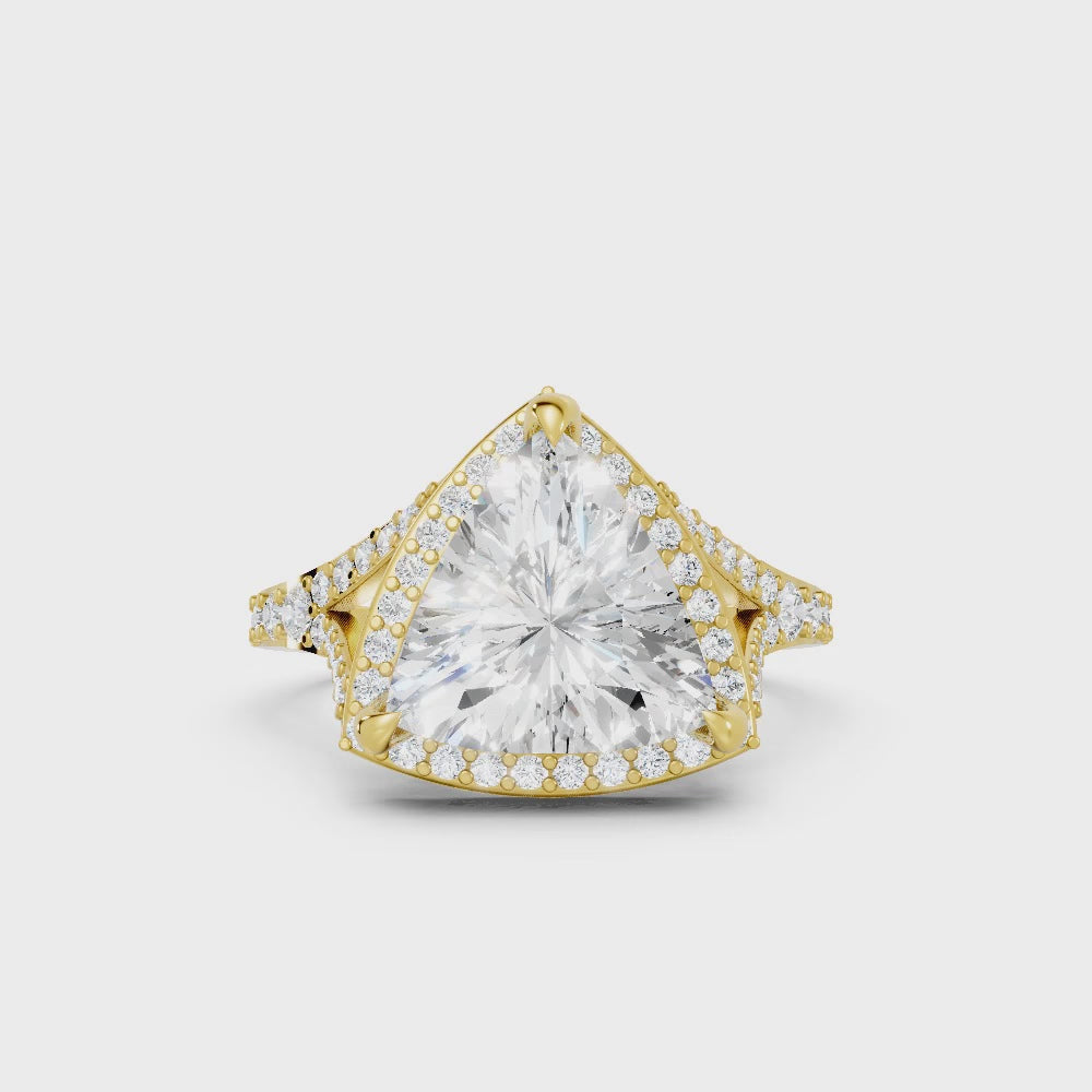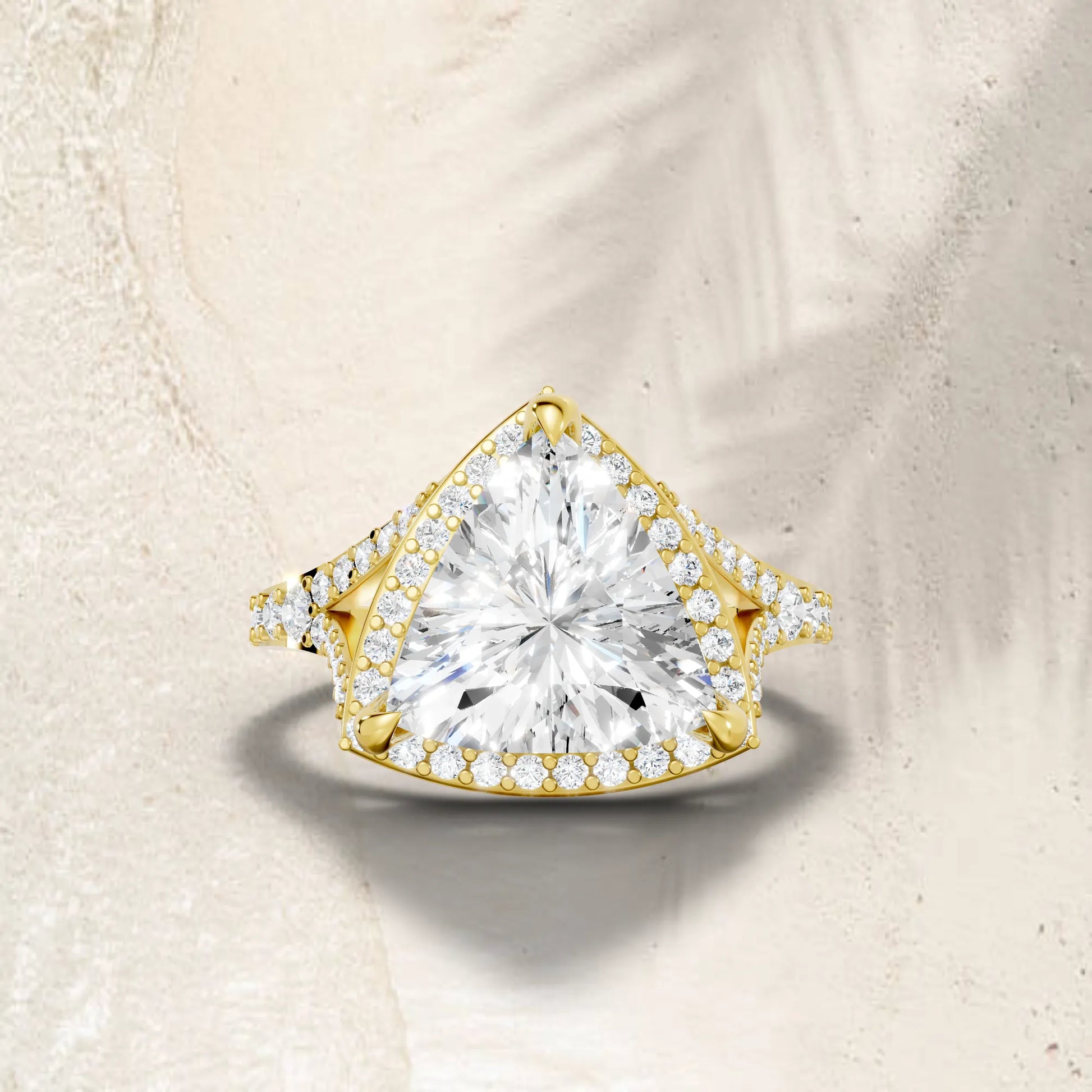 Elegant and timeless, this trillion cut lab-grown diamond ring is crafted in solid 14k gold. A shimmering halo and split shank design enhance its brilliance, offering sustainable luxury and a lasting symbol of love.